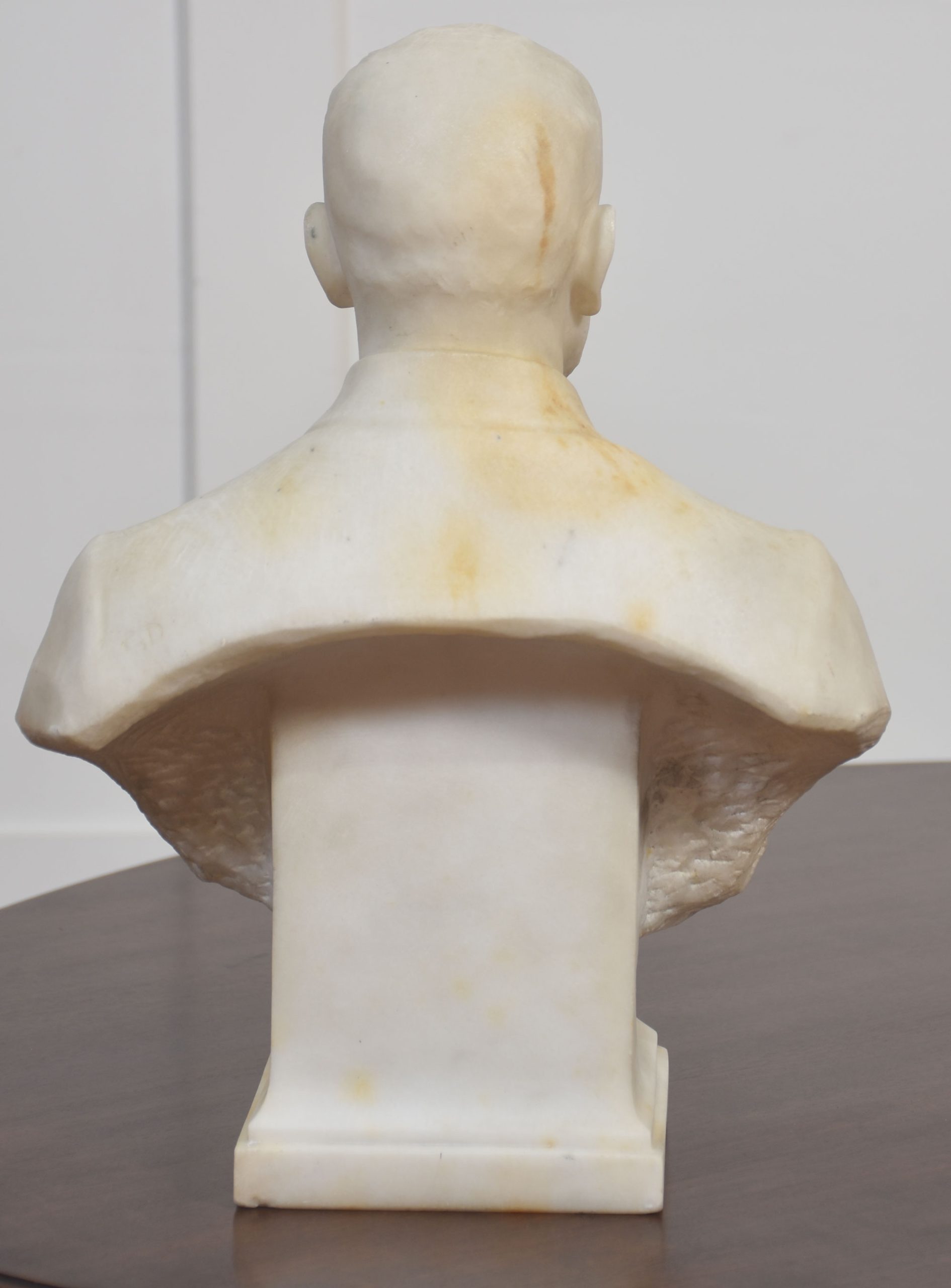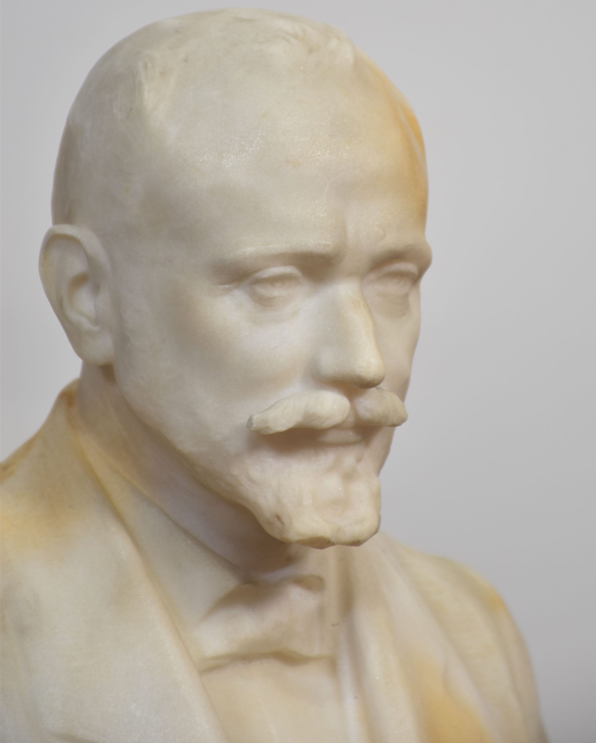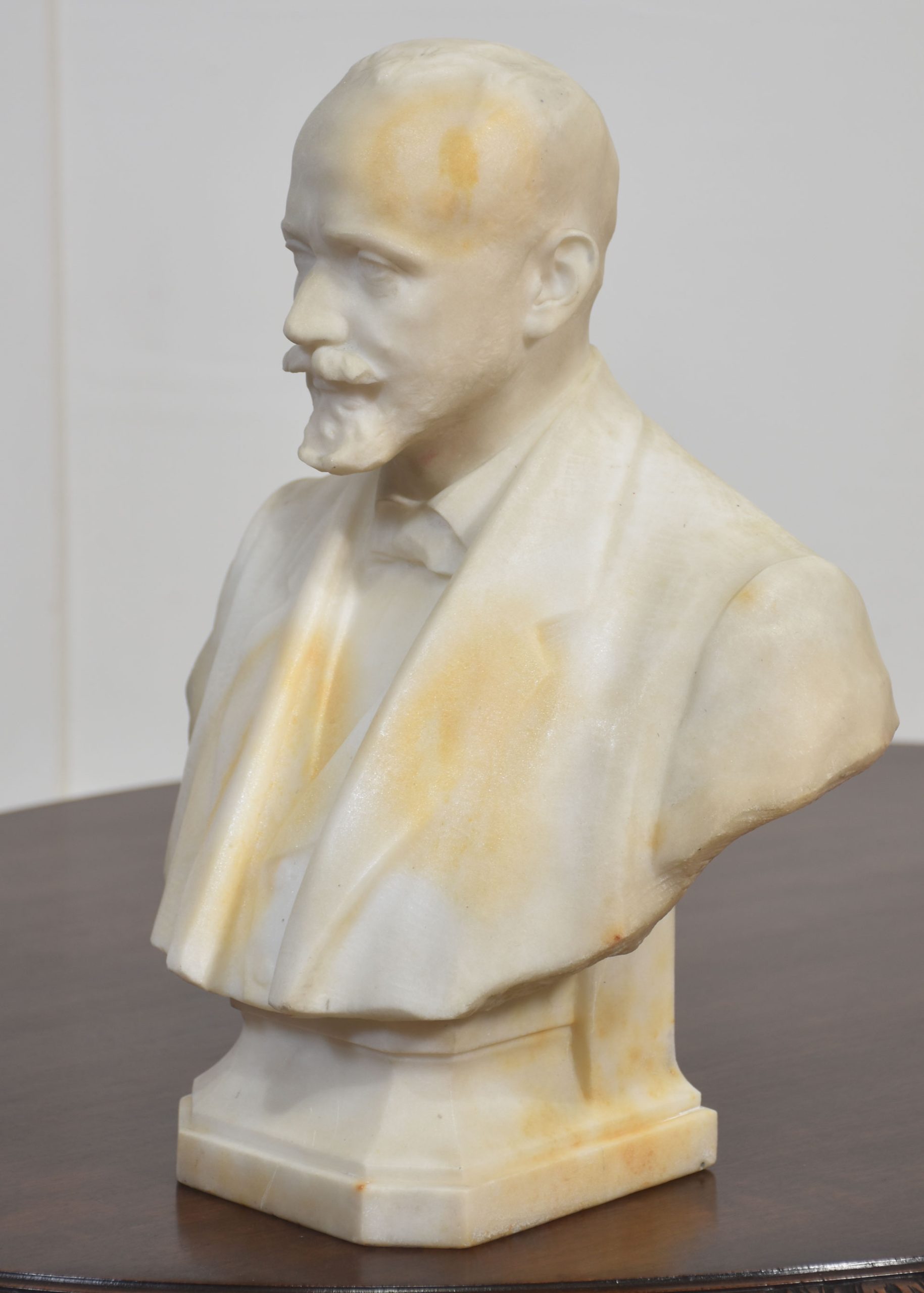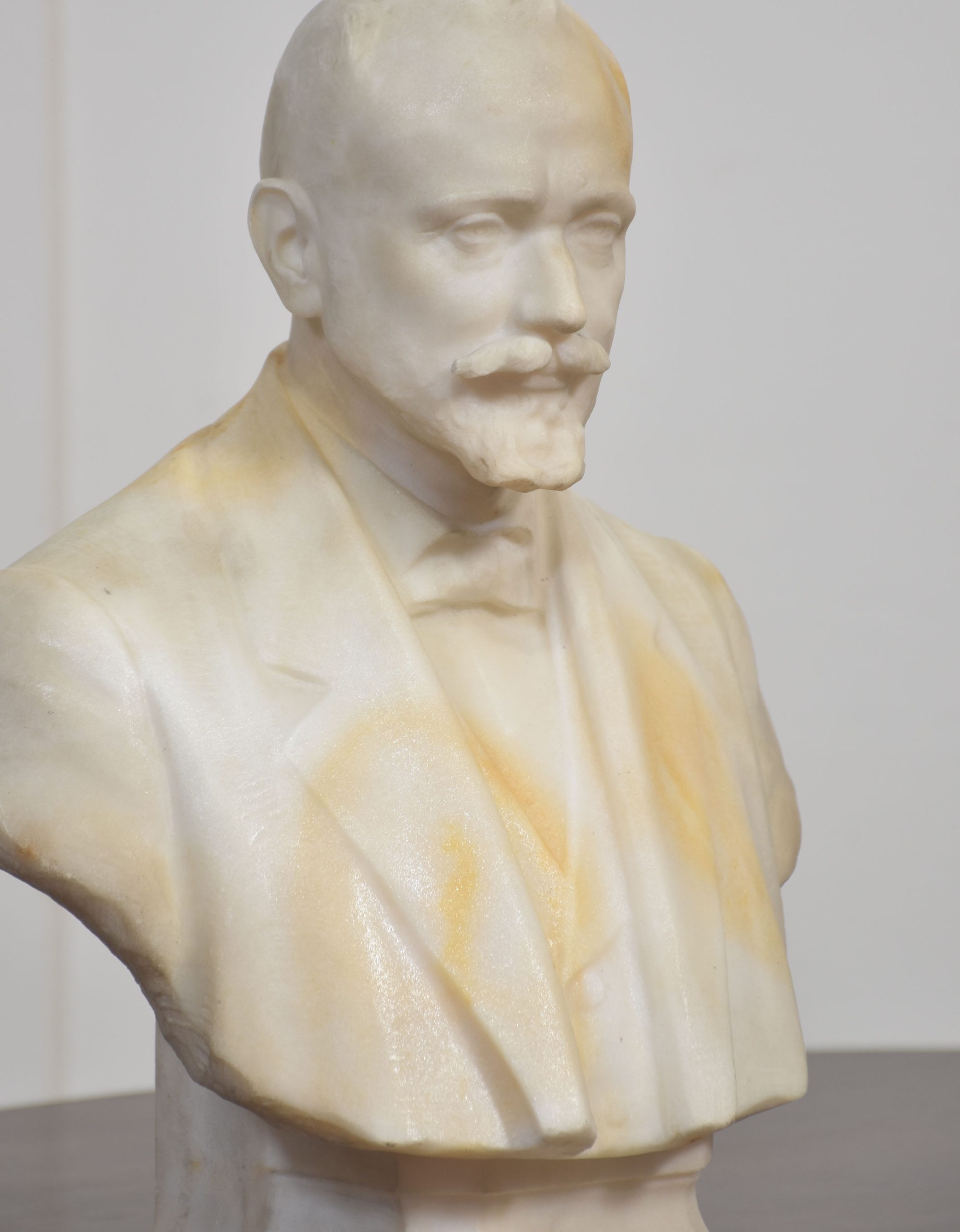 Carved marble portrait bust depicting a formally dressed gentleman with closely cropped hair, prominent moustache, and short beard. The subject is shown wearing a tailored jacket with lapels, waistcoat, and bow tie, executed with restrained realism and careful facial modelling. The shoulders are broadly carved, terminating above a shaped, integral socle base.