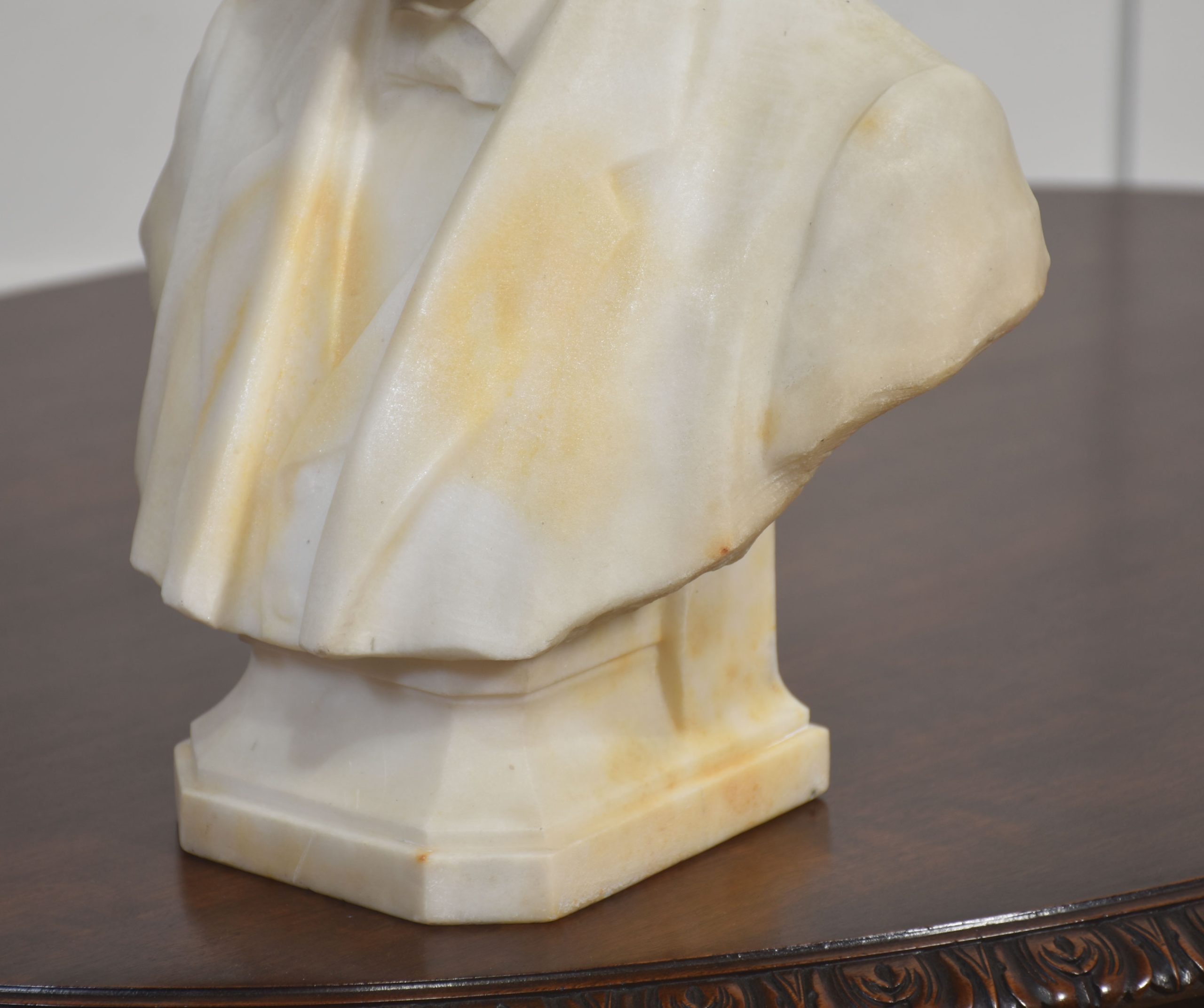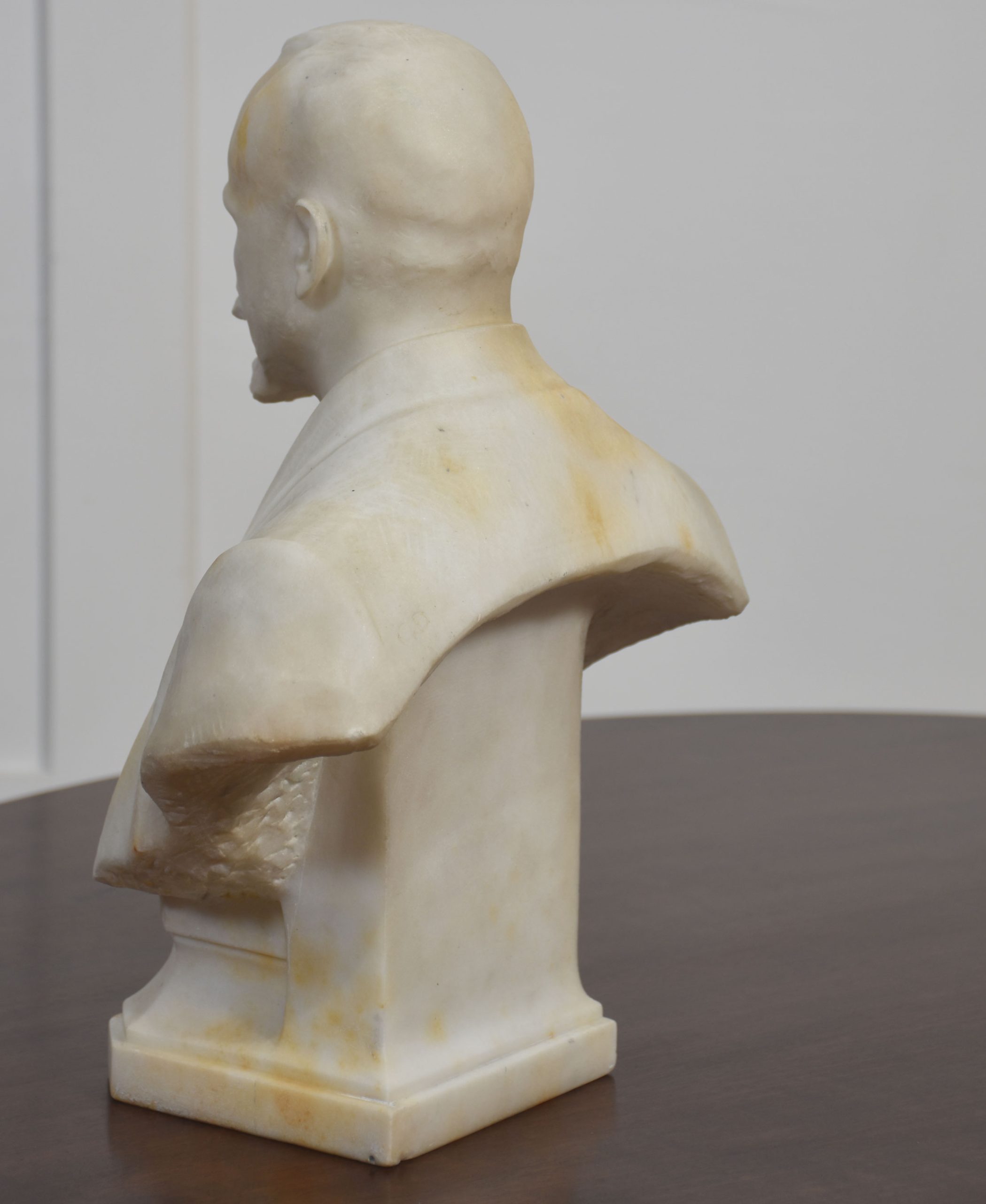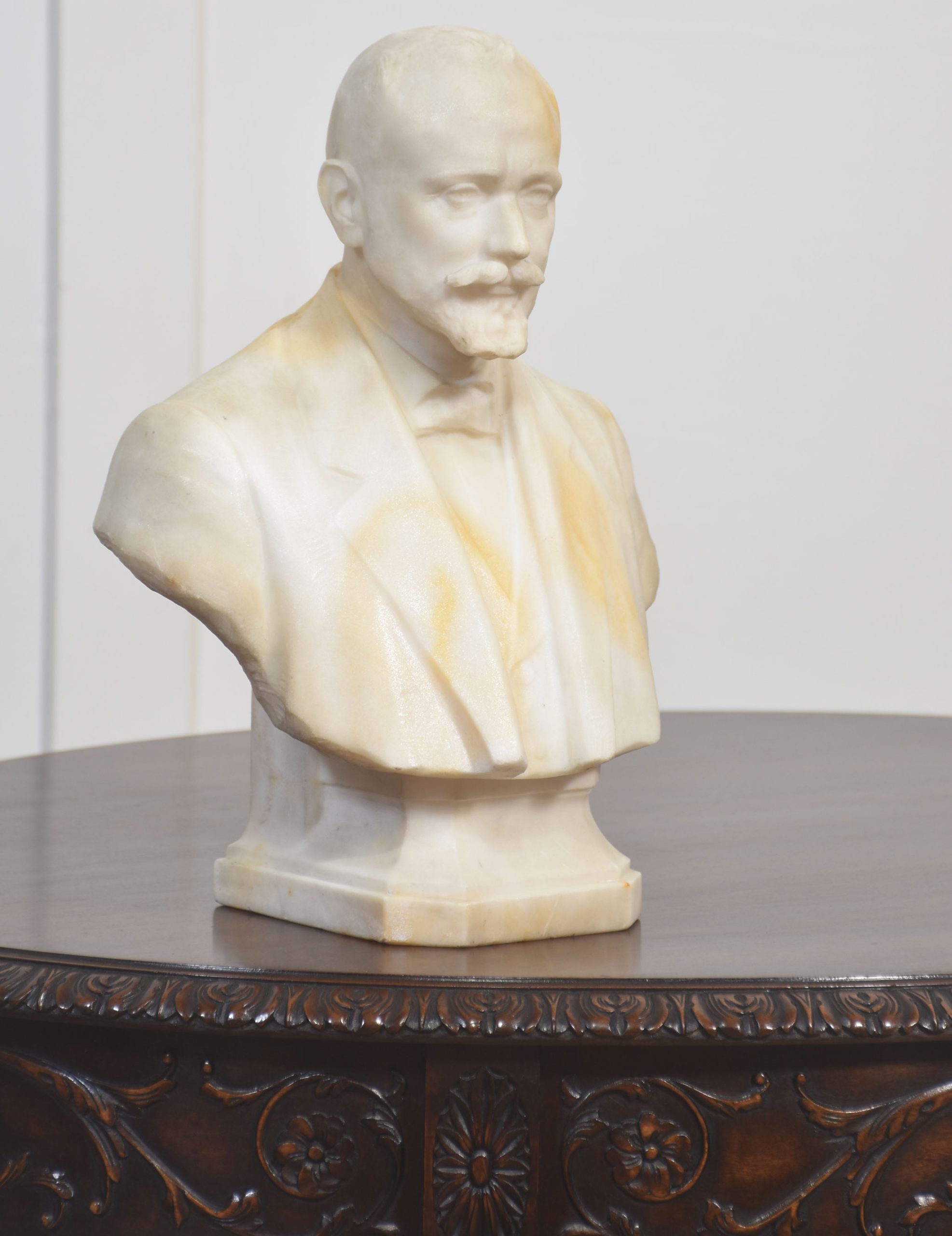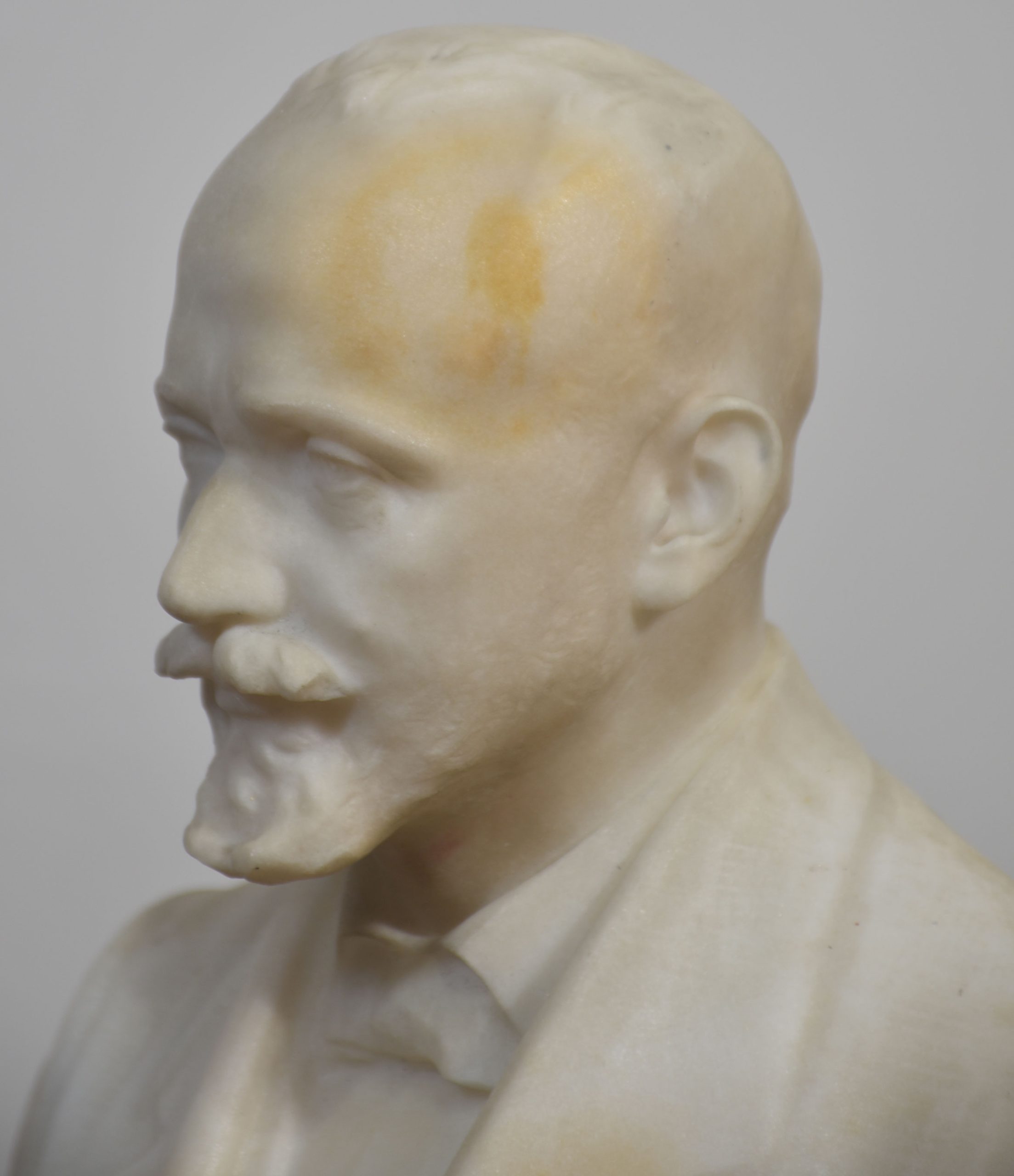 Carved marble portrait bust depicting a formally dressed gentleman with closely cropped hair, prominent moustache, and short beard. The subject is shown wearing a tailored jacket with lapels, waistcoat, and bow tie, executed with restrained realism and careful facial modelling. The shoulders are broadly carved, terminating above a shaped, integral socle base.