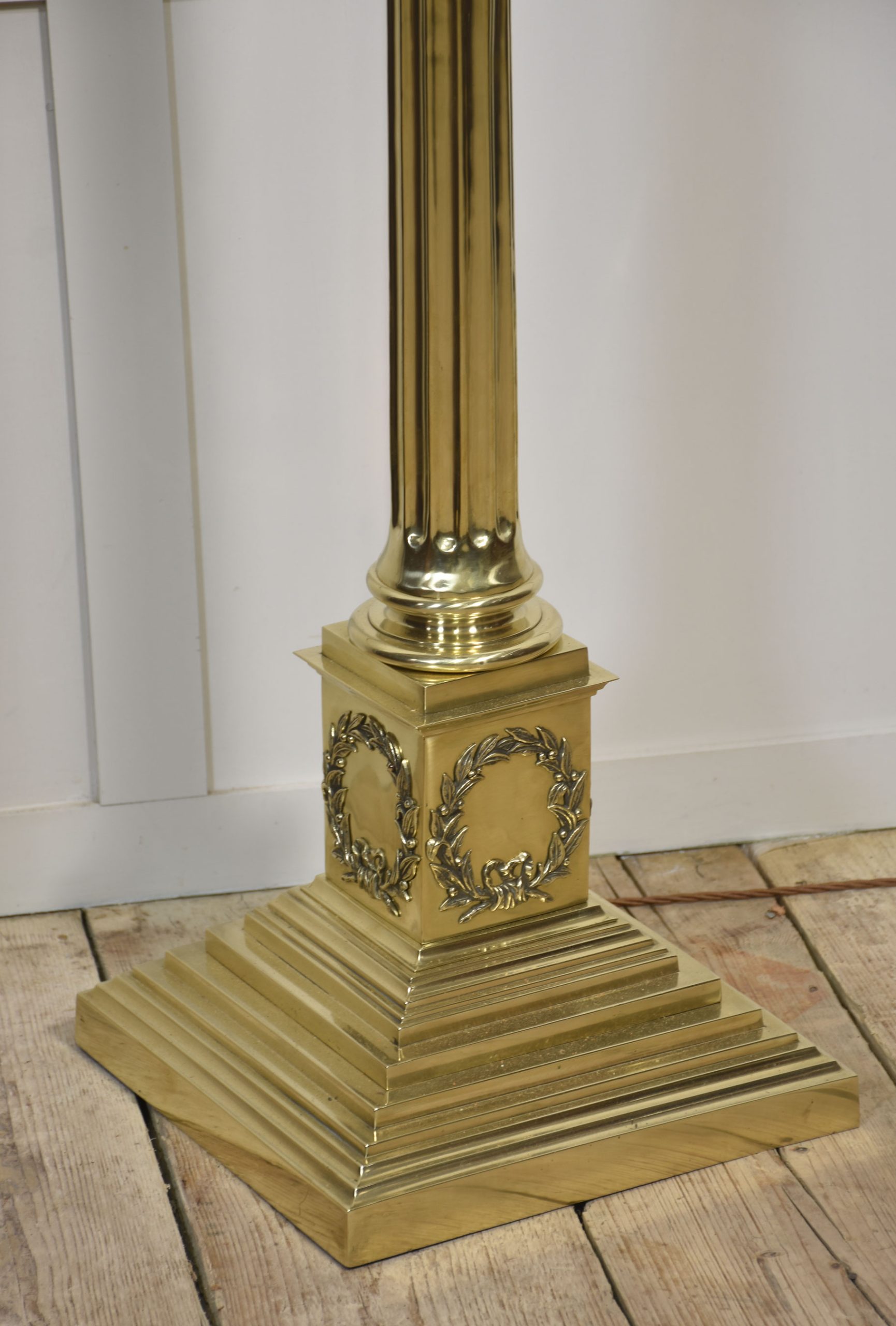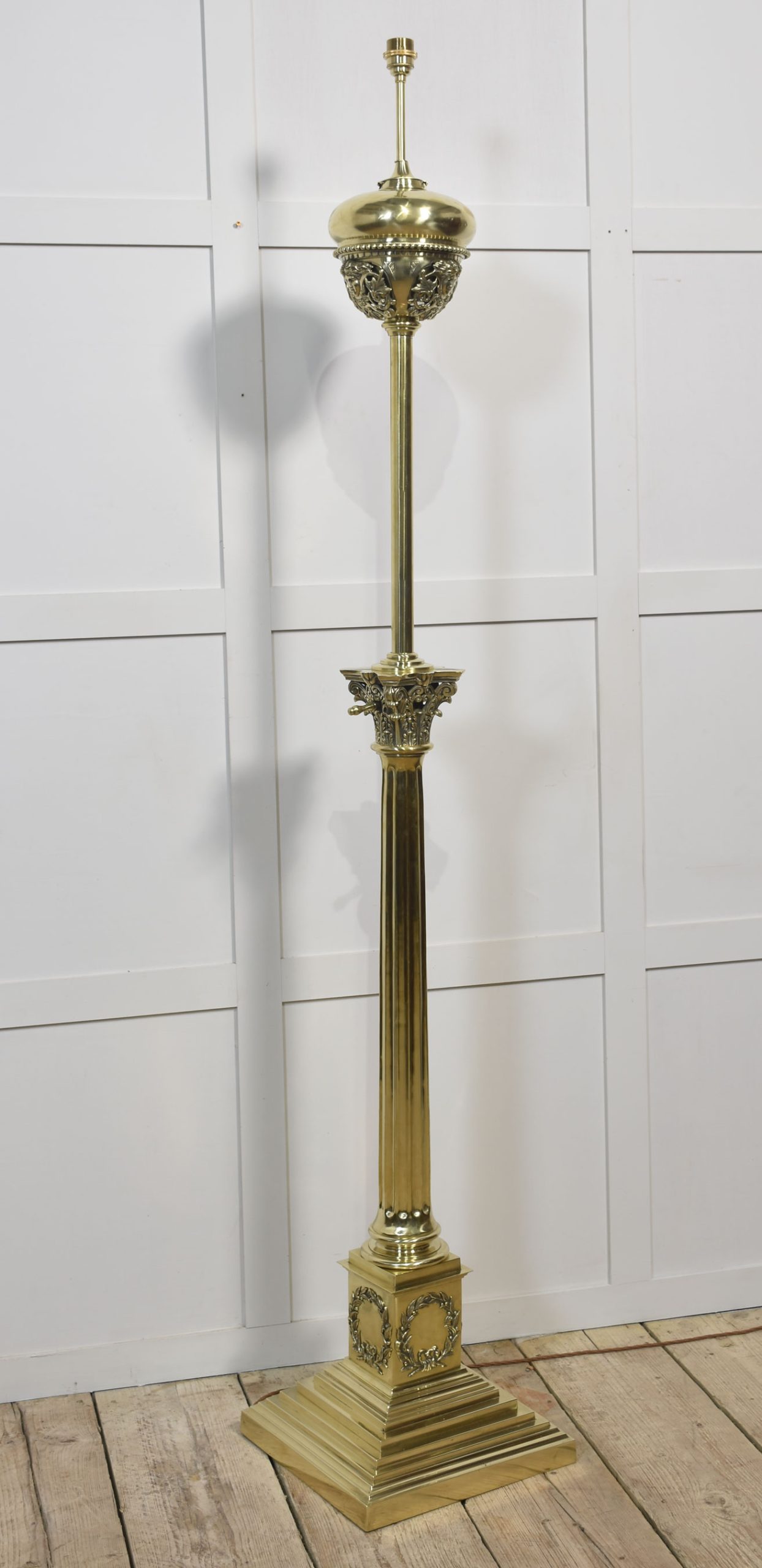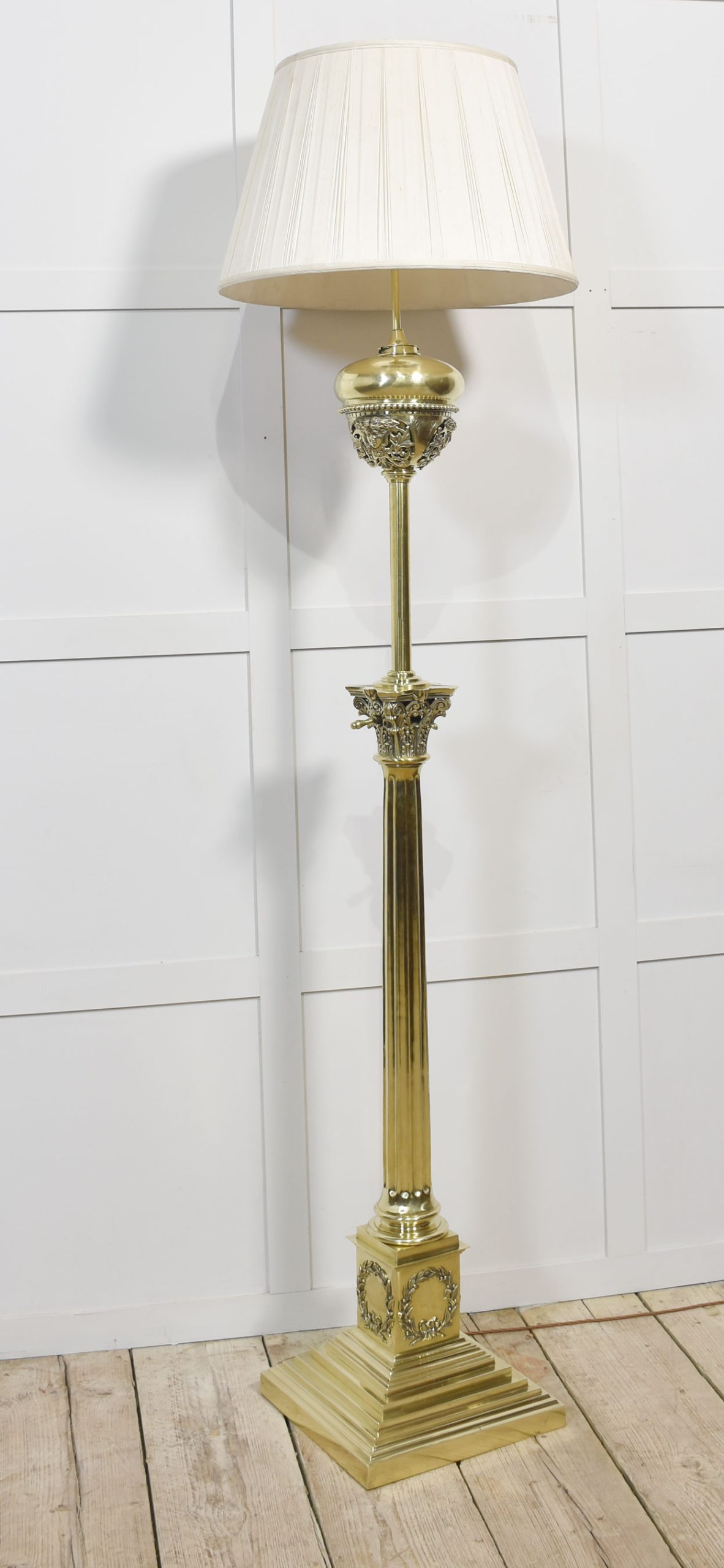 Very large, 19th-century brass standard lamp. Having a decorative oil reservoir, above the thick Corinthian column and an adjustable stem, raised up on a large stepped square base. The lamp has been rewired. Converted to electricity.