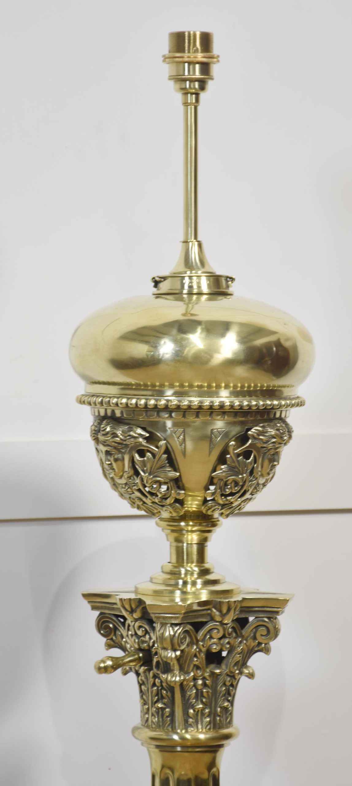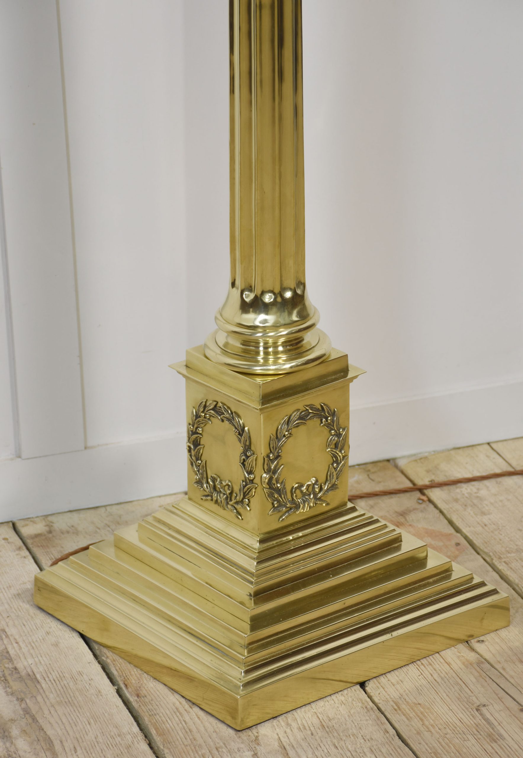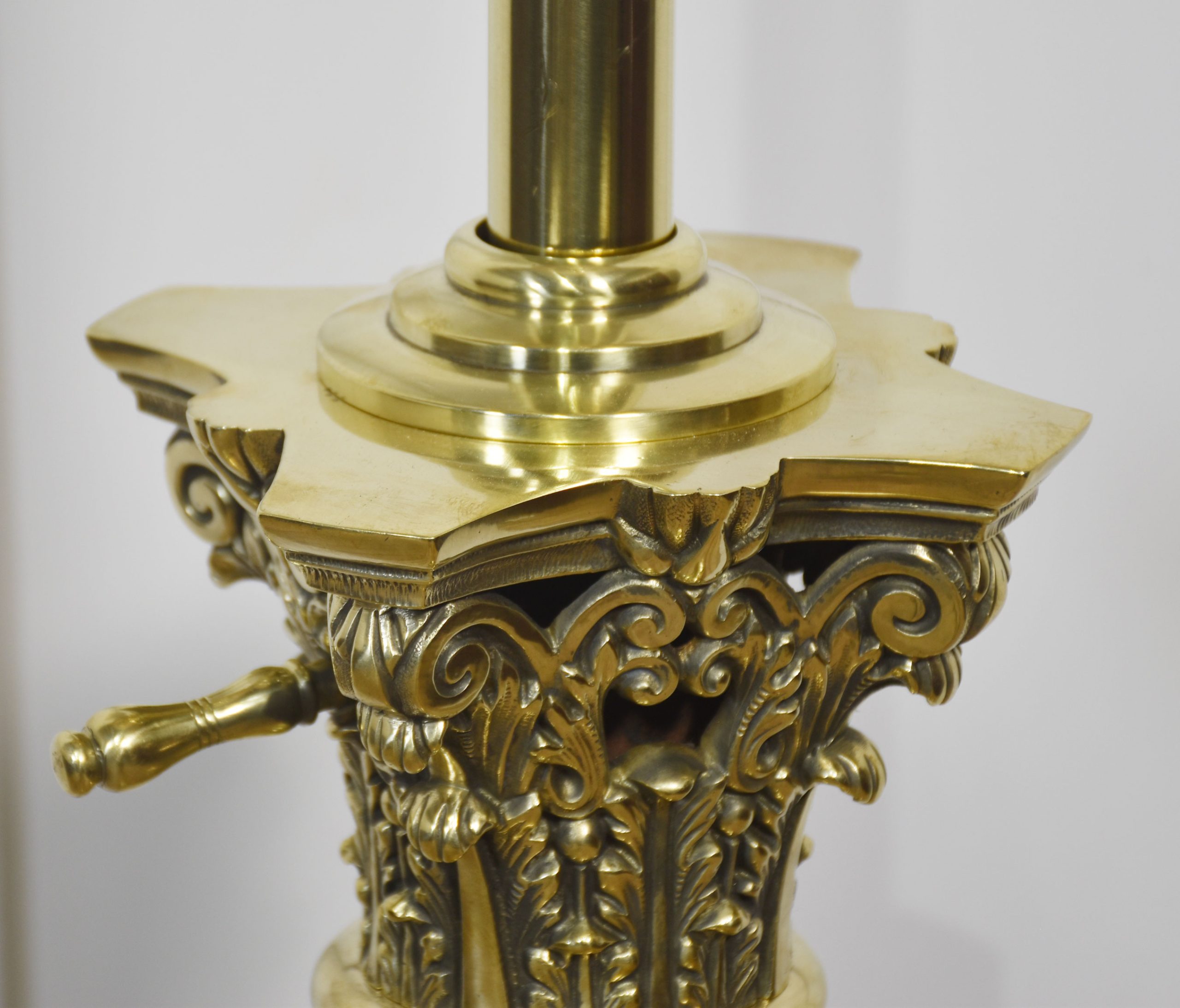 Very large, 19th-century brass standard lamp. Having a decorative oil reservoir, above the thick Corinthian column and an adjustable stem, raised up on a large stepped square base. The lamp has been rewired. Converted to electricity.