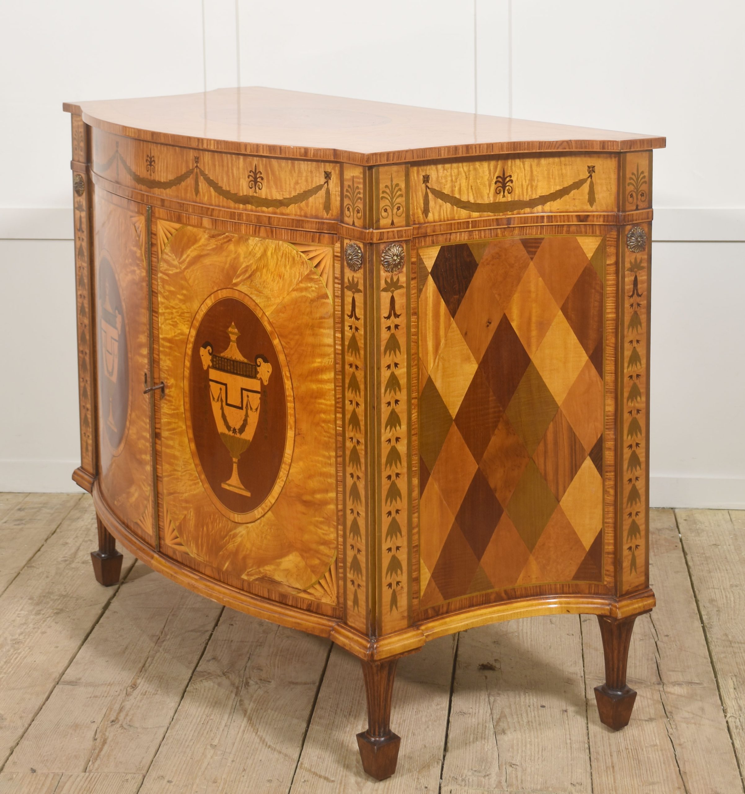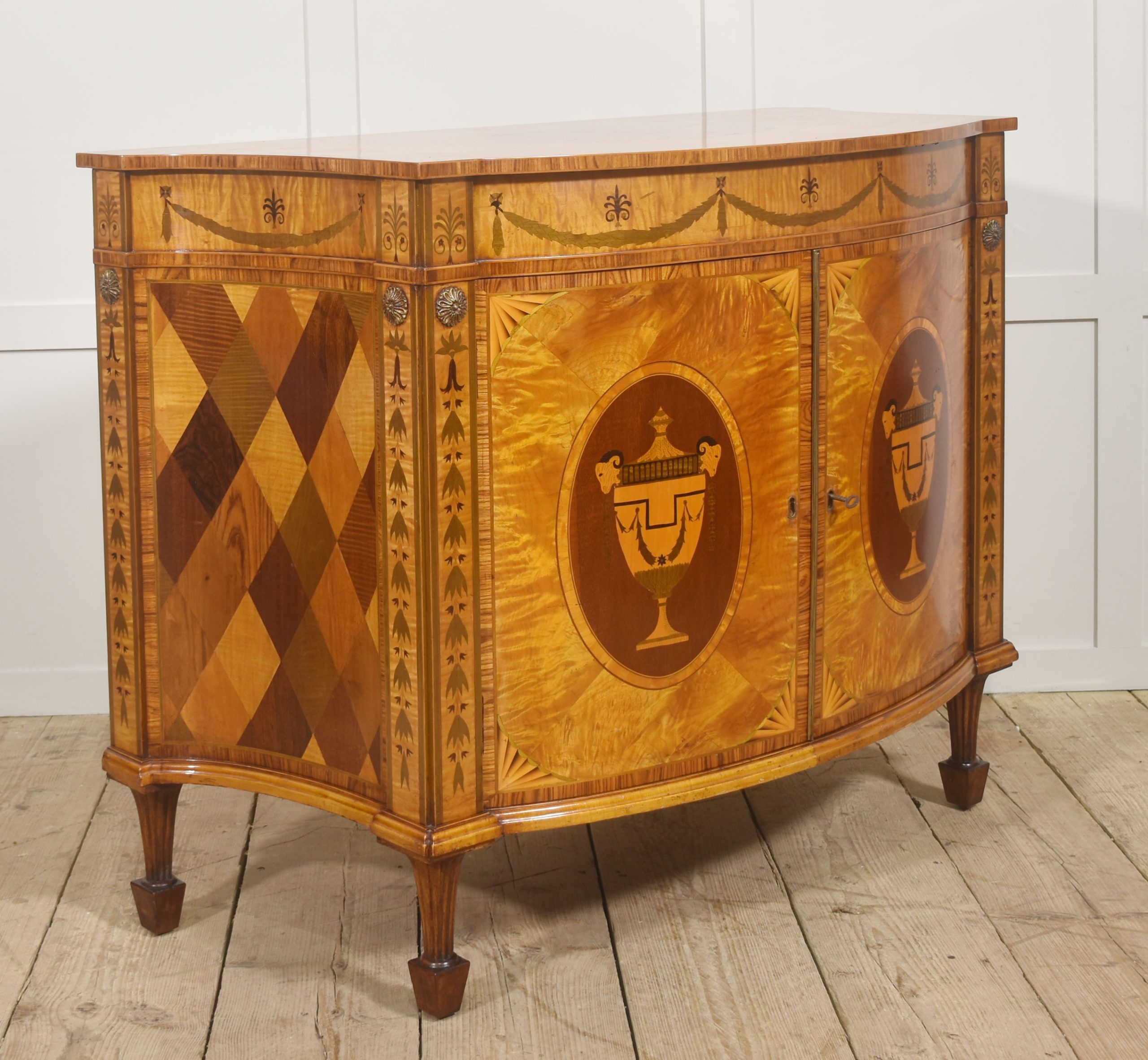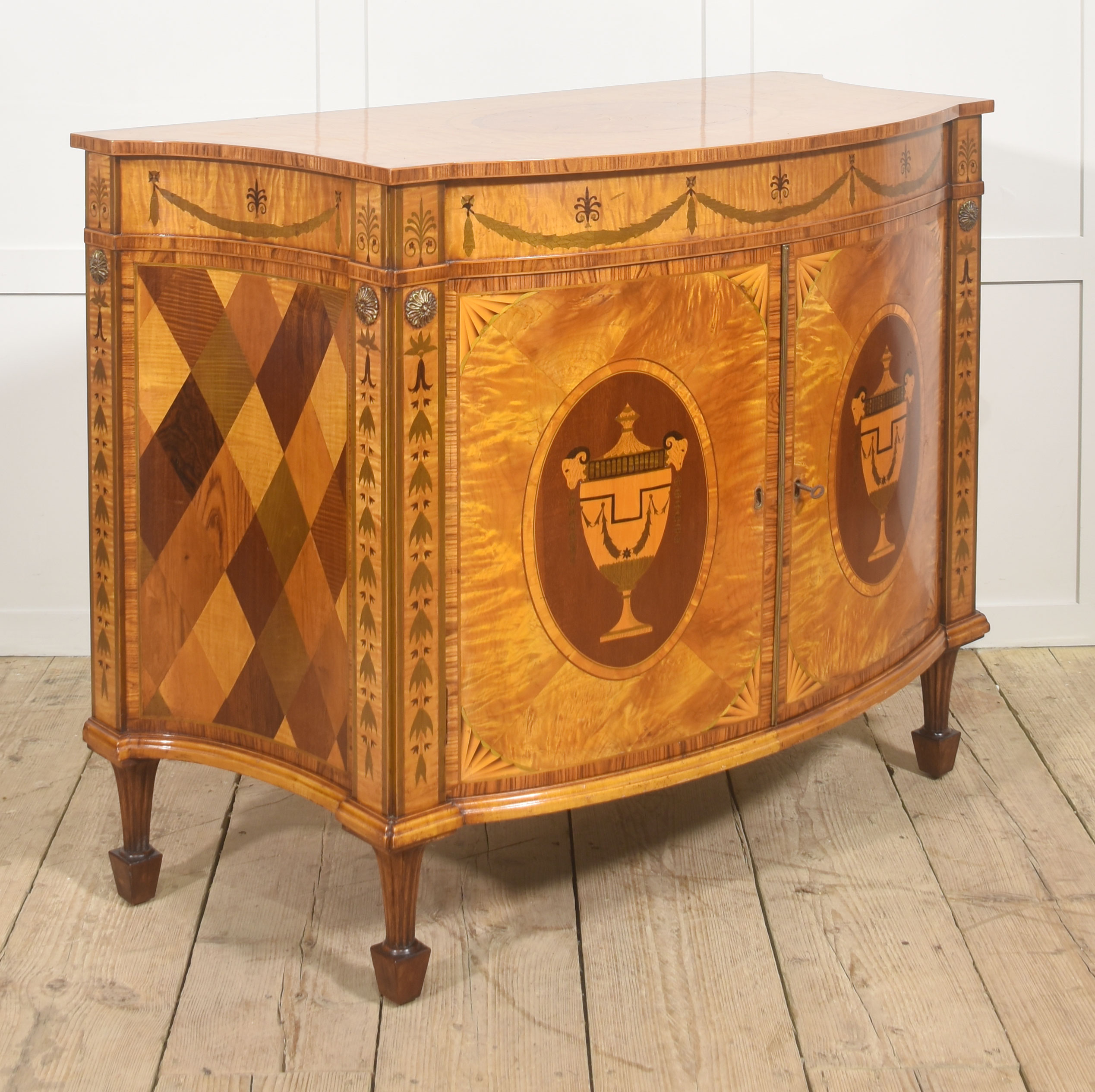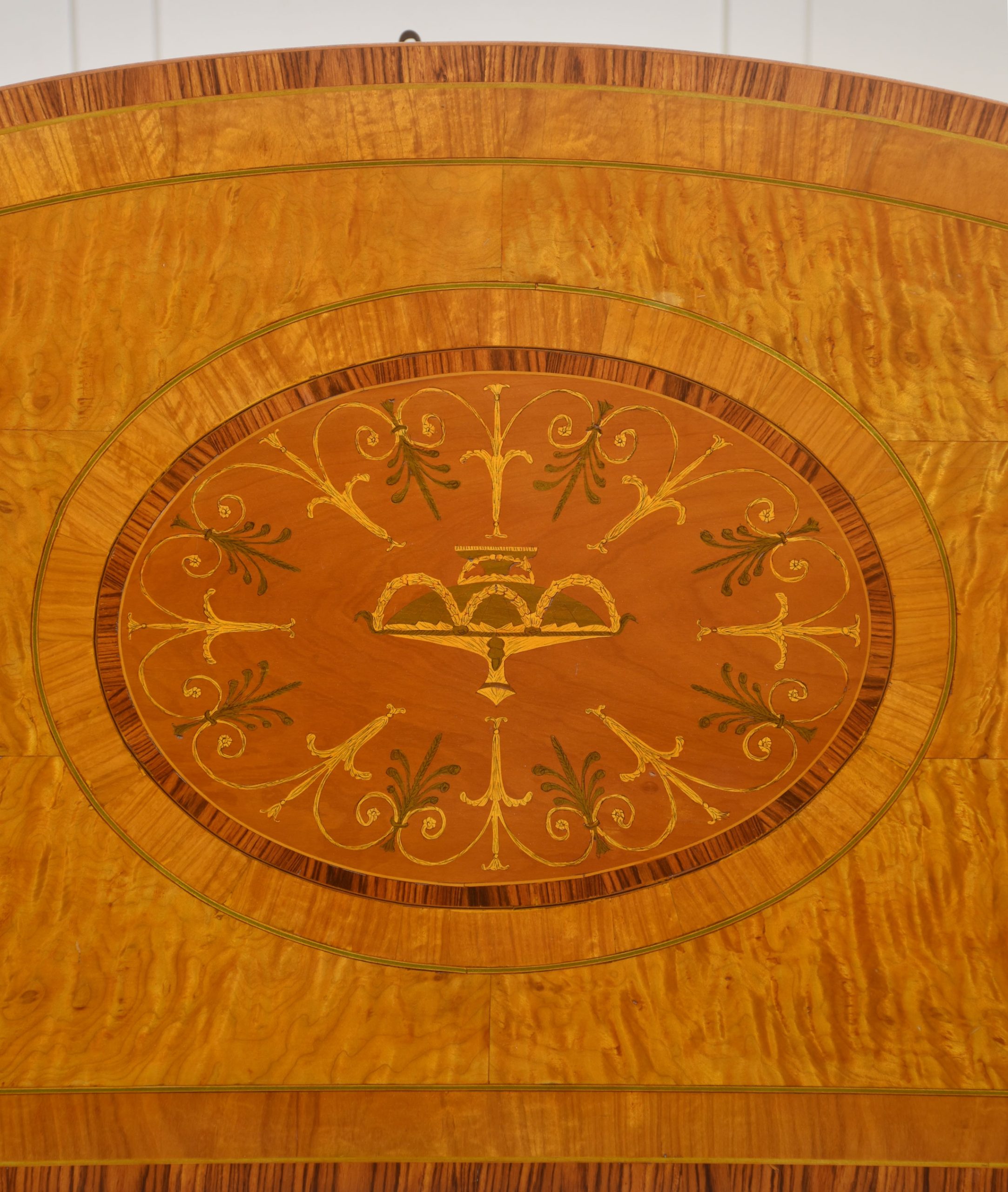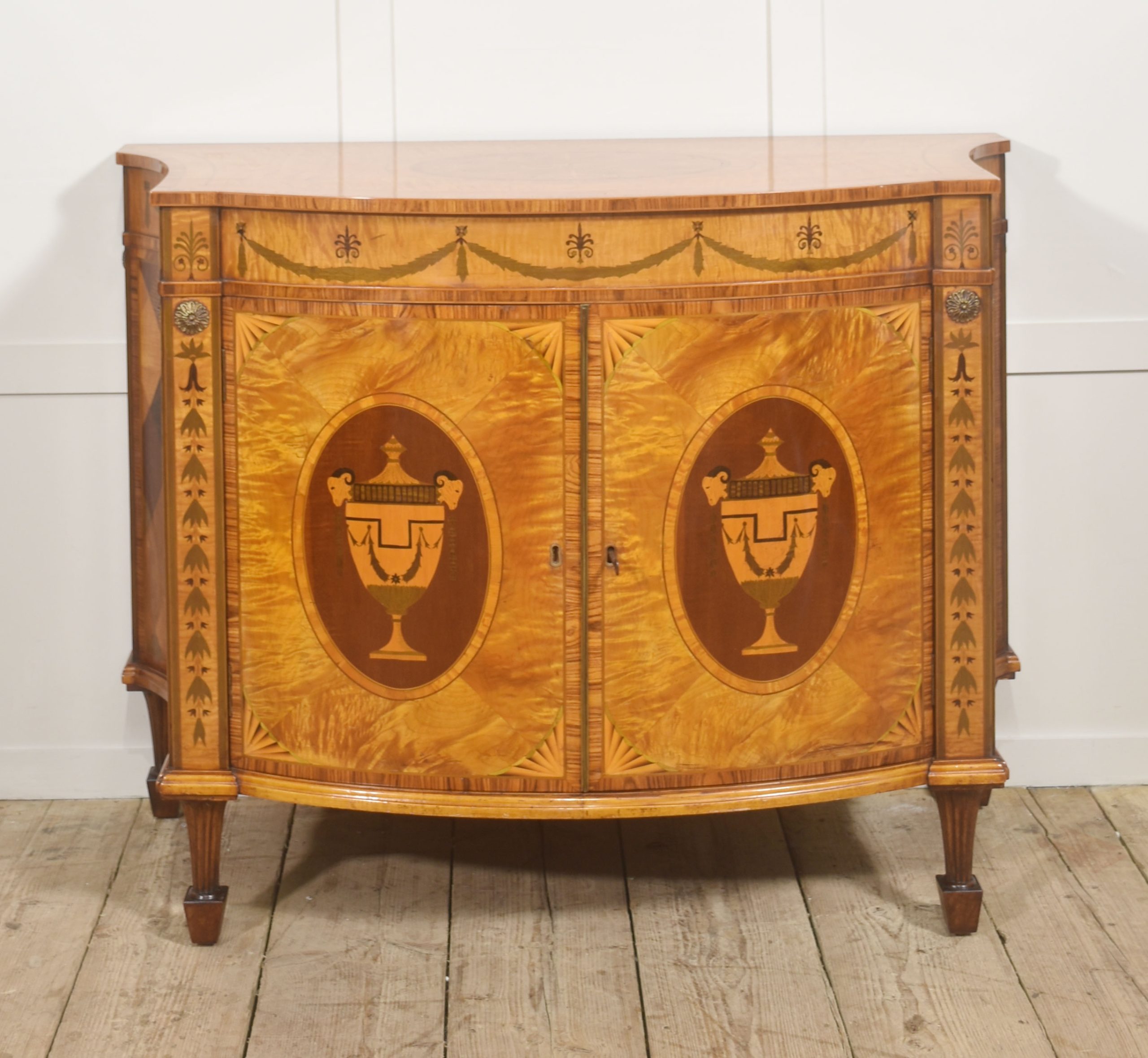The cabinet is veneered predominantly in vibrant, flame-figured satinwood, carefully bookmatched across the doors and top to create a luminous and visually dynamic surface. The central pair of cupboard doors are each inlaid with an oval reserve depicting a classical urn draped with festoons, executed in contrasting timbers against a warm ground. These urn panels are framed by delicate stringing and crossbanding, with radiating fan motifs to the corners, demonstrating precise and confident marquetry workmanship. Above, the frieze is decorated with inlaid swags suspended between stylized foliate devices, rendered in subtly stained veneers that provide refined tonal contrast while preserving the overall harmony of the design.