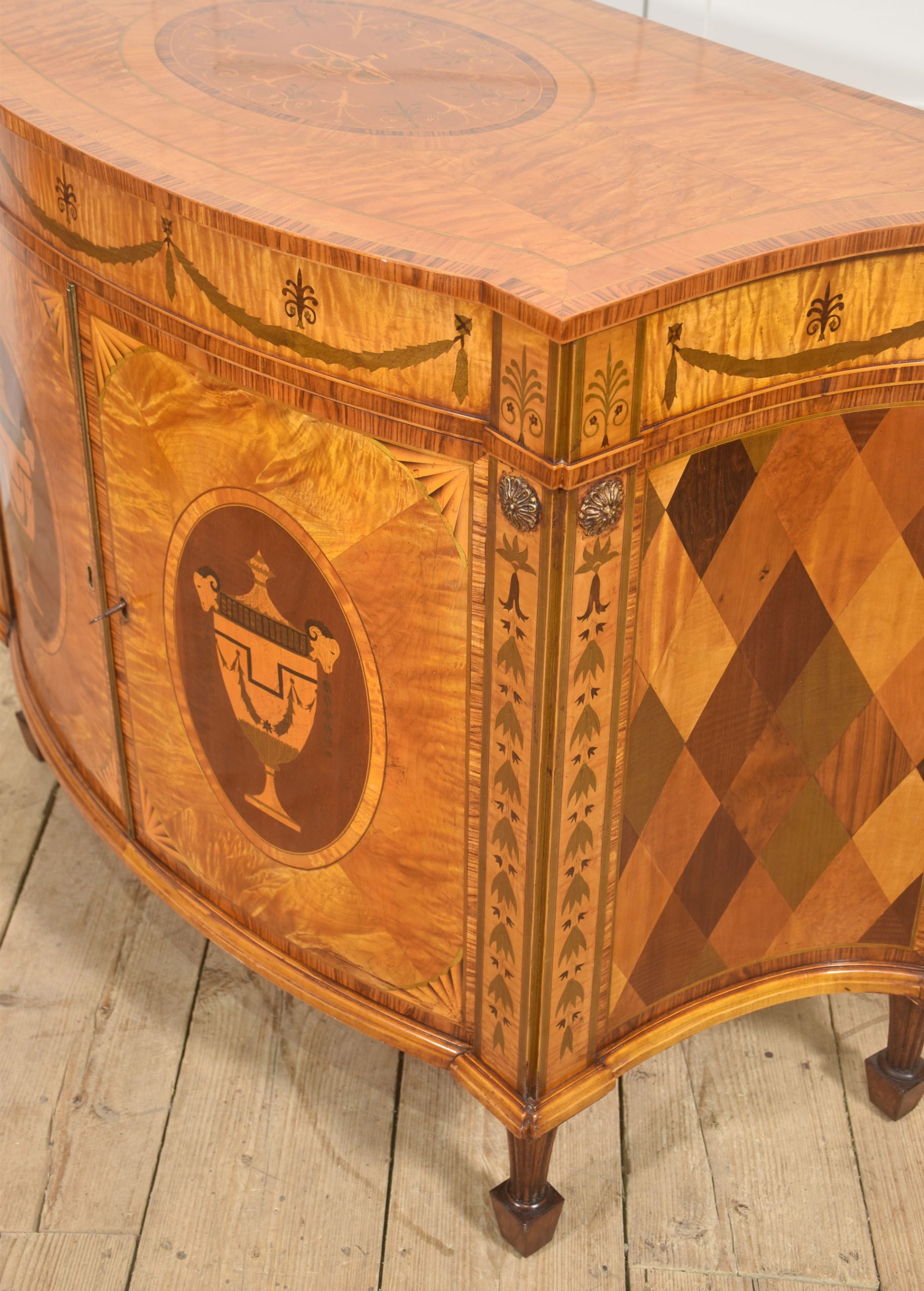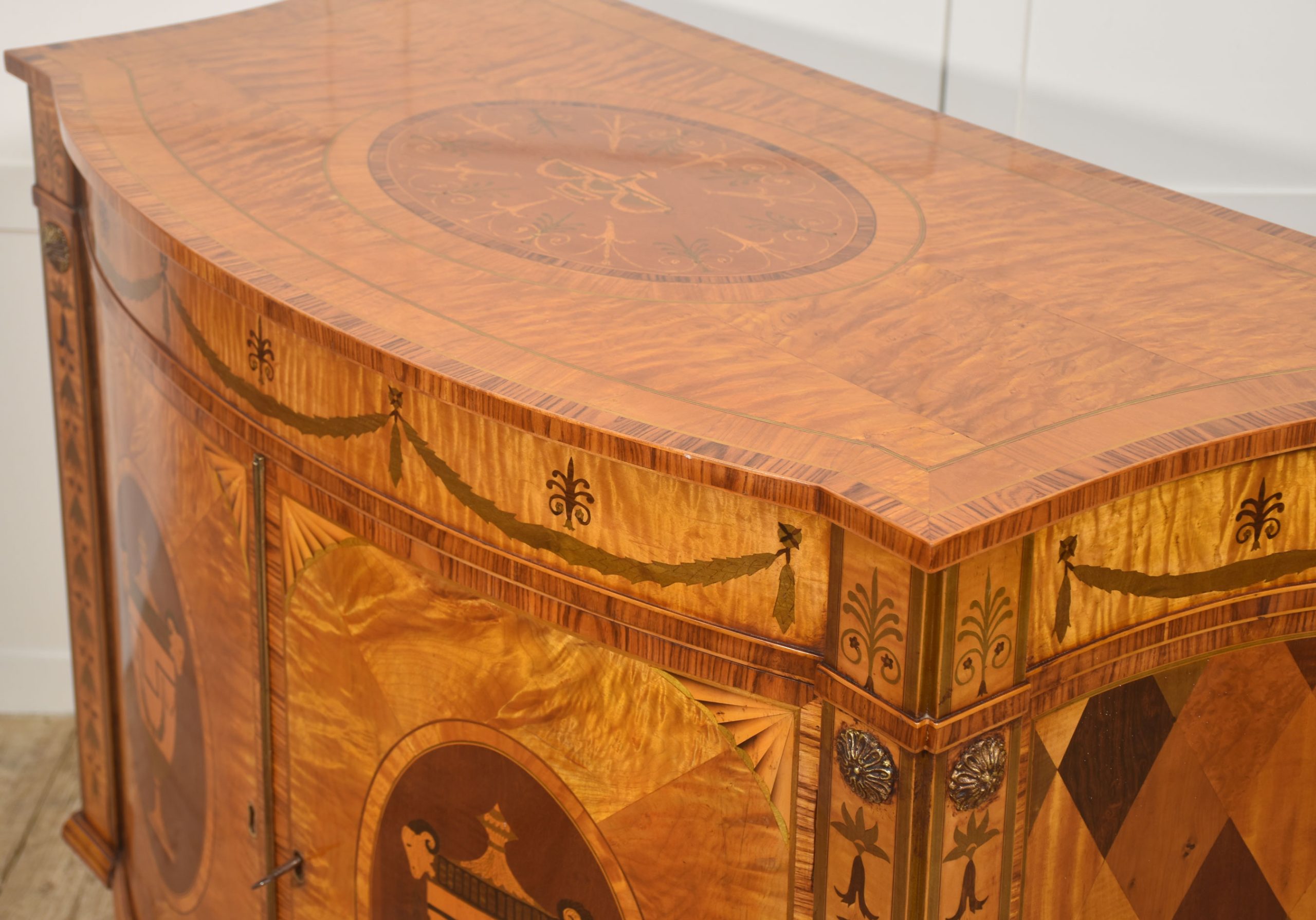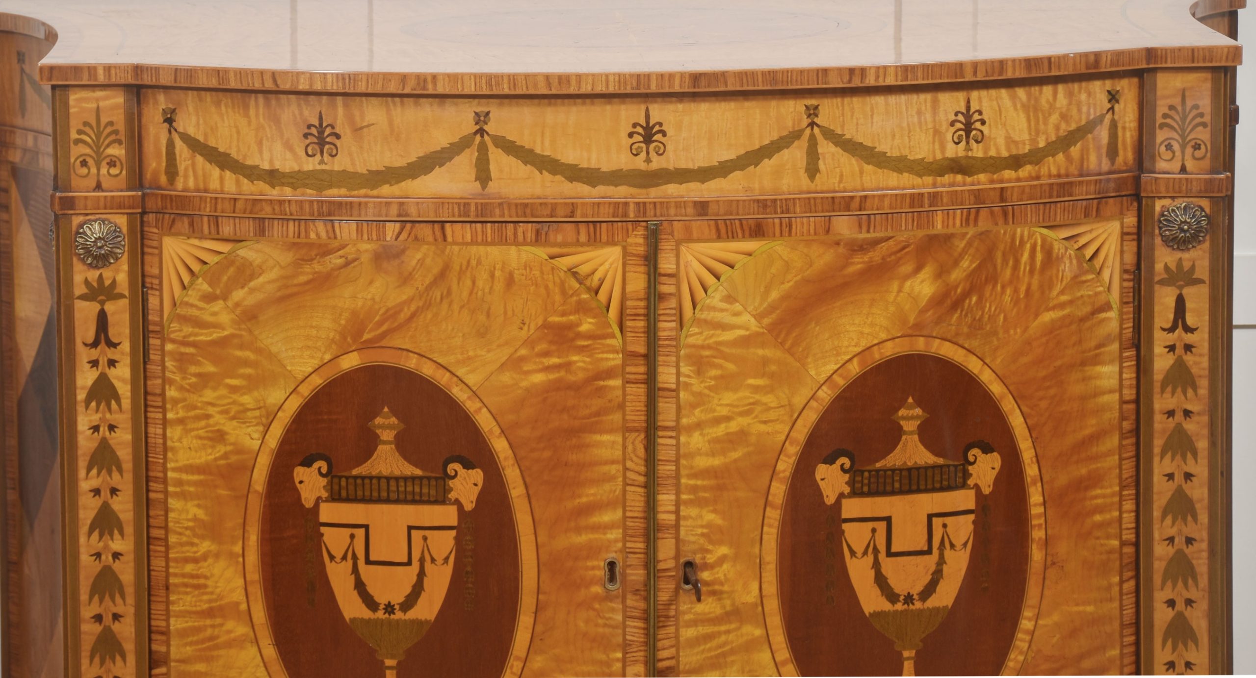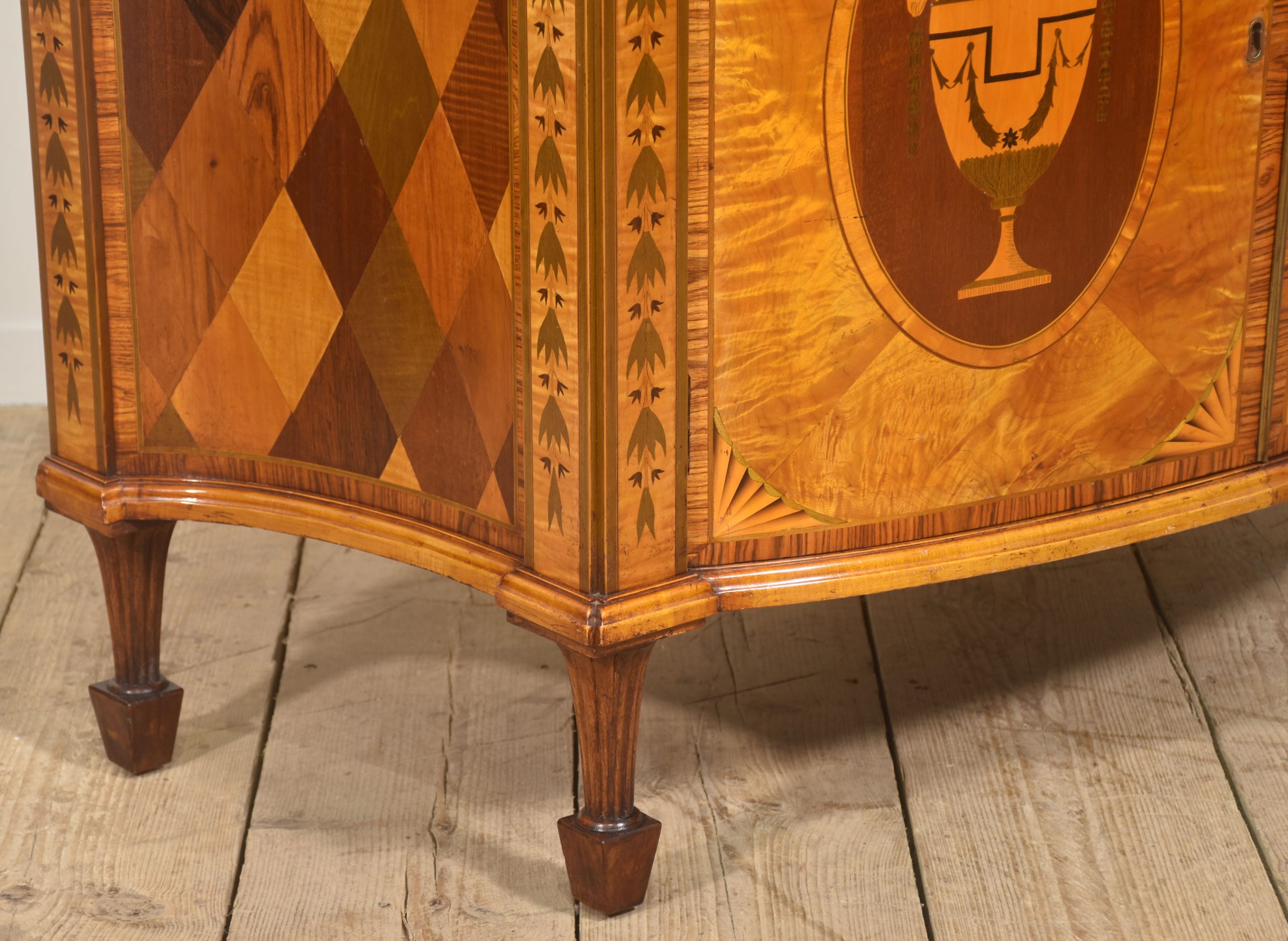 The cabinet is veneered predominantly in vibrant, flame-figured satinwood, carefully bookmatched across the doors and top to create a luminous and visually dynamic surface. The central pair of cupboard doors are each inlaid with an oval reserve depicting a classical urn draped with festoons, executed in contrasting timbers against a warm ground. These urn panels are framed by delicate stringing and crossbanding, with radiating fan motifs to the corners, demonstrating precise and confident marquetry workmanship. Above, the frieze is decorated with inlaid swags suspended between stylized foliate devices, rendered in subtly stained veneers that provide refined tonal contrast while preserving the overall harmony of the design.