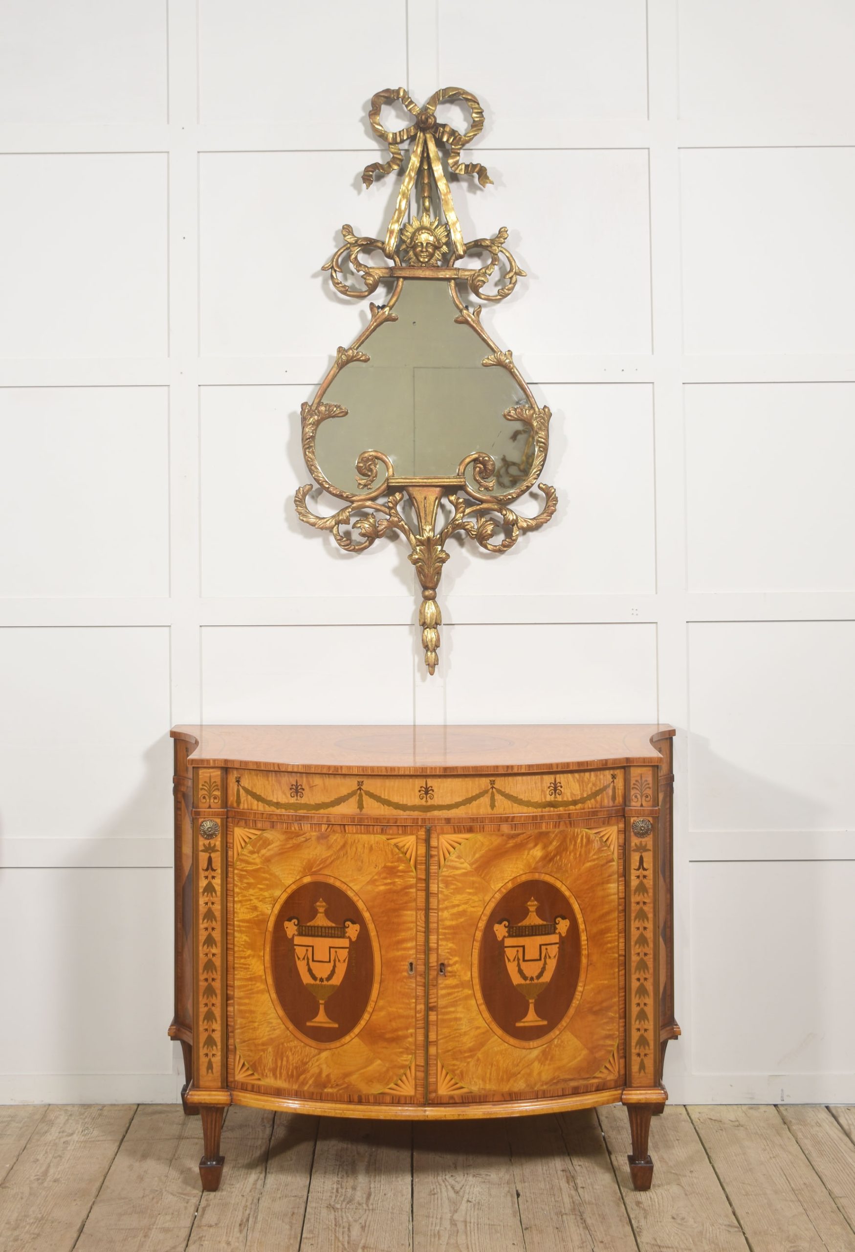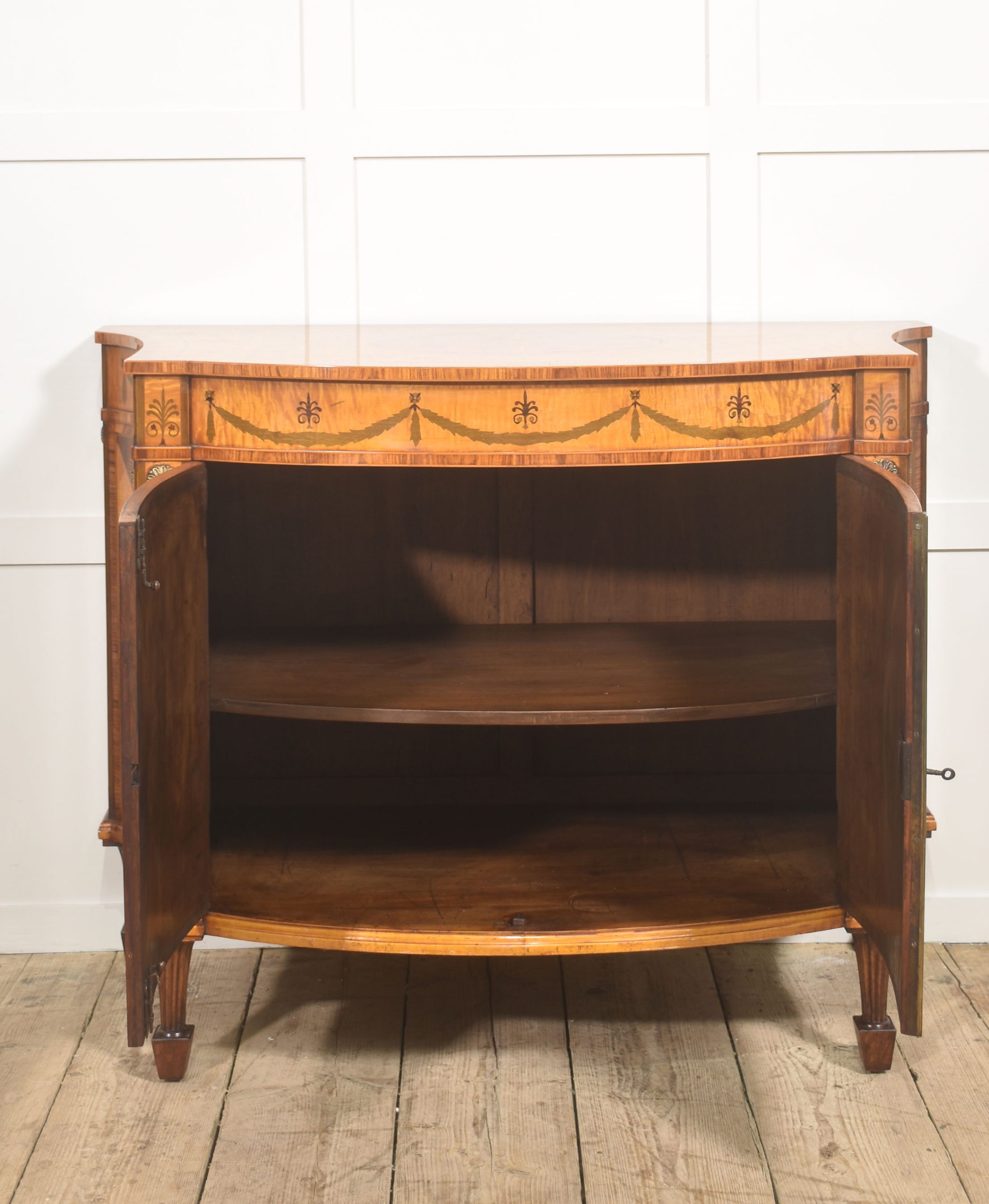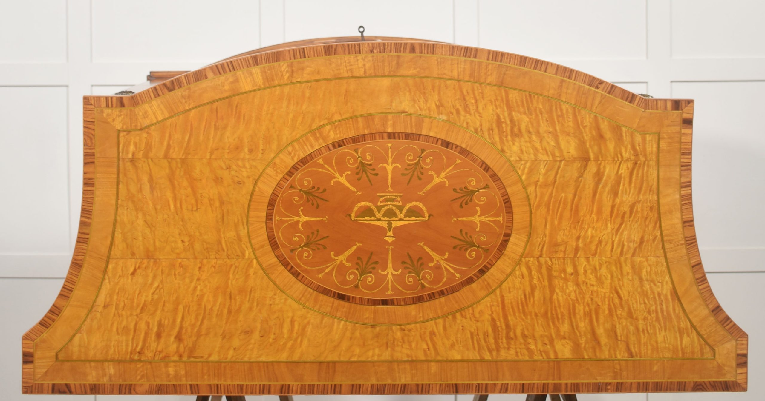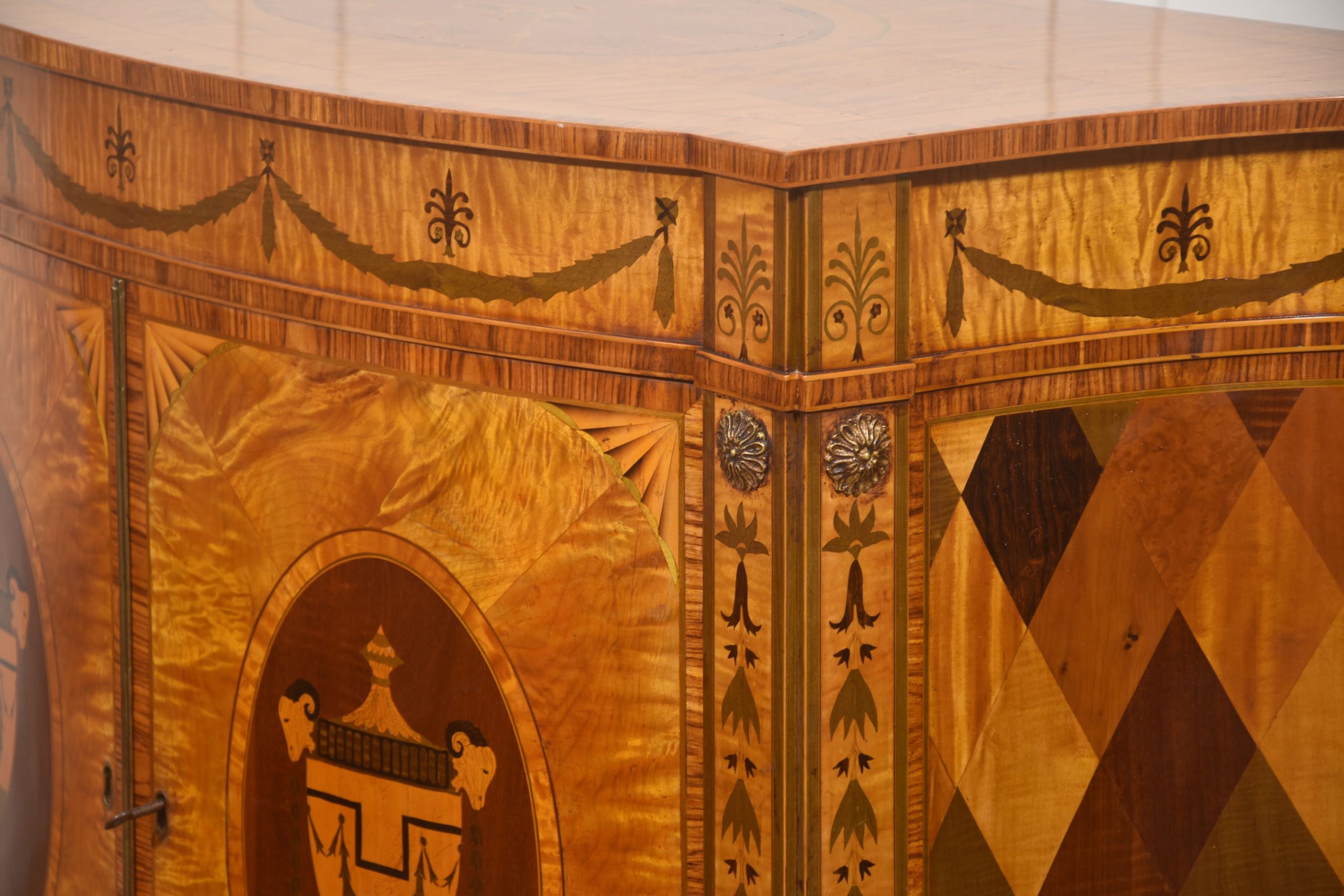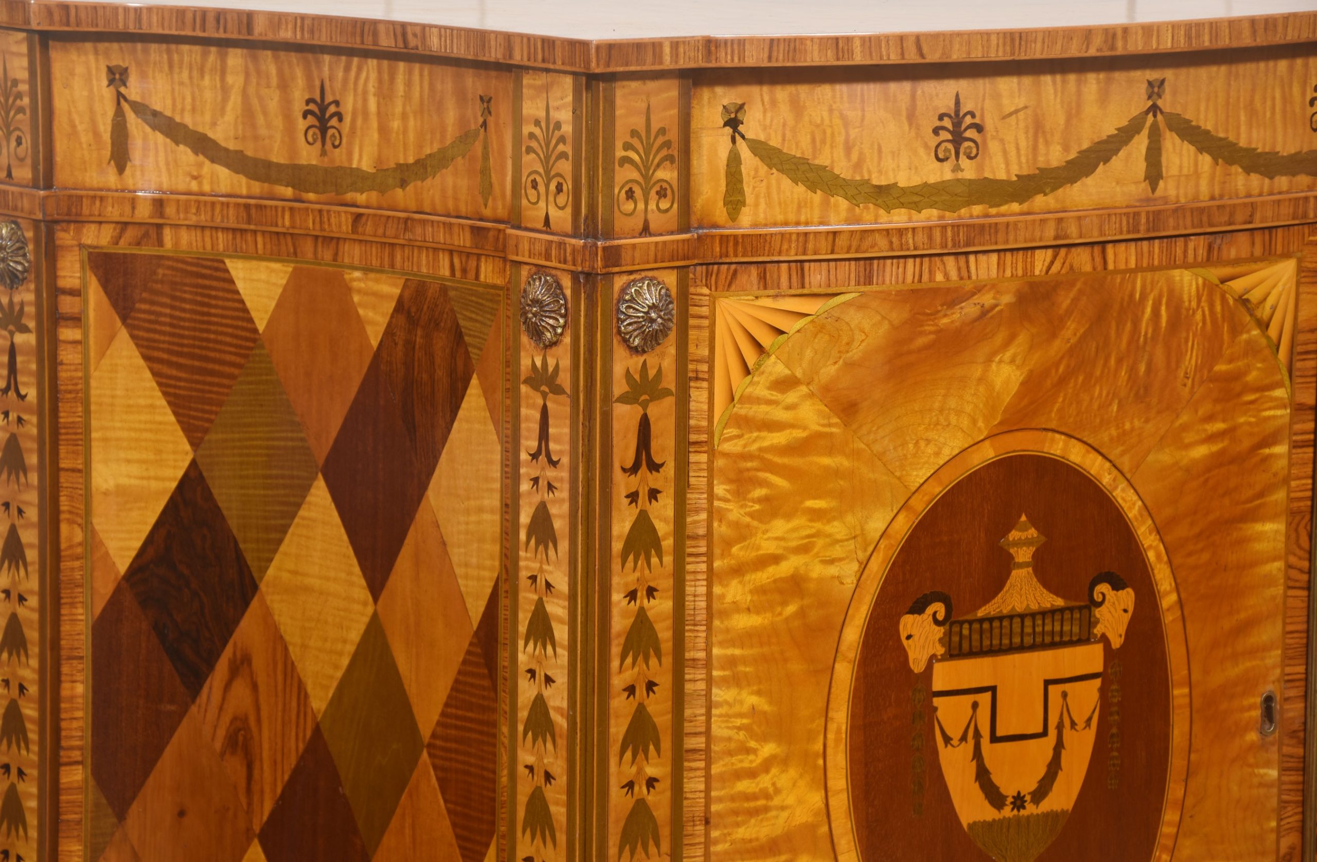 The cabinet is veneered predominantly in vibrant, flame-figured satinwood, carefully bookmatched across the doors and top to create a luminous and visually dynamic surface. The central pair of cupboard doors are each inlaid with an oval reserve depicting a classical urn draped with festoons, executed in contrasting timbers against a warm ground. These urn panels are framed by delicate stringing and crossbanding, with radiating fan motifs to the corners, demonstrating precise and confident marquetry workmanship. Above, the frieze is decorated with inlaid swags suspended between stylized foliate devices, rendered in subtly stained veneers that provide refined tonal contrast while preserving the overall harmony of the design.