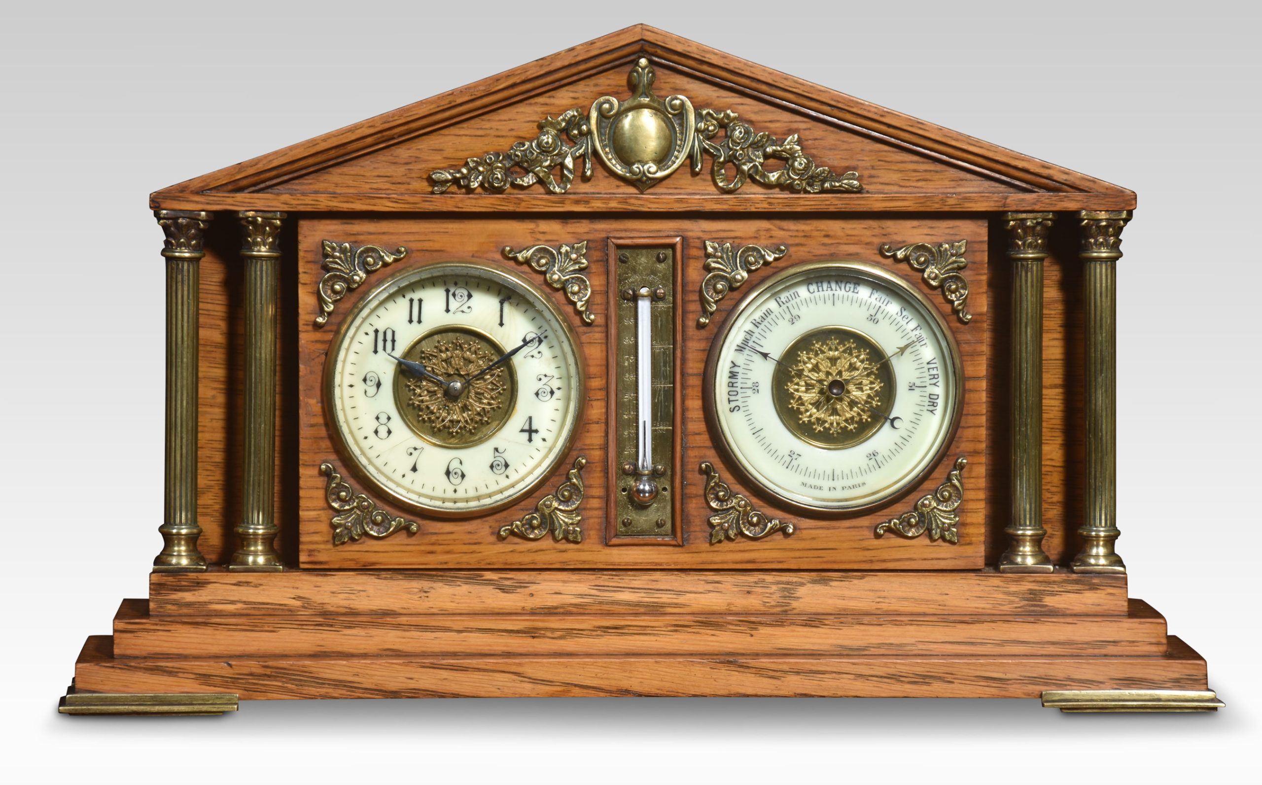 Oak architectural desk clock and barometer, of temple form with ceramic dials, centred with a thermometer and within double Corinthian brass columns. All raised up on a stepped base.
