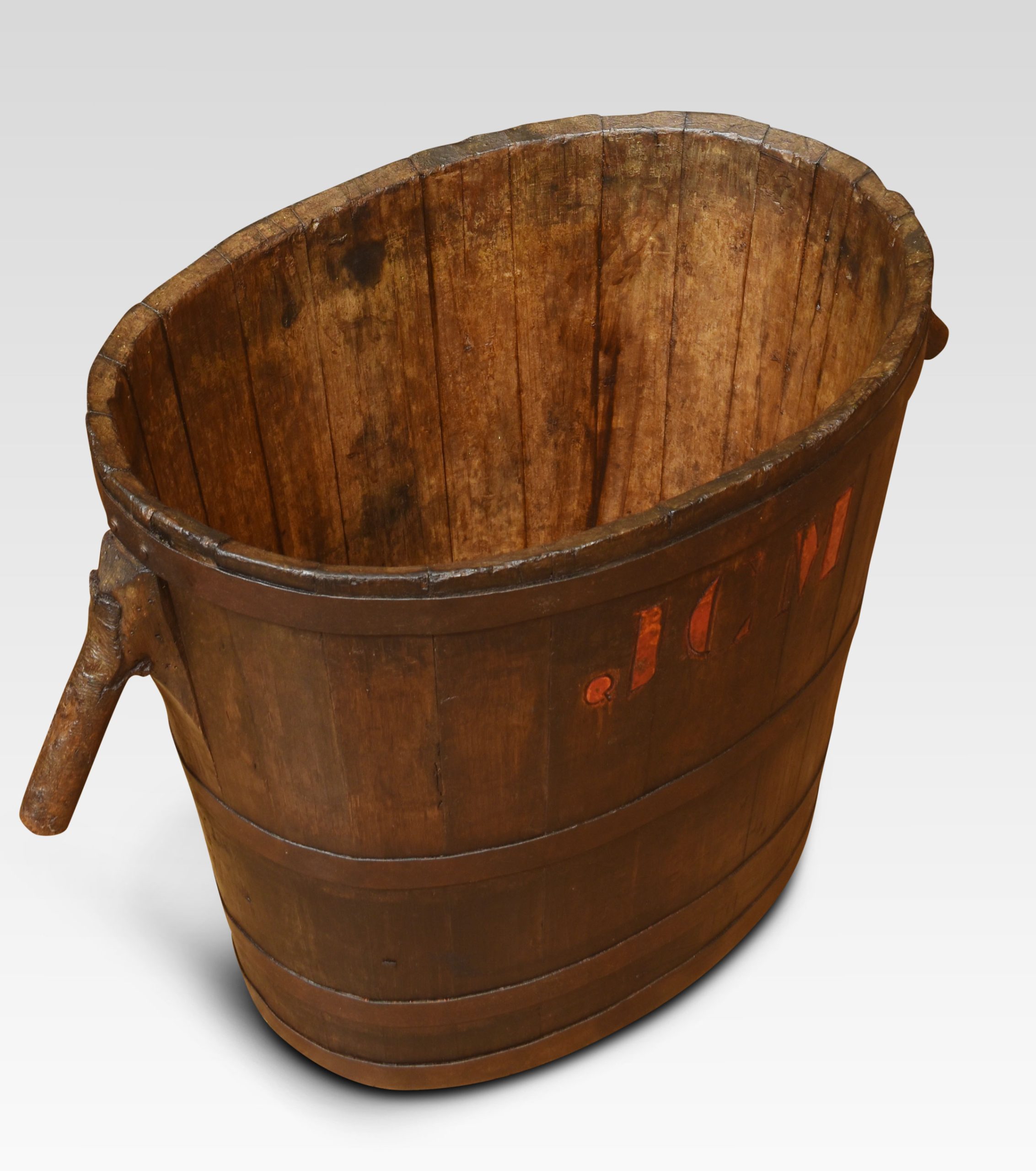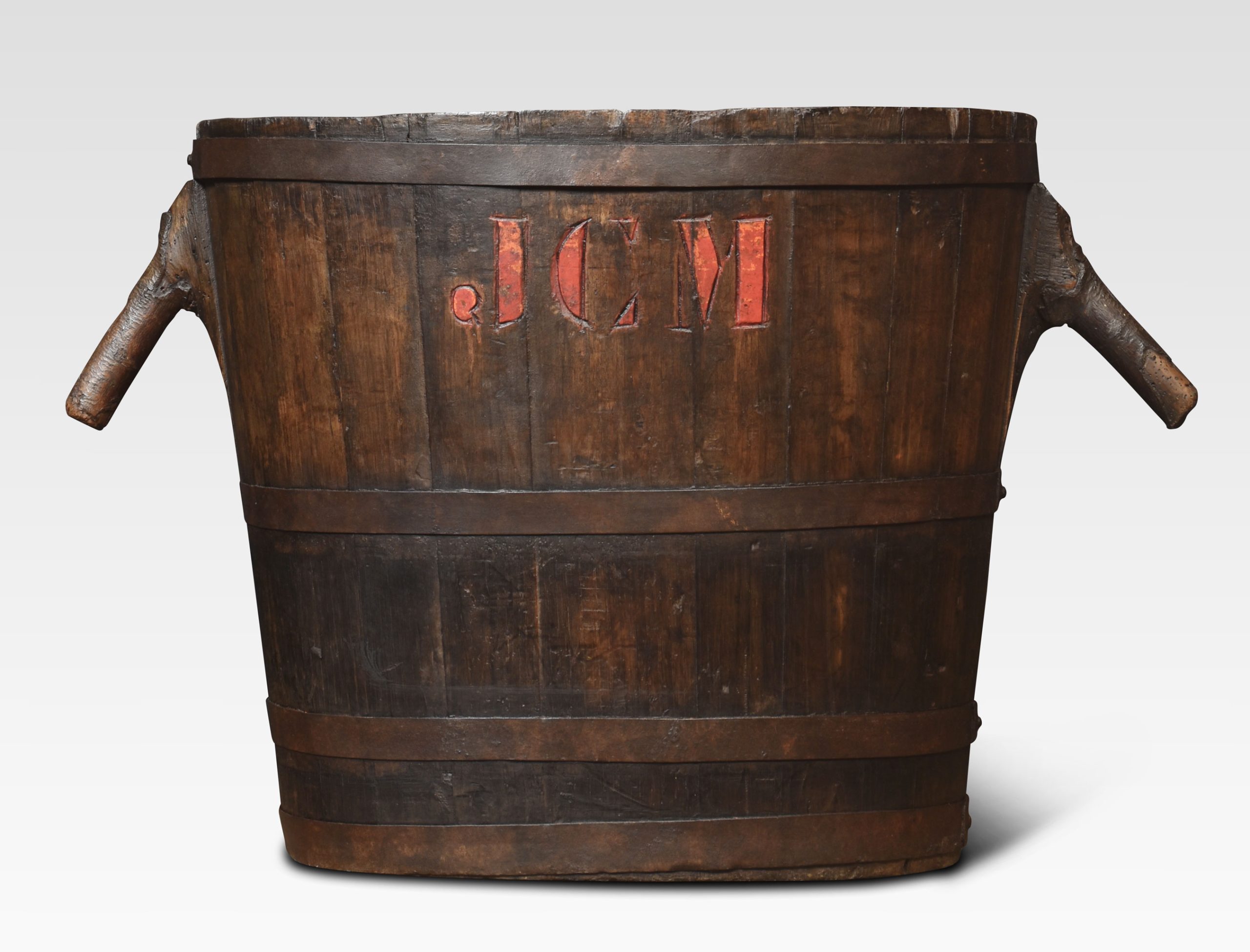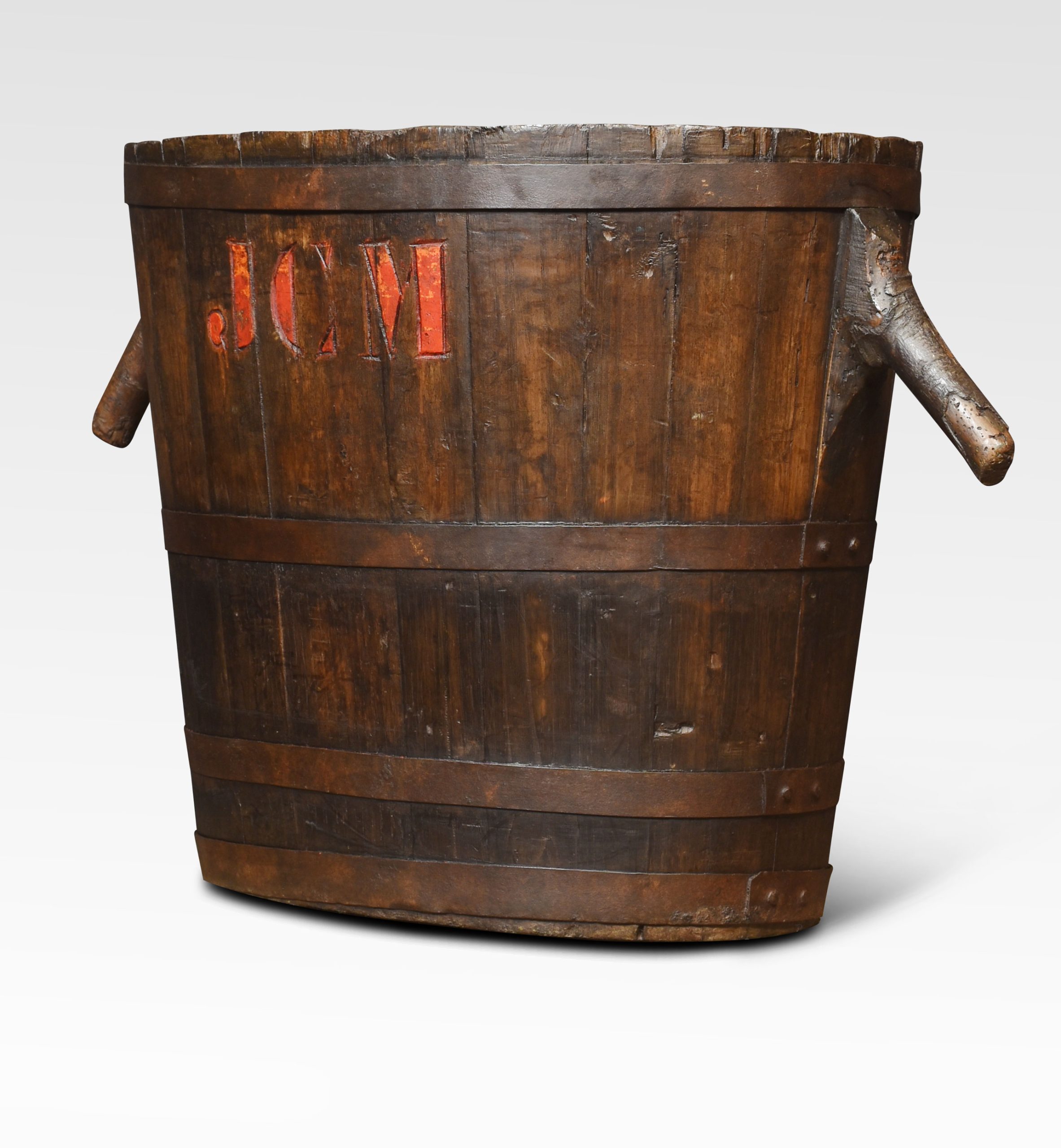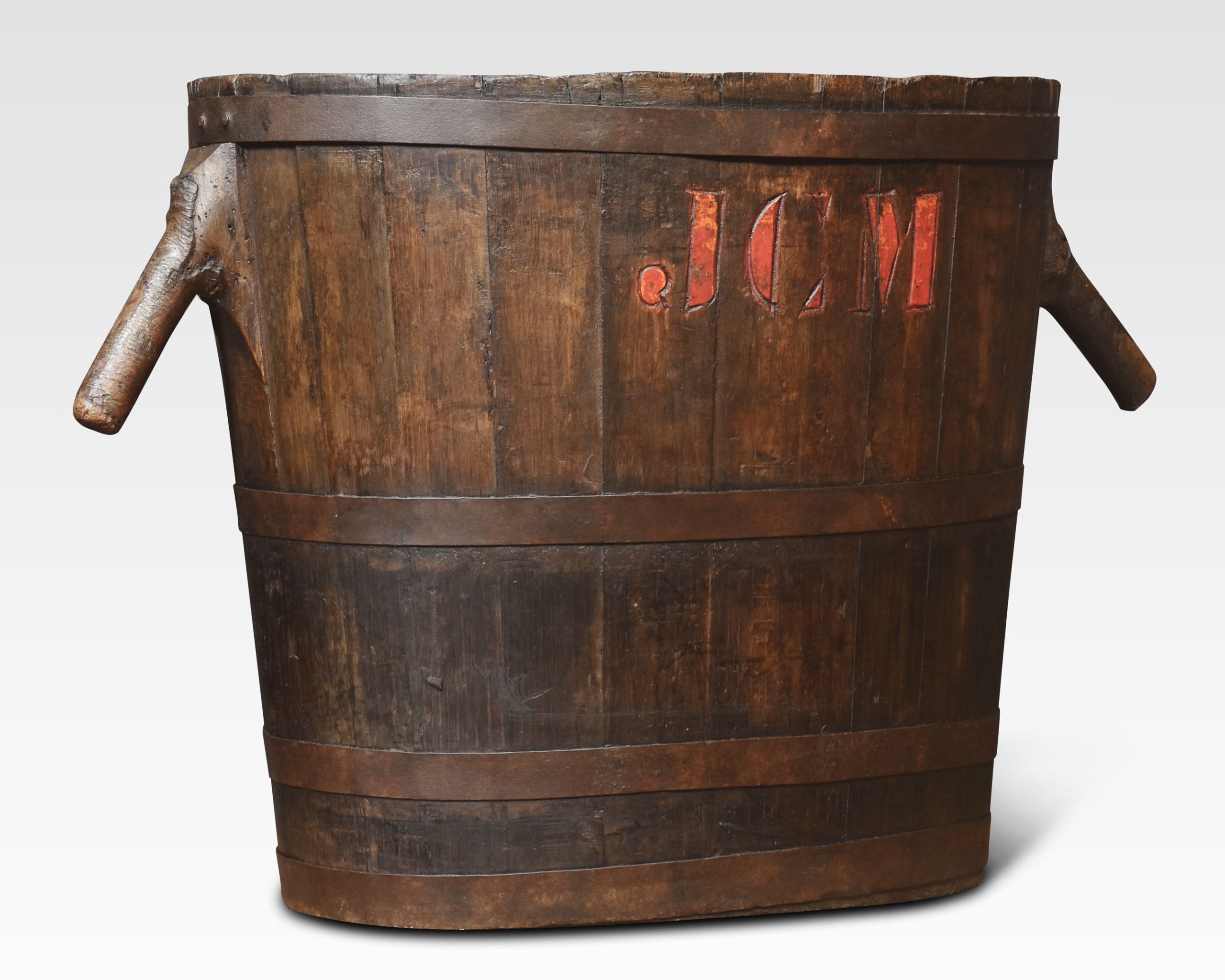 oval-shaped log bin the oak frame encased in iron bands having stylised handles.