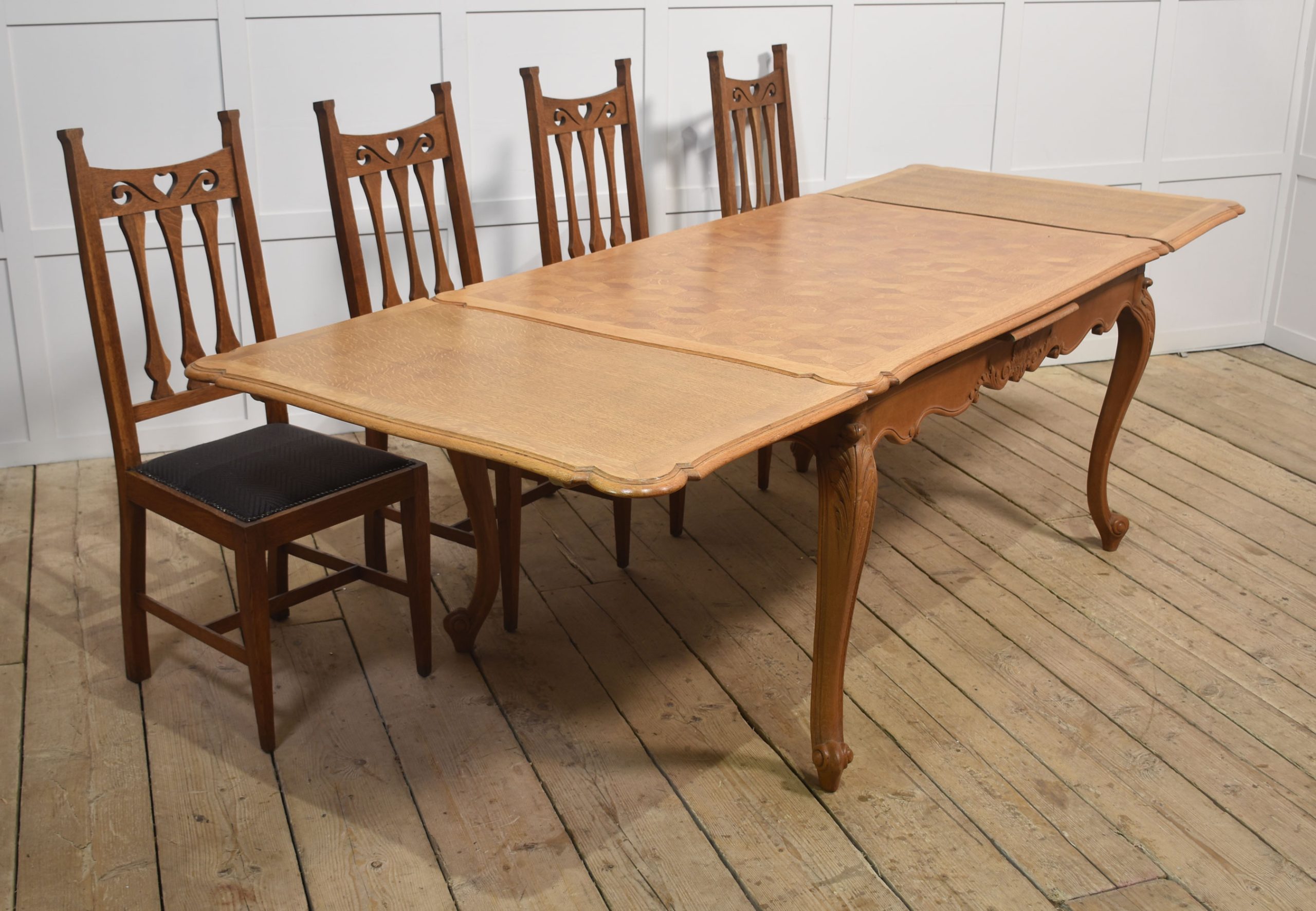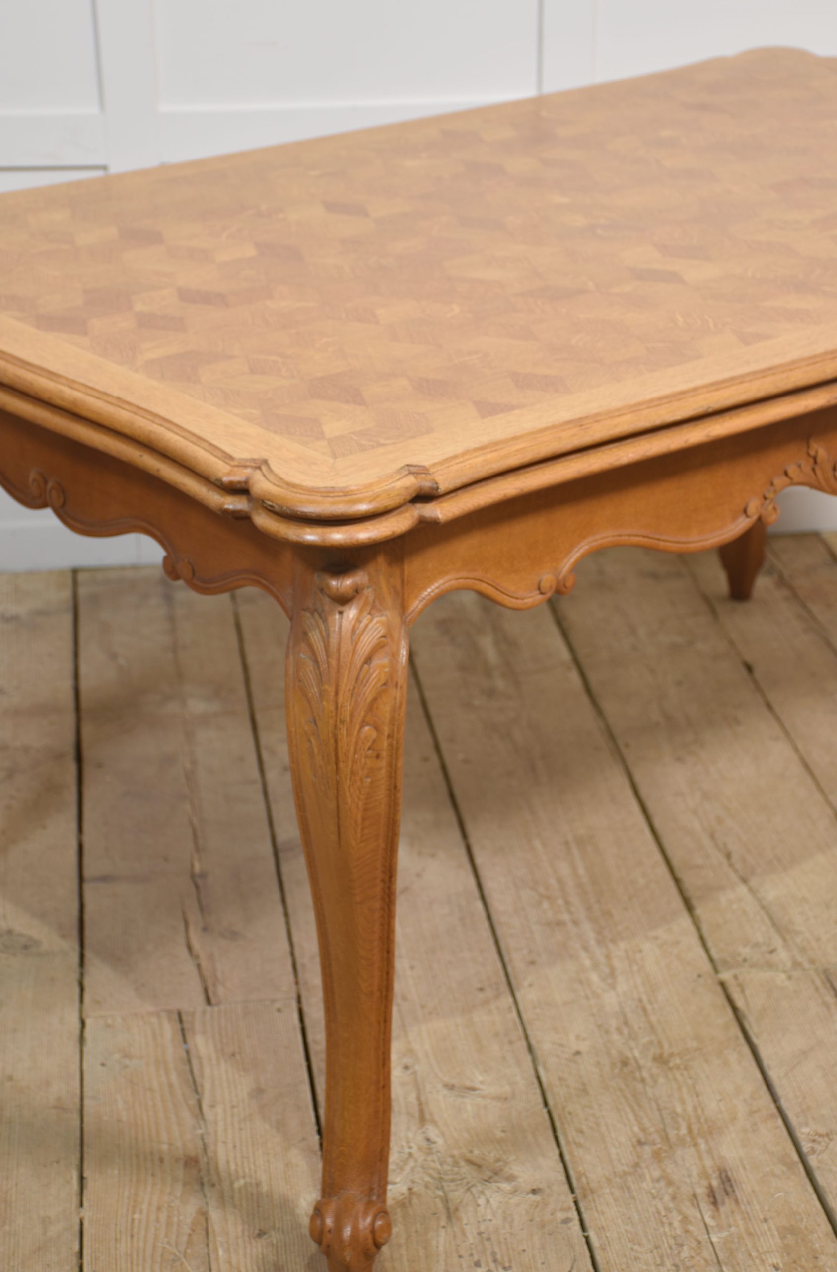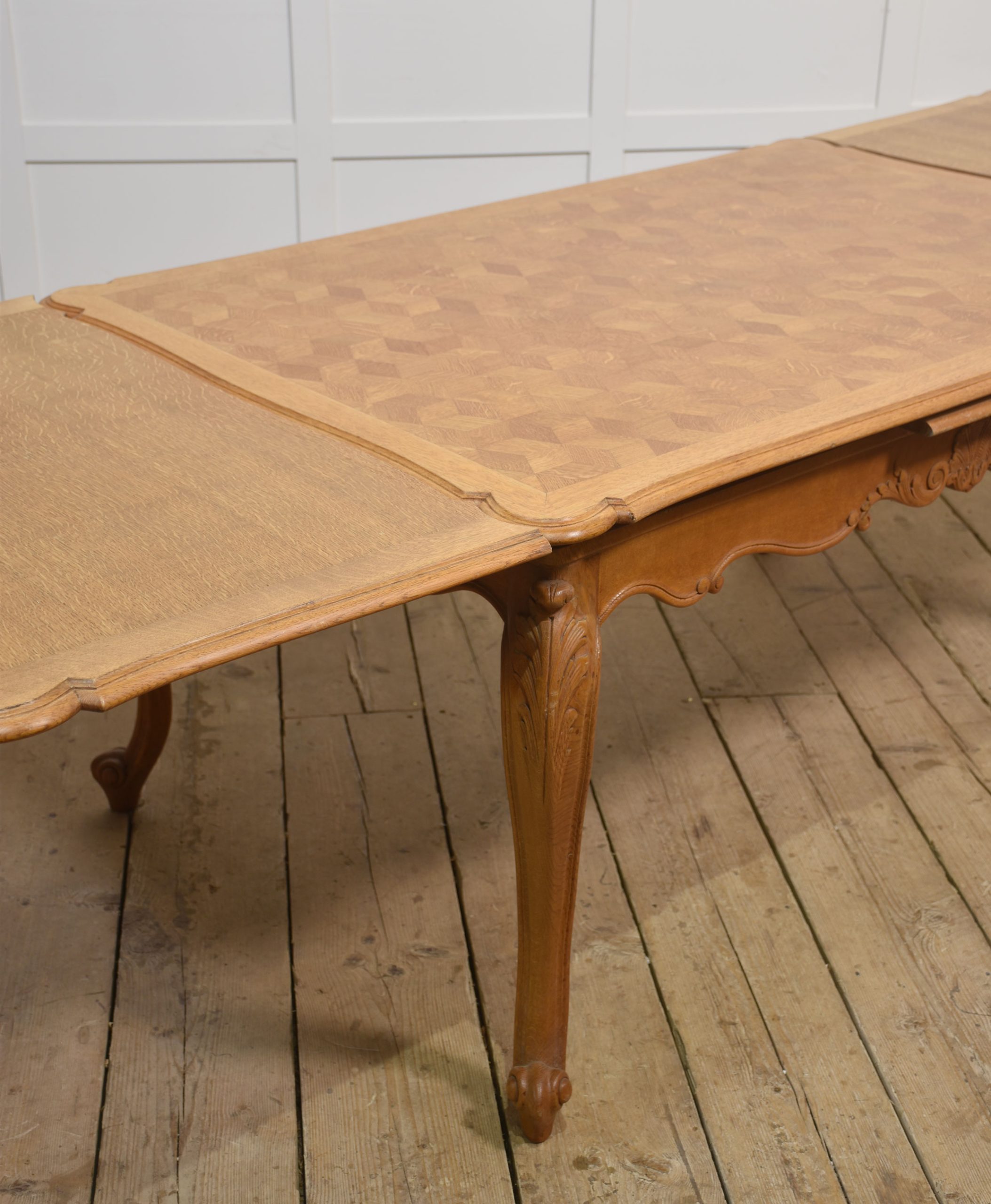 French Provincial style draw leaf dining table, the oak parquet top with two pull-out leaves above the shaped carved apron. All raised up on cabriole legs.