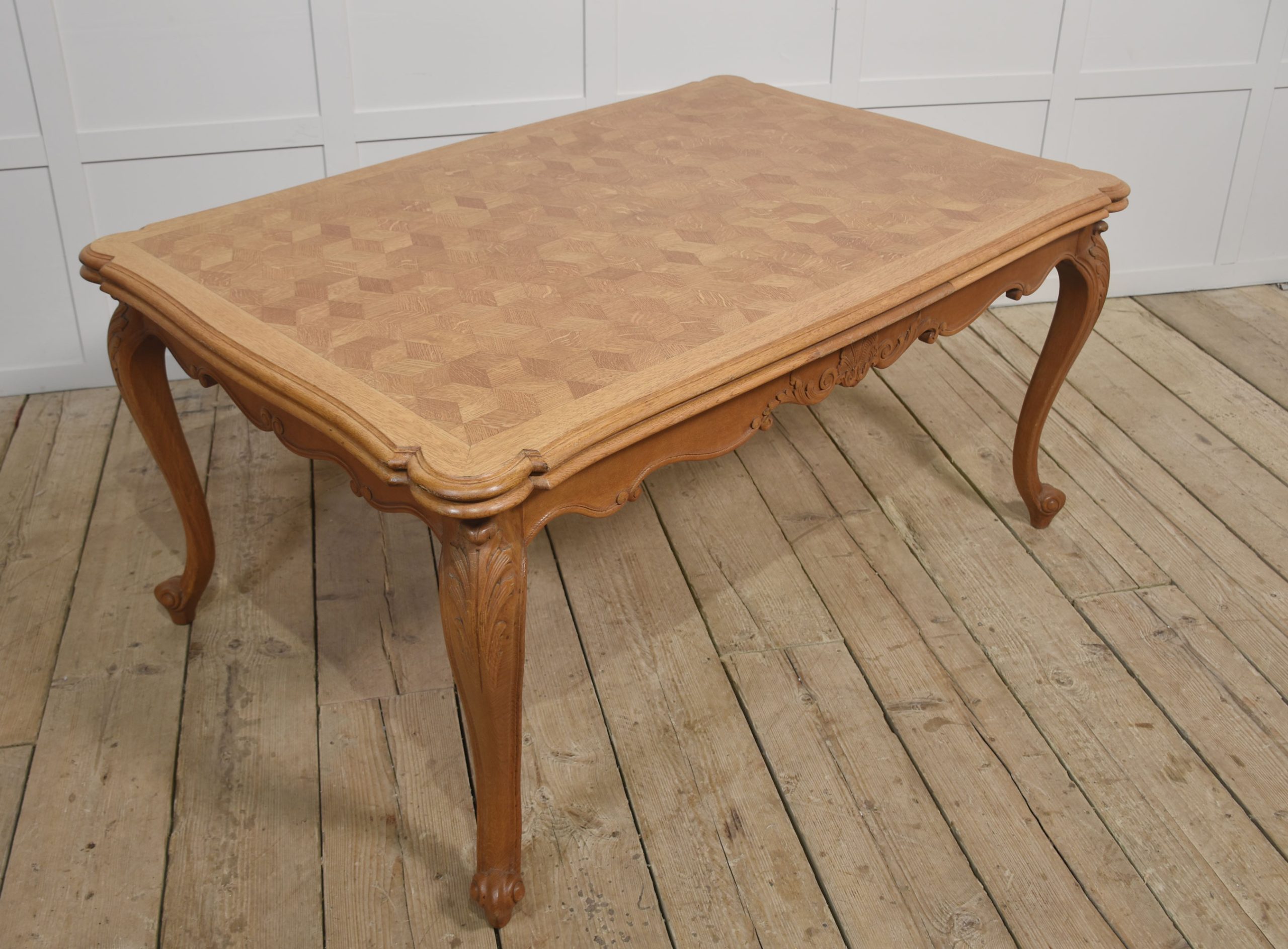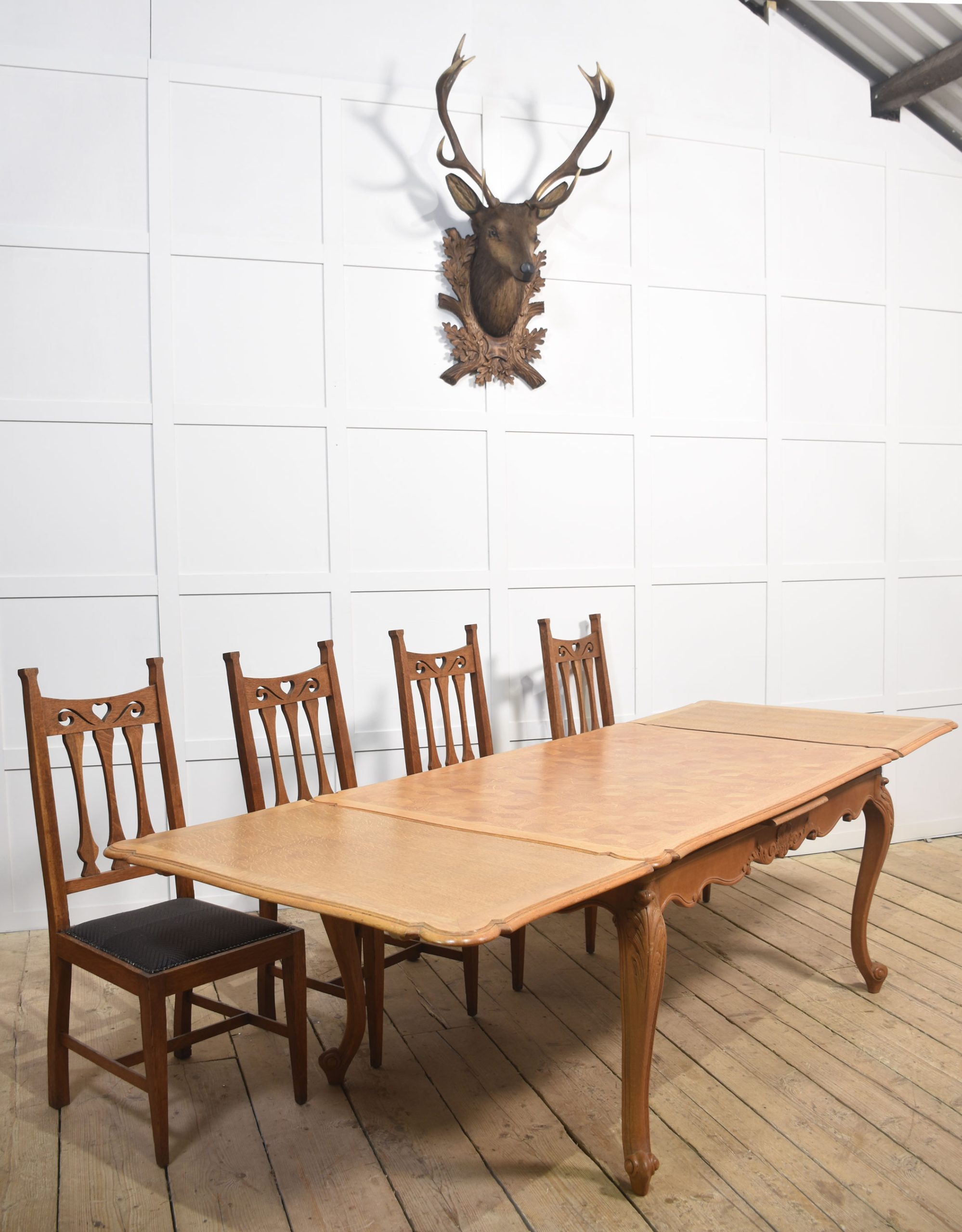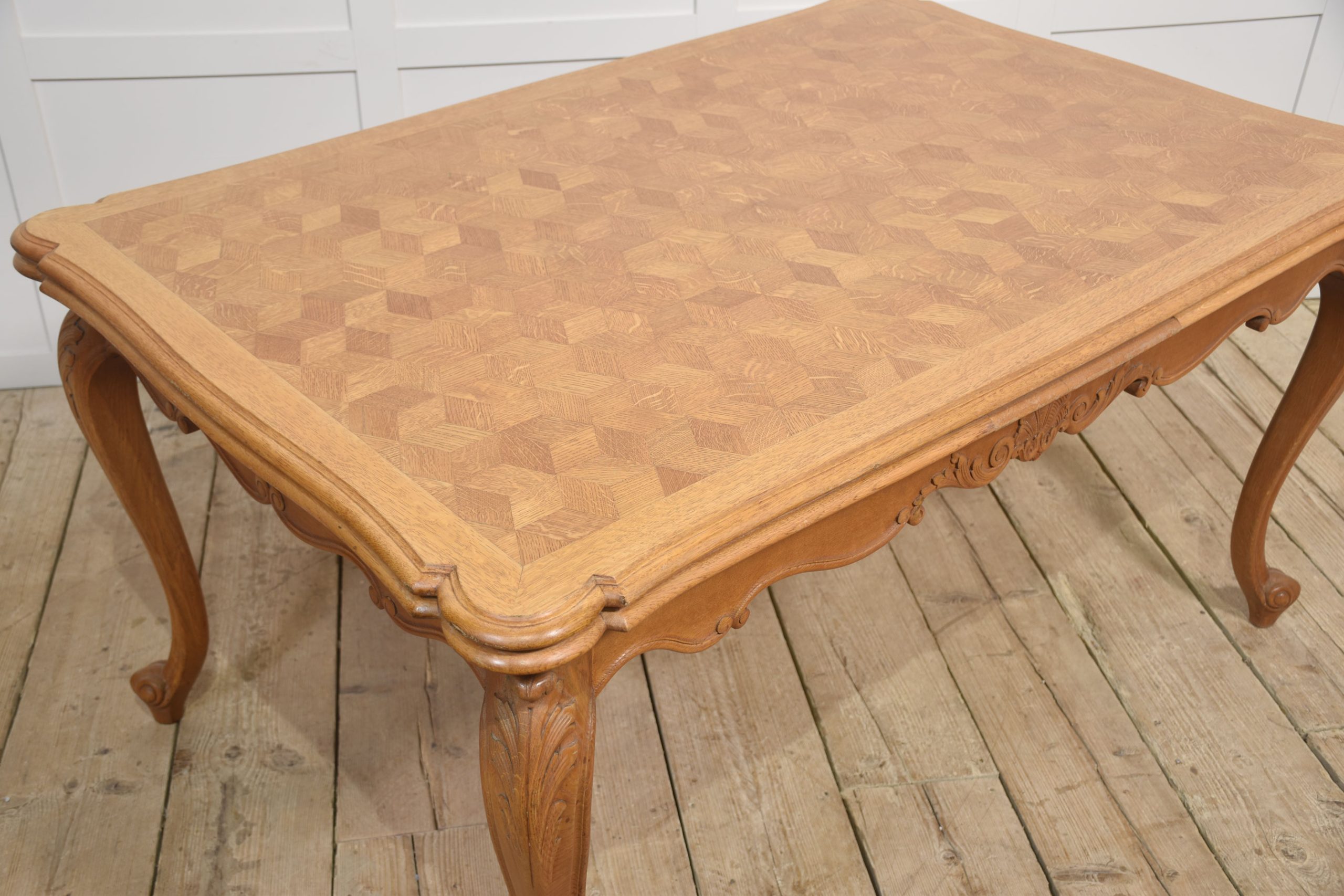 French Provincial style draw leaf dining table, the oak parquet top with two pull-out leaves above the shaped carved apron. All raised up on cabriole legs.