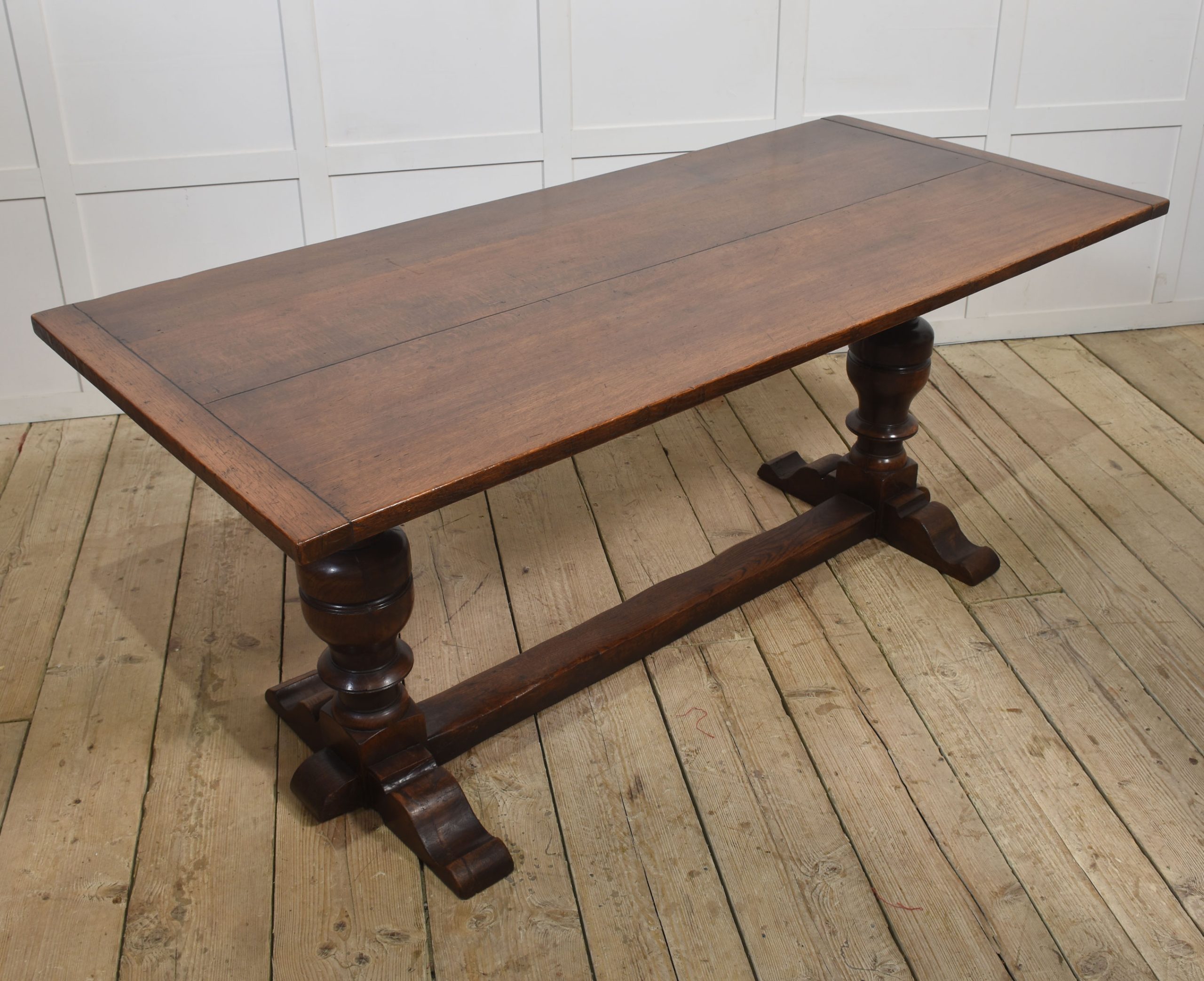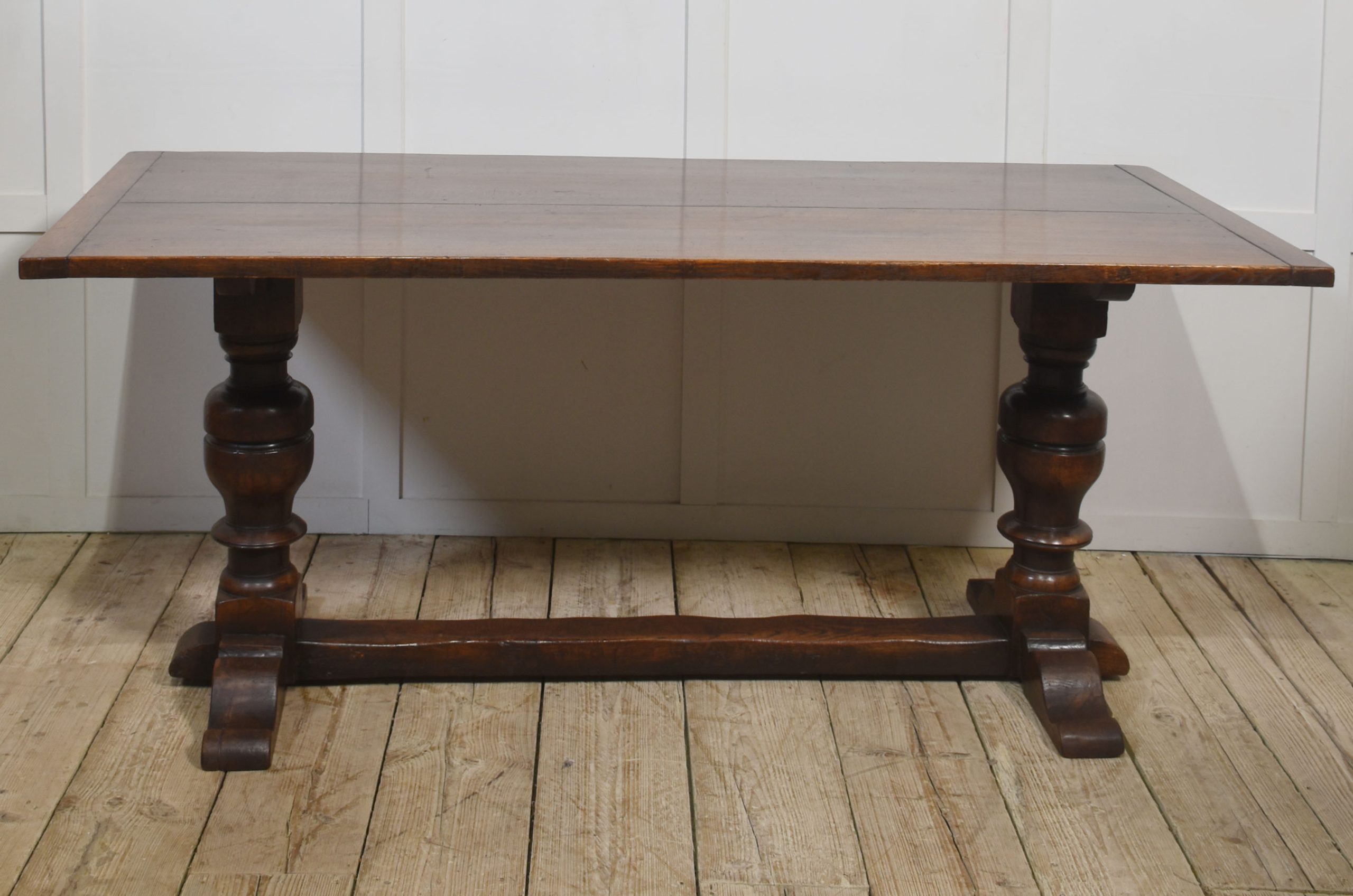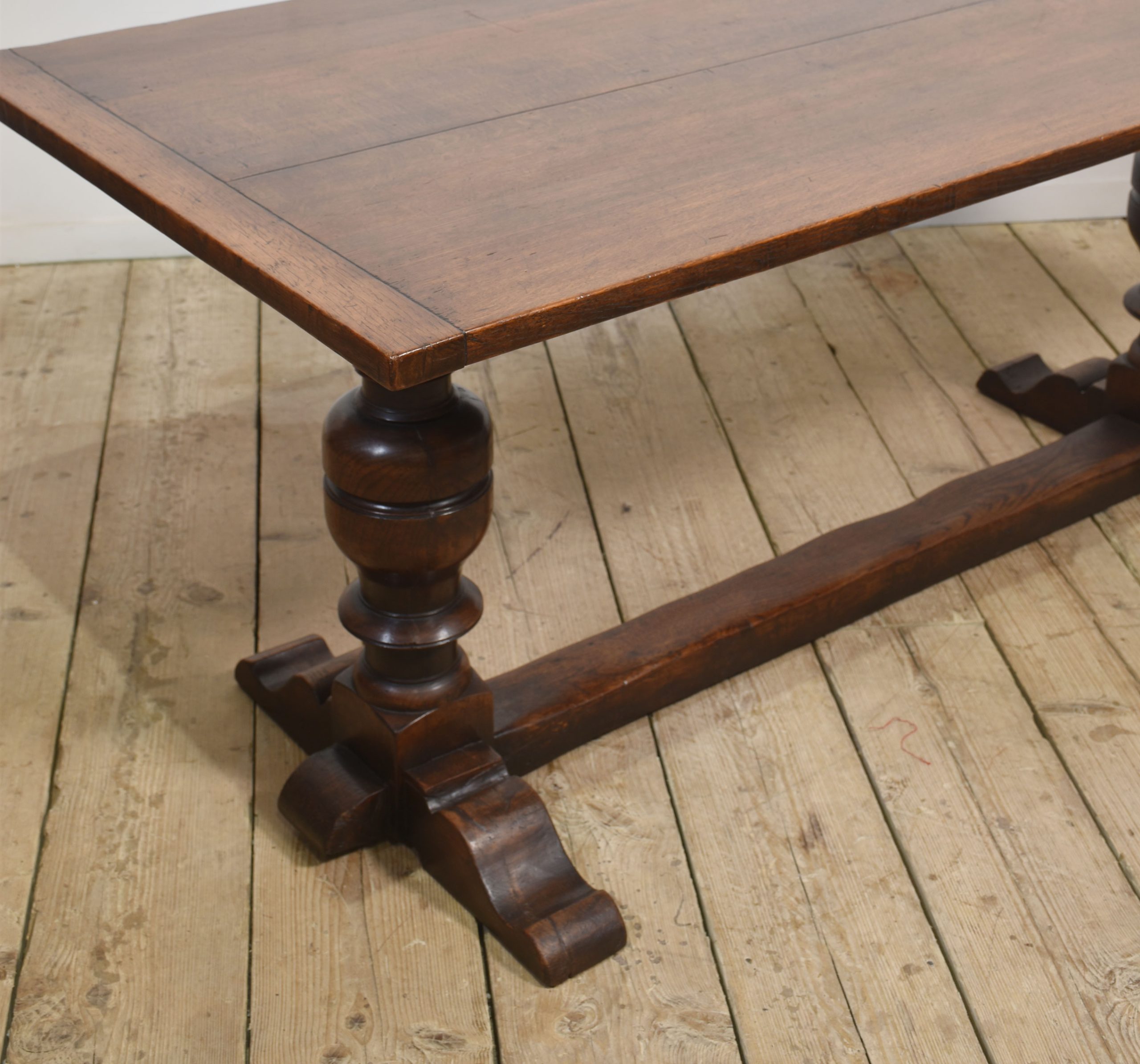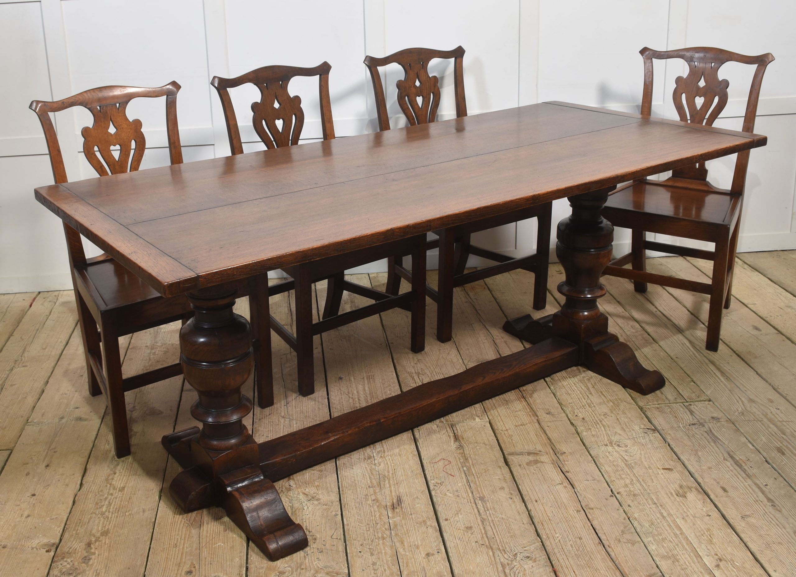 Oak refectory table, the rectangular solid oak top. Above lobed carved bulbous supports united by a stretcher.