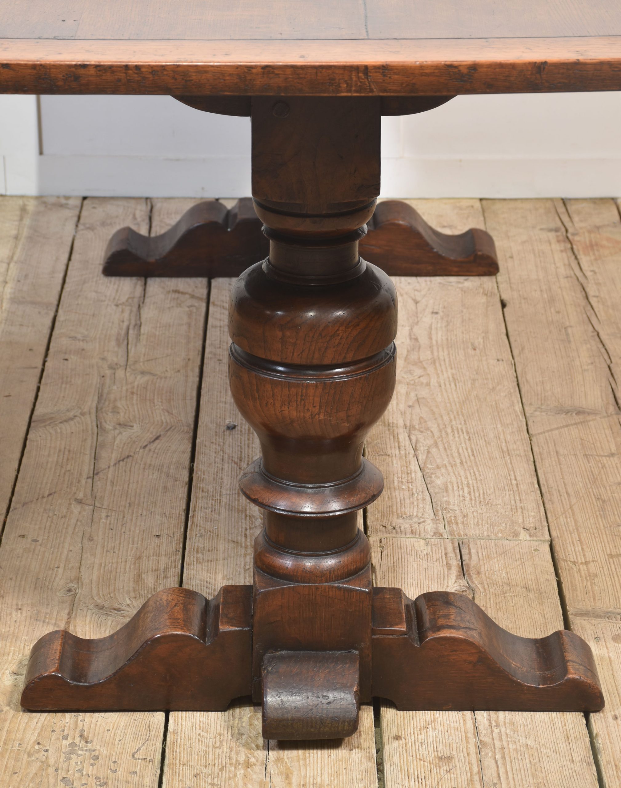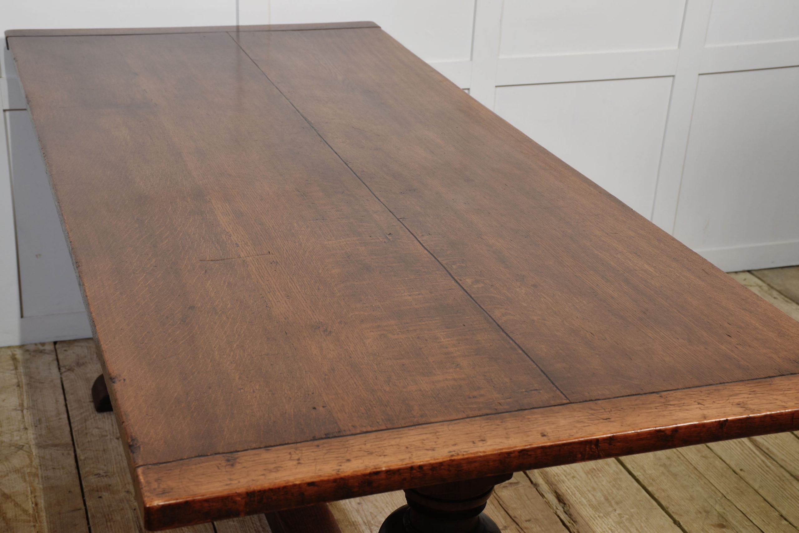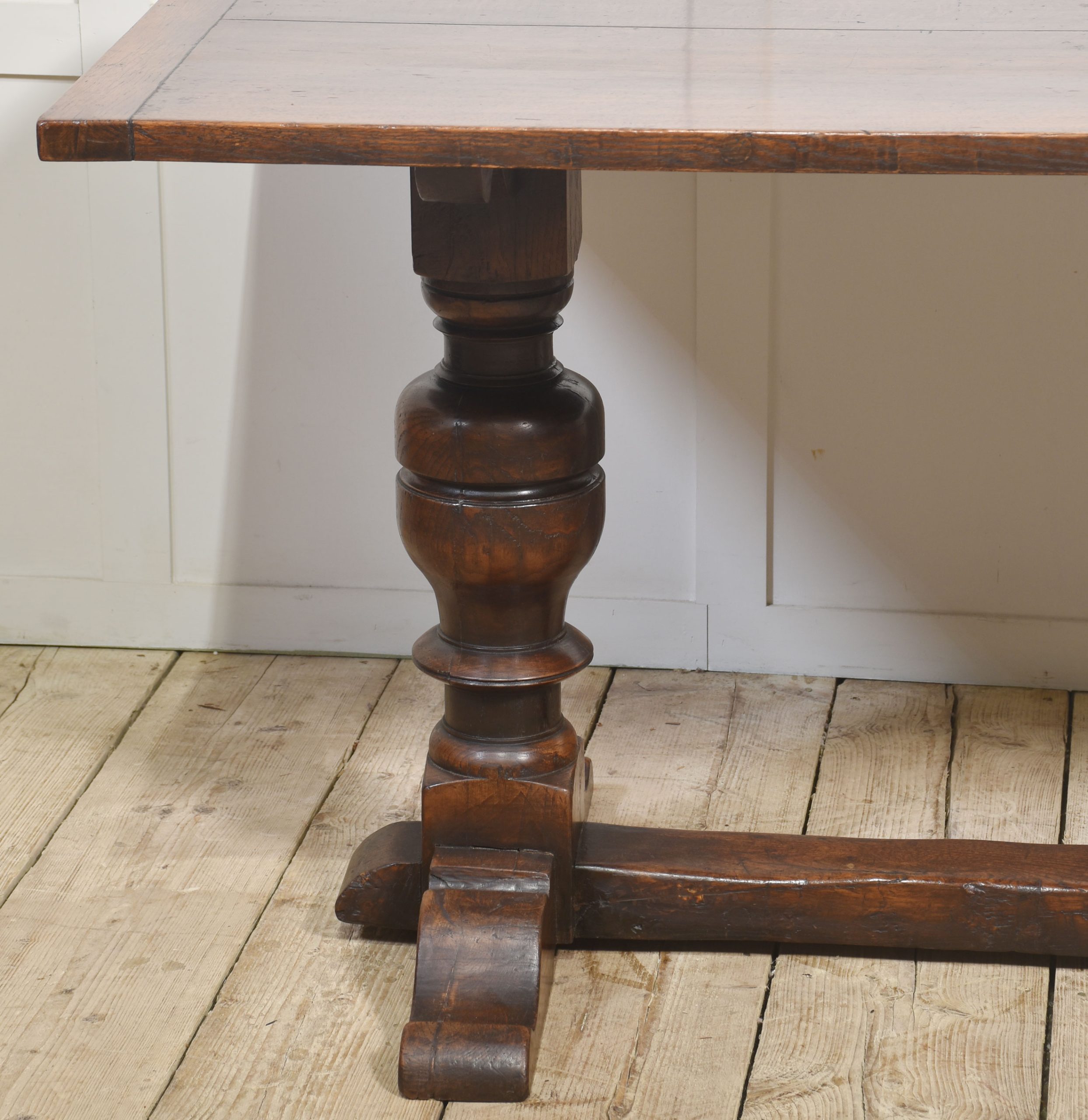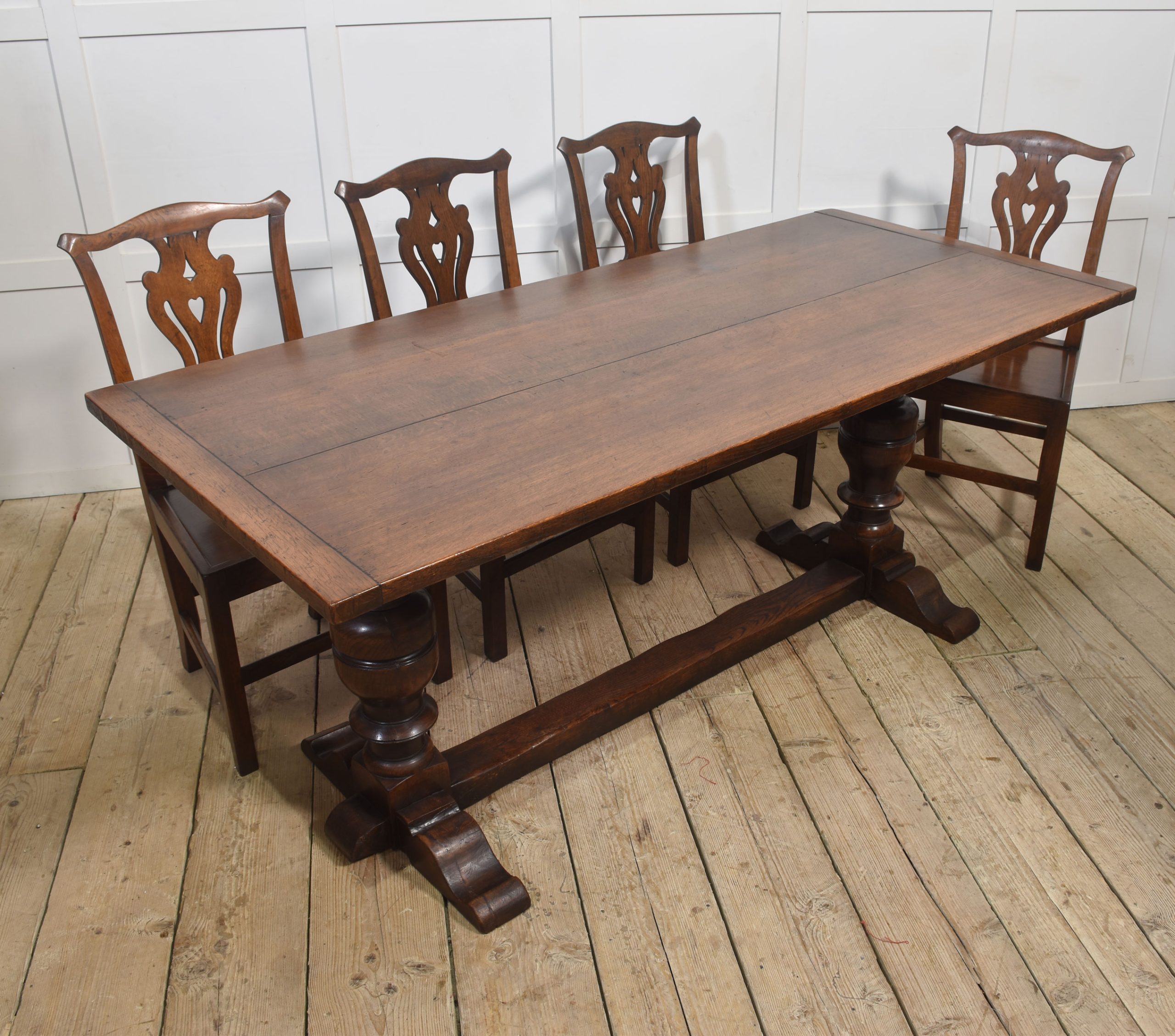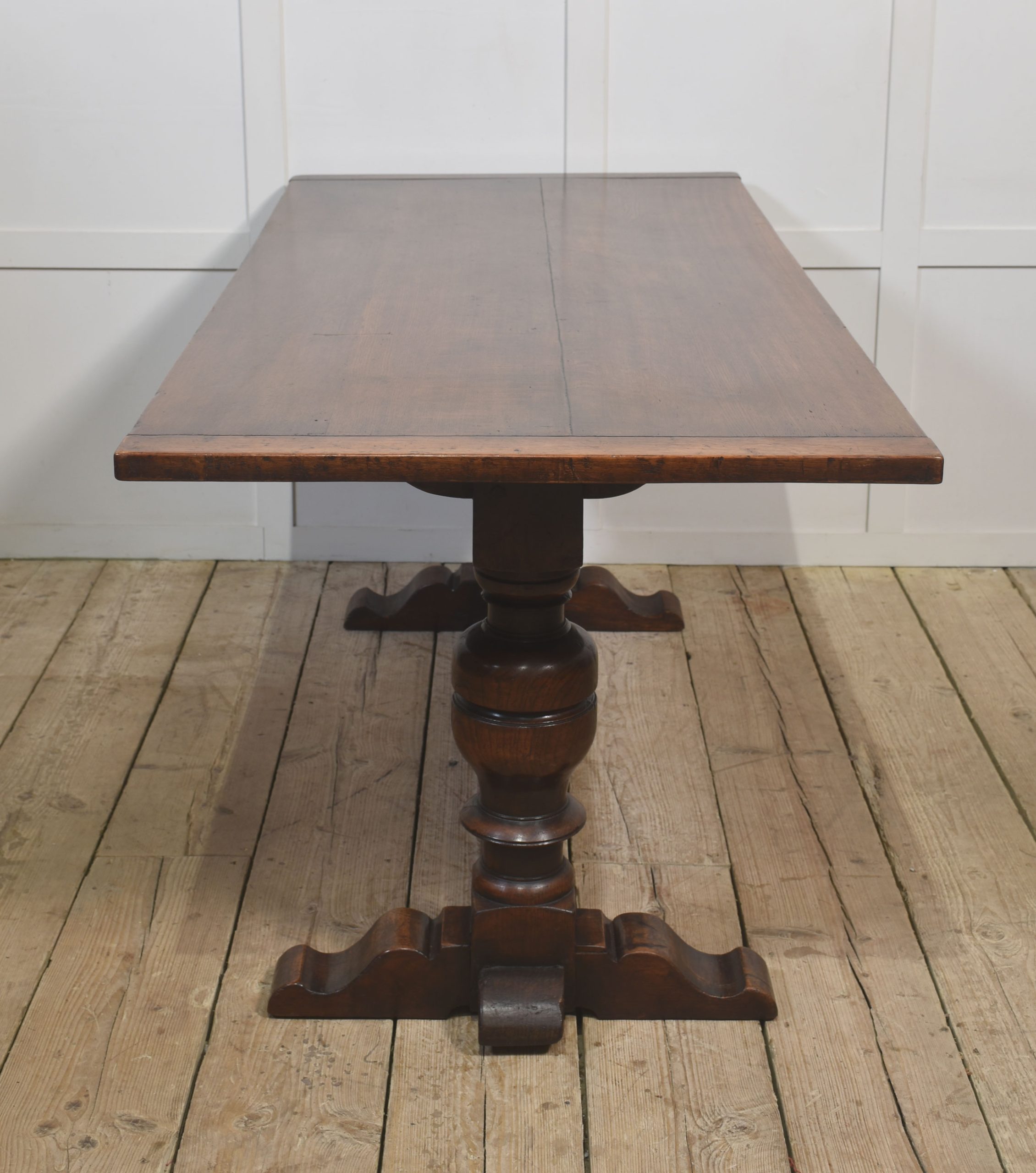 Oak refectory table, the rectangular solid oak top. Above lobed carved bulbous supports united by a stretcher.