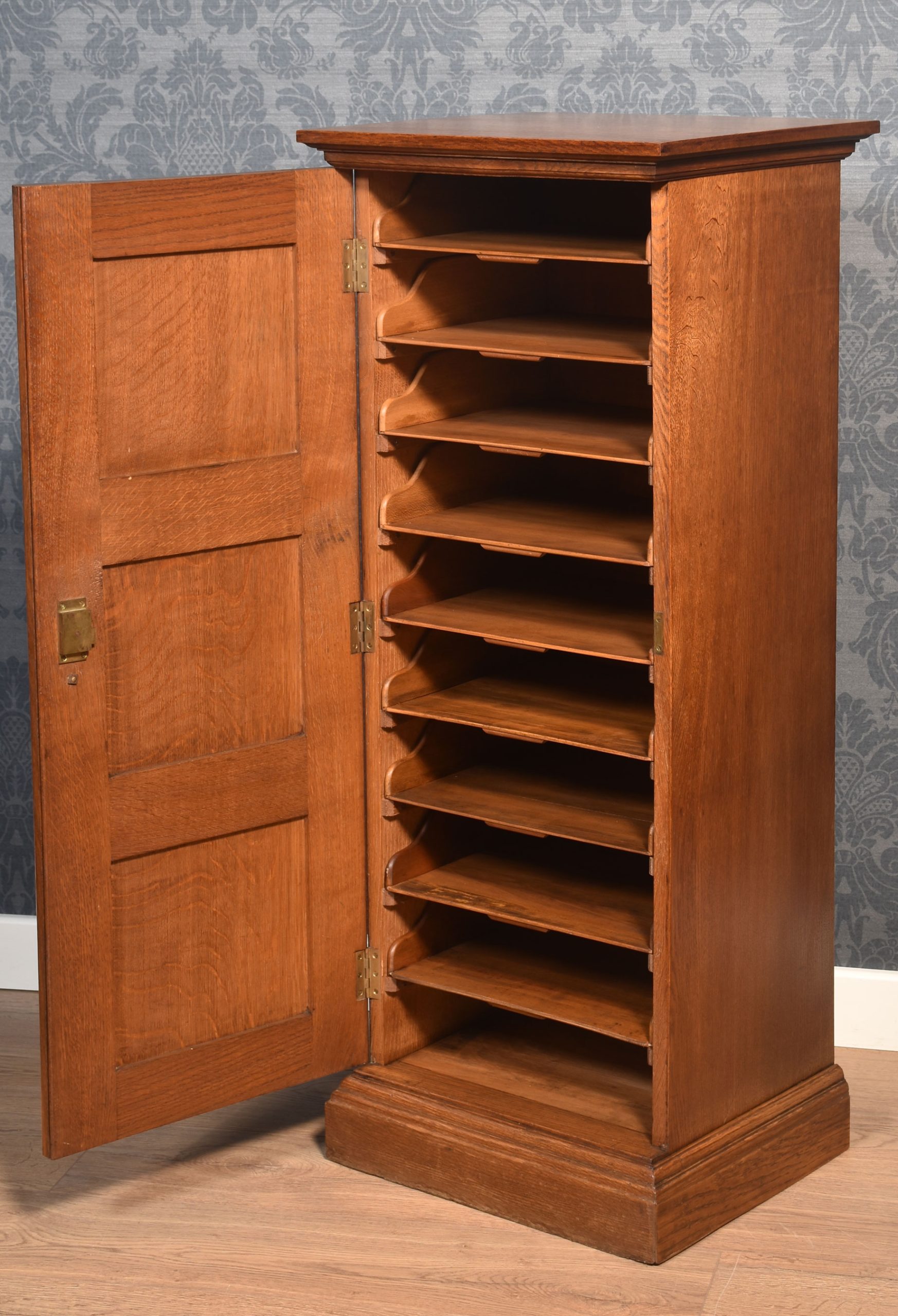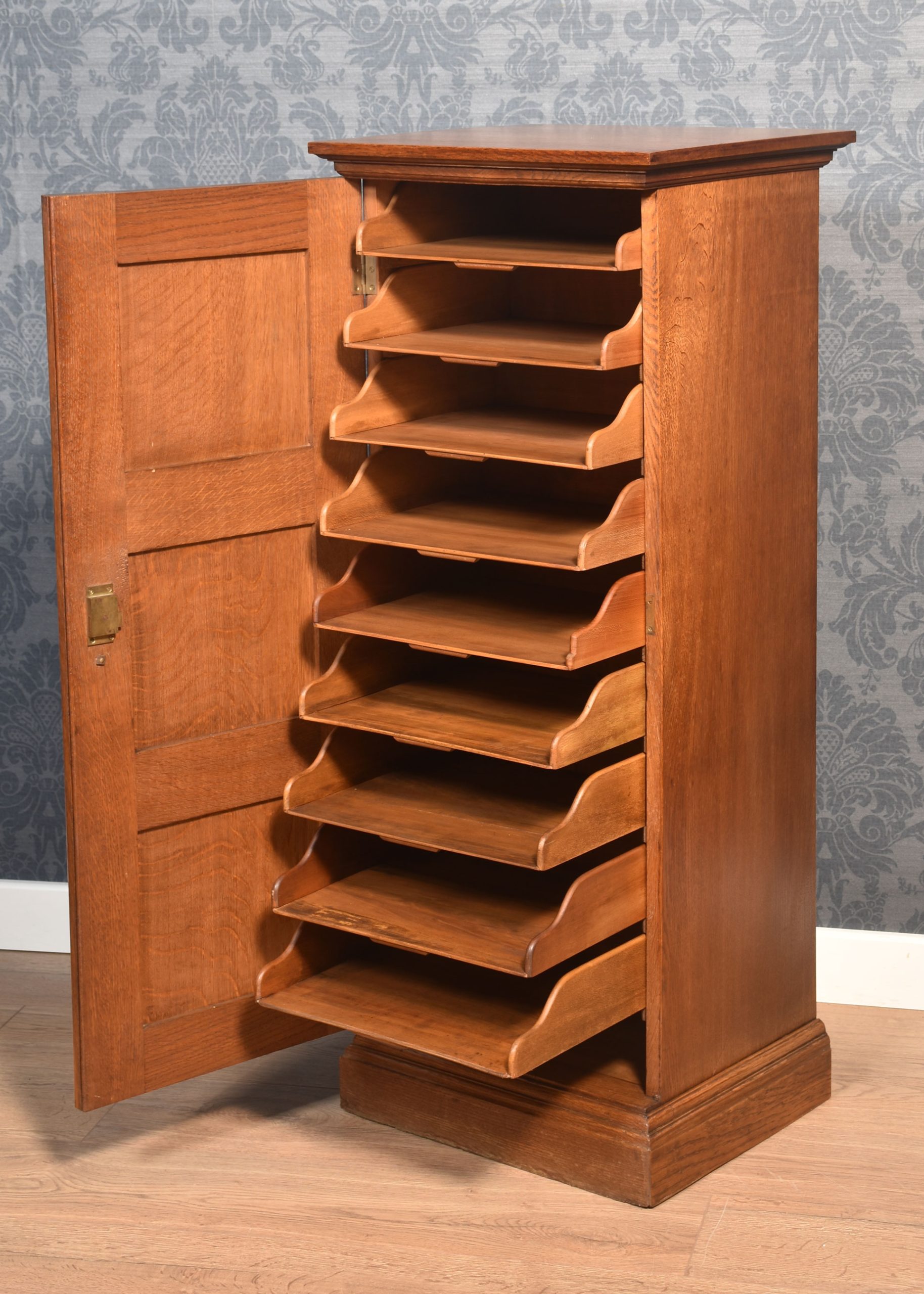 Solid oak filing cabinet the square top with moulded edge above a panelled door opening to reveal nine drawers. All raised up on a plinth base.