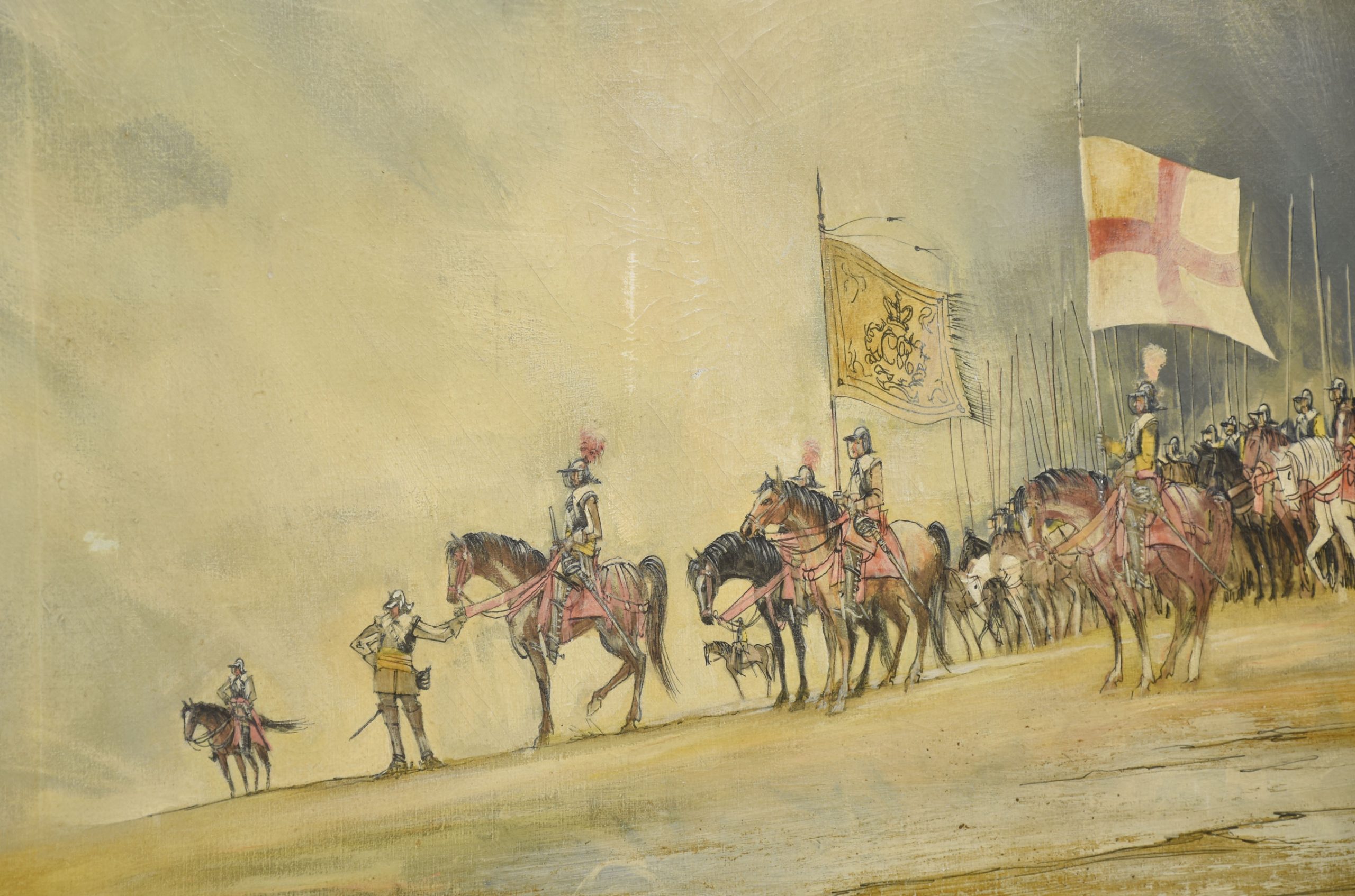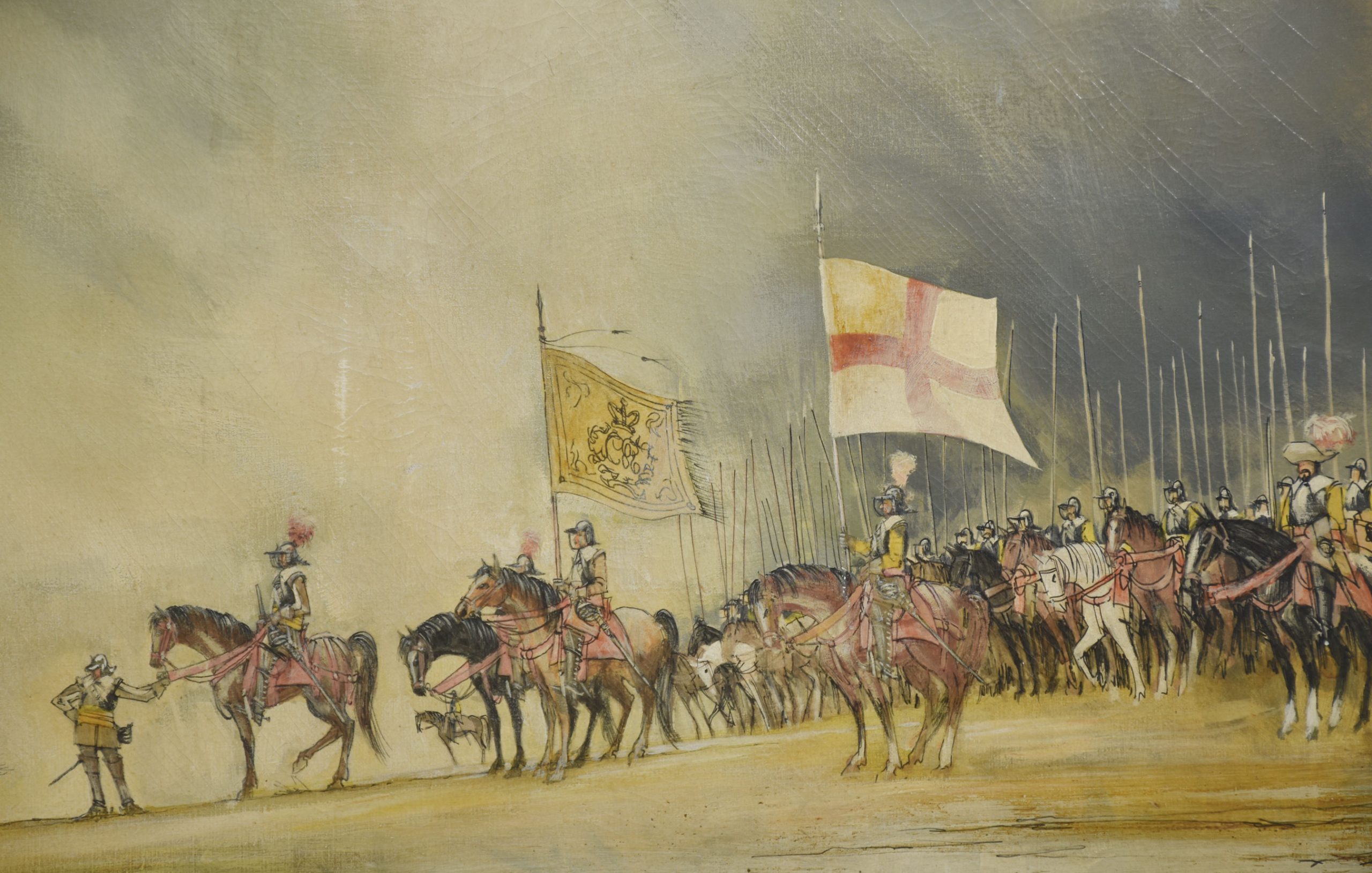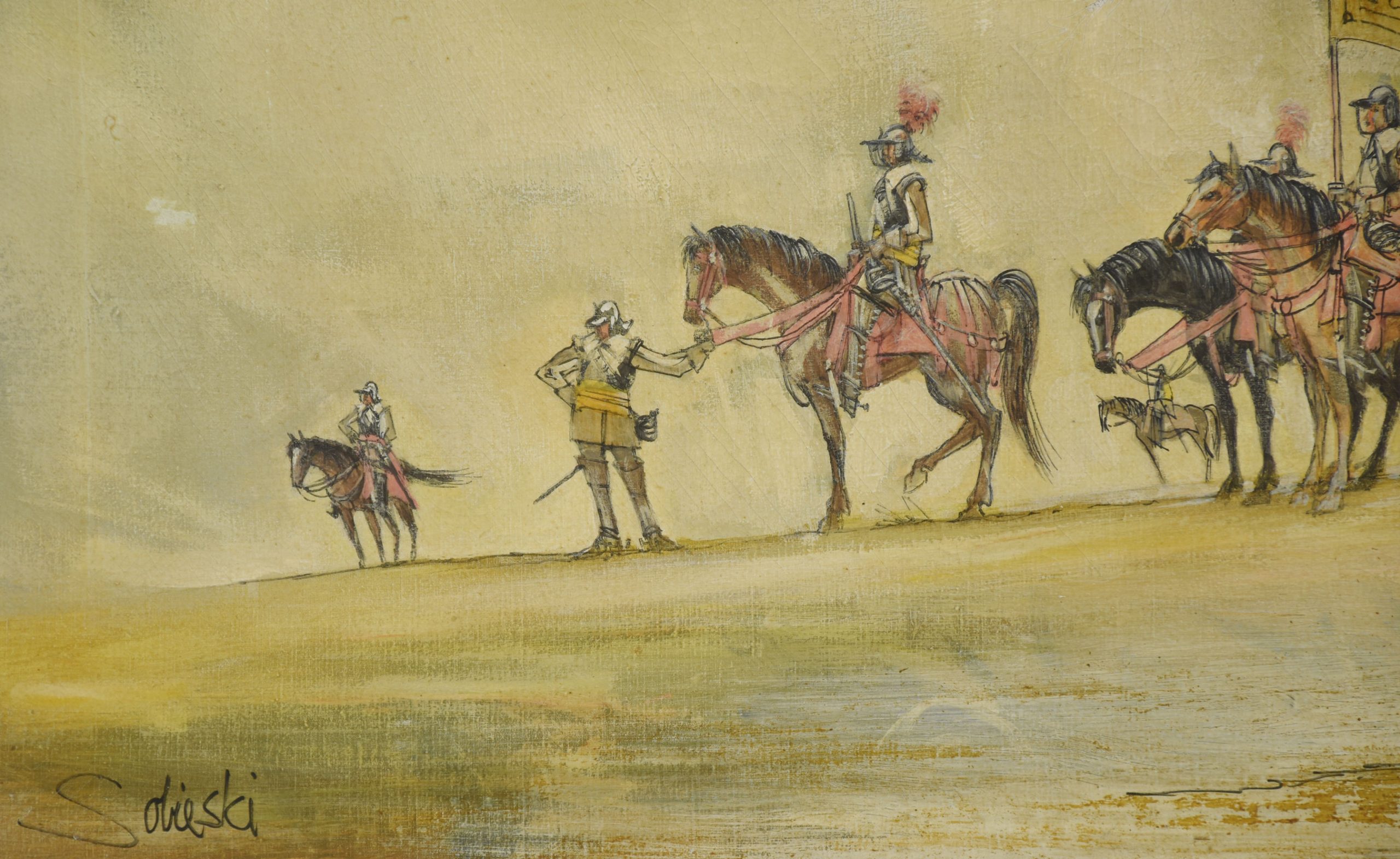 This striking oil painting by Jean Sobieski captures a dramatic historical cavalry scene rendered in his signature impressionistic style. A regiment of mounted soldiers, clad in period armor and bearing regimental banners, advances under a vast, atmospheric sky. Sobieski’s masterful use of light and muted tones creates a sense of both grandeur and melancholy, evoking the solemn dignity of a bygone era. The detailed figures and horses stand in delicate contrast to the soft, painterly background, giving the composition a feeling of motion and depth.