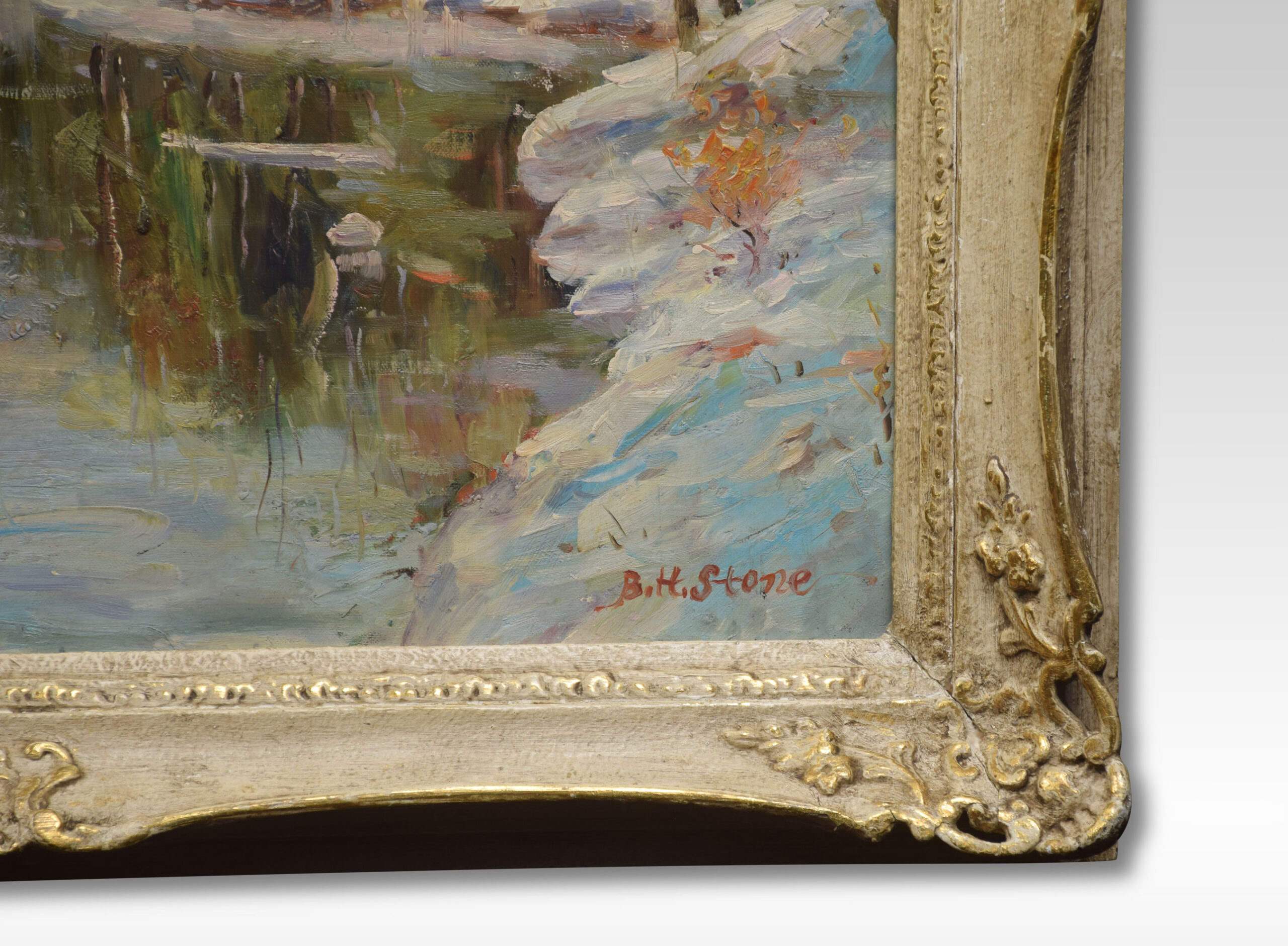 Oil on canvas signed B H Stone. Depicting a Canadian winter landscape encased in a carved frame.
