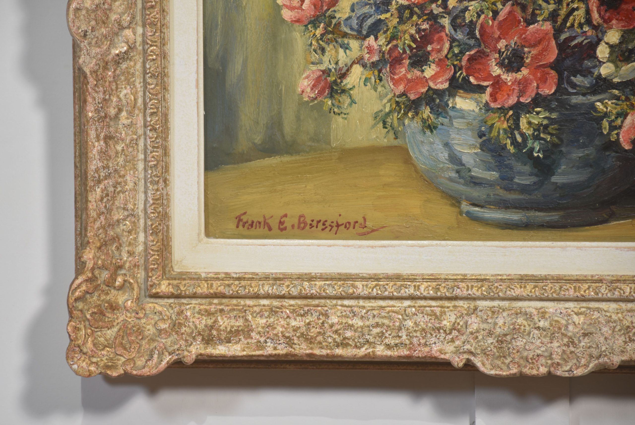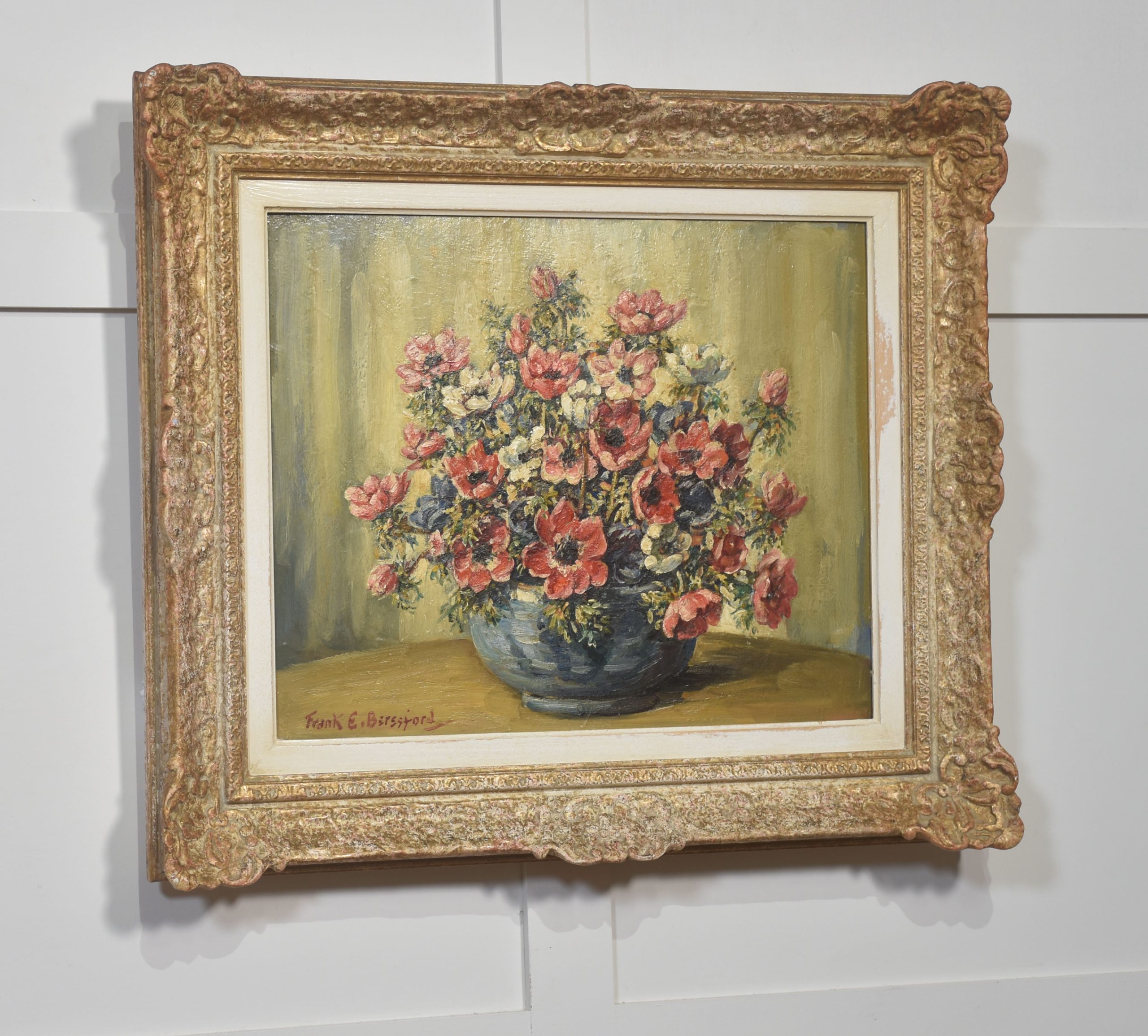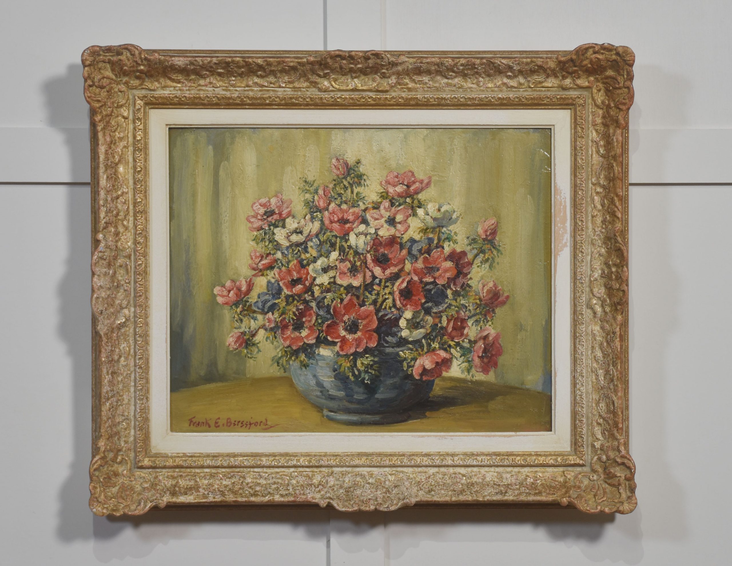 The painting is housed in an elaborately moulded gilt frame that enhances its decorative presence and underscores its classic appeal. A well-executed example of Beresford’s still-life work.