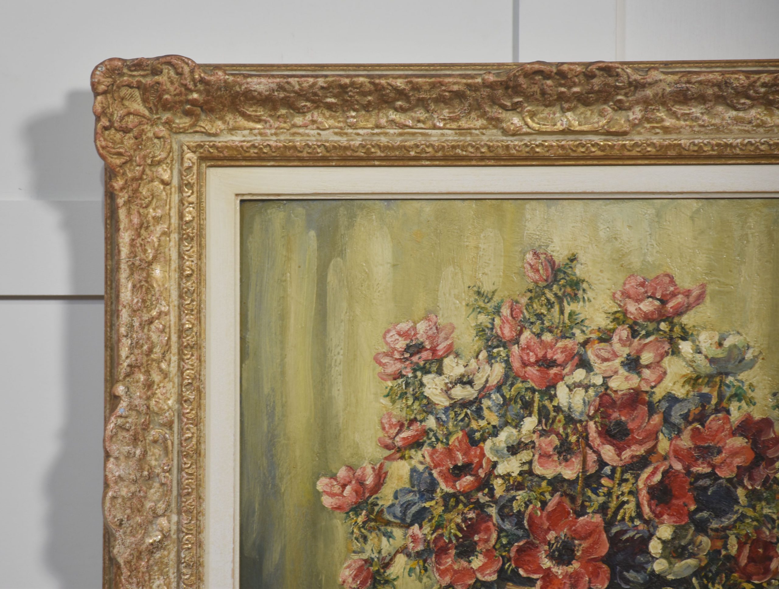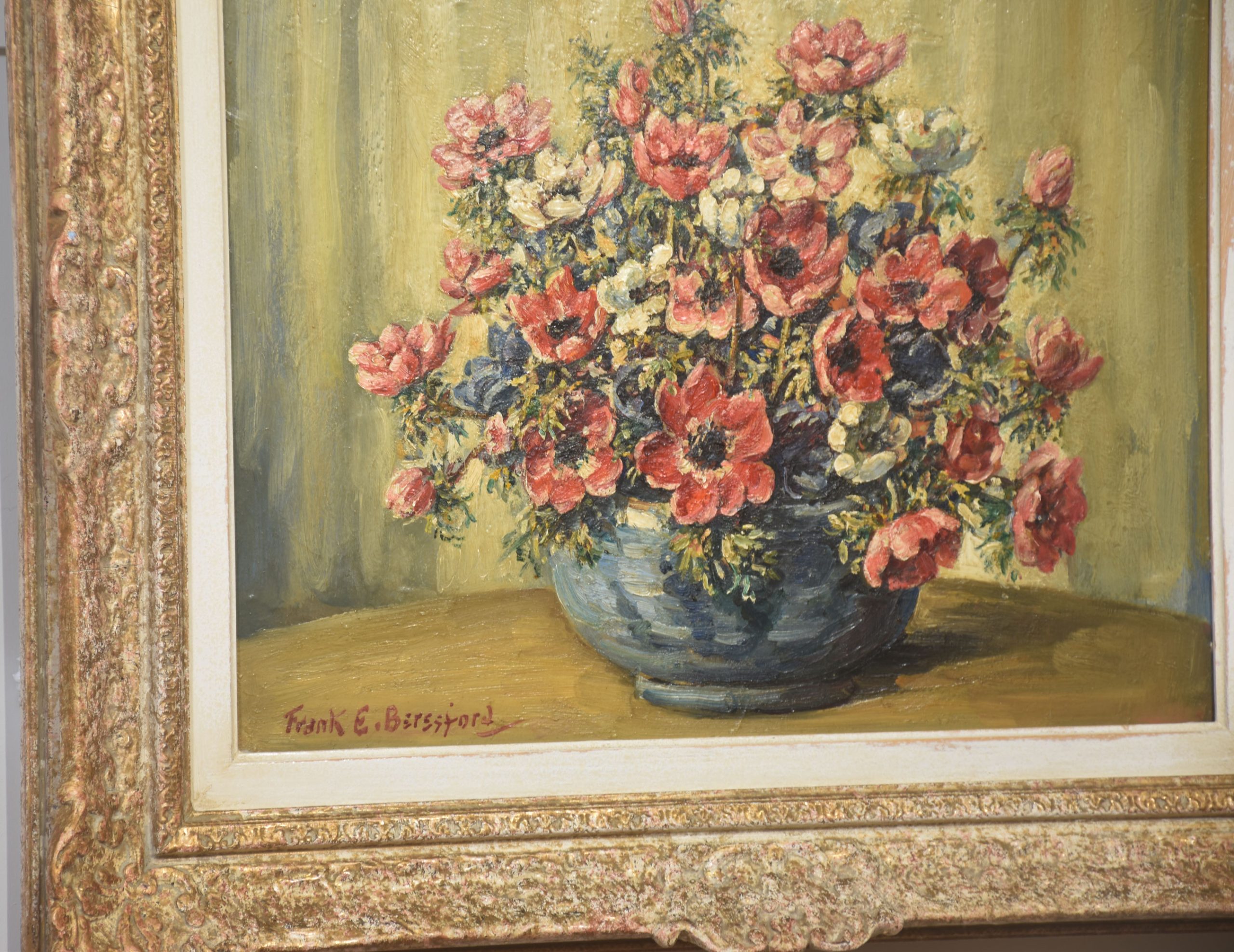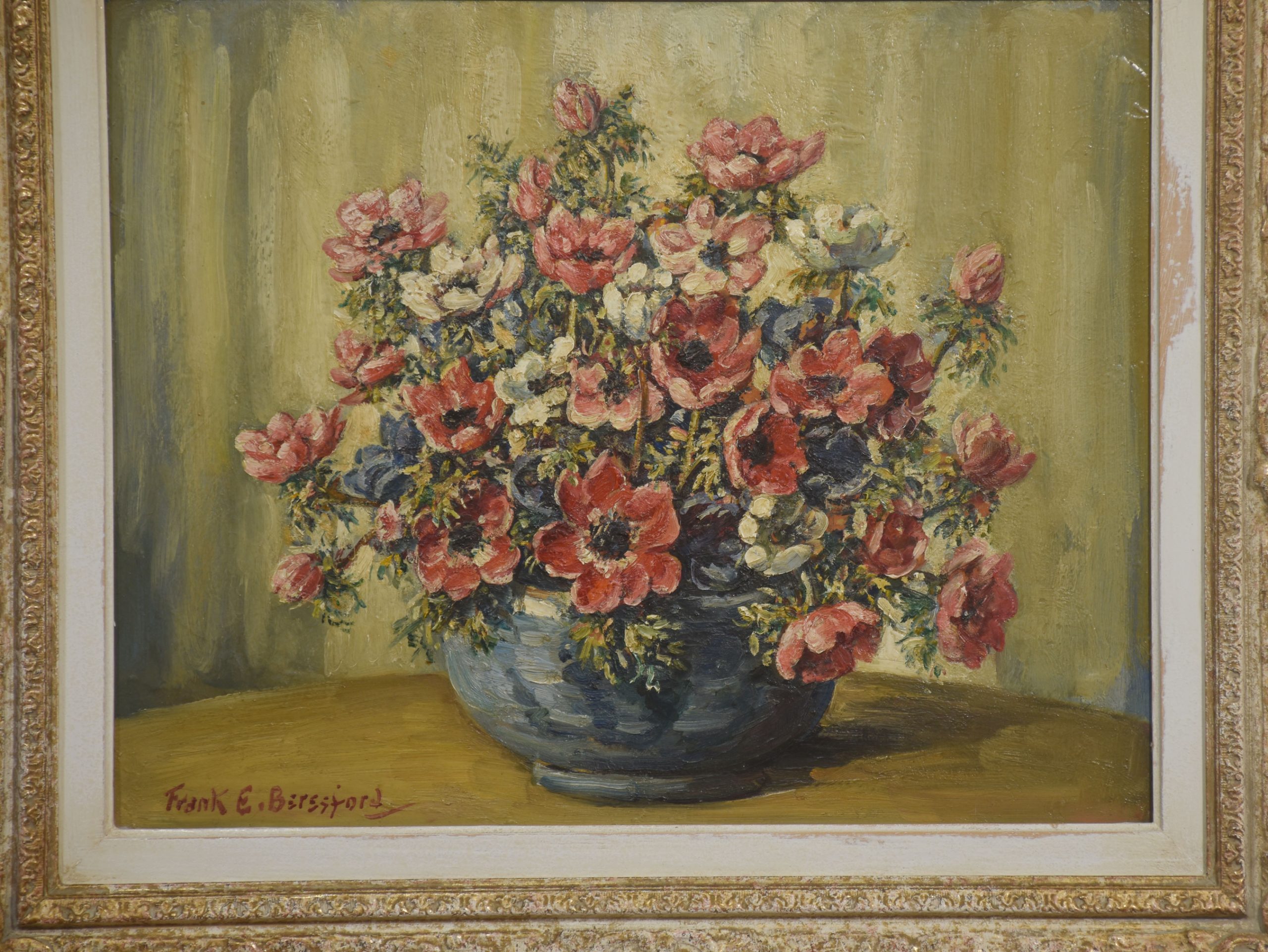 The painting is housed in an elaborately moulded gilt frame that enhances its decorative presence and underscores its classic appeal. A well-executed example of Beresford’s still-life work.