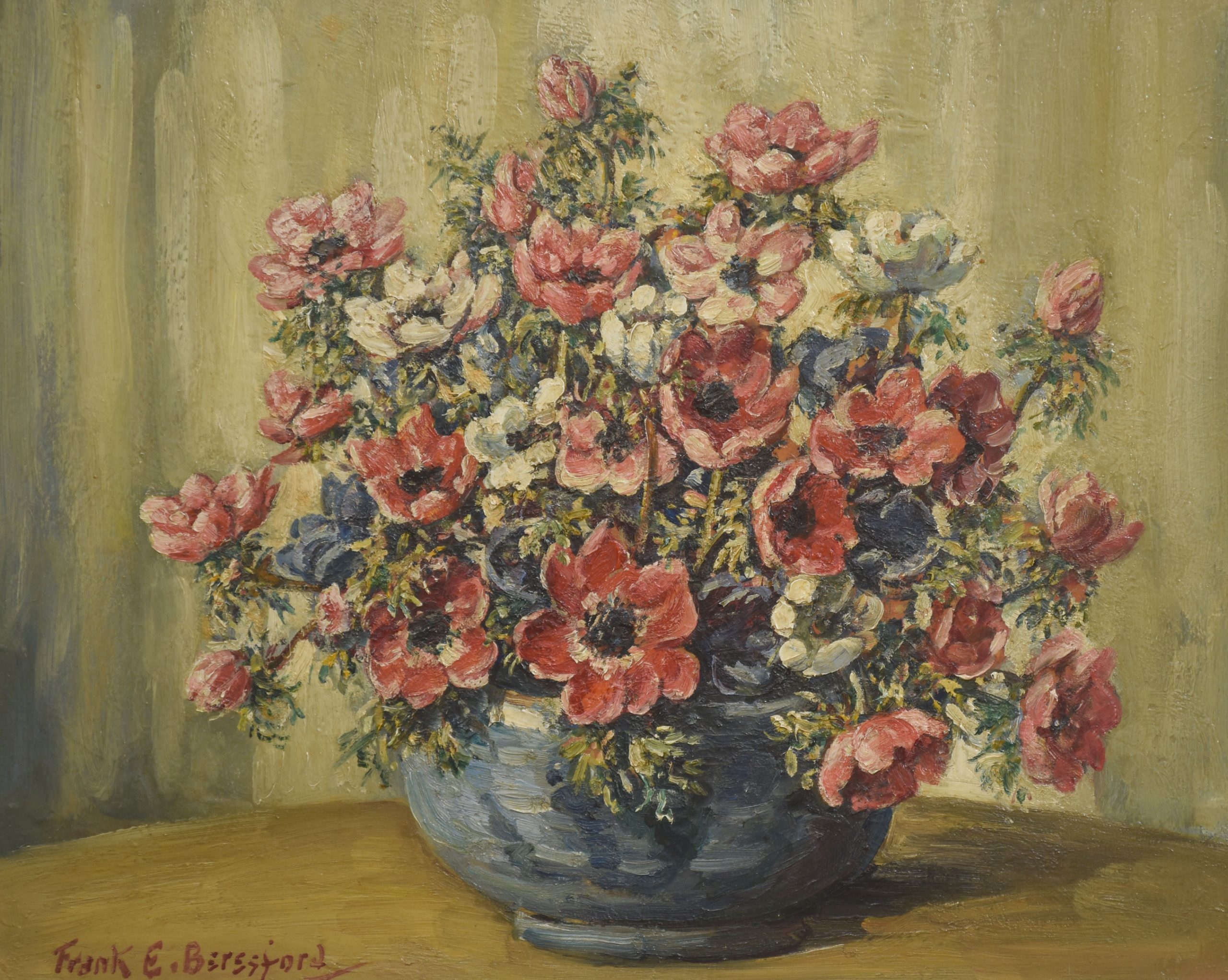 This vibrant still life by Frank Beresford features a lush bouquet of flowers arranged in a rounded blue vessel, set against a softly modulated green and ochre background. Warm red and coral blossoms dominate the composition, complemented by accents of white and deep blue, creating a rich and harmonious palette.