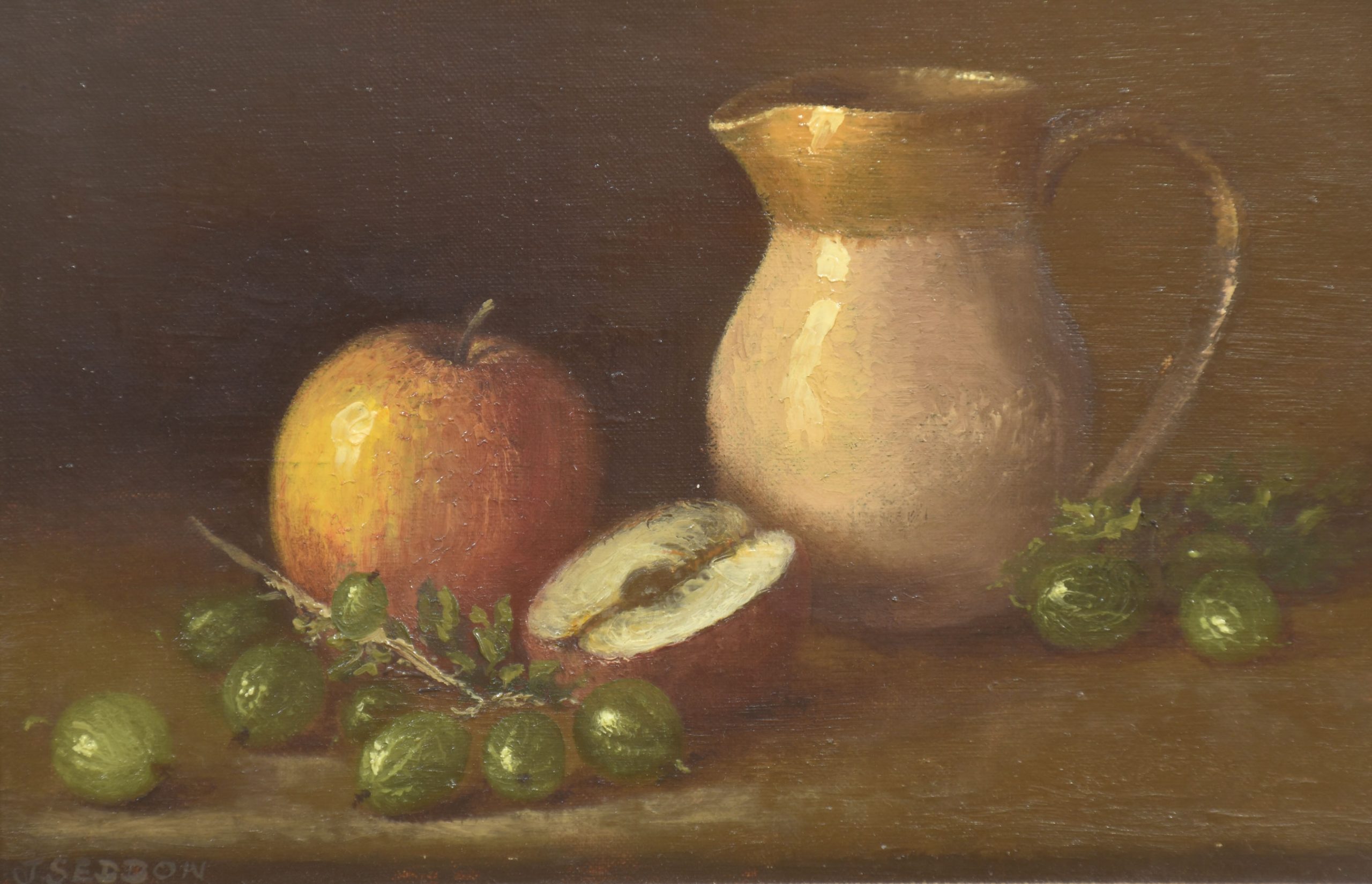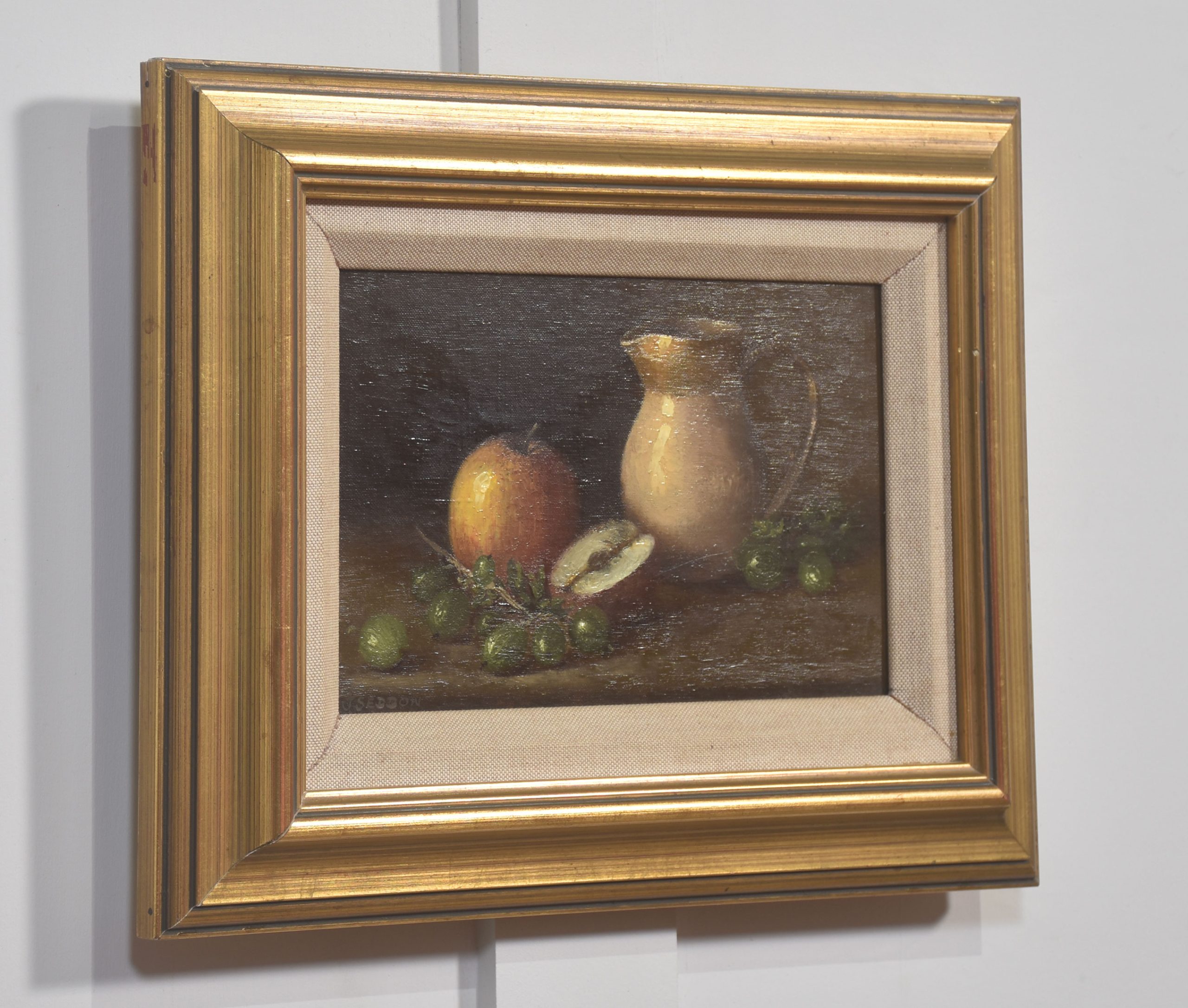 A finely painted still life by Joyce Seddon, depicting an apple, a sliced fruit, and clusters of green grapes arranged beside a ceramic jug. Executed in warm, subdued tones, the composition demonstrates careful attention to light, surface texture, and tonal balance, characteristic of the Victorian and Edwardian still-life tradition. The work reflects Seddon’s academic approach and sensitivity to domestic subject matter. Presented in a giltwood frame with linen slip, complementing the intimate scale and restrained palette of the painting.