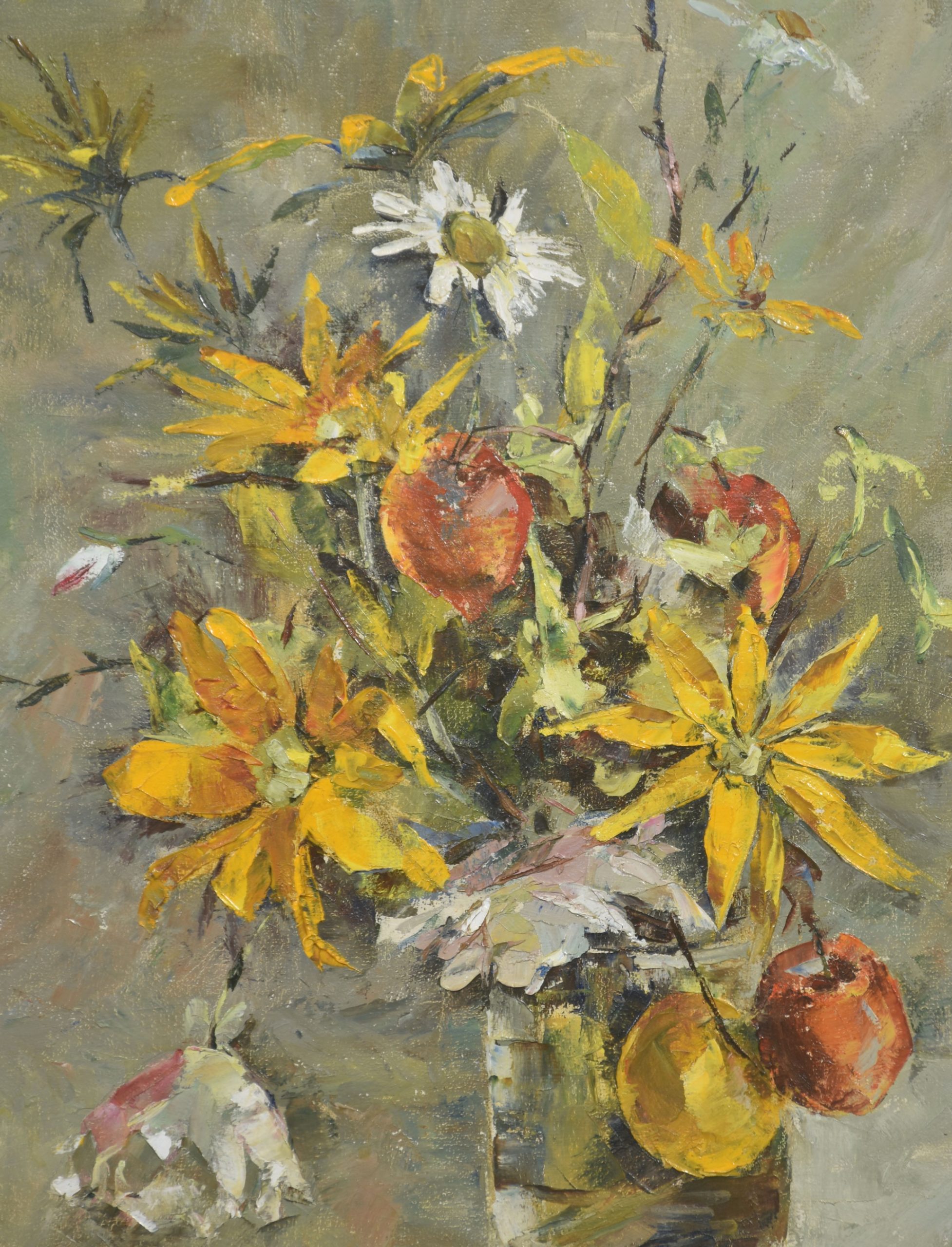 Oil on Canvas Still Life with Yellow Flowers and Fruit