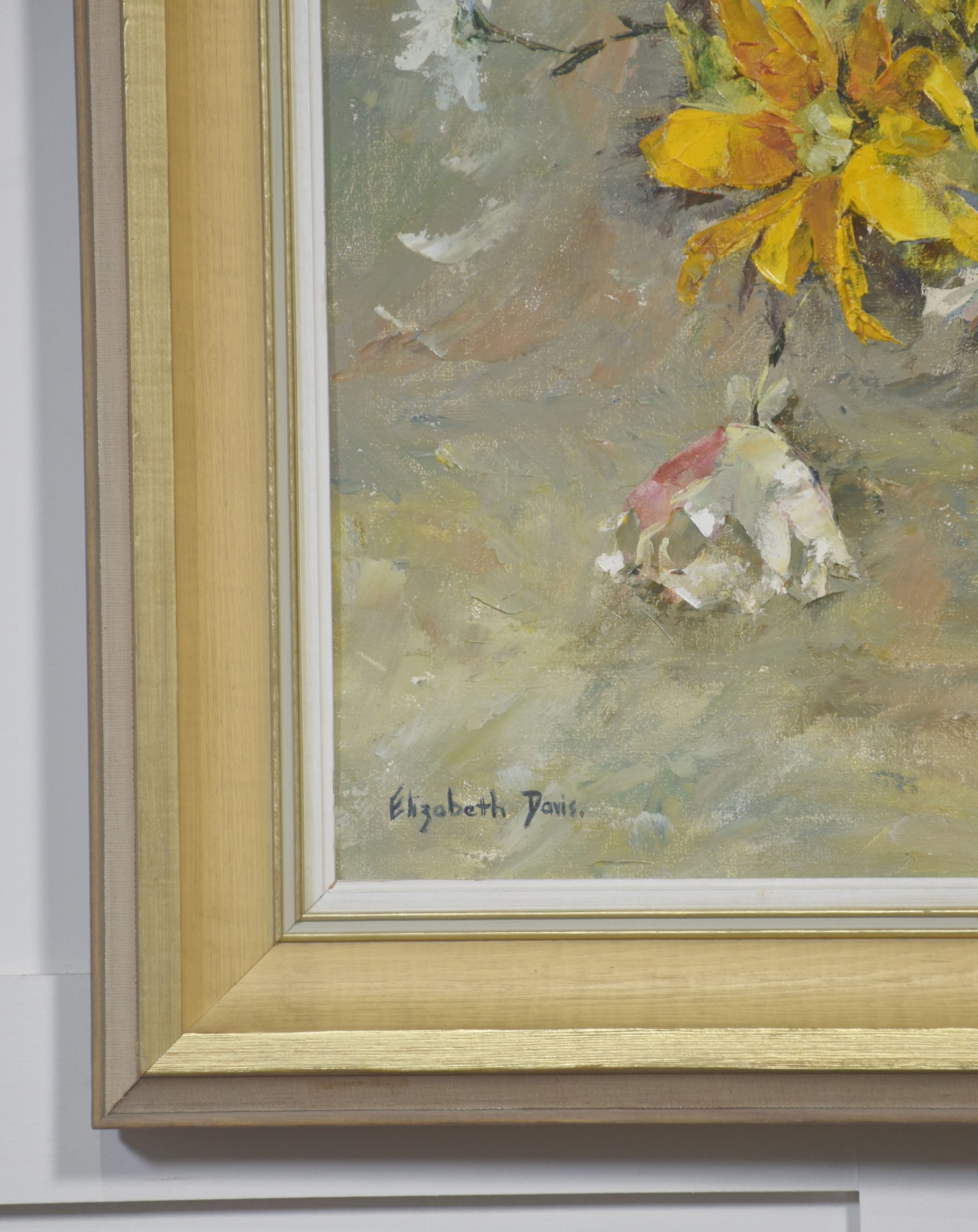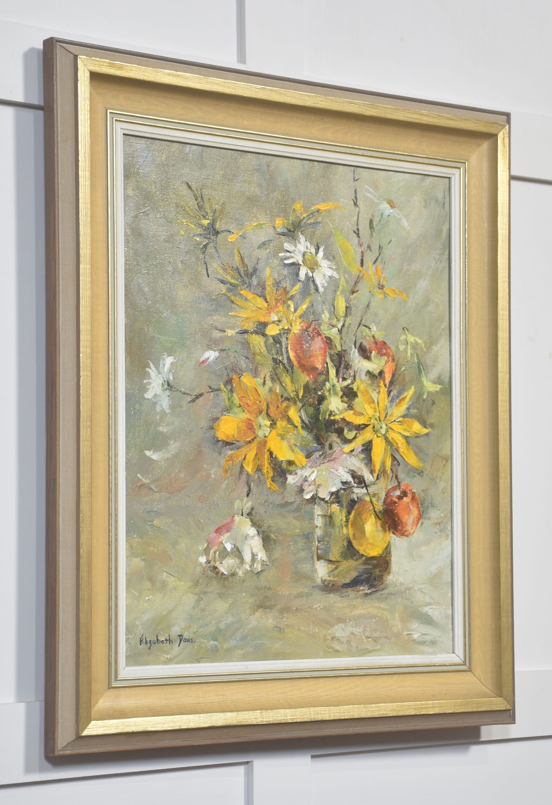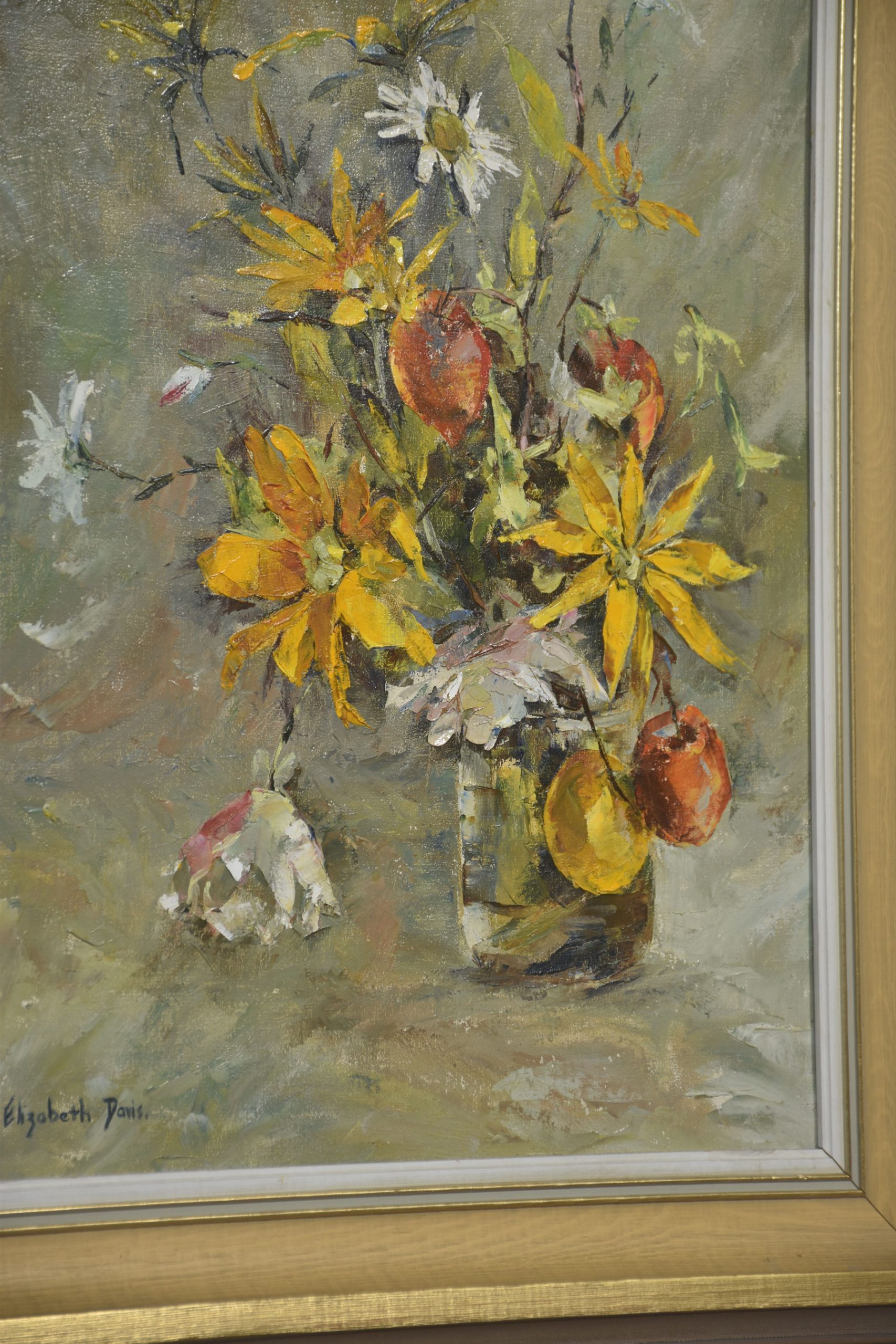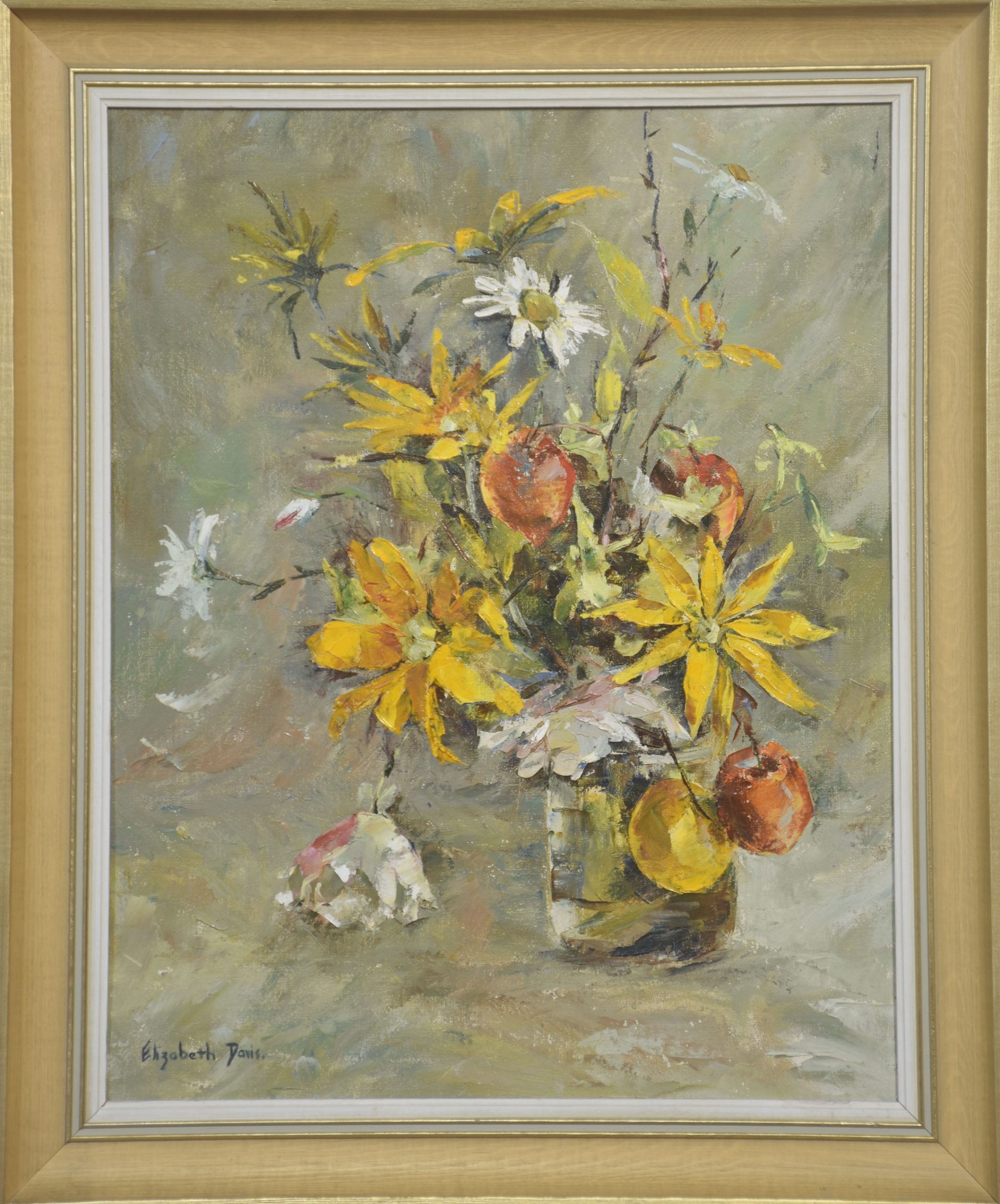 This expressive still life by Elizabeth Davis presents a loosely arranged bouquet of yellow flowers interspersed with white blossoms and apples, set within a simple glass vessel. Executed in oil with confident, gestural brushwork, the composition emphasises movement and surface texture rather than botanical precision. Thick impasto strokes define petals and foliage, while softer, blended passages in the background create atmospheric depth.