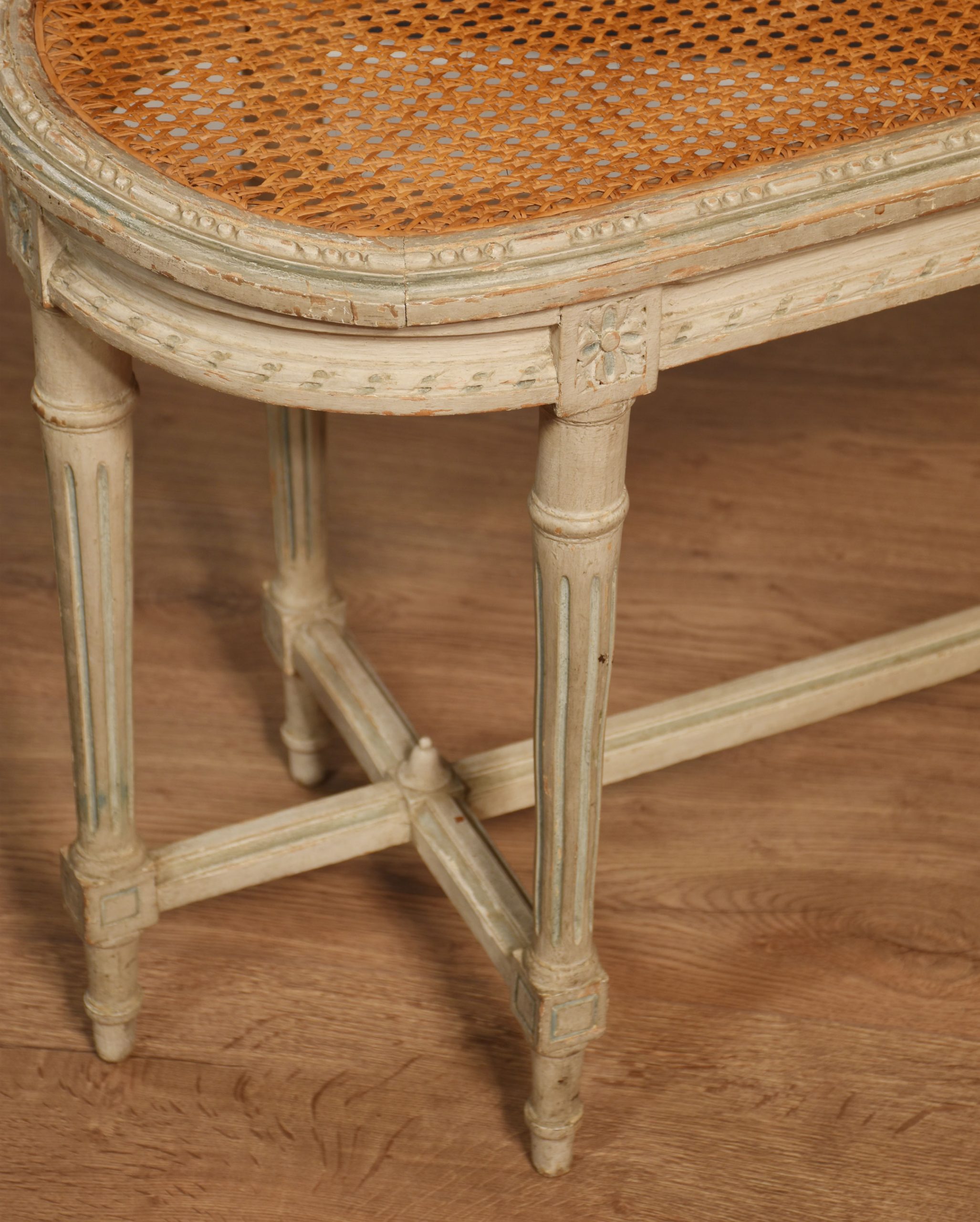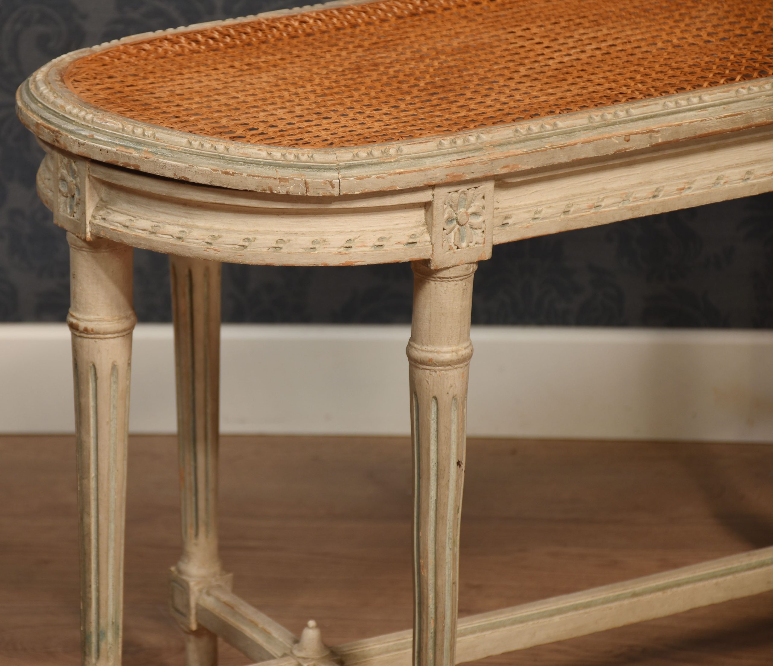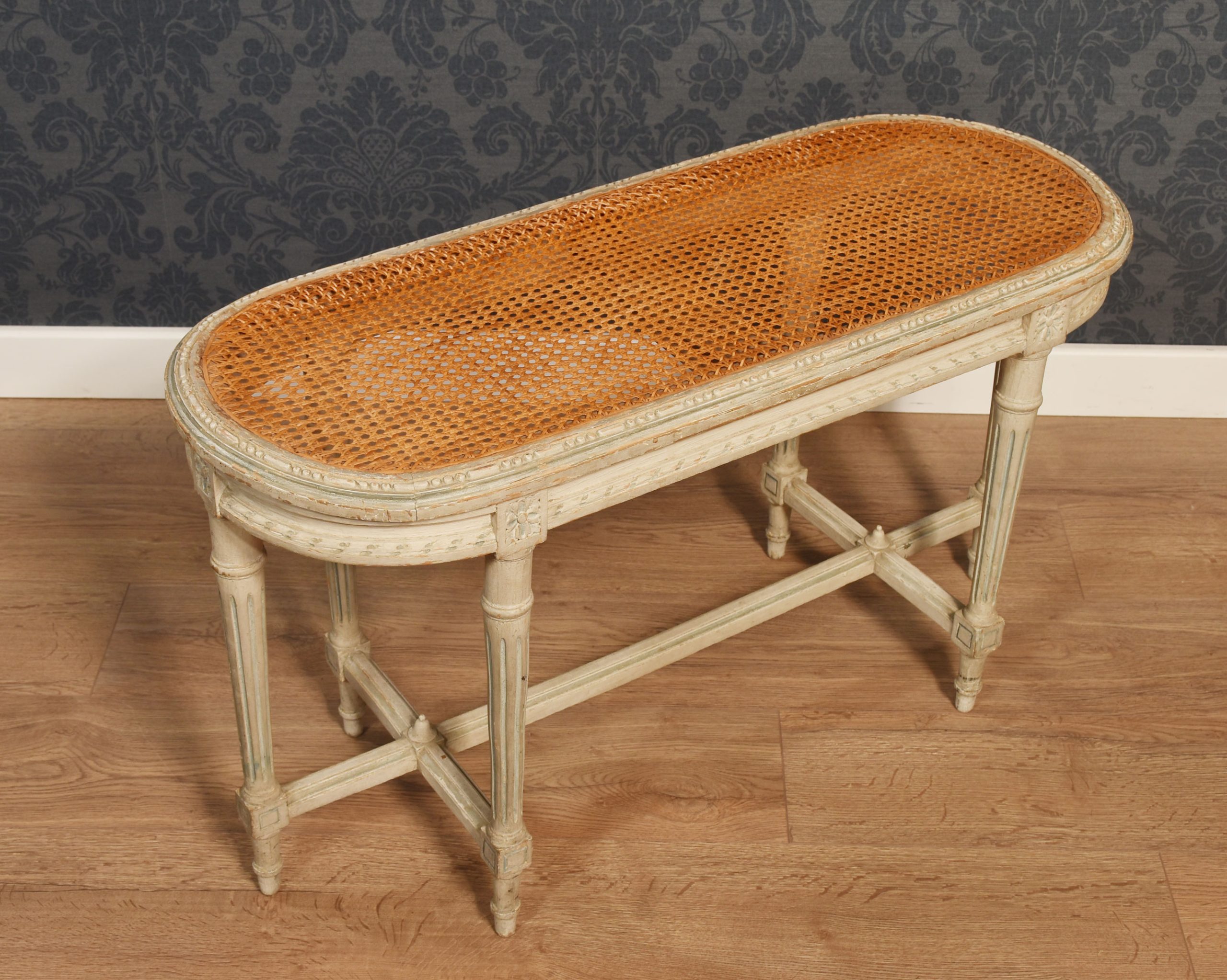 French oval window seat, having shaped cane work seat, within a channelled frame. Above a rope effect frieze raised on six fluted legs united by stretchers. There has been a repair to the cane work.