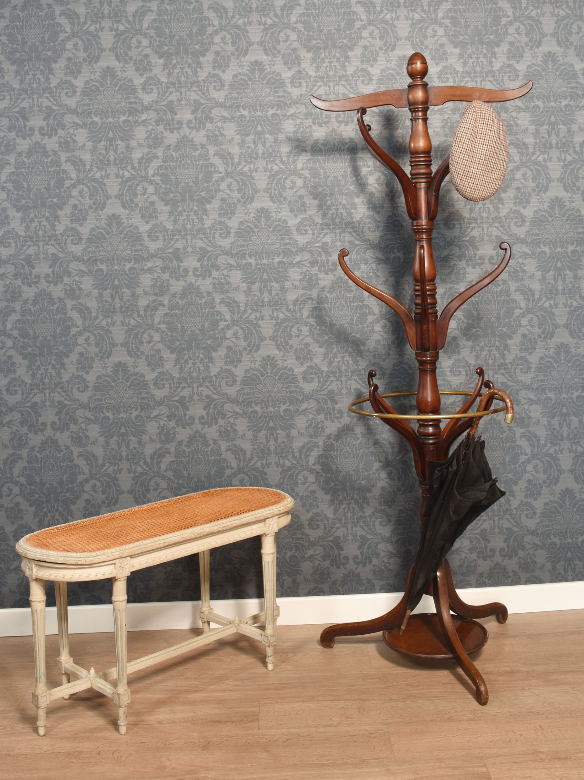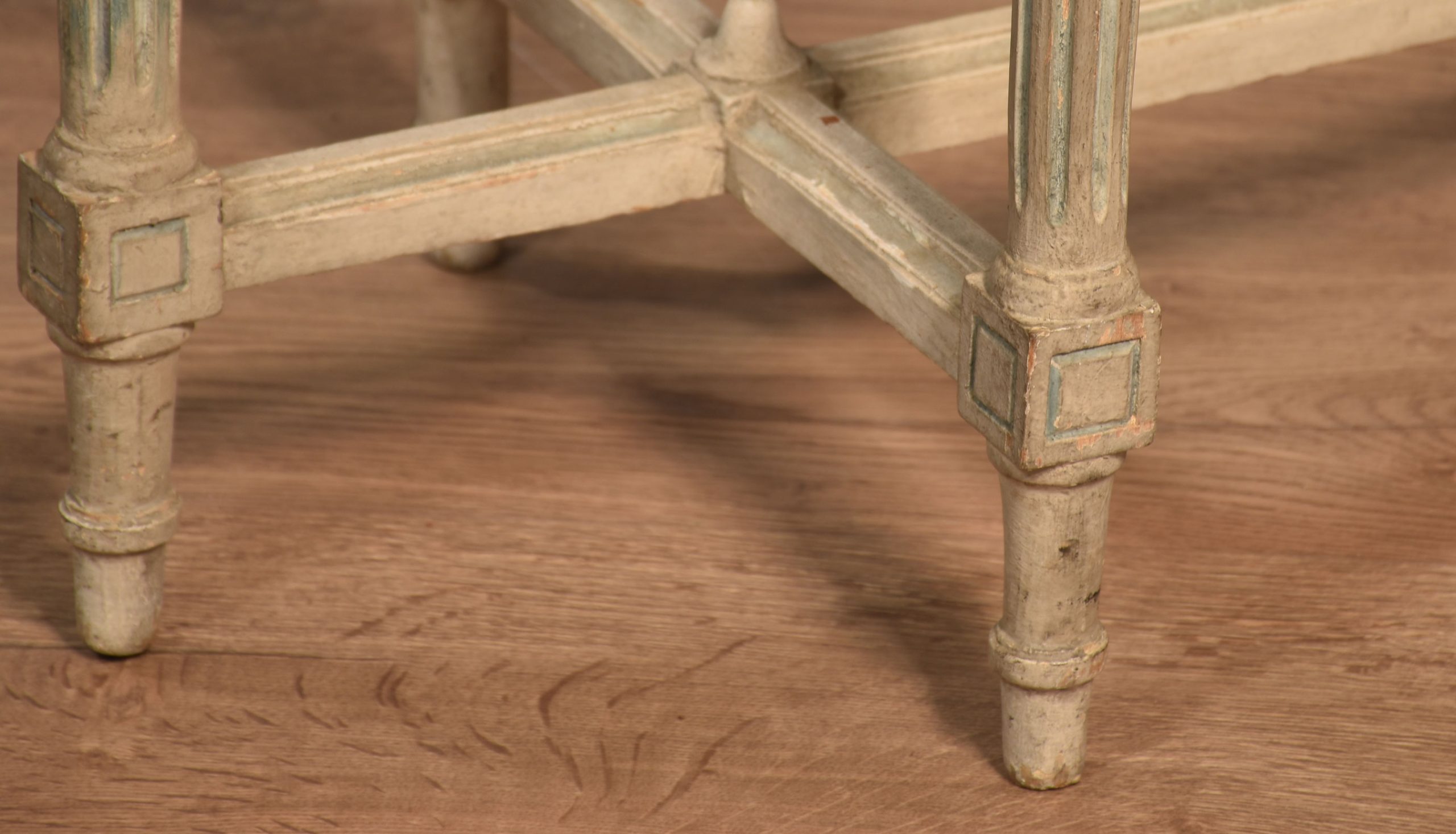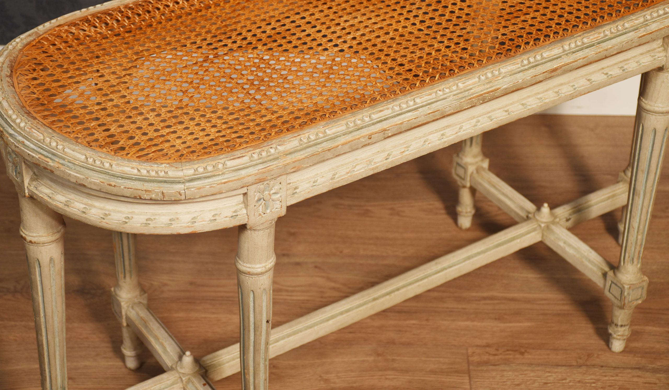 French oval window seat, having shaped cane work seat, within a channelled frame. Above a rope effect frieze raised on six fluted legs united by stretchers. There has been a repair to the cane work.