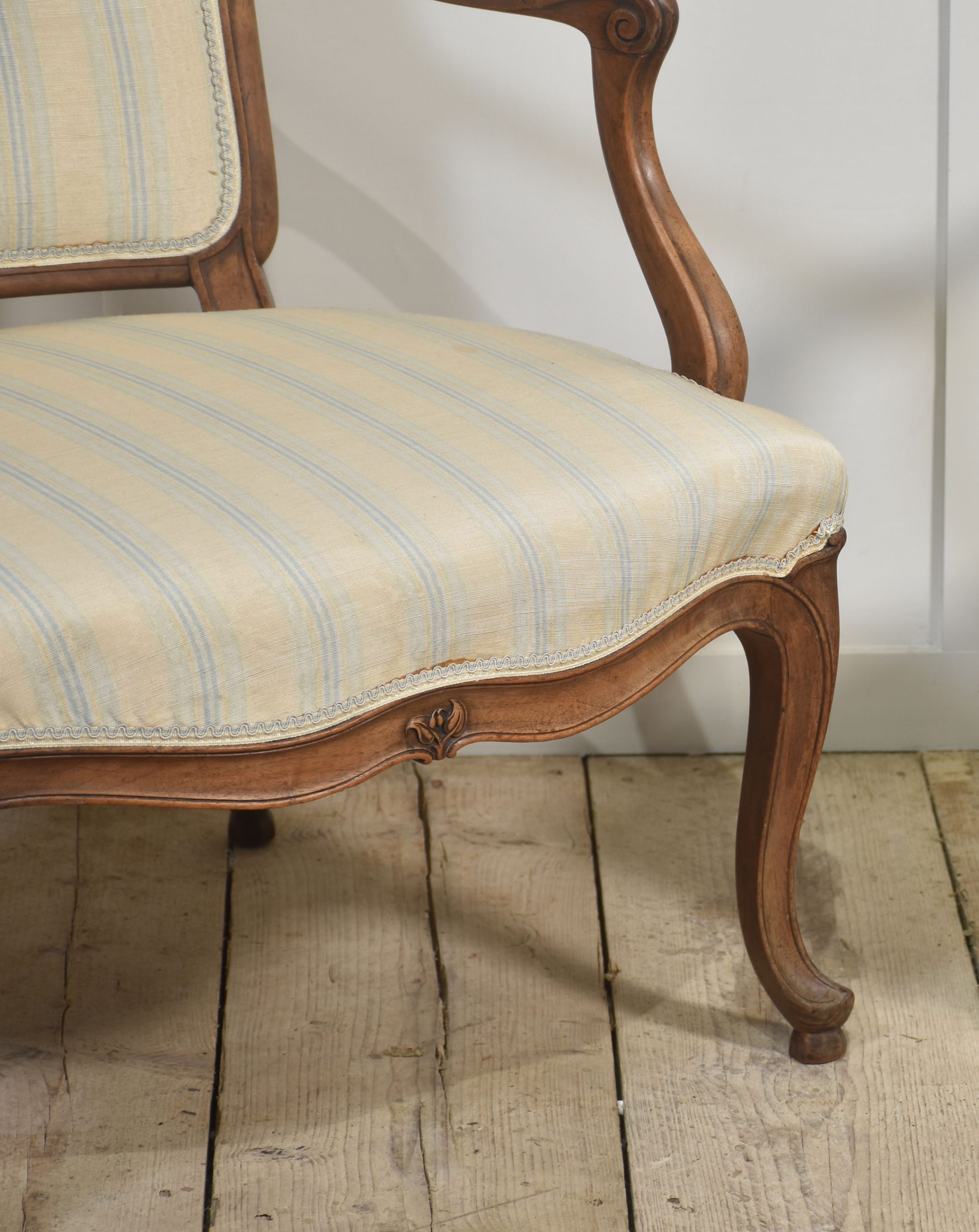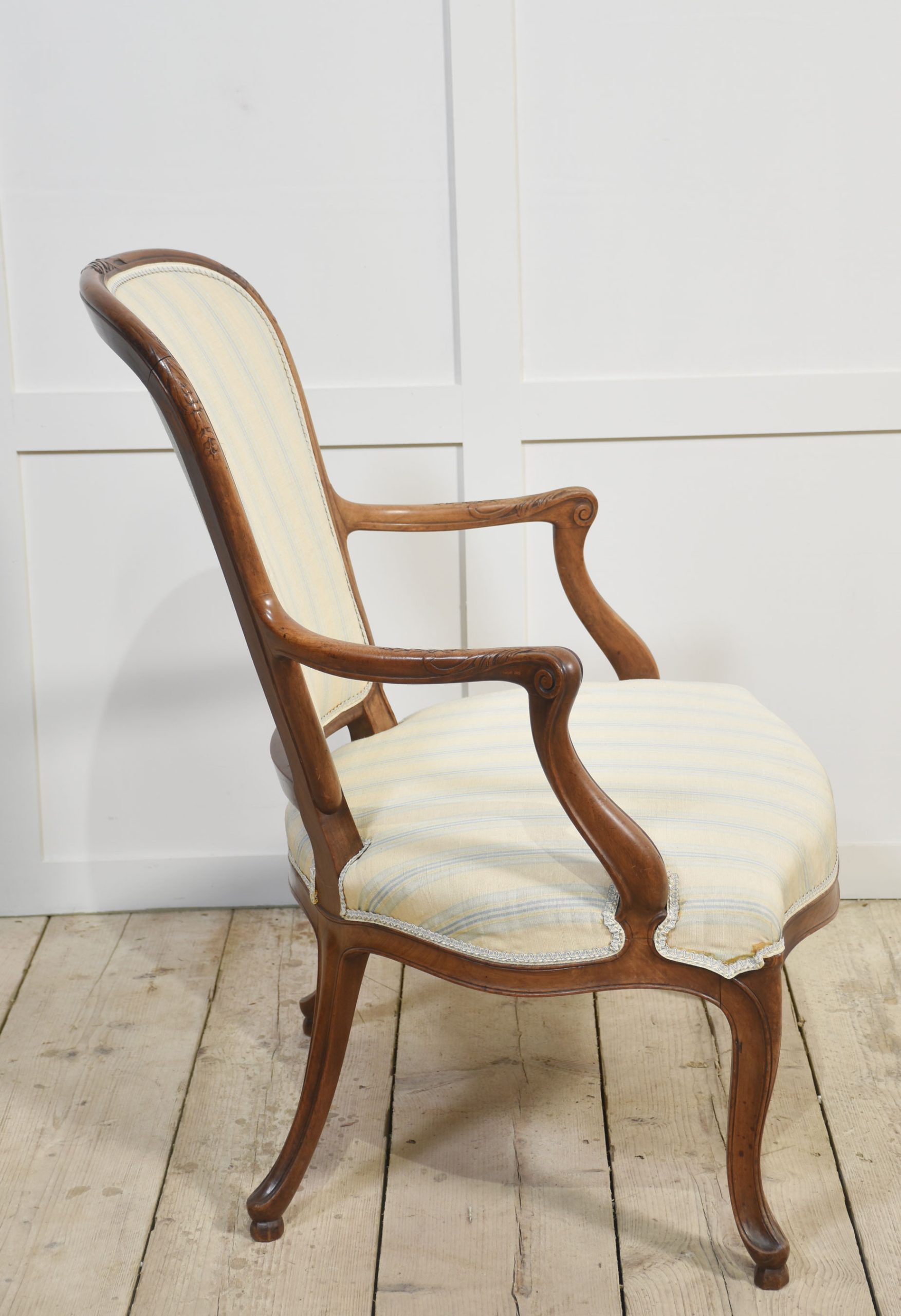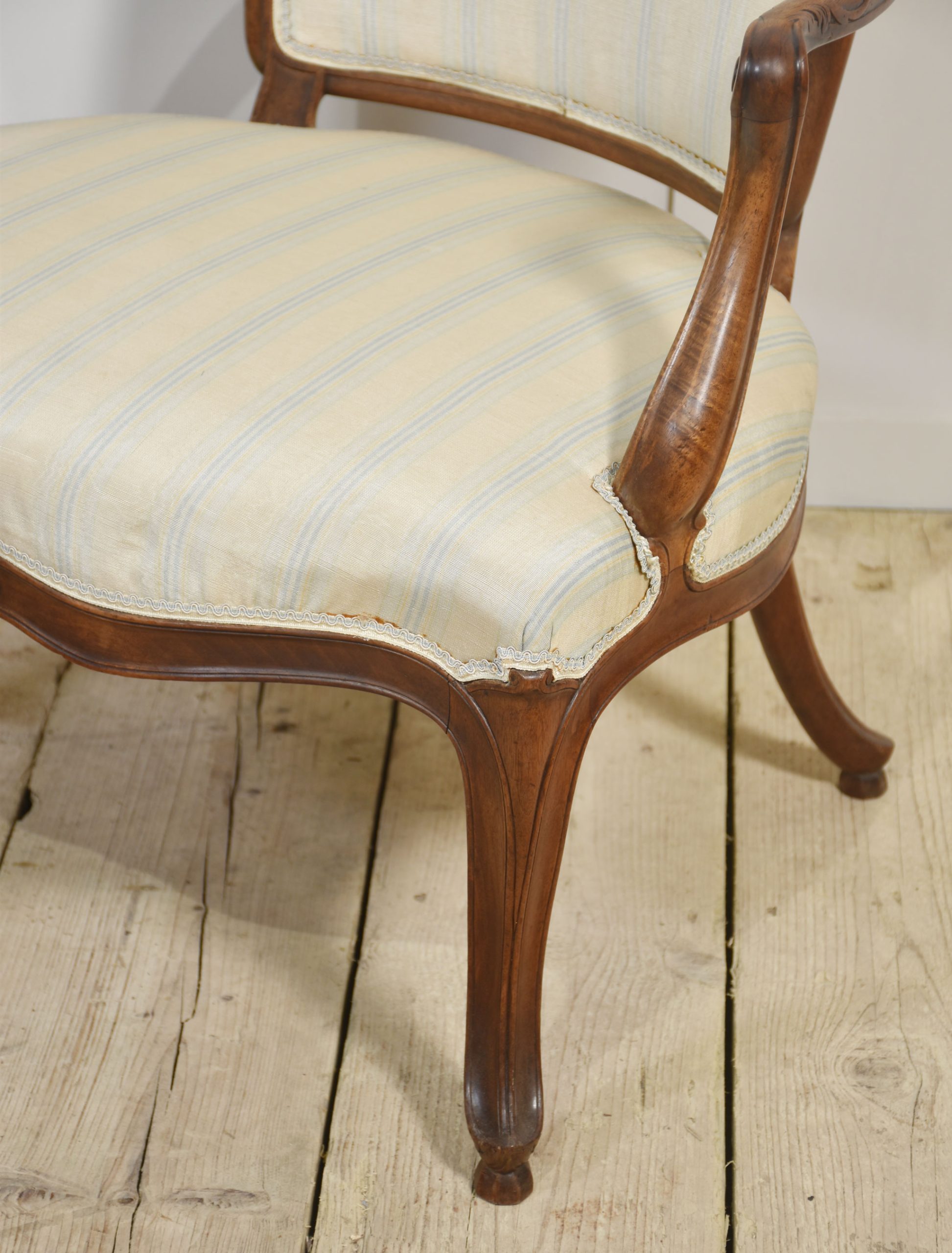 Pair of Hepplewhite style walnut Fauteuil, each with arched and padded back joined by moulded scrolling carved arms to the padded seat. Above a carved apron all raised up on cabriole legs.