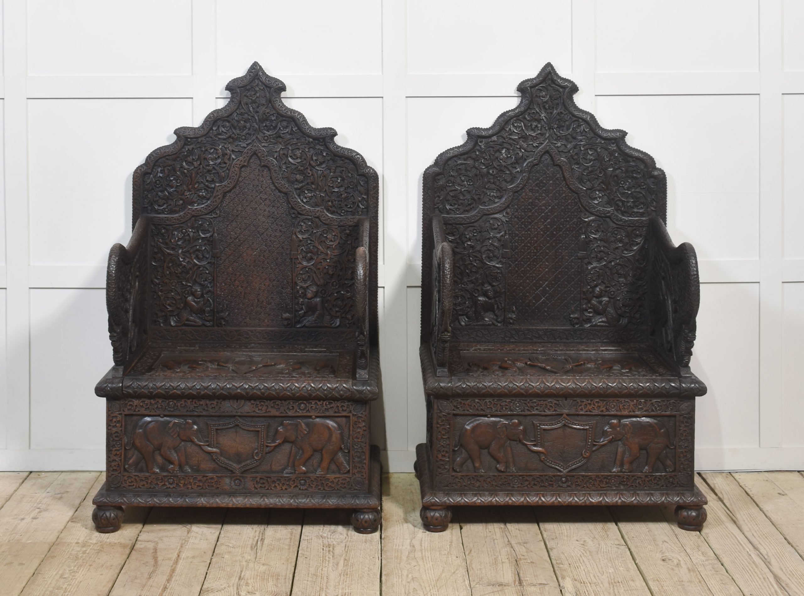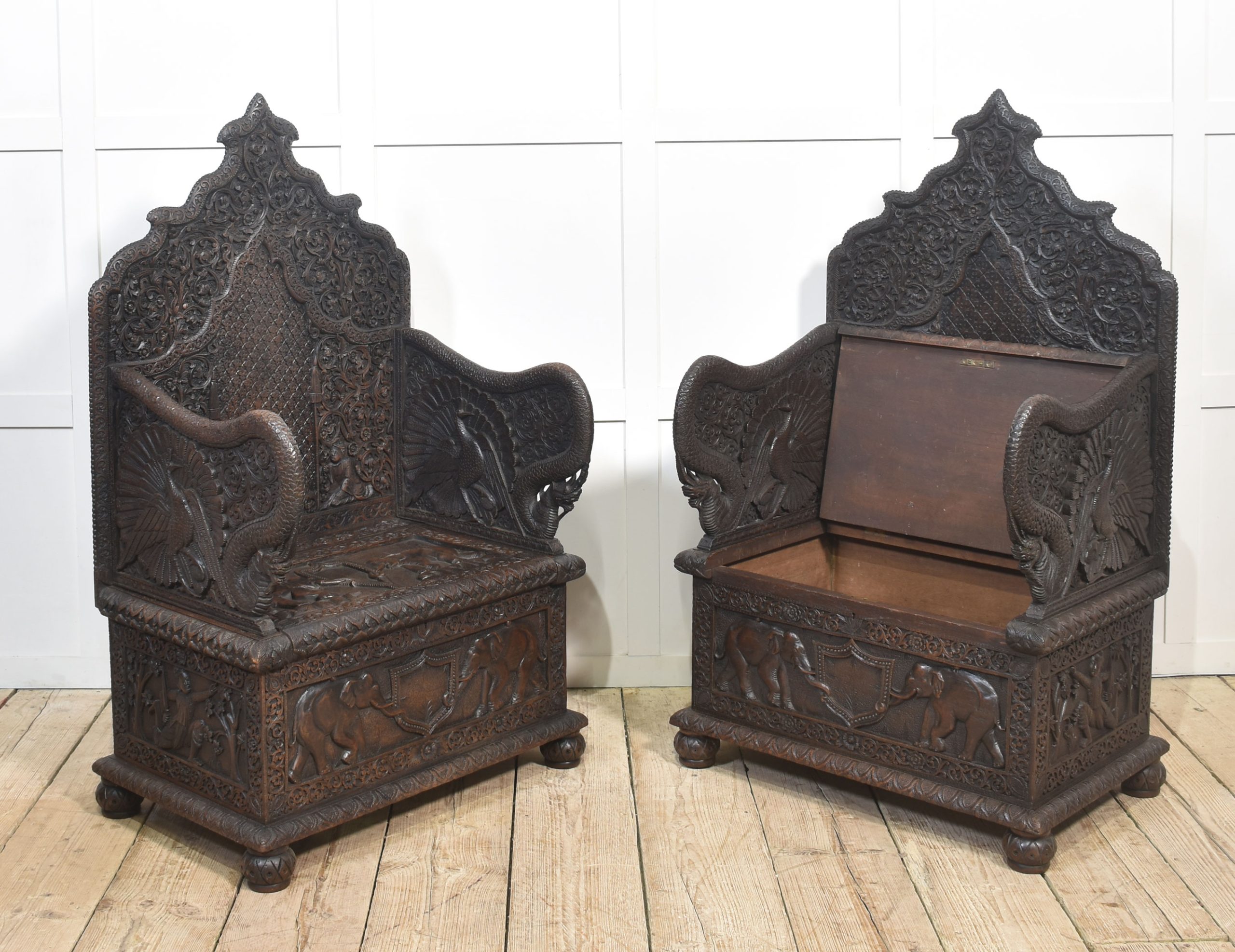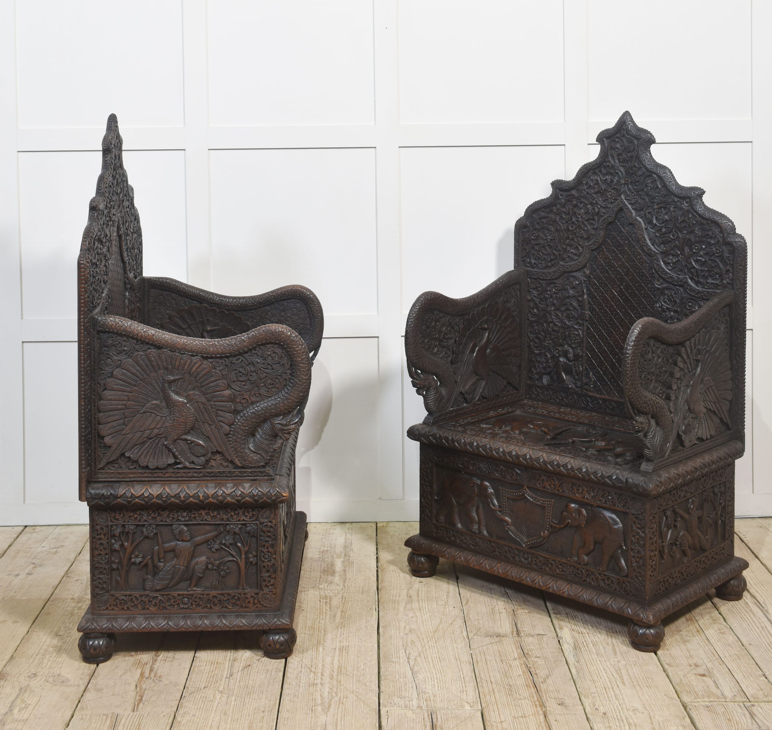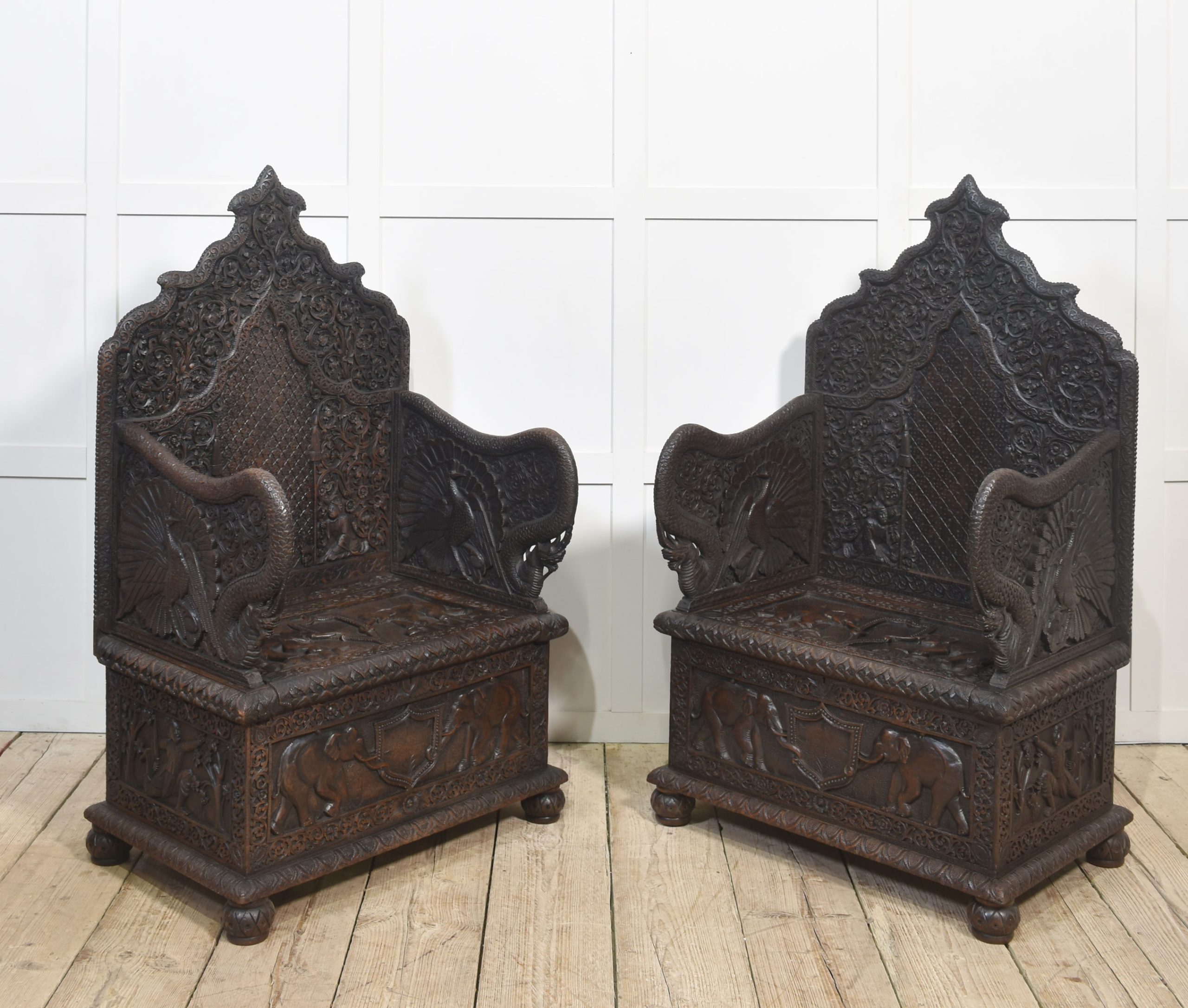 Rare pair of 19th-century carved ceremonial armchairs, the profusely carved backs with flower heads and scrolling leaf decoration to the lift-up seat retaining the original locks. Flanked by crisply carved peacock arms. Above further decorative carving depicting elephants. All raised on bun feet.