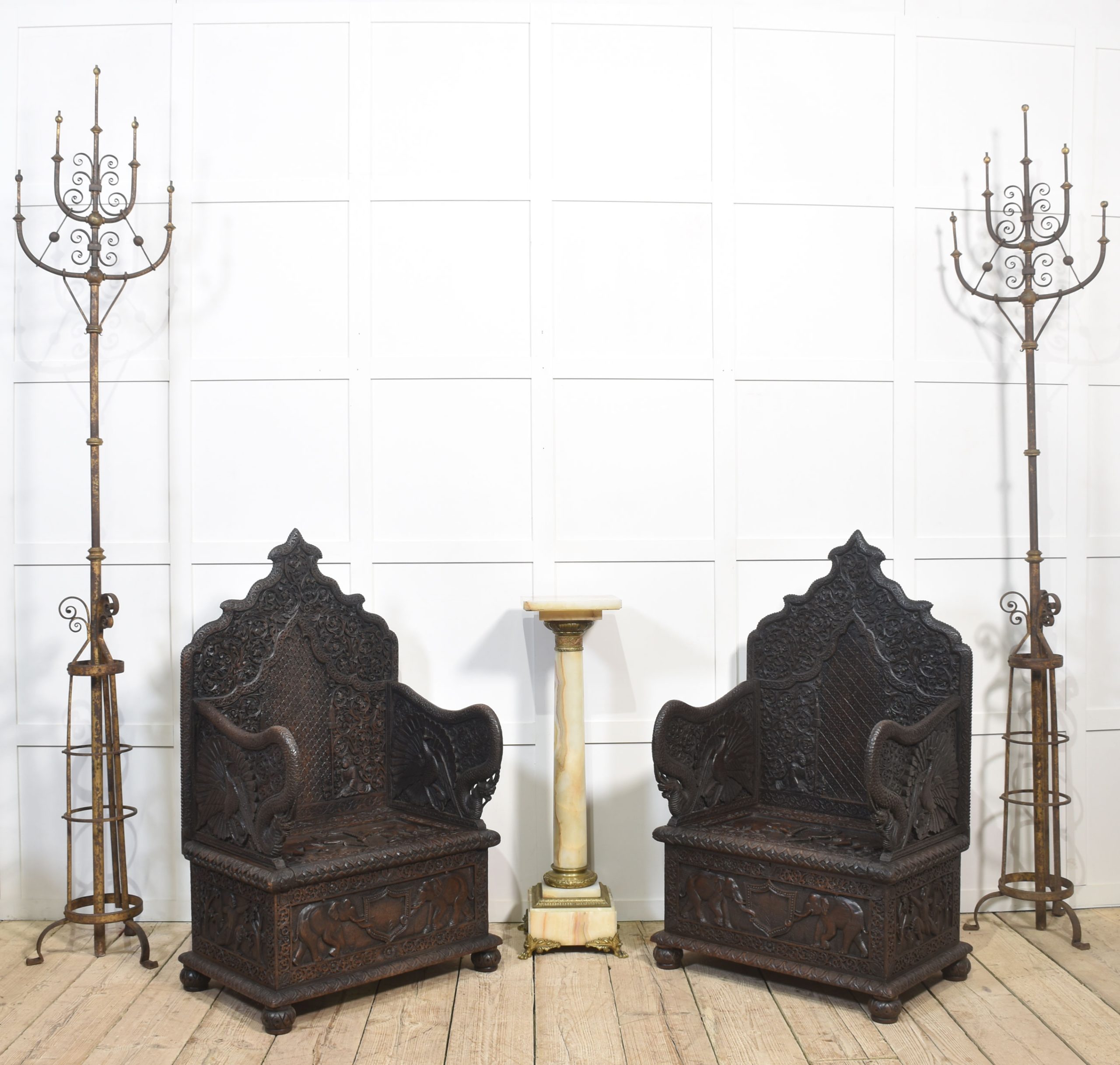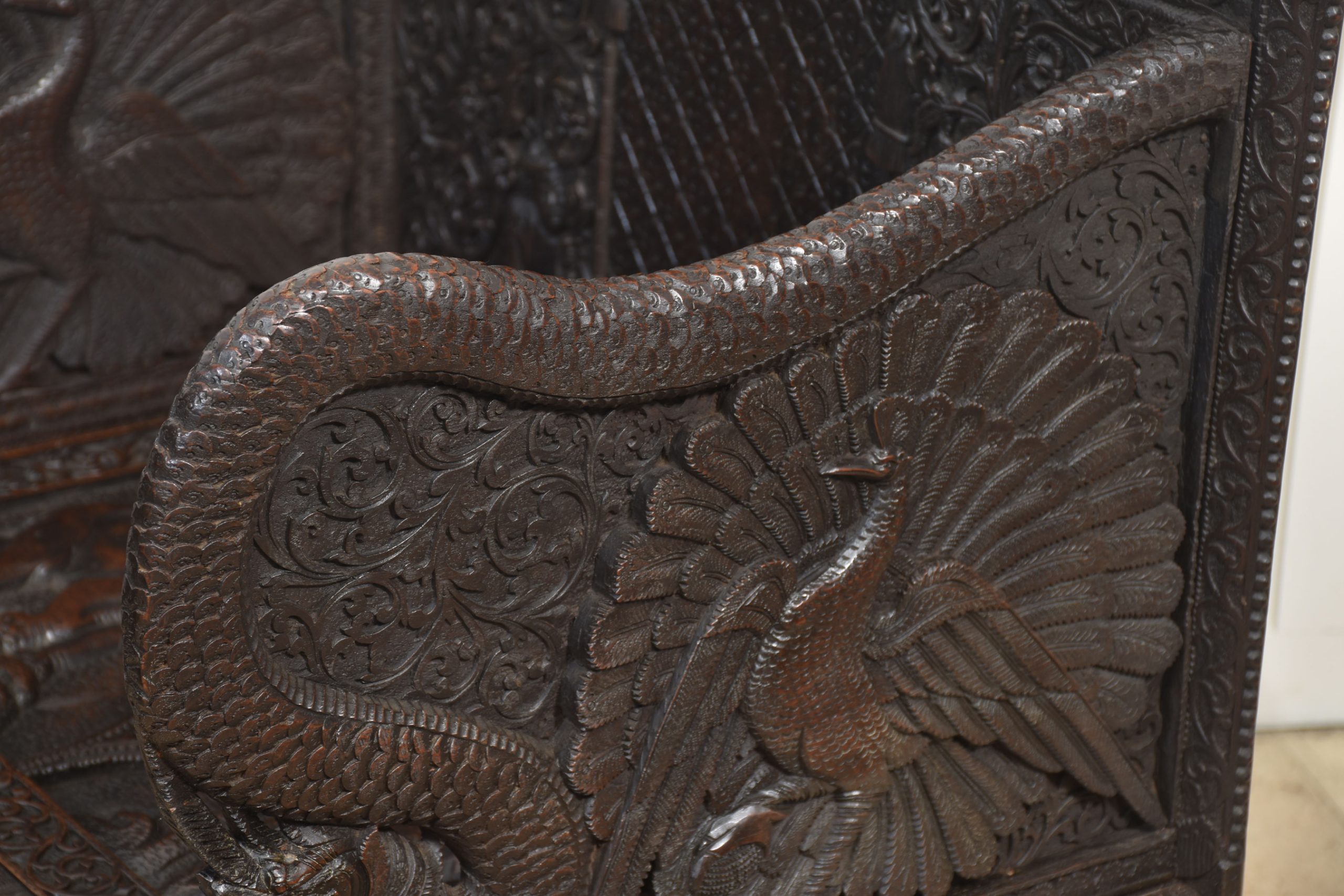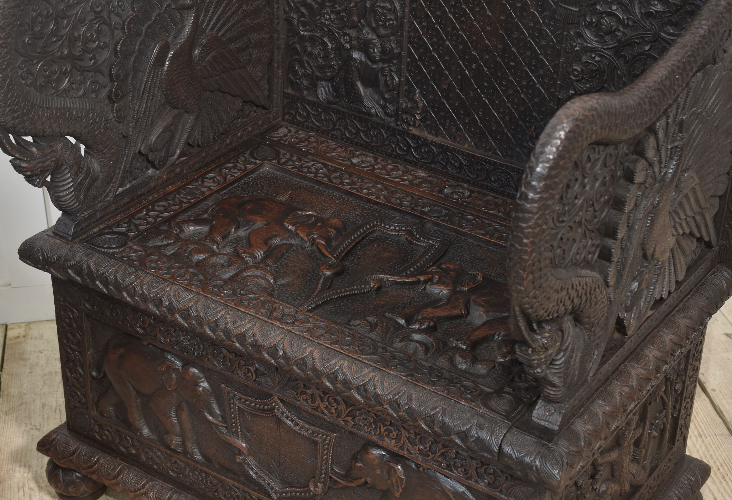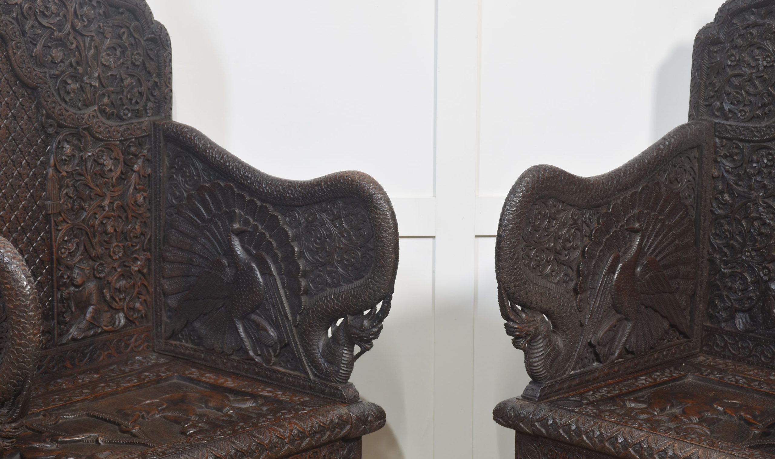 Rare pair of 19th-century carved ceremonial armchairs, the profusely carved backs with flower heads and scrolling leaf decoration to the lift-up seat retaining the original locks. Flanked by crisply carved peacock arms. Above further decorative carving depicting elephants. All raised on bun feet.