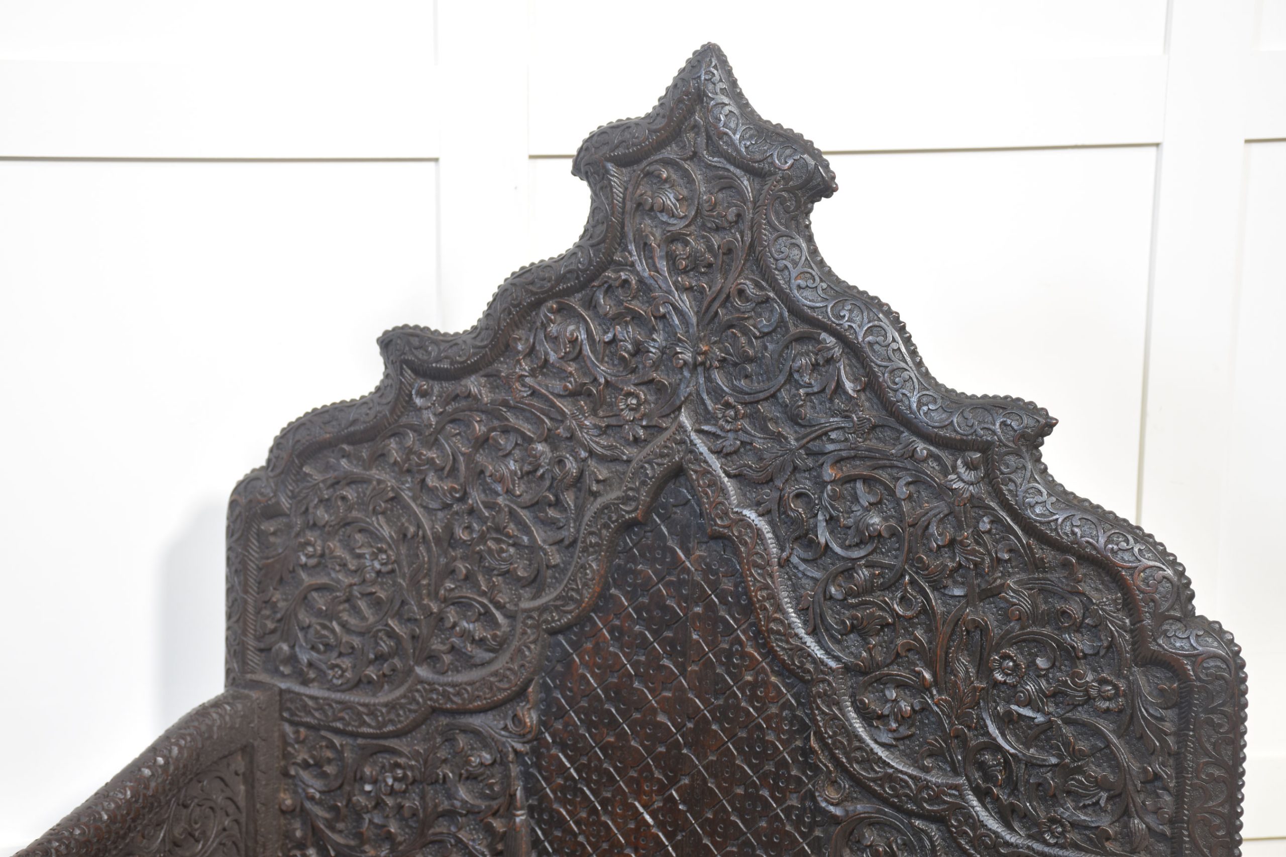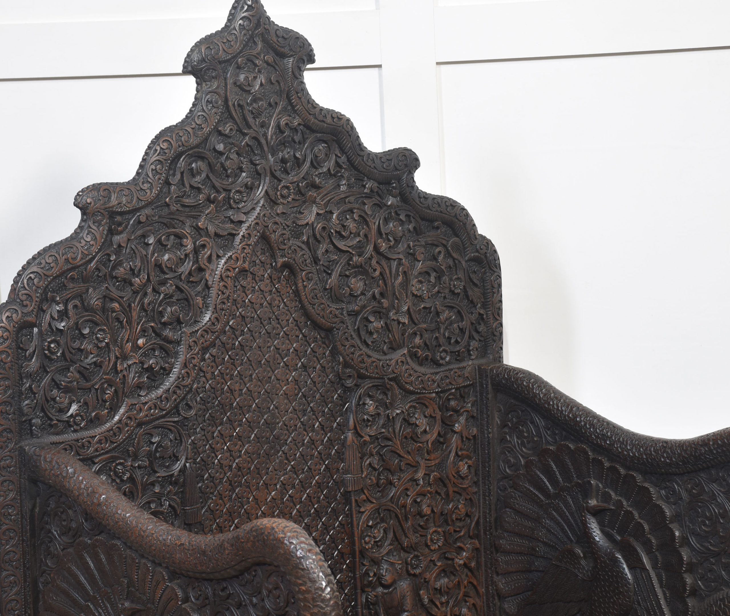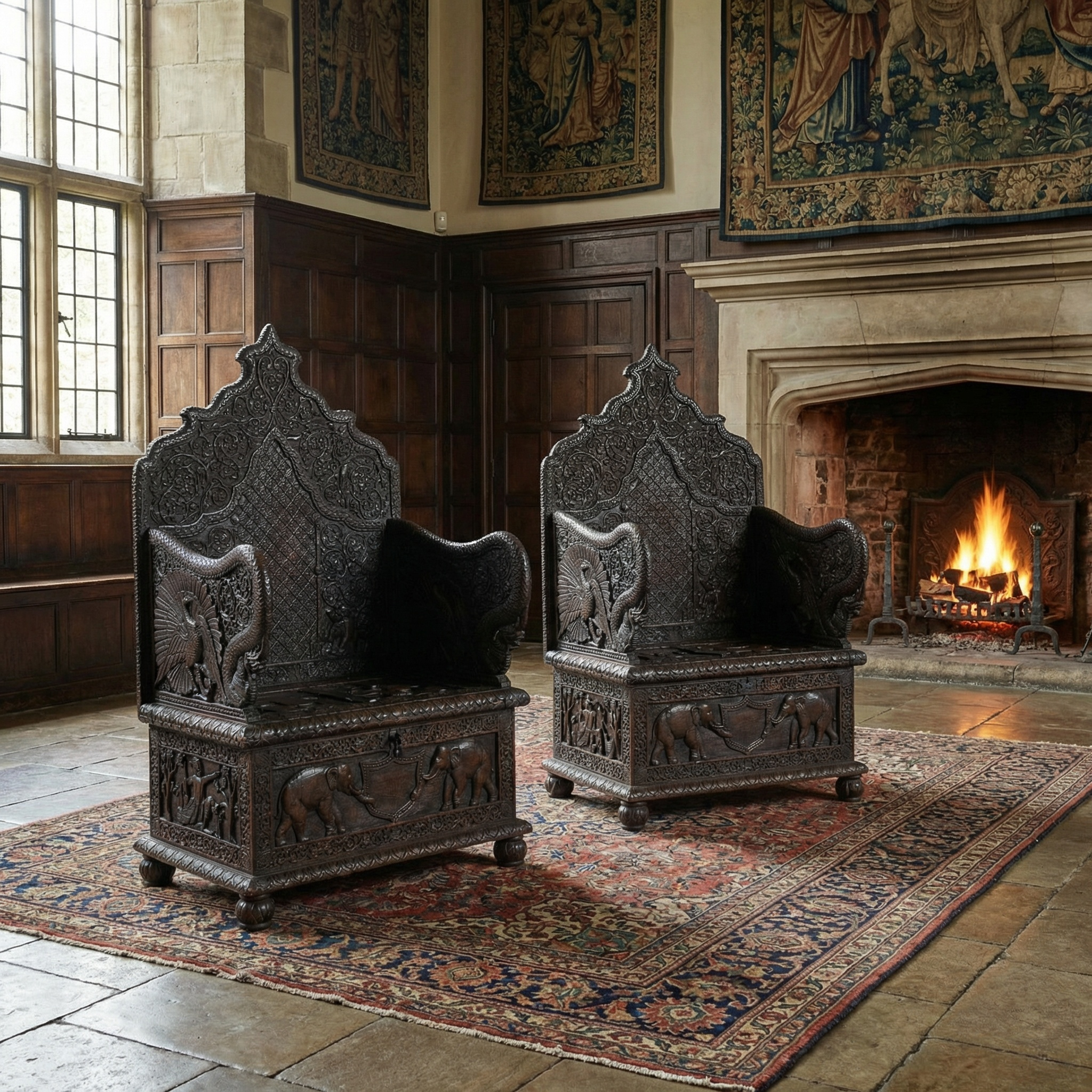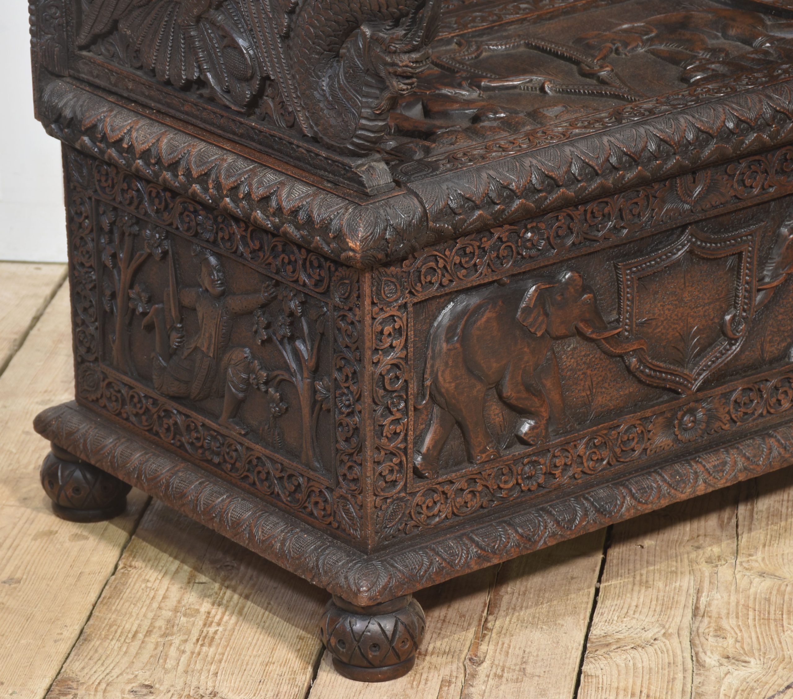 Rare pair of 19th-century carved ceremonial armchairs, the profusely carved backs with flower heads and scrolling leaf decoration to the lift-up seat retaining the original locks. Flanked by crisply carved peacock arms. Above further decorative carving depicting elephants. All raised on bun feet.
