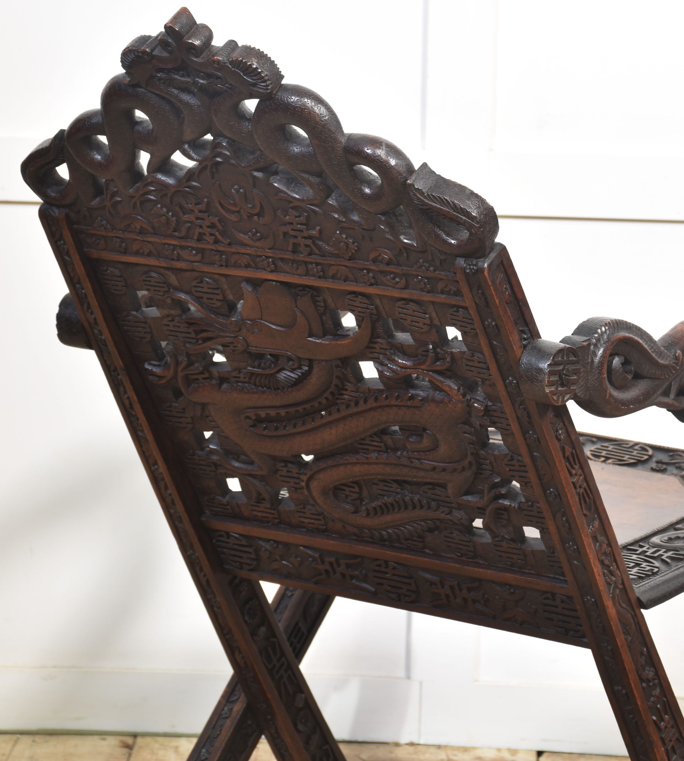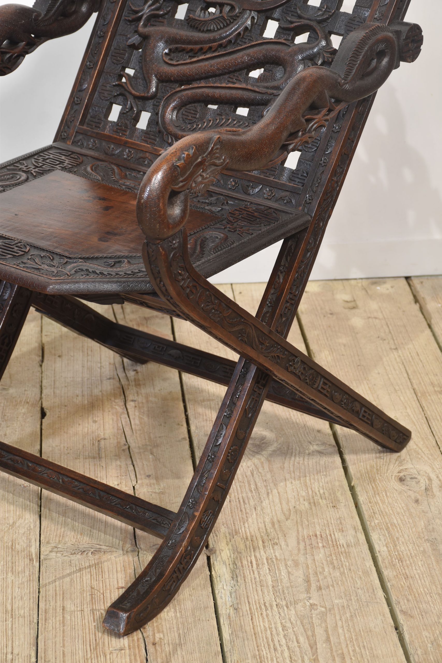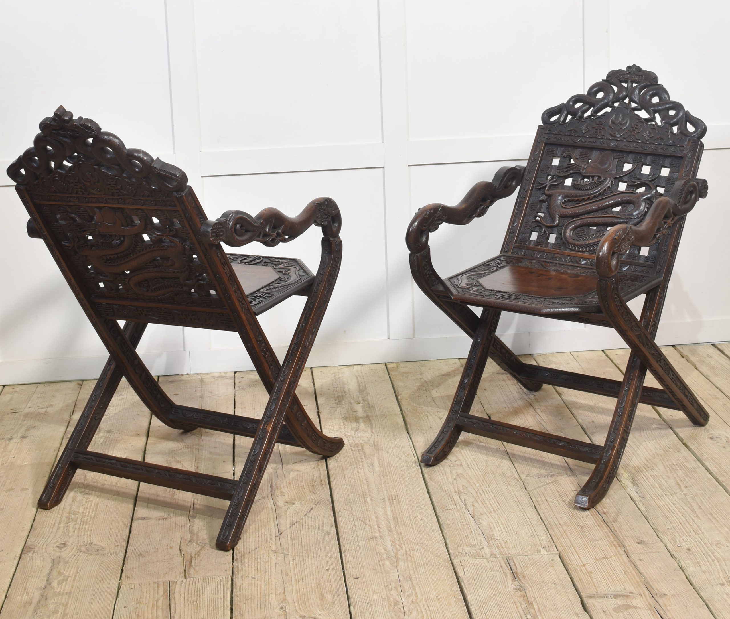 Pair of 19th-century Chinese folding armchairs, the arched backs profusely carved and detailed with dragons to the solid seat with further carved decoration.Flanked by shaped arms depicting serpents. All raised on square supports united by stretchers.