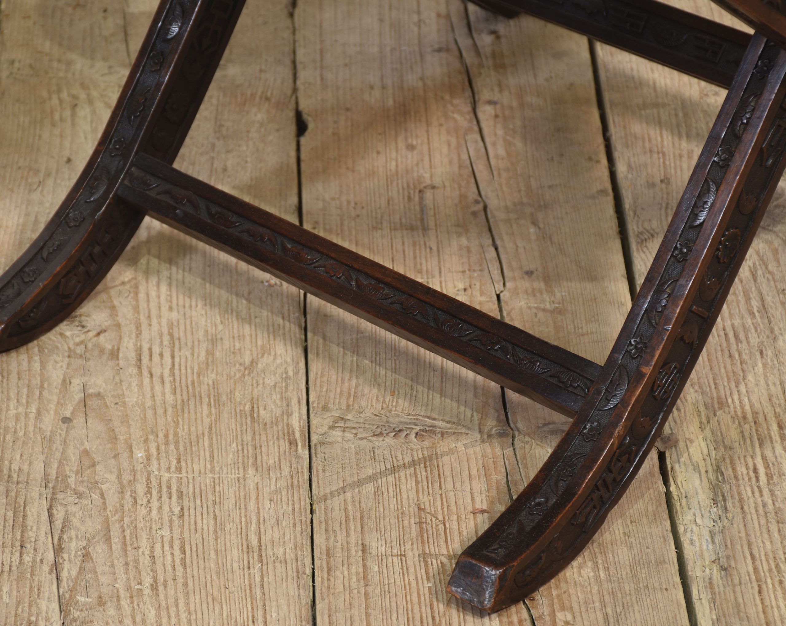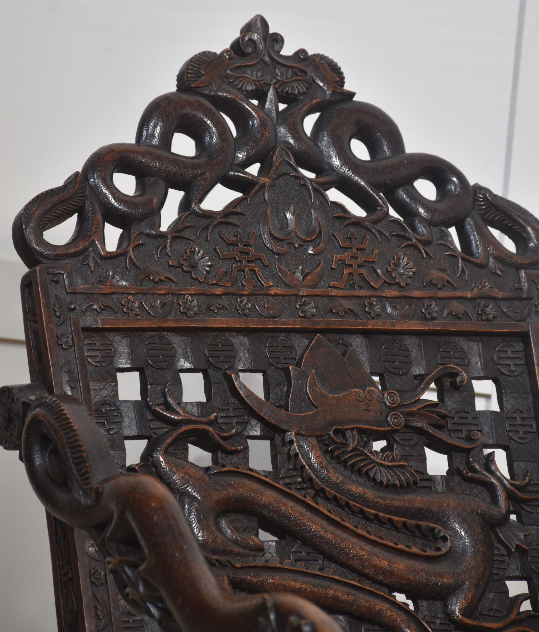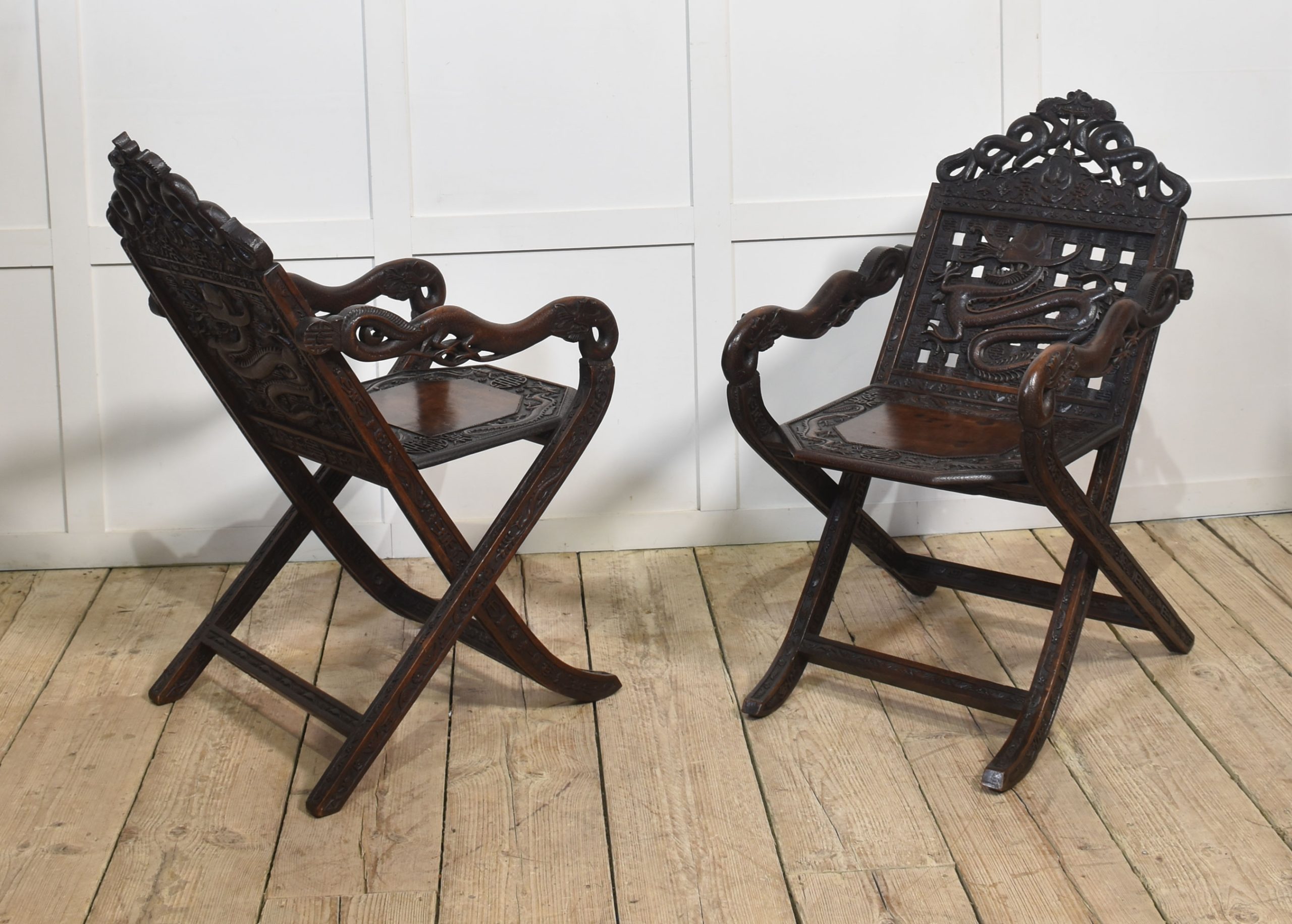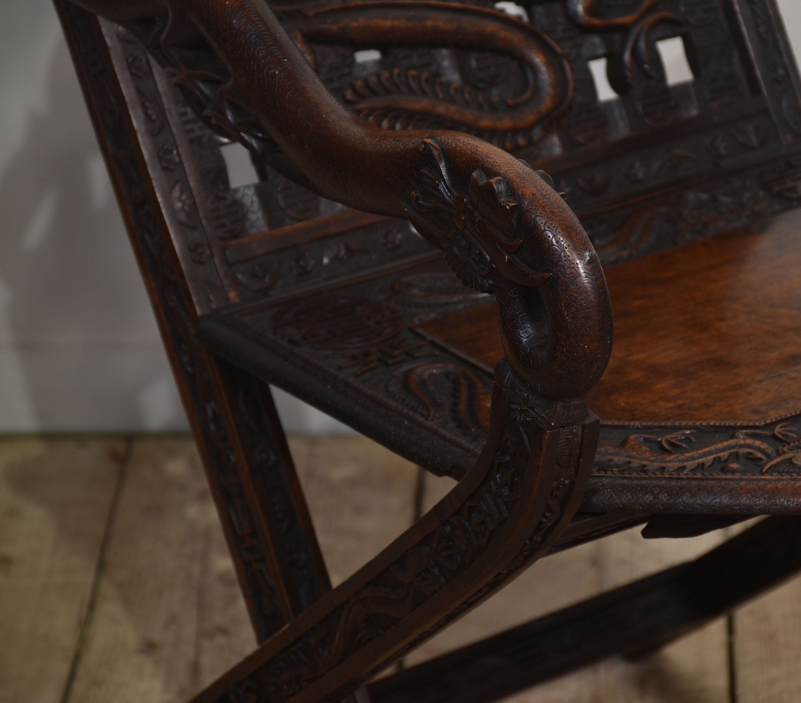 Pair of 19th-century Chinese folding armchairs, the arched backs profusely carved and detailed with dragons to the solid seat with further carved decoration.Flanked by shaped arms depicting serpents. All raised on square supports united by stretchers.