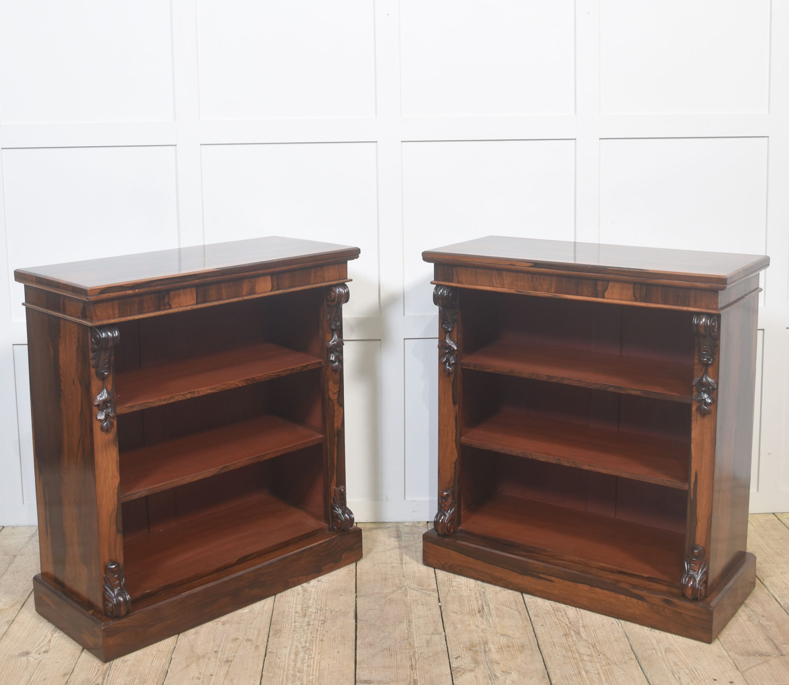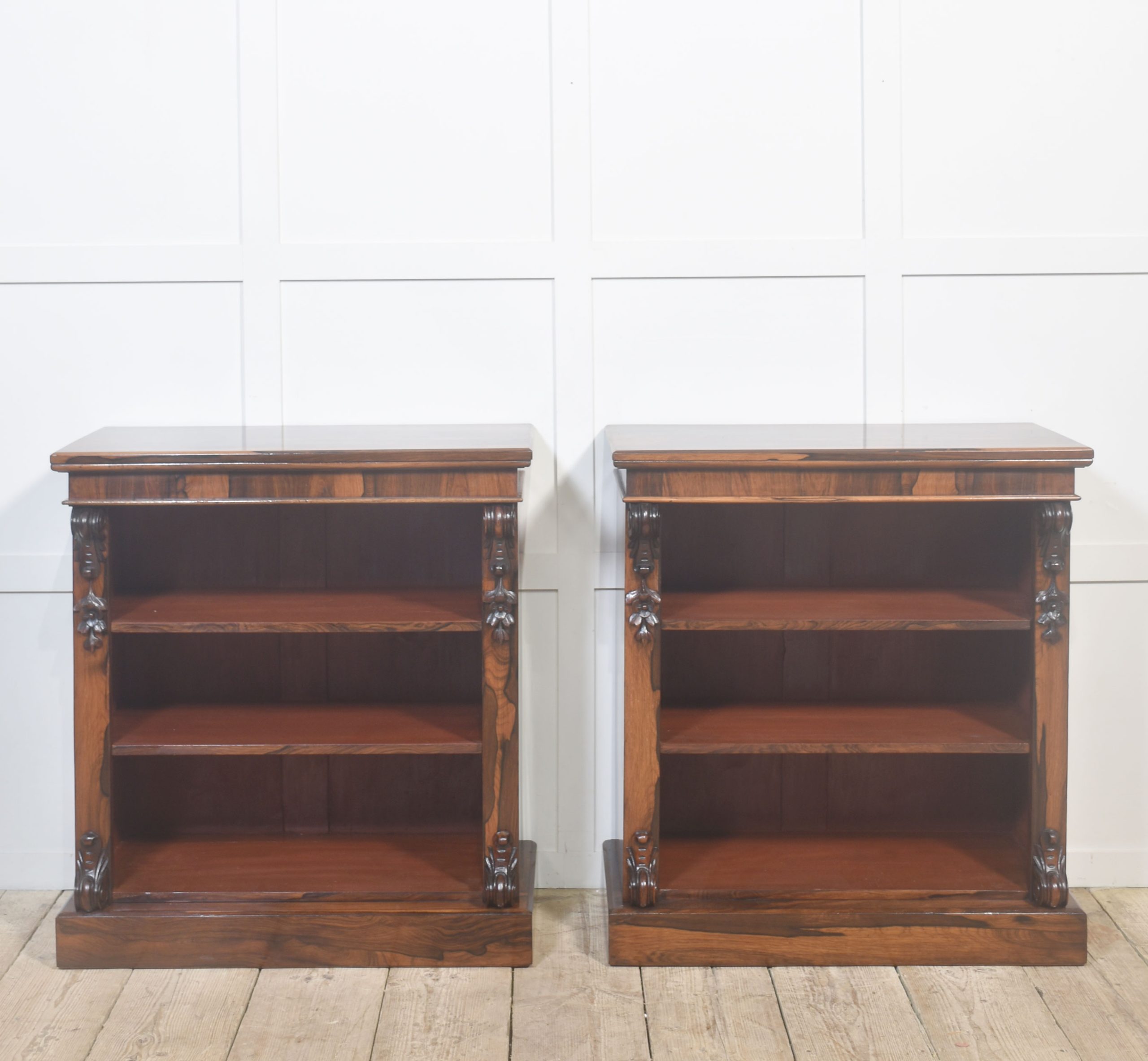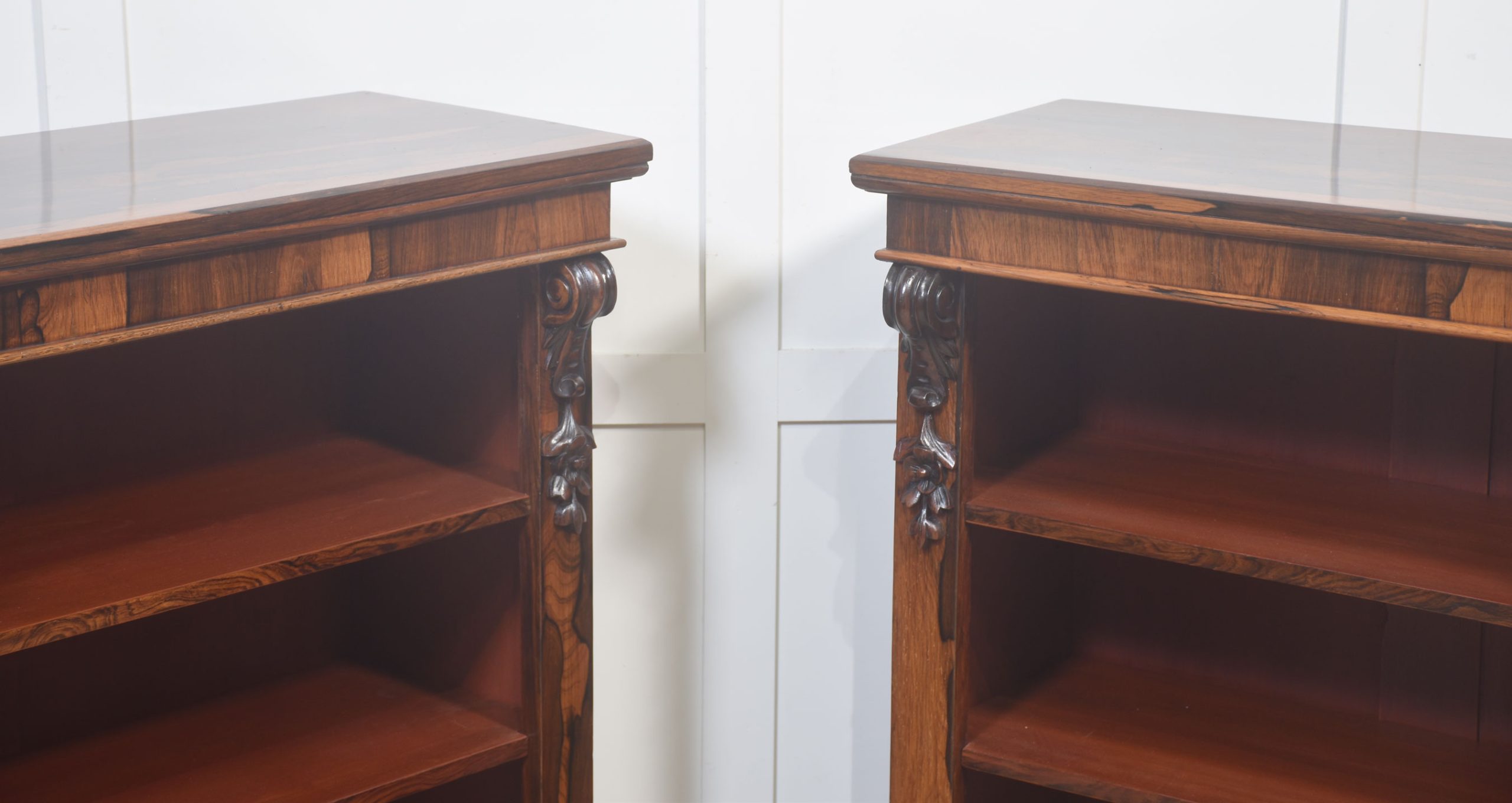 A handsome pair of 19th-century open bookcases, crafted in richly figured rosewood and designed with both elegance and practicality in mind. Each bookcase is surmounted by a solid rectangular top above an open interior fitted with adjustable shelving, allowing for flexible accommodation of books or decorative objects of varying heights.