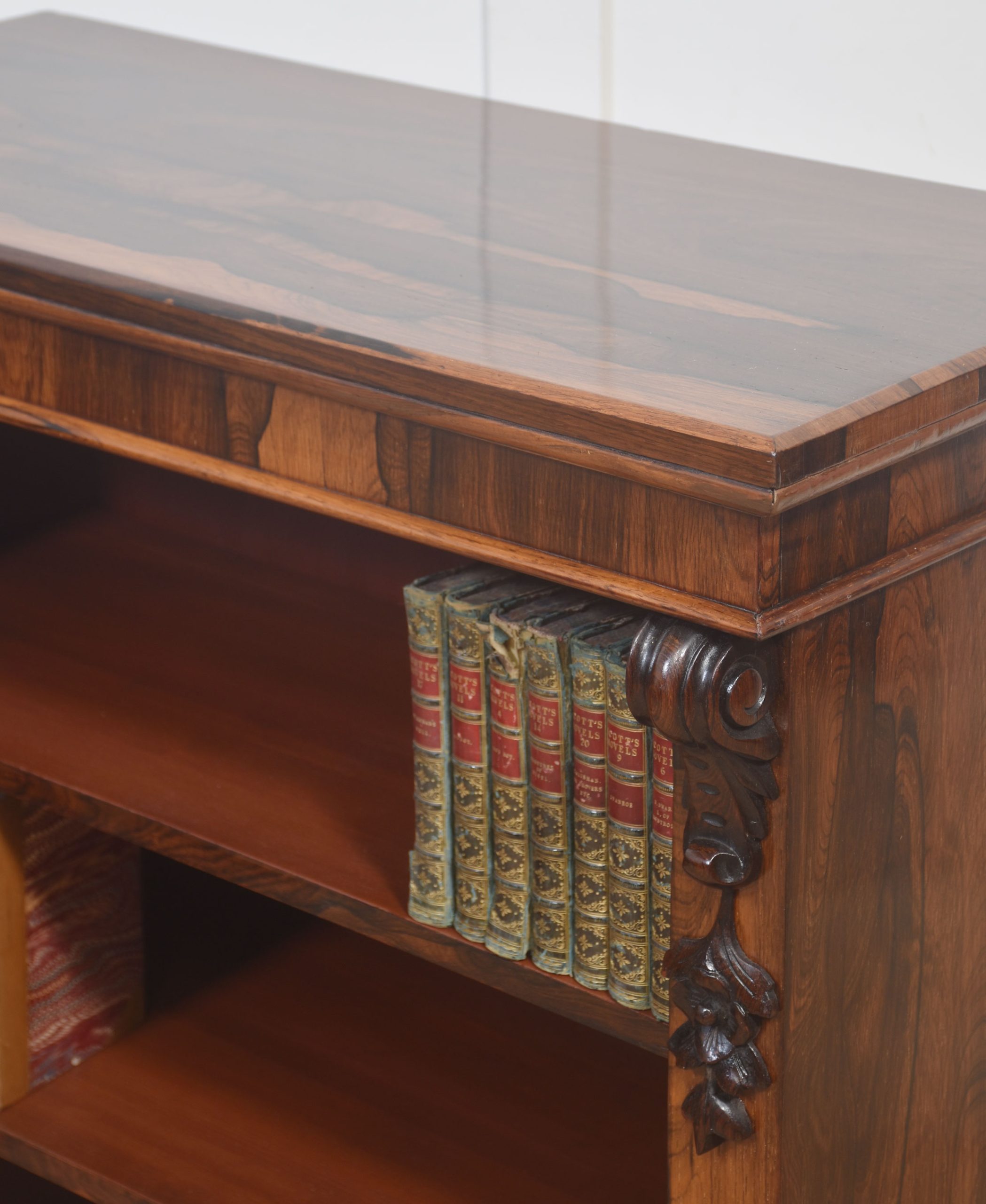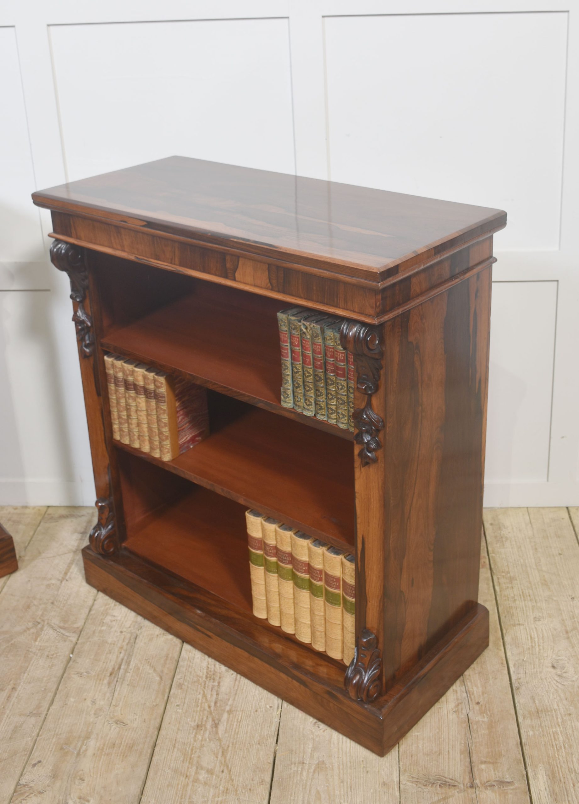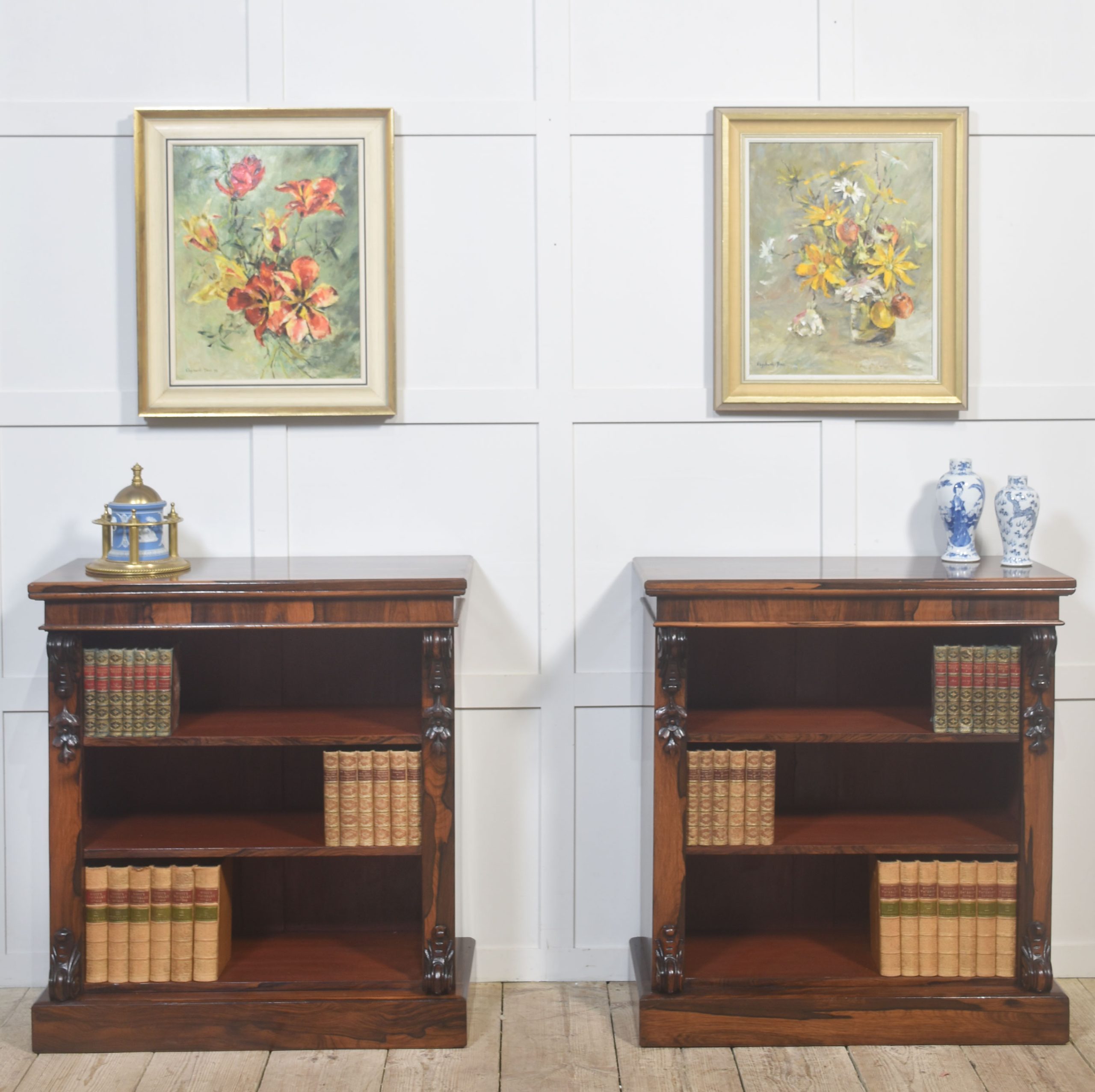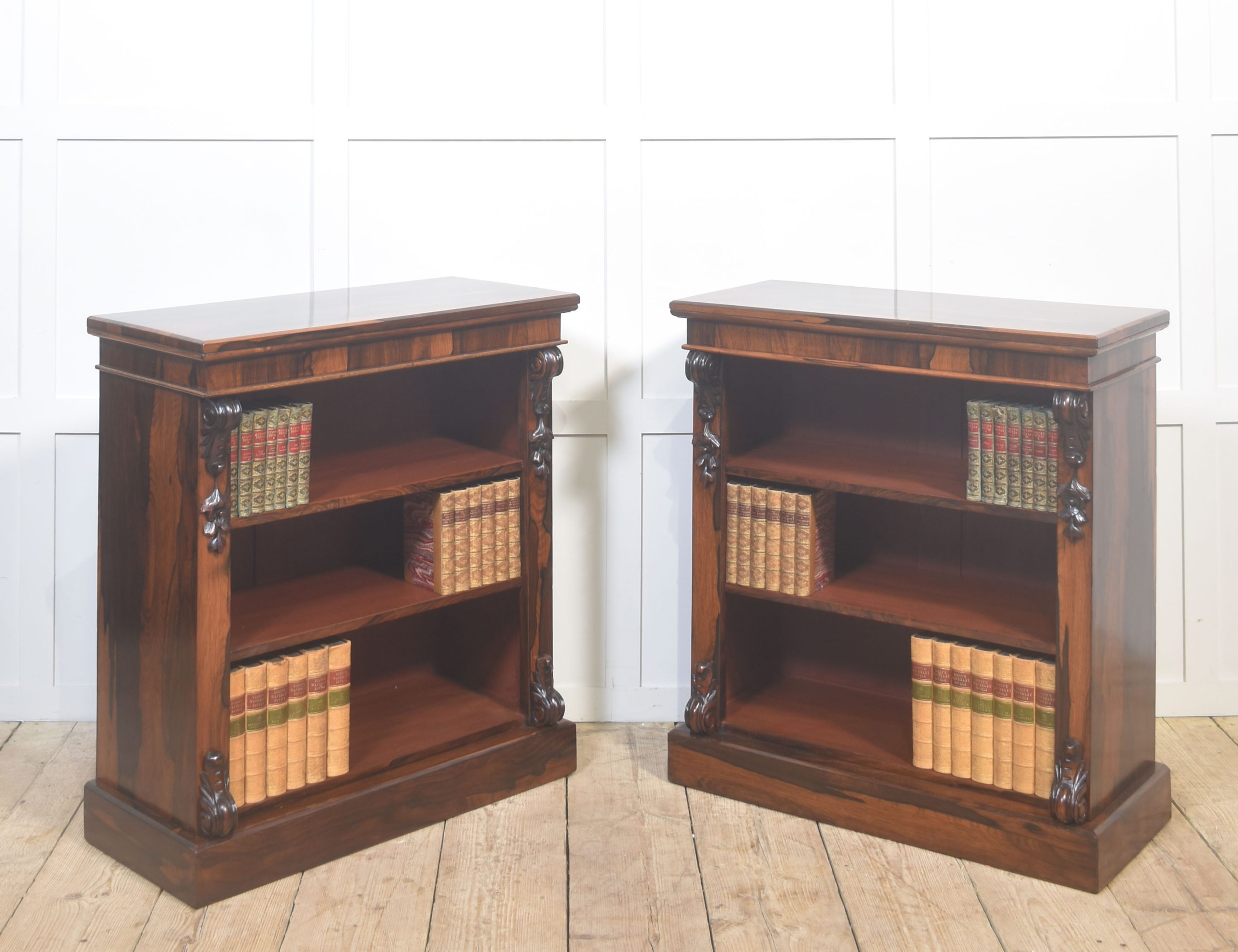 A handsome pair of 19th-century open bookcases, crafted in richly figured rosewood and designed with both elegance and practicality in mind. Each bookcase is surmounted by a solid rectangular top above an open interior fitted with adjustable shelving, allowing for flexible accommodation of books or decorative objects of varying heights.