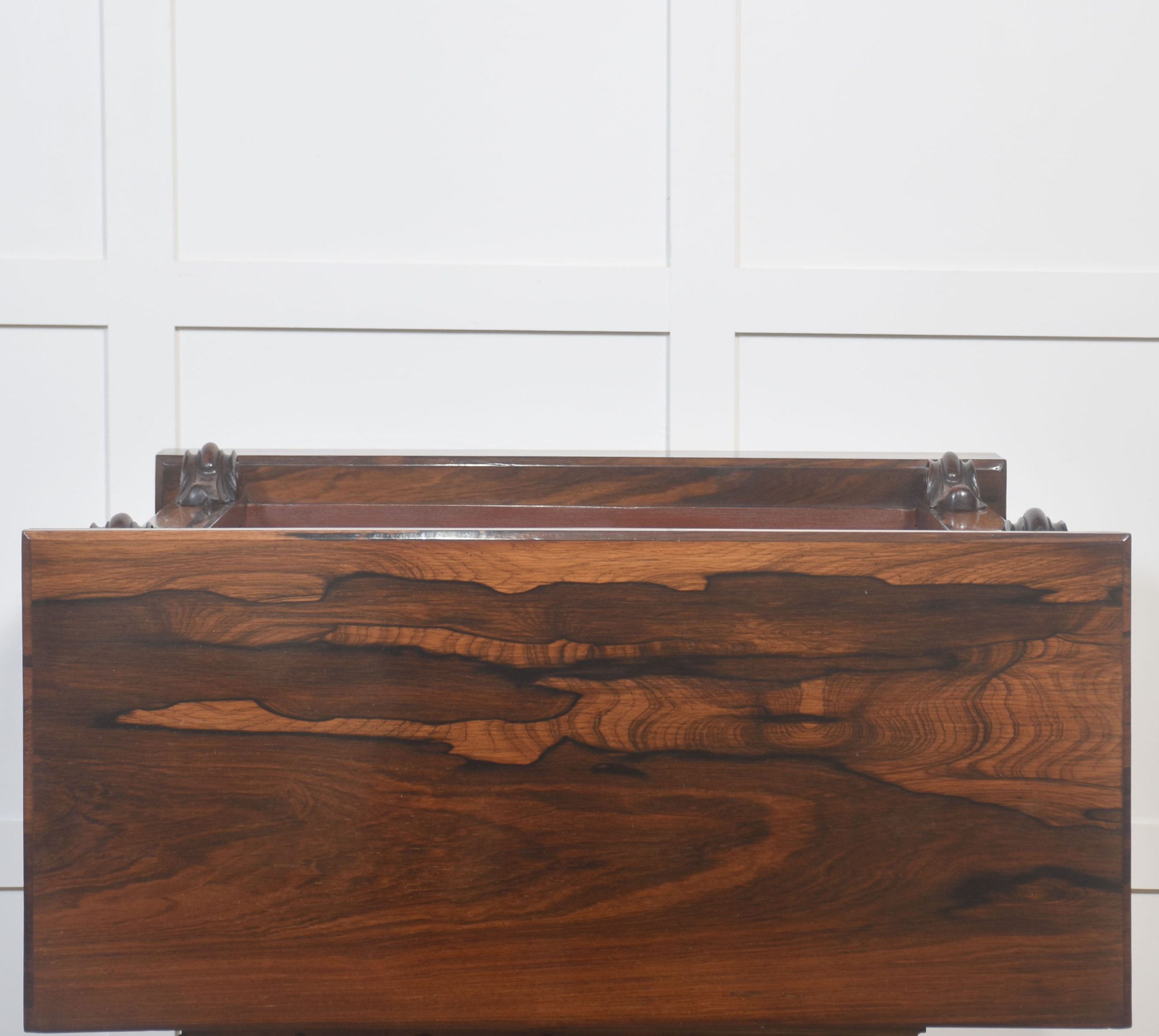 The rosewood is of notably fine quality, displaying dramatic grain and deep, warm colouration throughout the tops, sides, and bases. The polished finish enhances the natural figuring of the timber, giving the pair a refined yet substantial character. The interiors retain a complementary tone, offering an attractive contrast to the exterior framing.