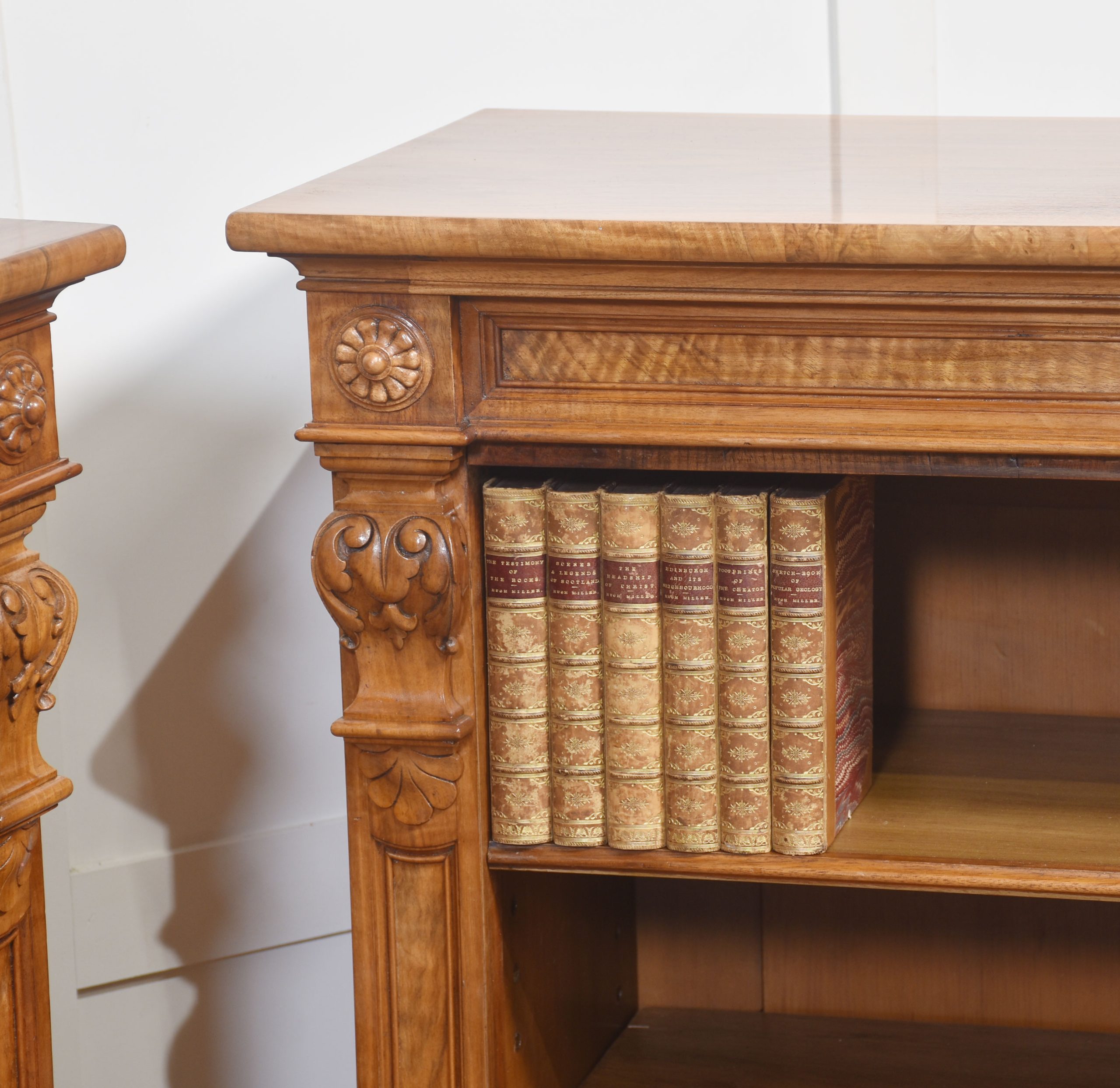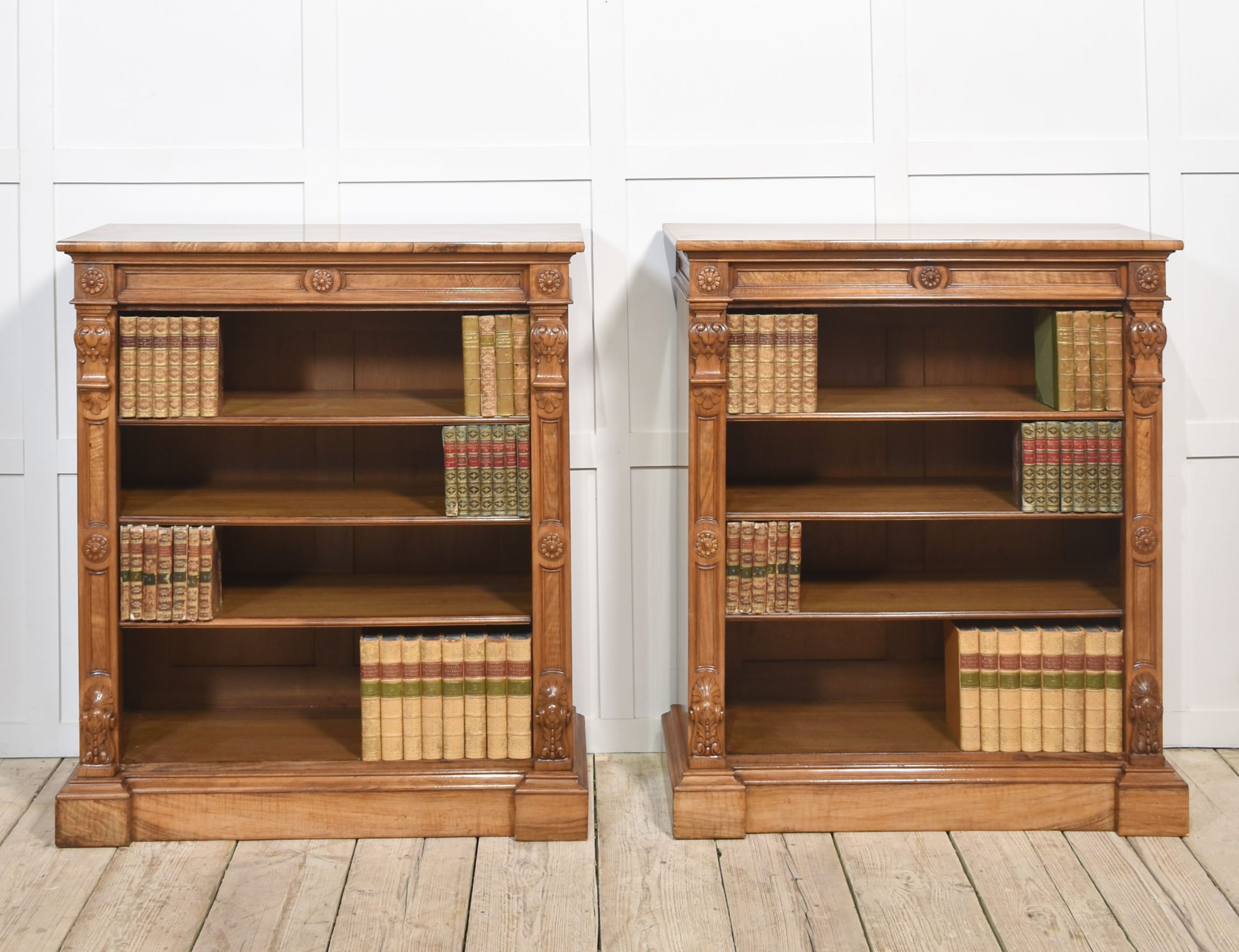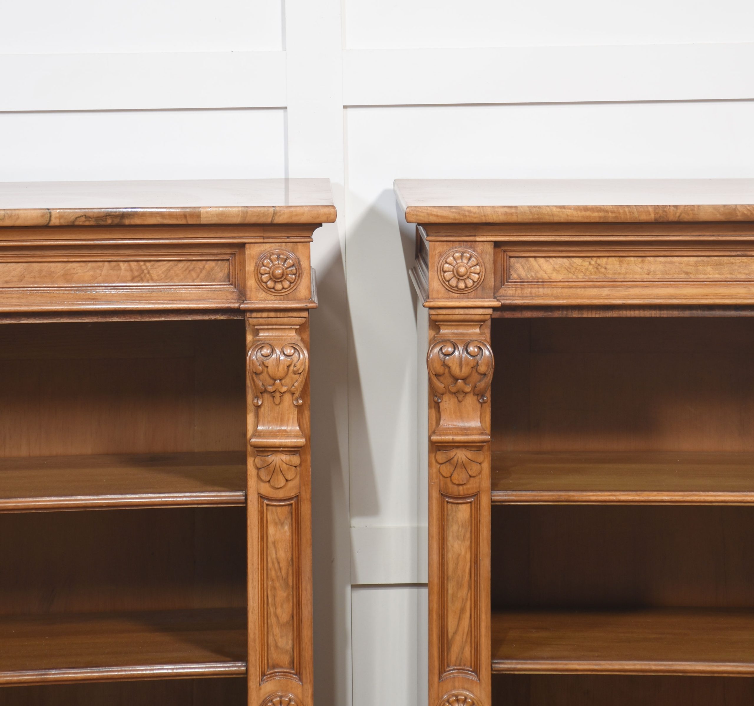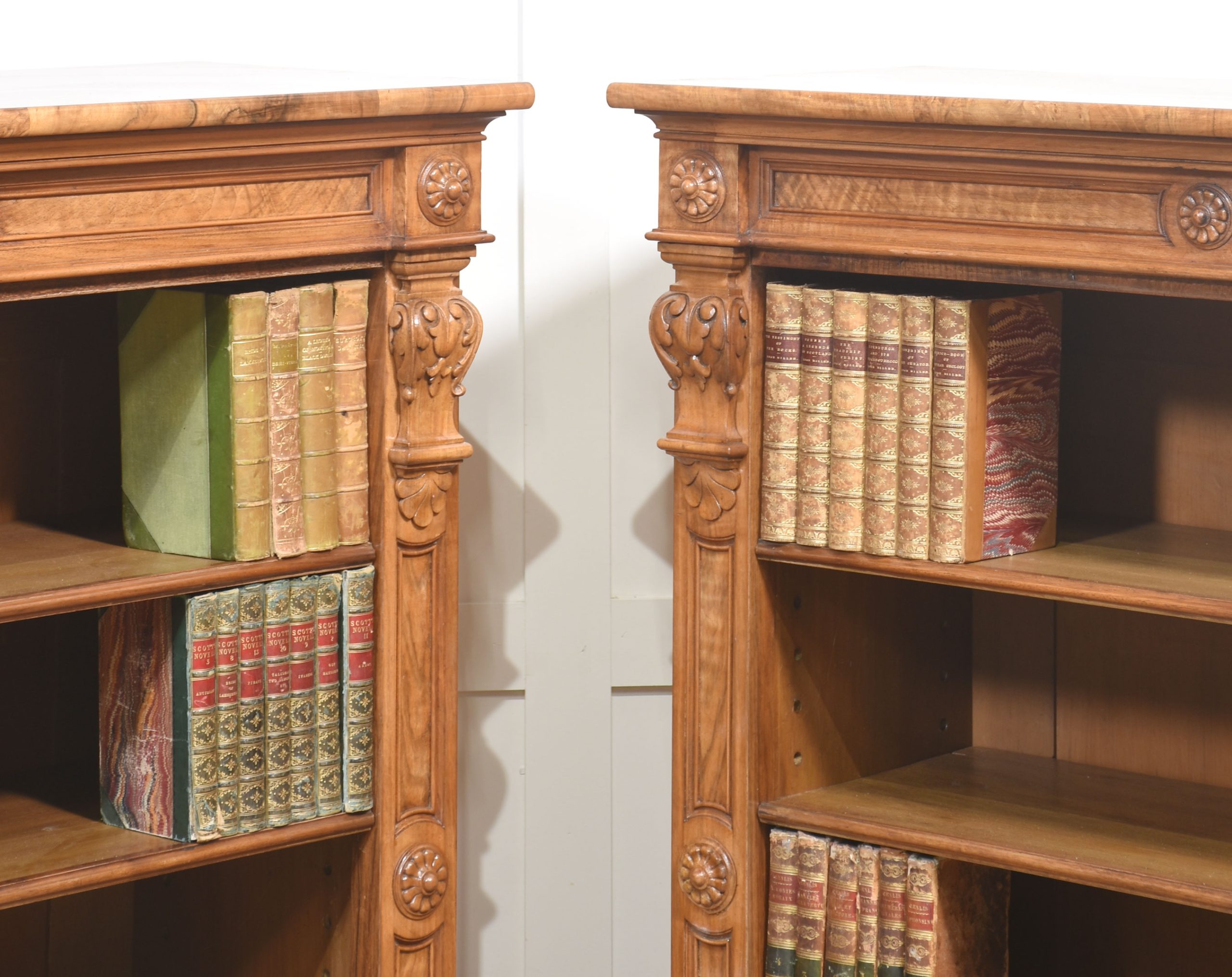 Pair of 19th-century walnut open bookcases, the rectangular well-figured tops to the carved freeze, above the adjustable shelved interior, flanked by carved columns, all raised on plinth base.