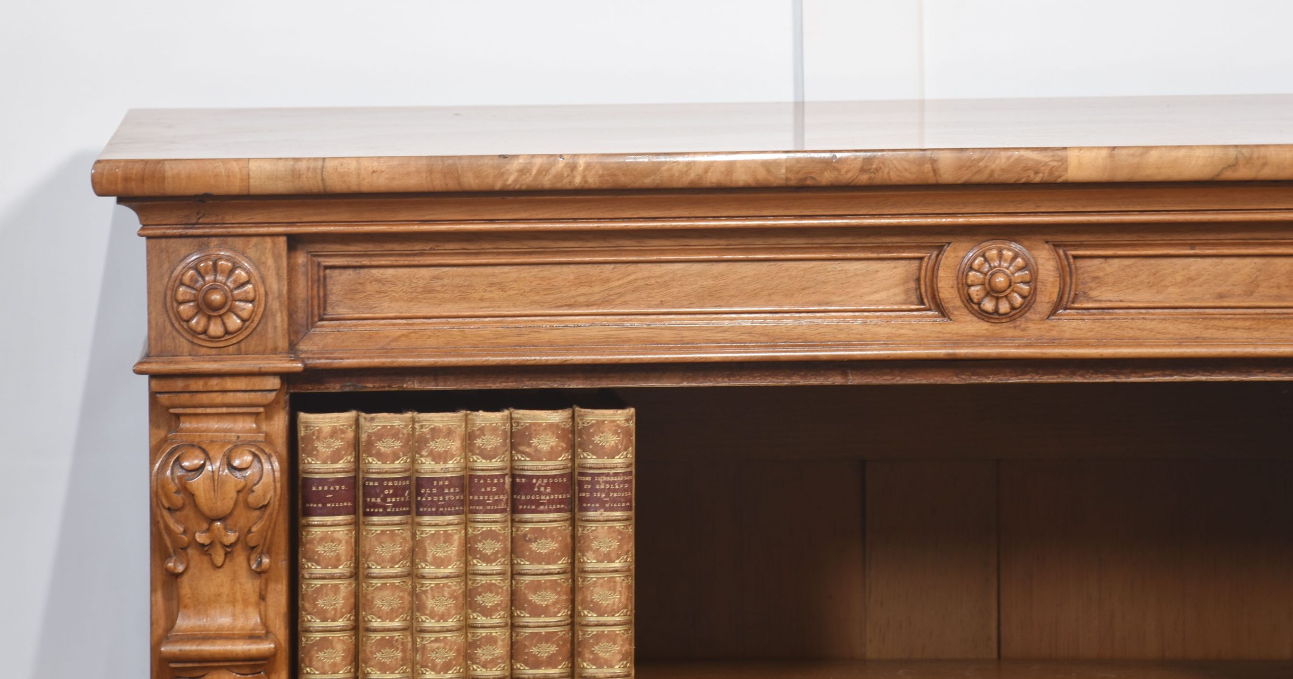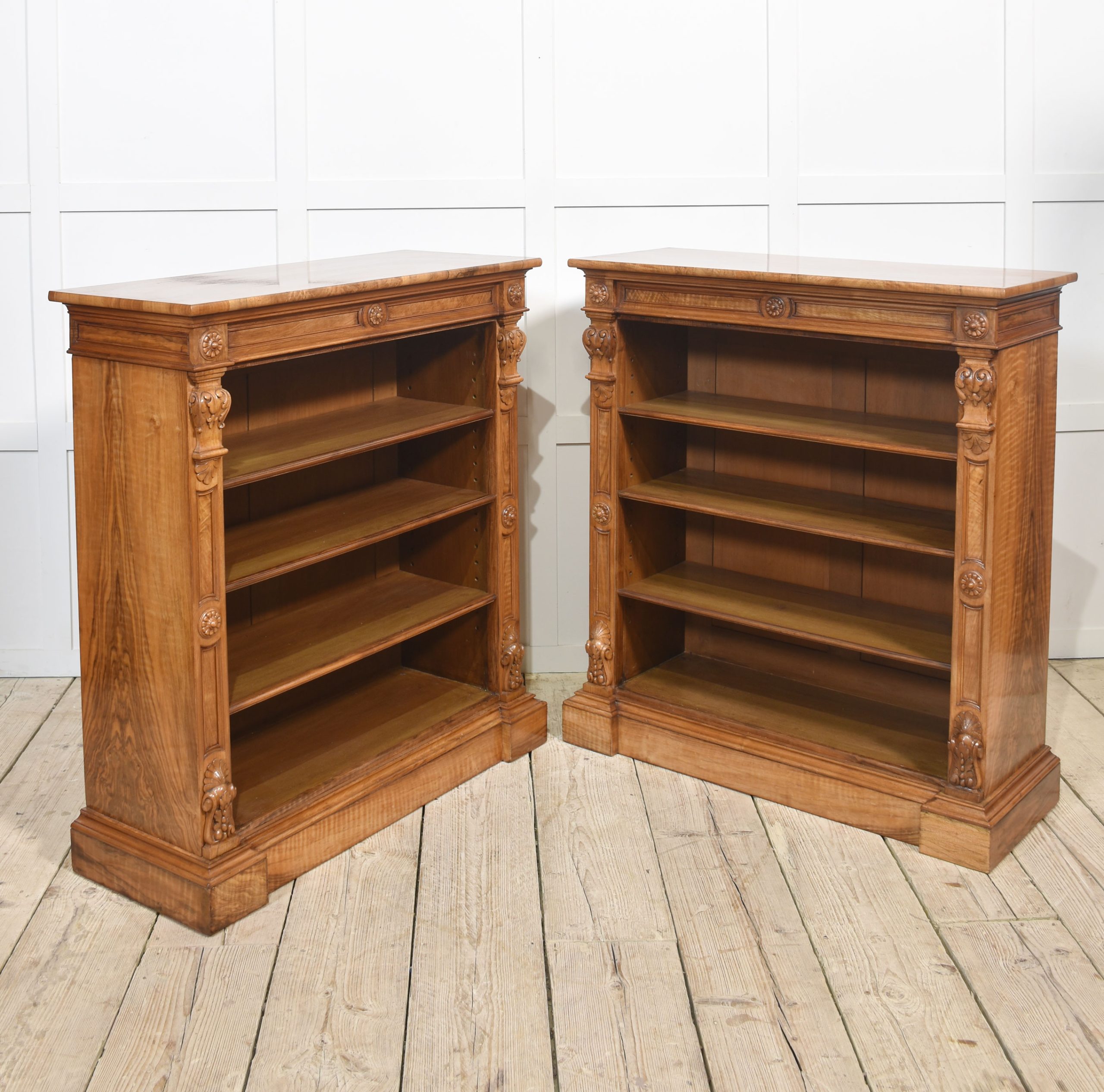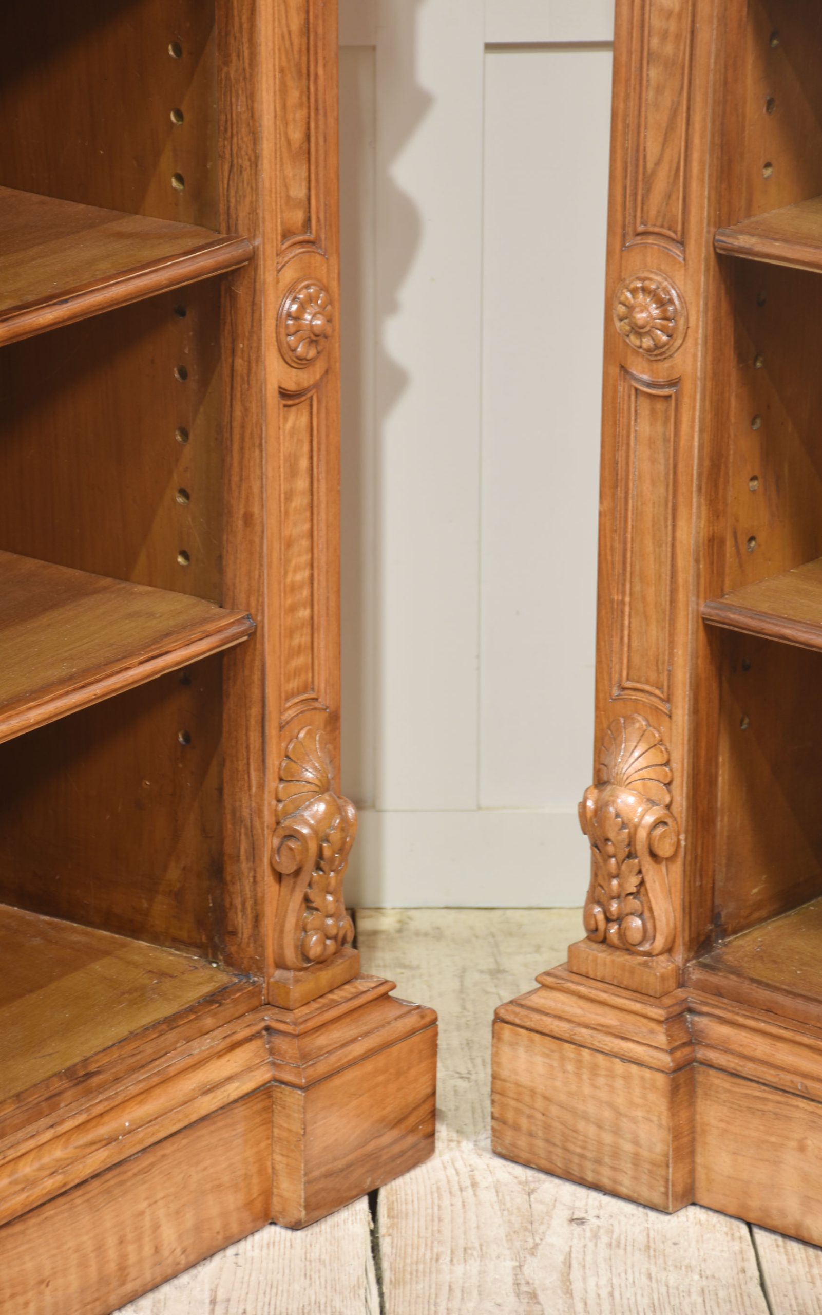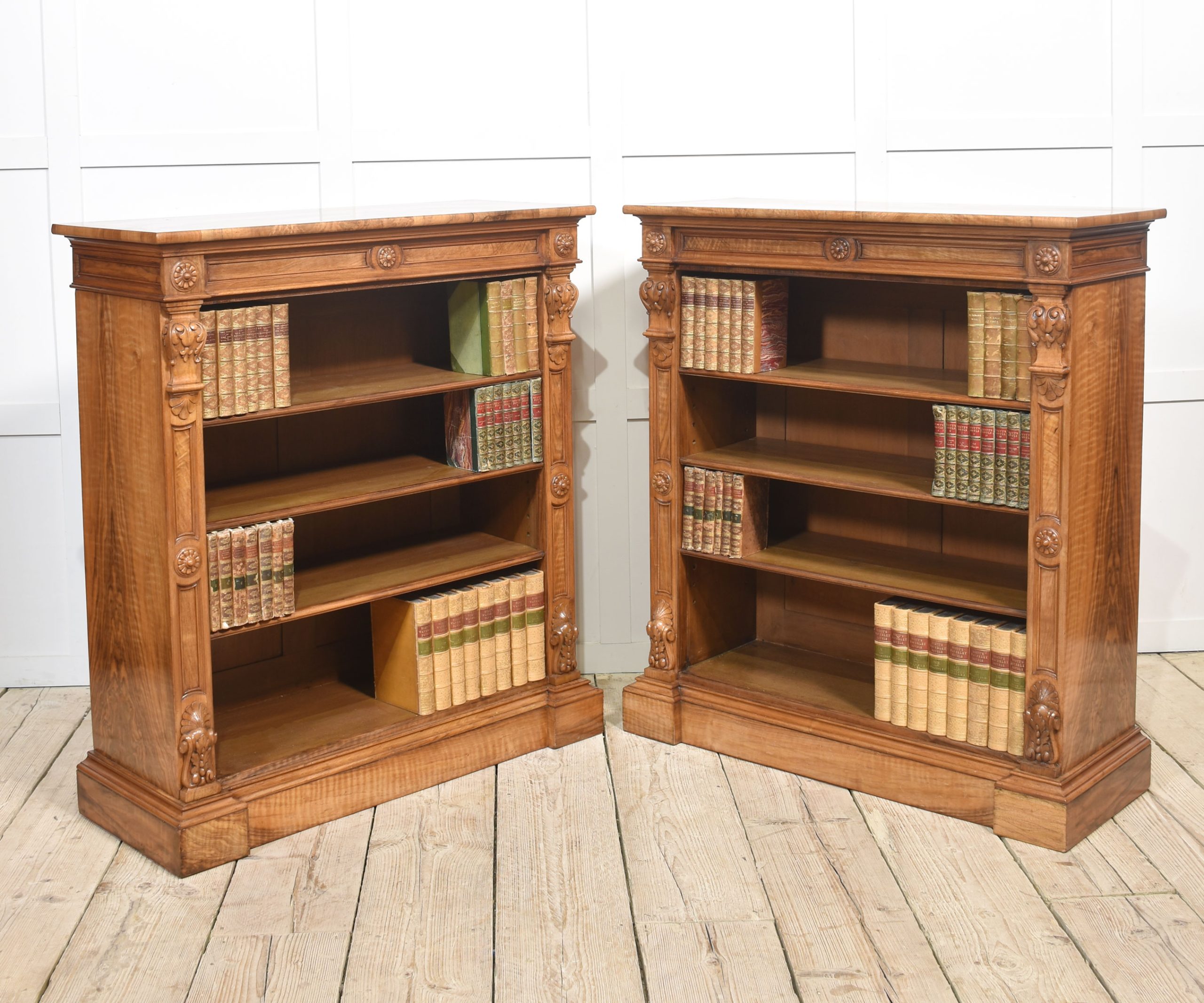 Pair of 19th-century walnut open bookcases, the rectangular well-figured tops to the carved freeze, above the adjustable shelved interior, flanked by carved columns, all raised on plinth base.