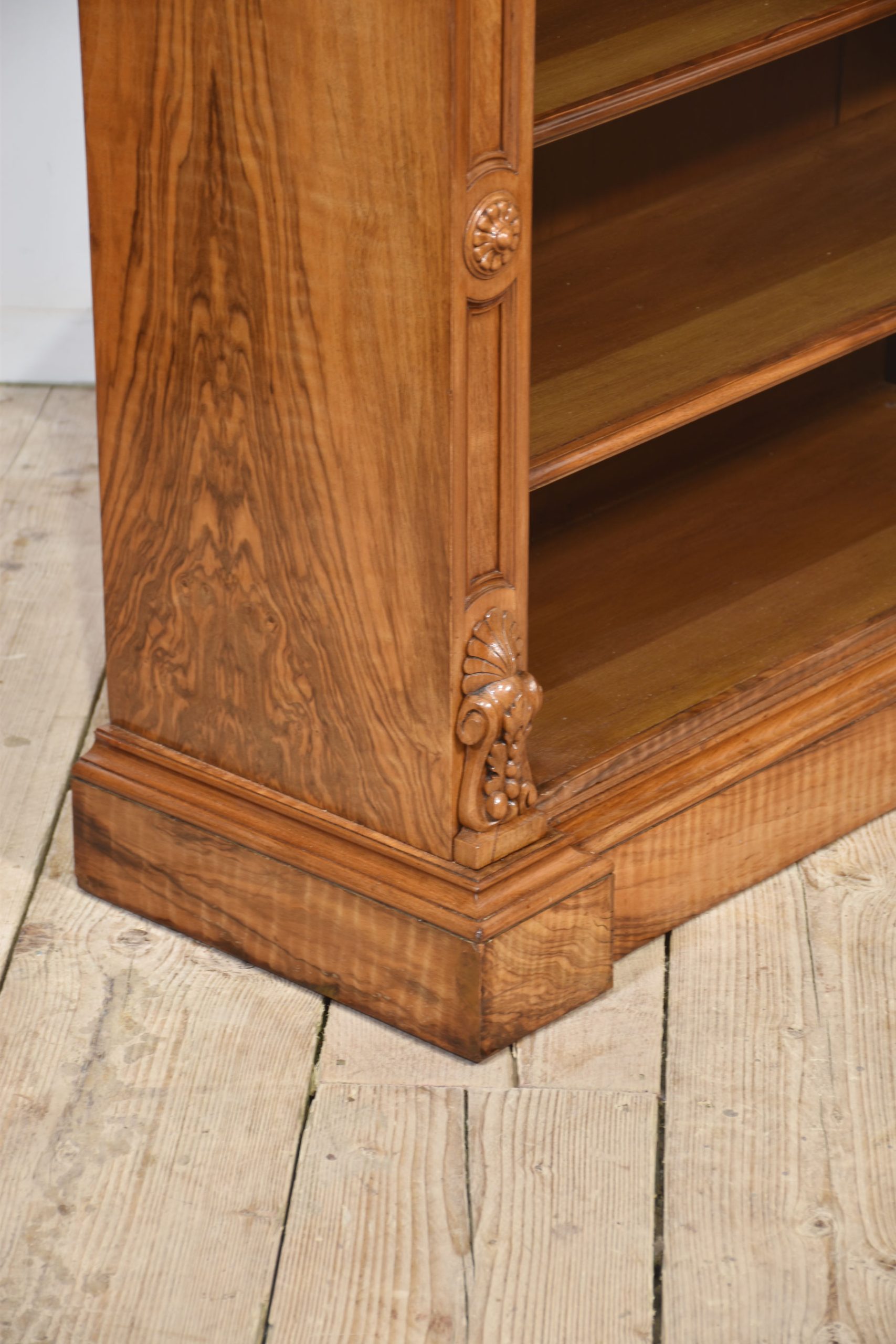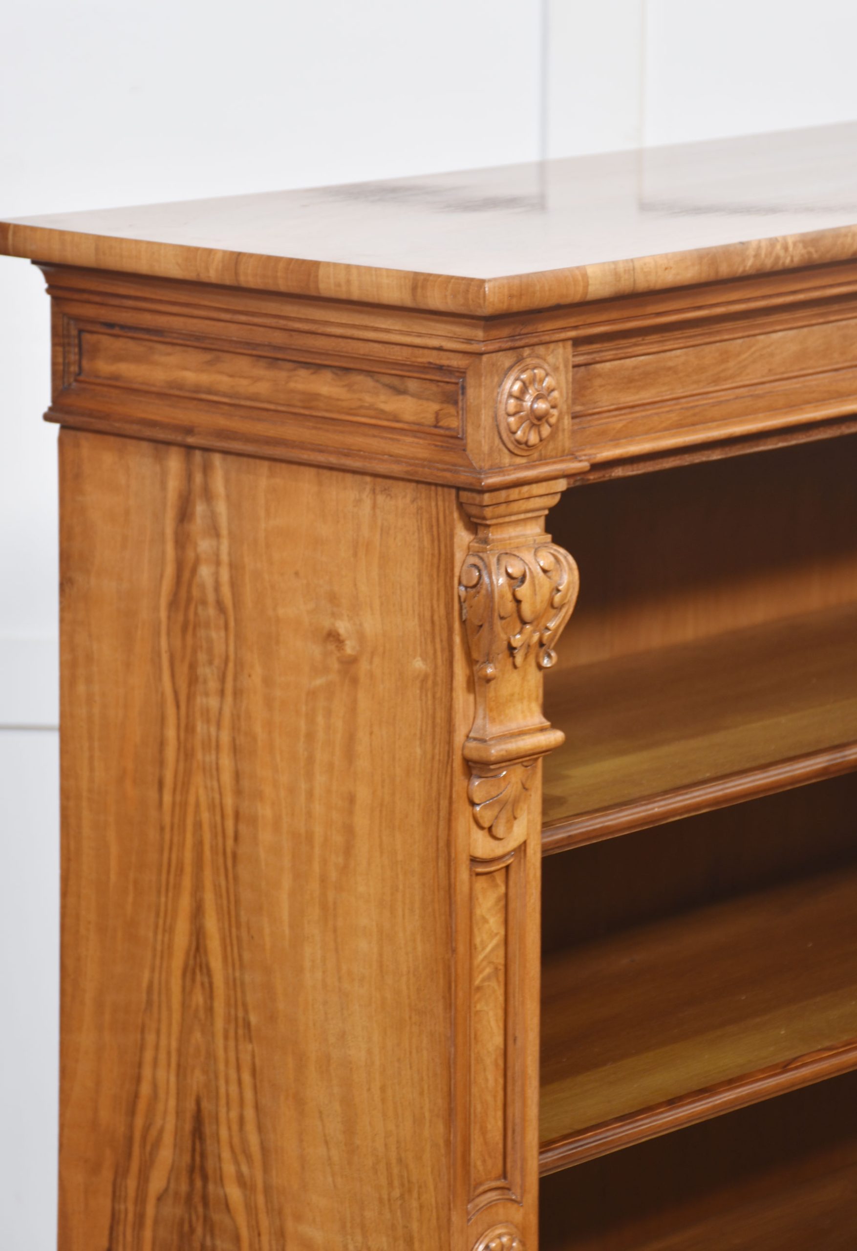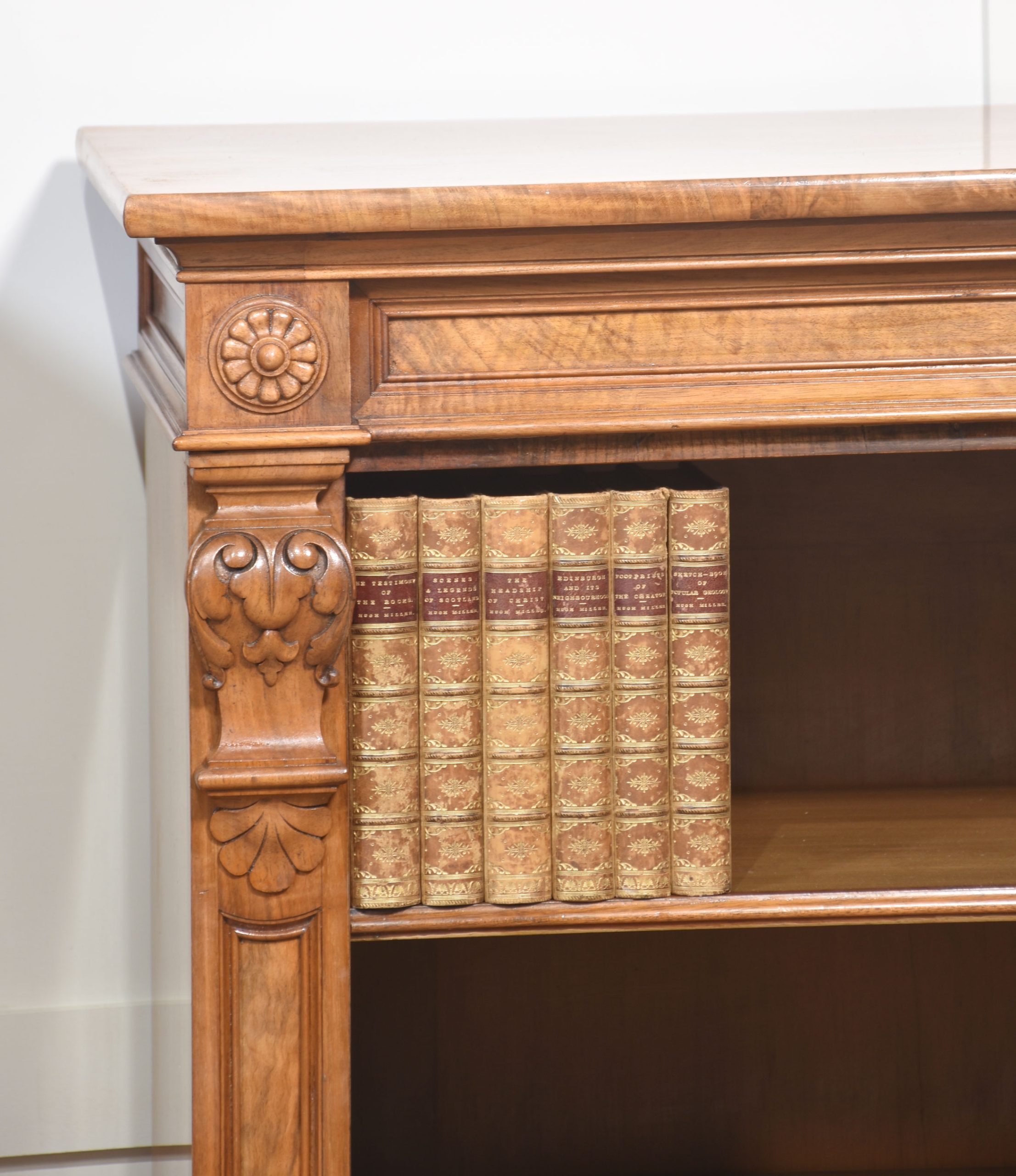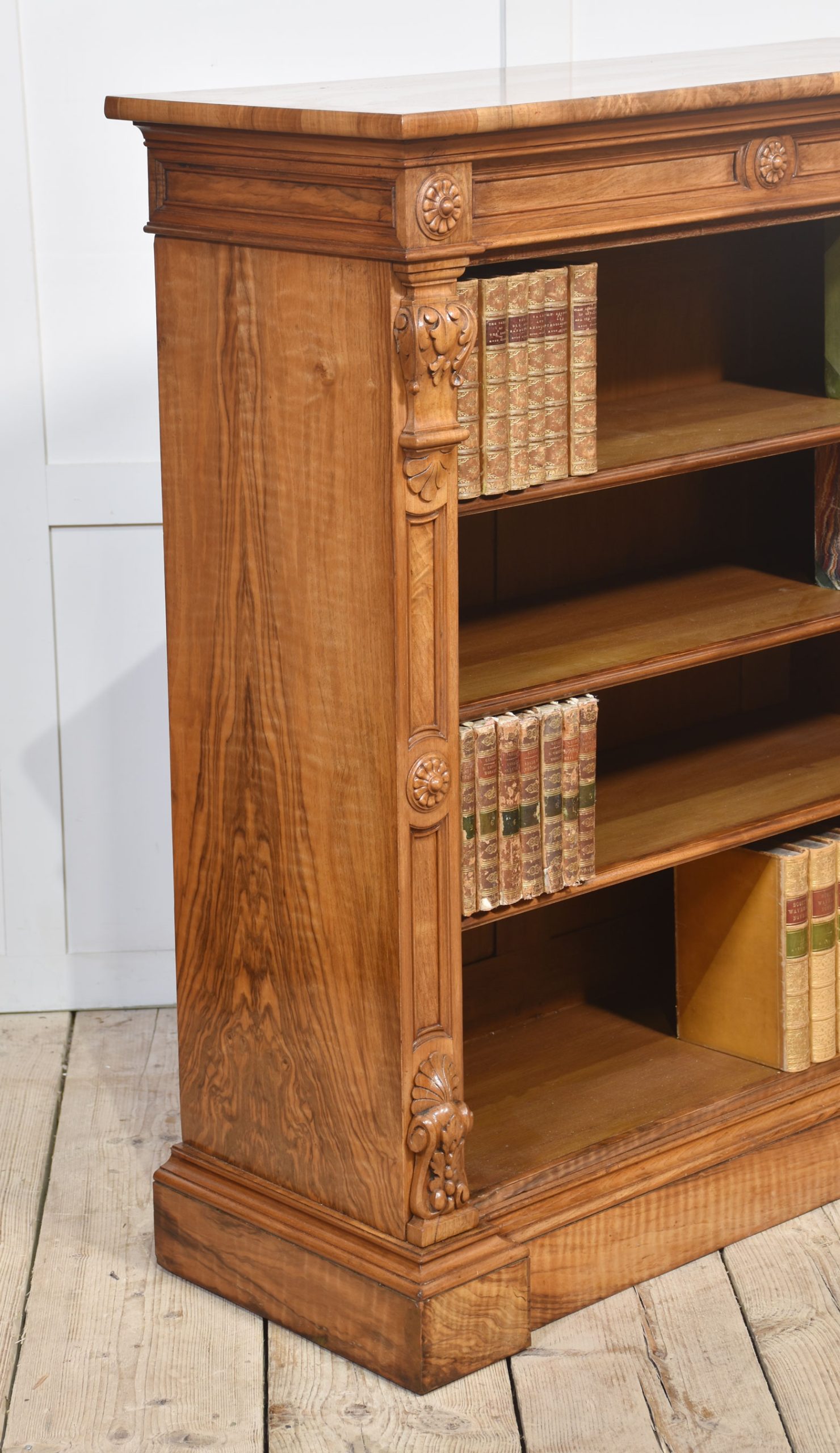 Pair of 19th-century walnut open bookcases, the rectangular well-figured tops to the carved freeze, above the adjustable shelved interior, flanked by carved columns, all raised on plinth base.