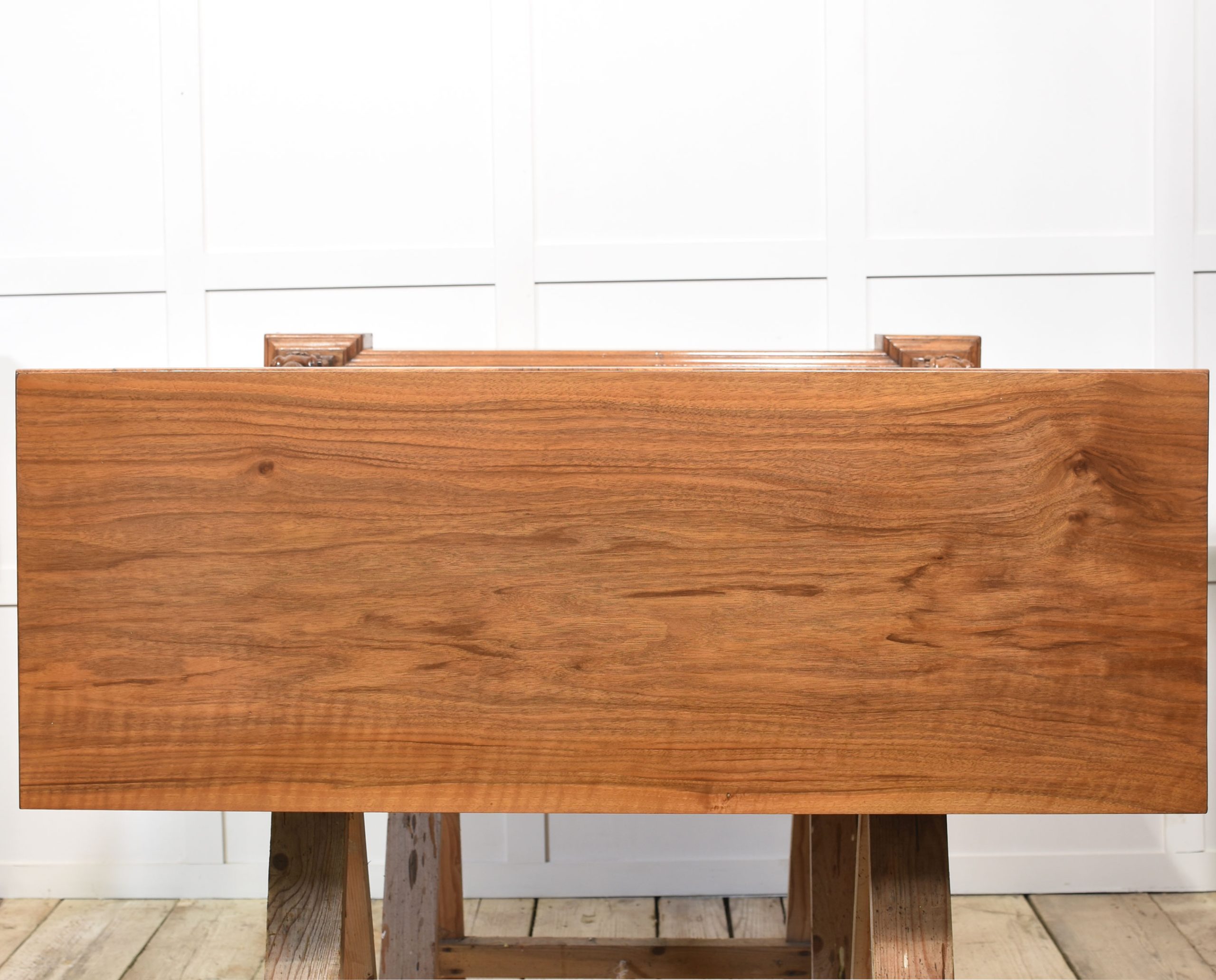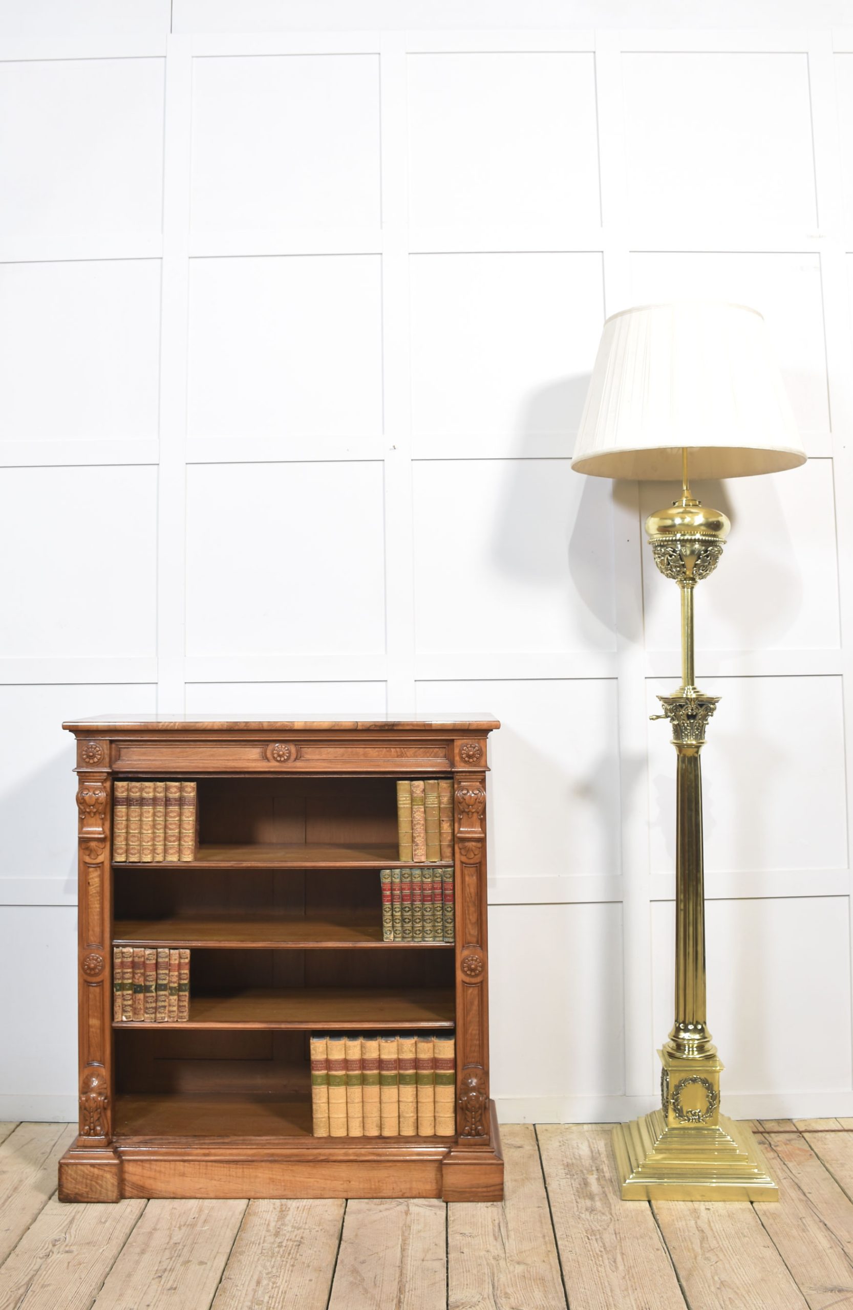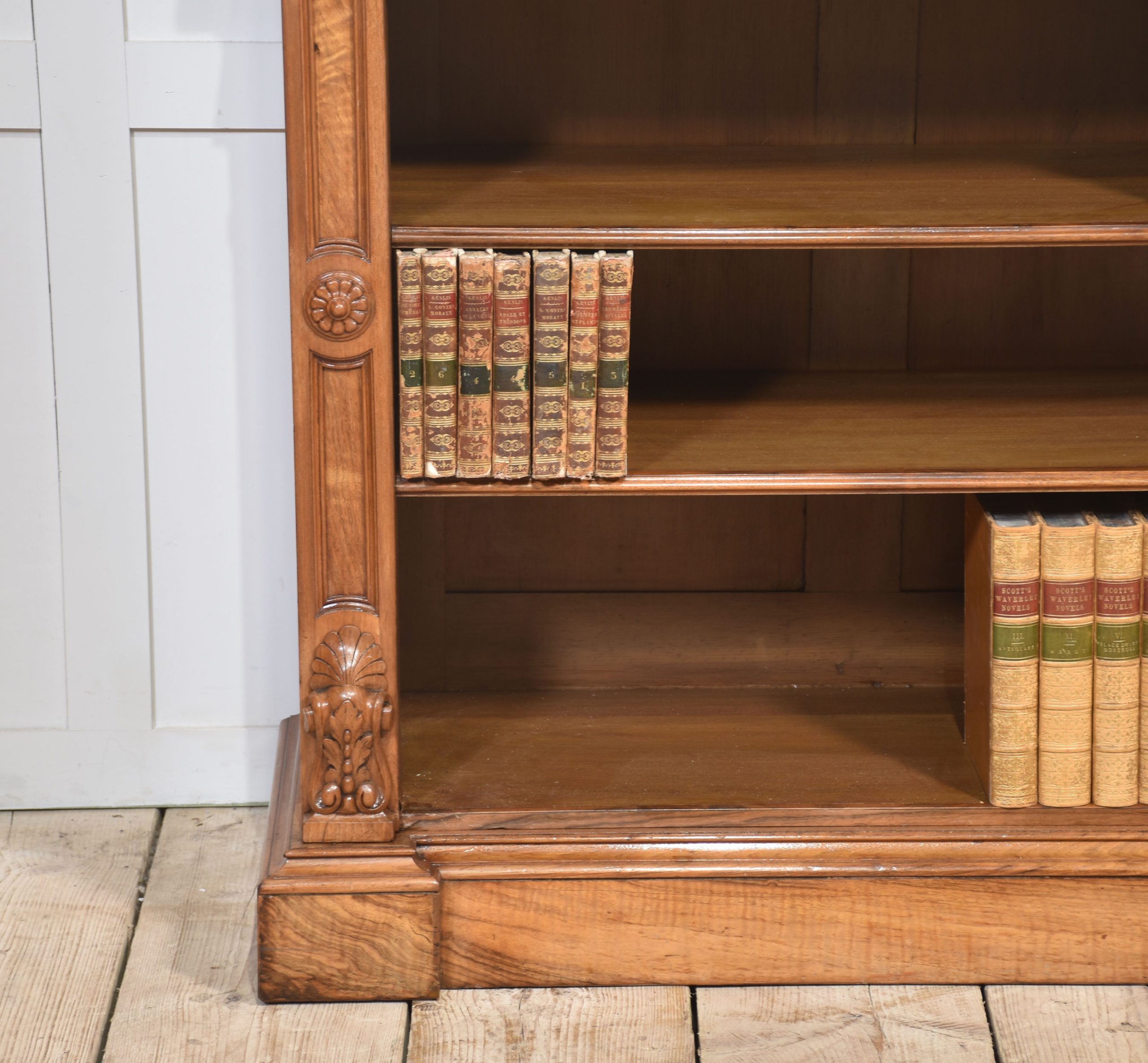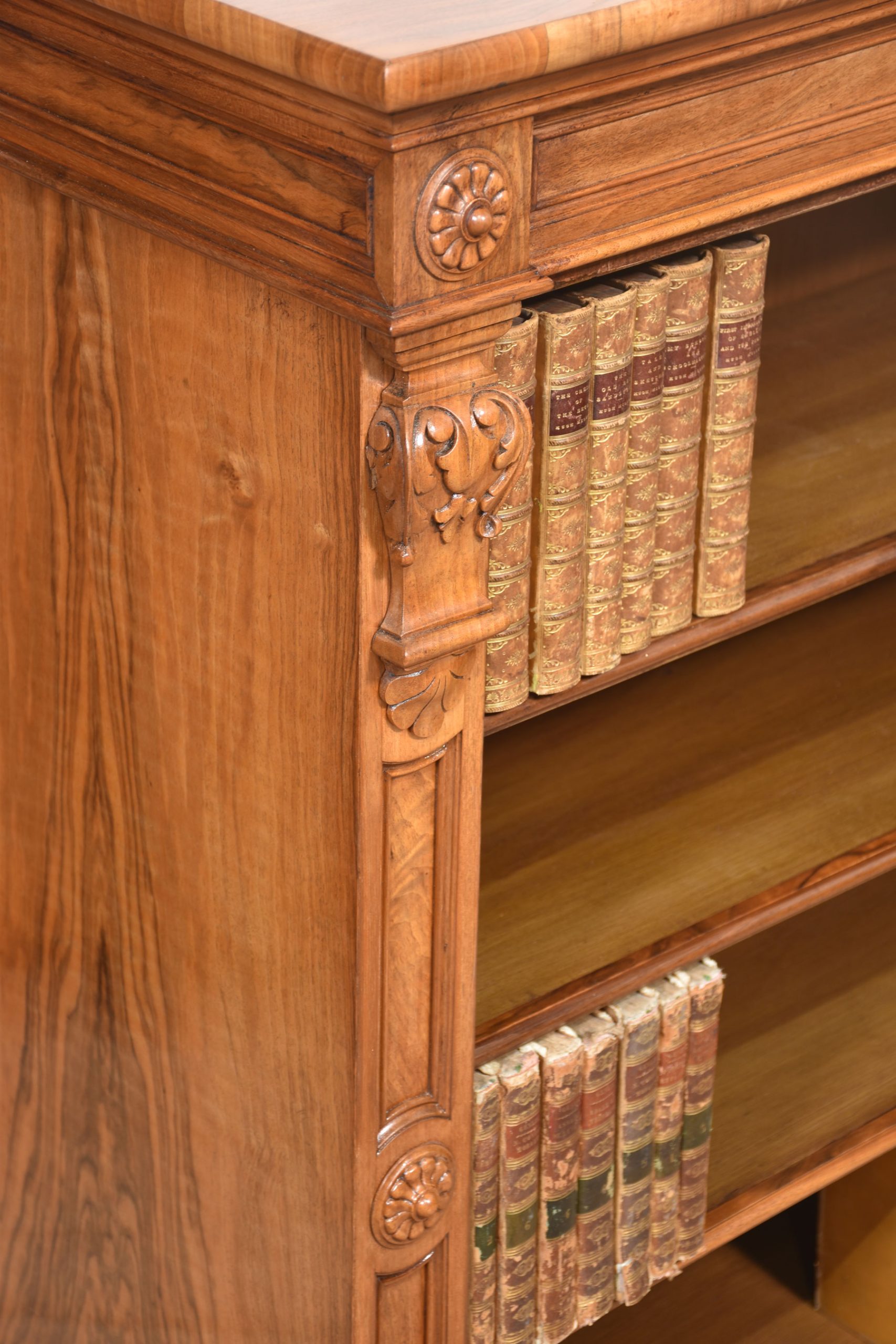 Pair of 19th-century walnut open bookcases, the rectangular well-figured tops to the carved freeze, above the adjustable shelved interior, flanked by carved columns, all raised on plinth base.