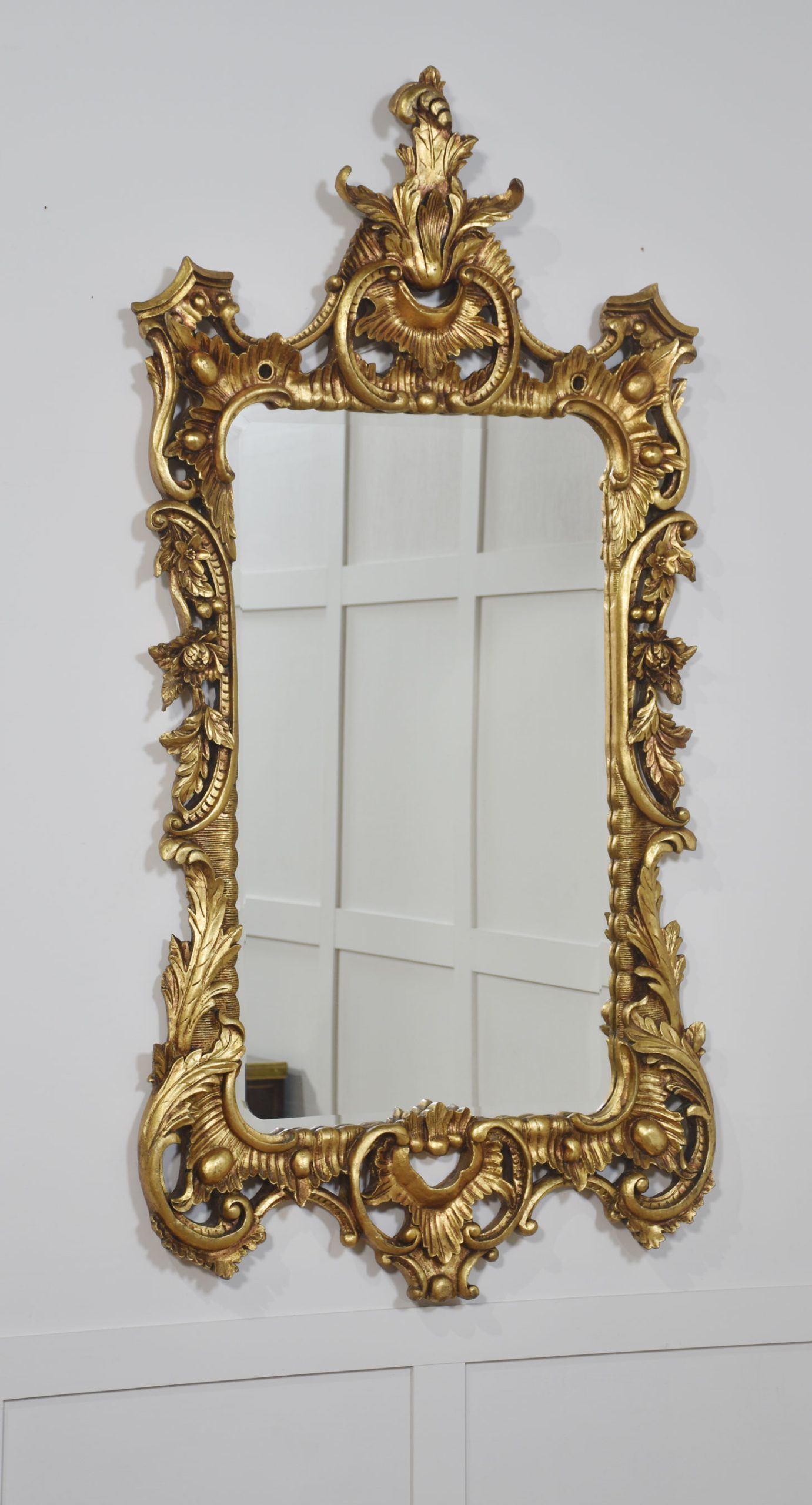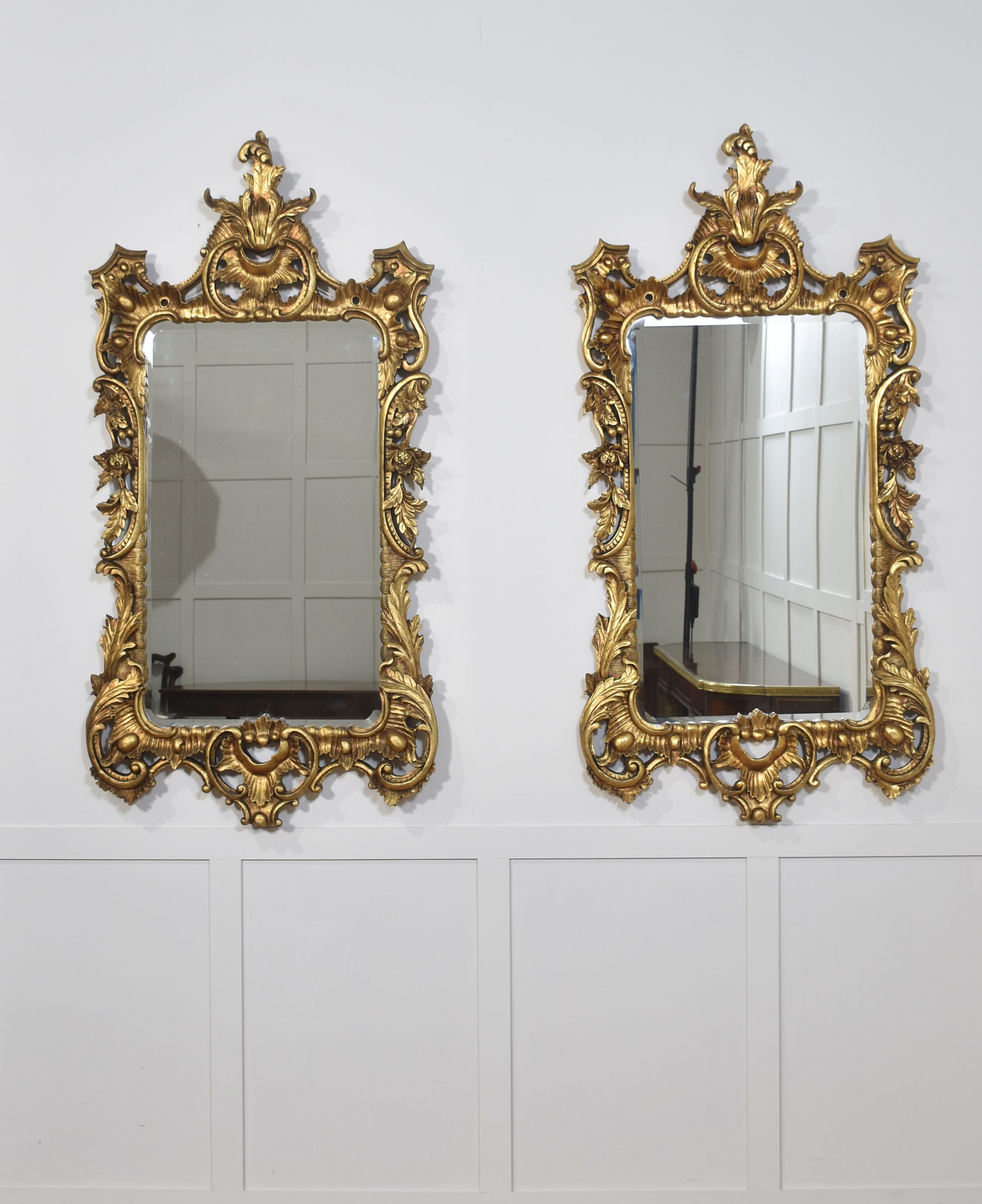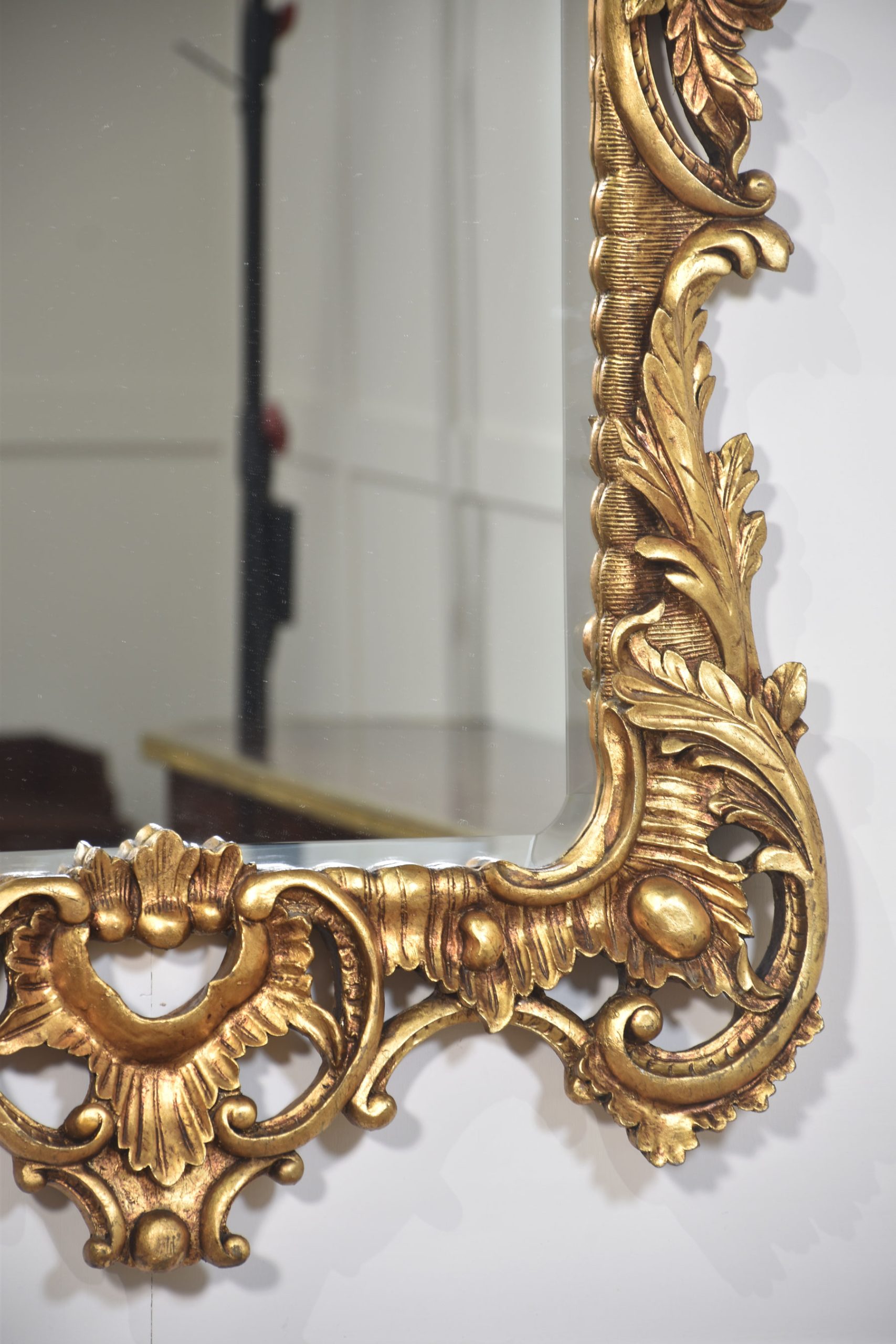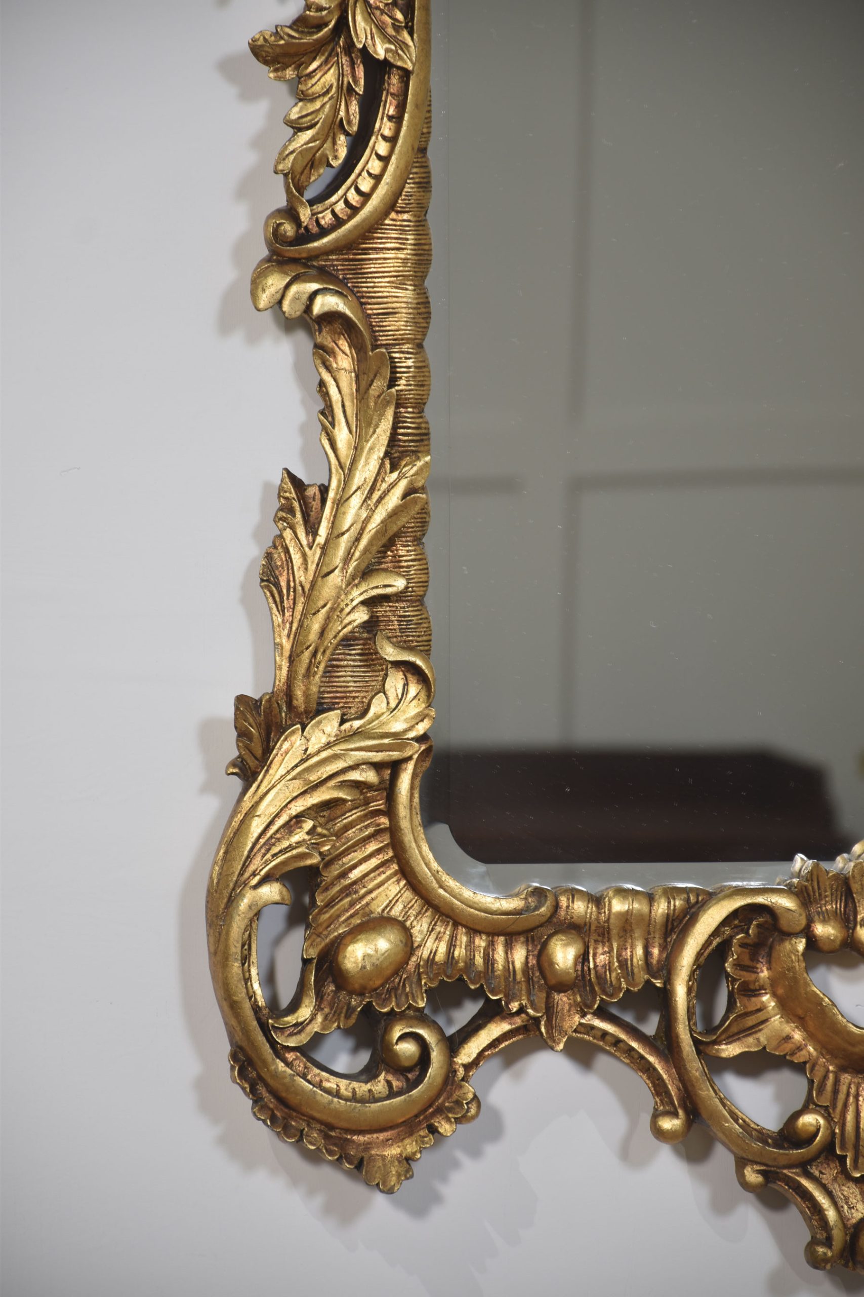 Pair of baroque-style carved and gilded mirrors. The original rectangular mirror plate is surrounded by a carved and pierced frame with rocaille work and scrolls, surmounted by scrolling acanthus leaves.