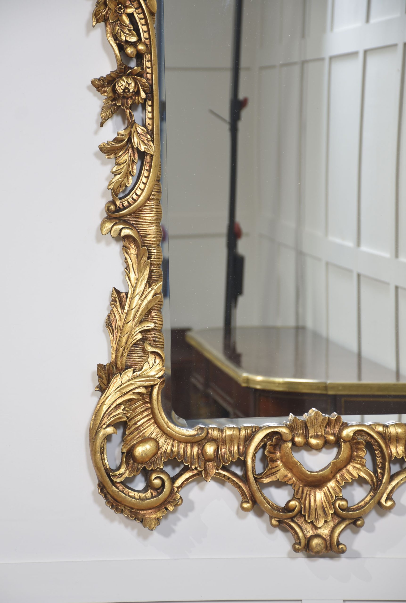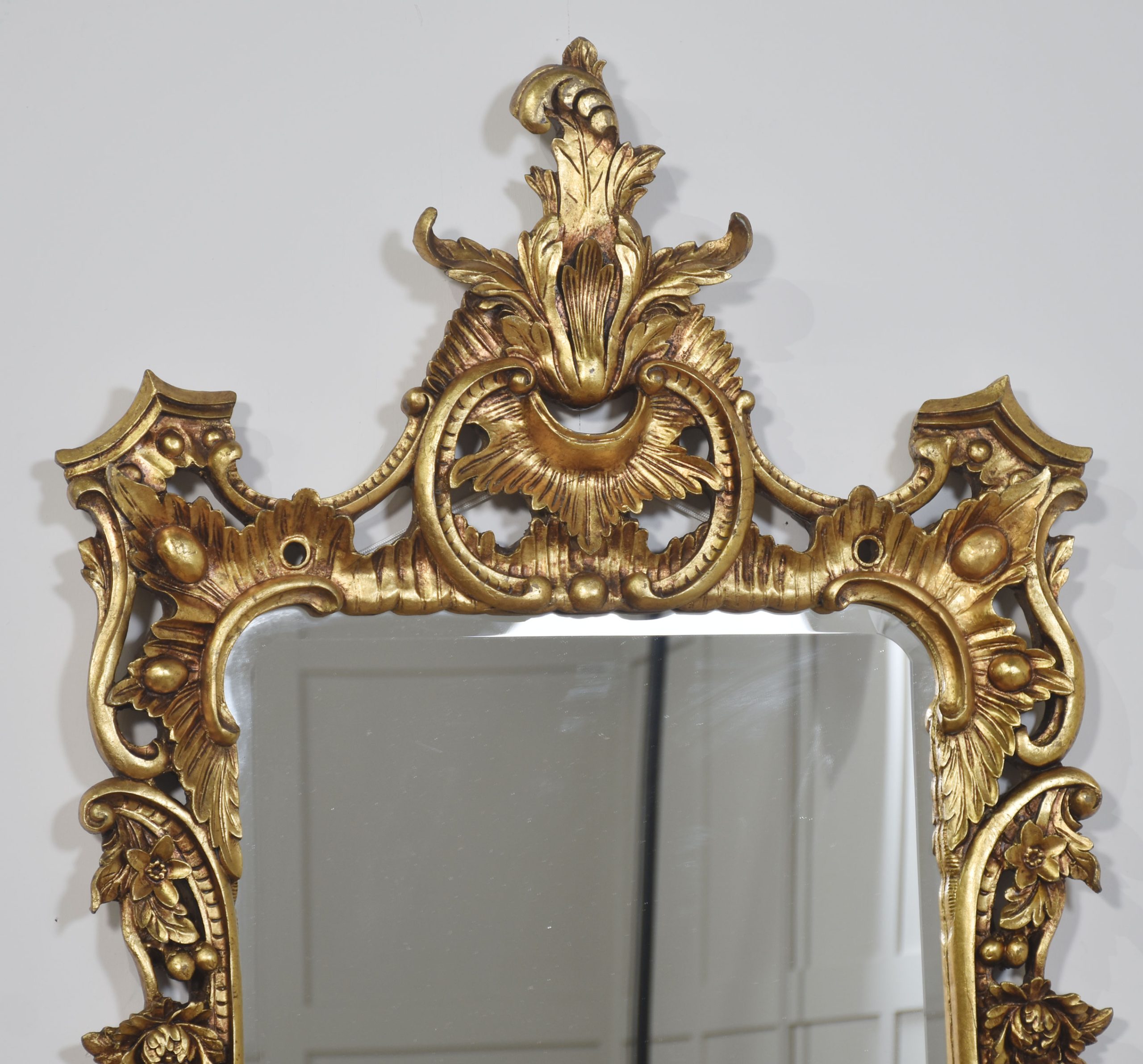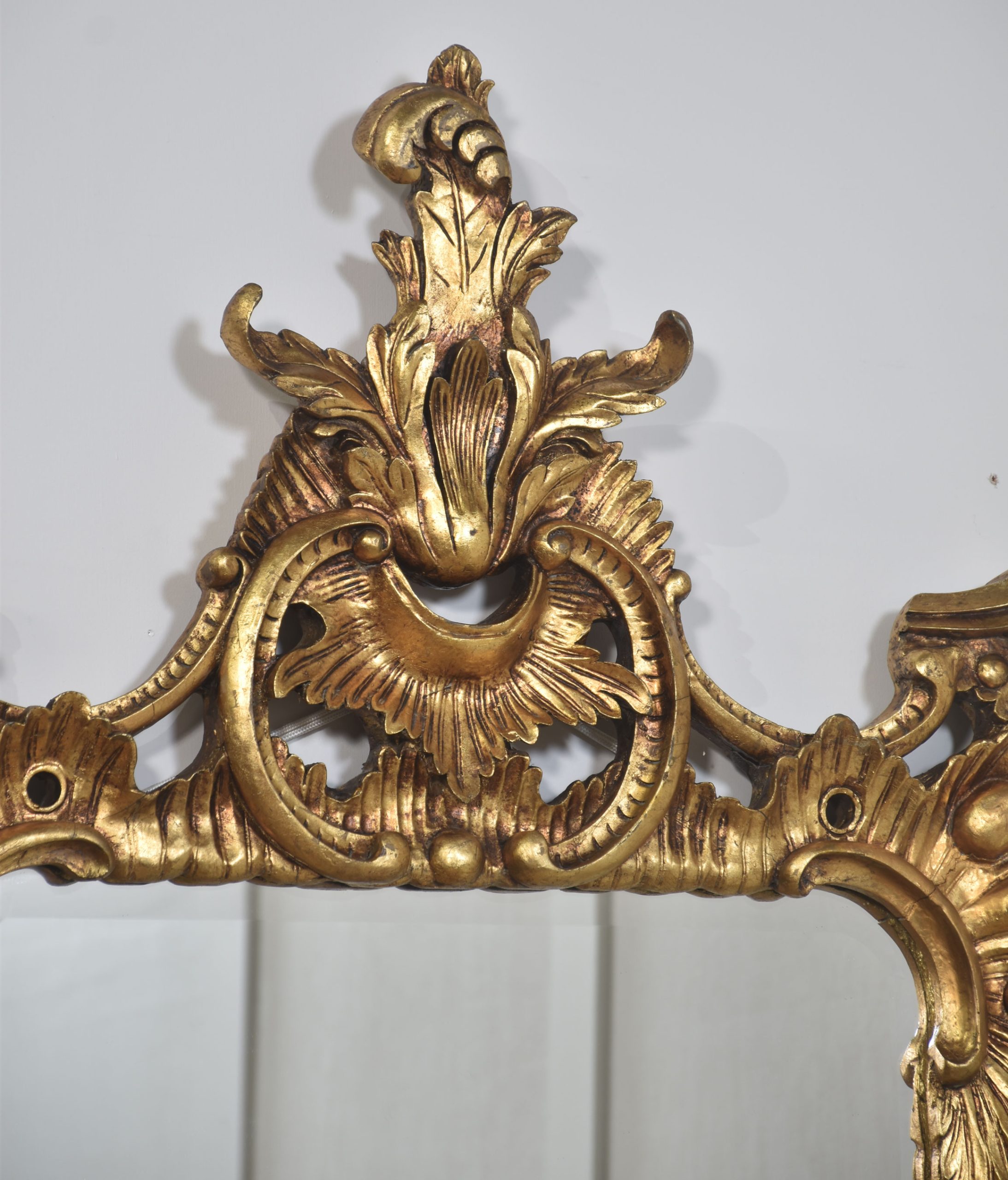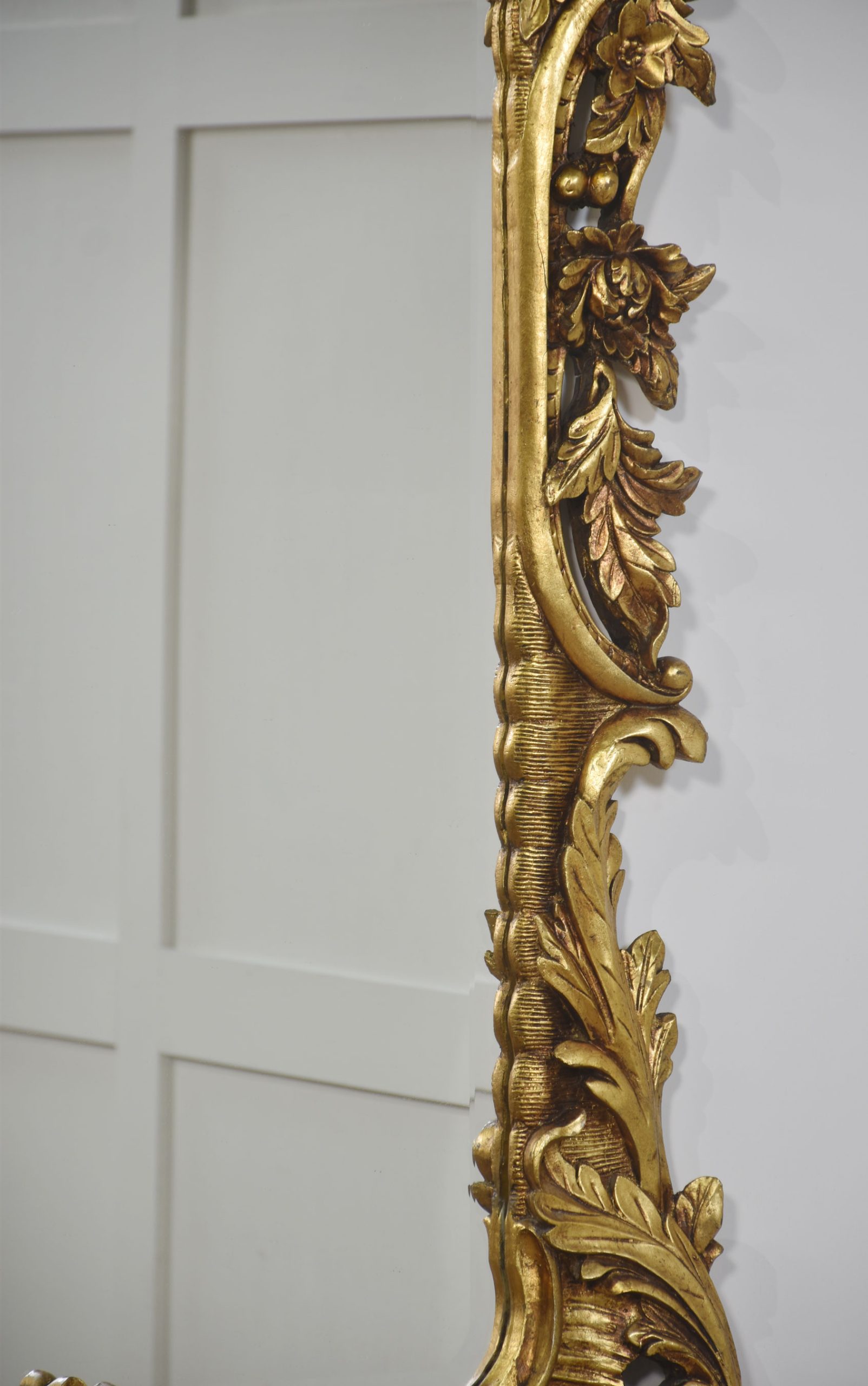 Pair of baroque-style carved and gilded mirrors. The original rectangular mirror plate is surrounded by a carved and pierced frame with rocaille work and scrolls, surmounted by scrolling acanthus leaves.