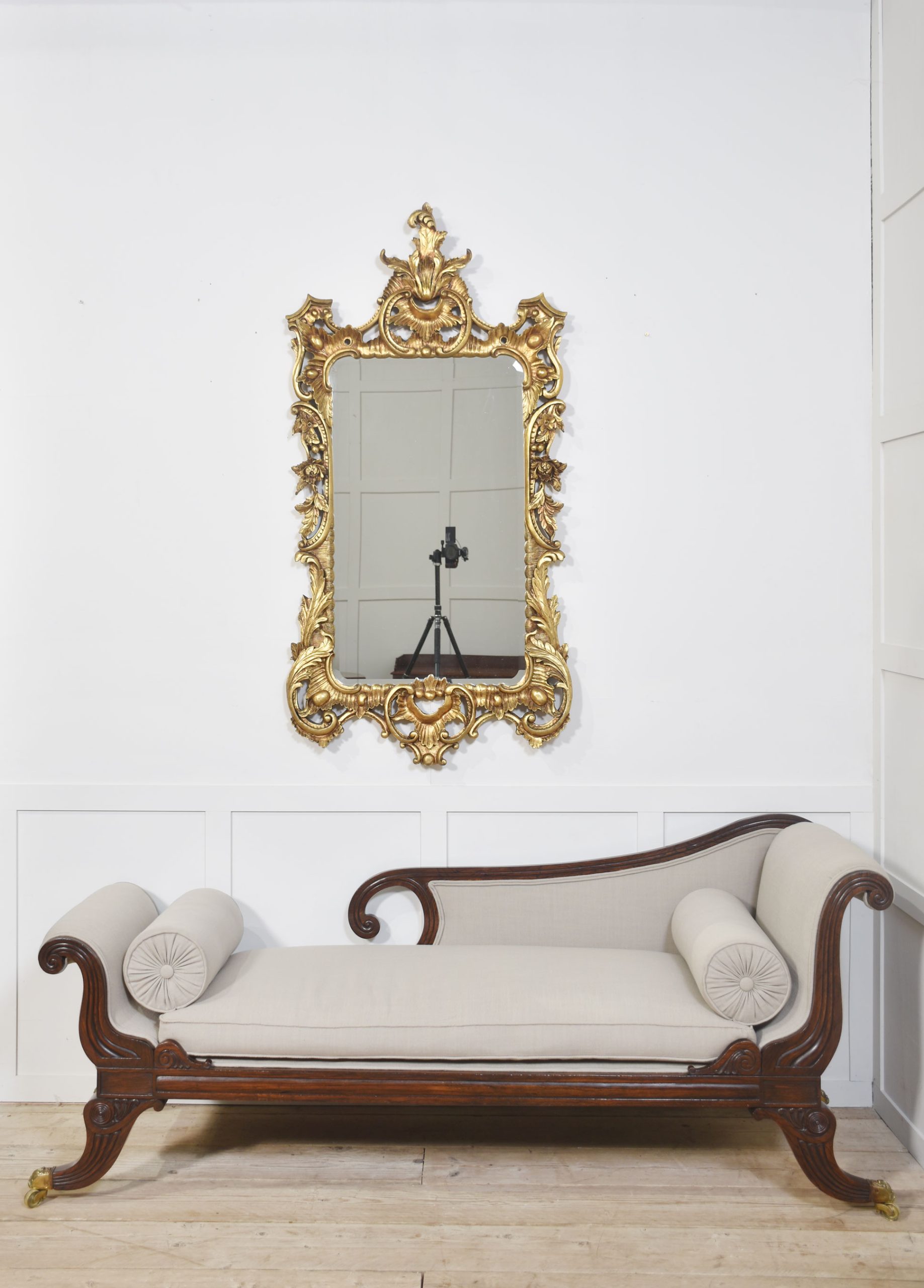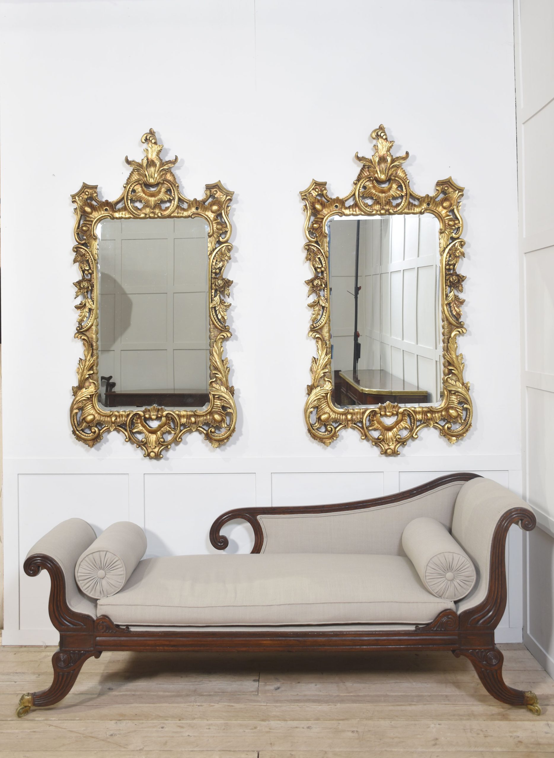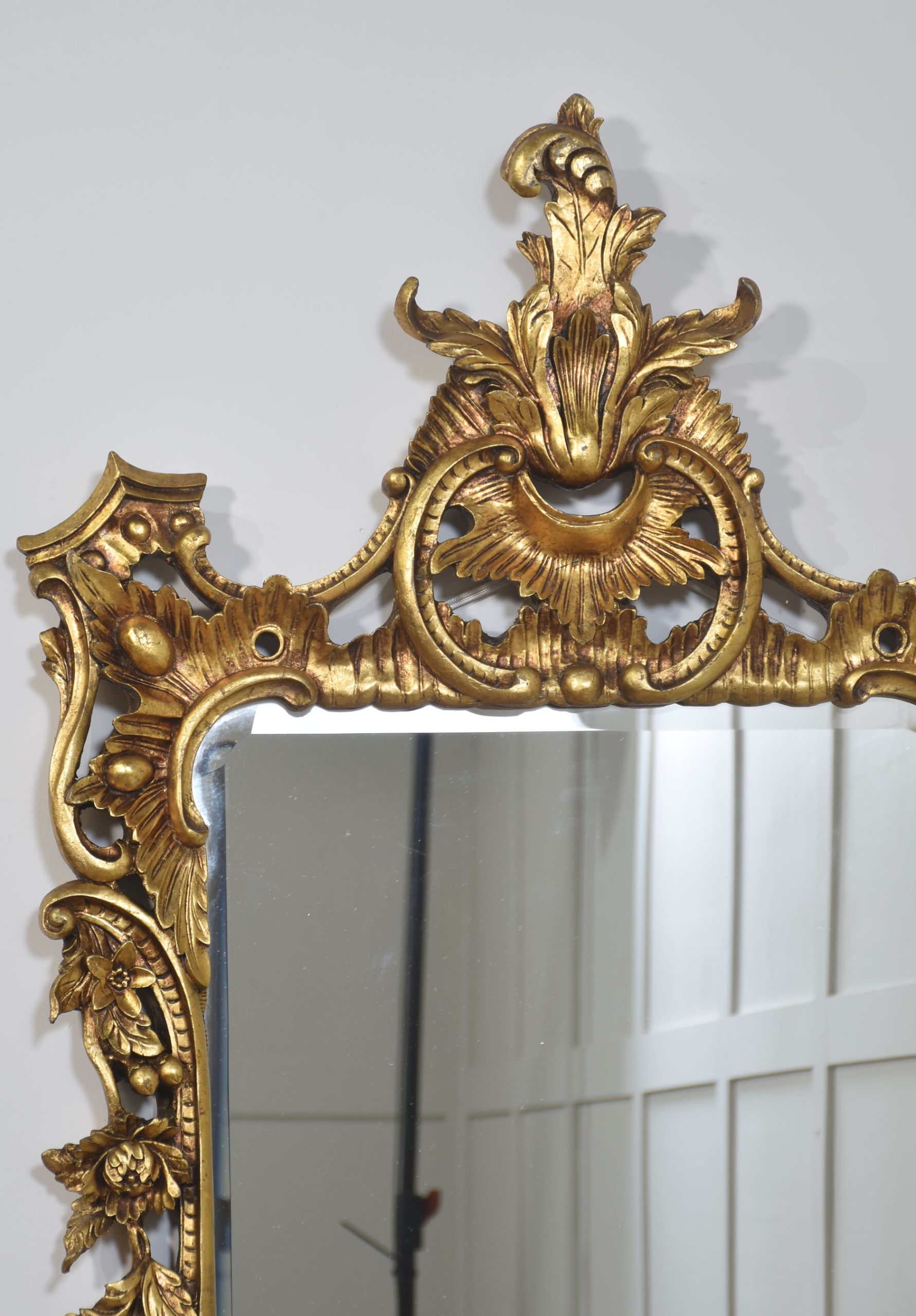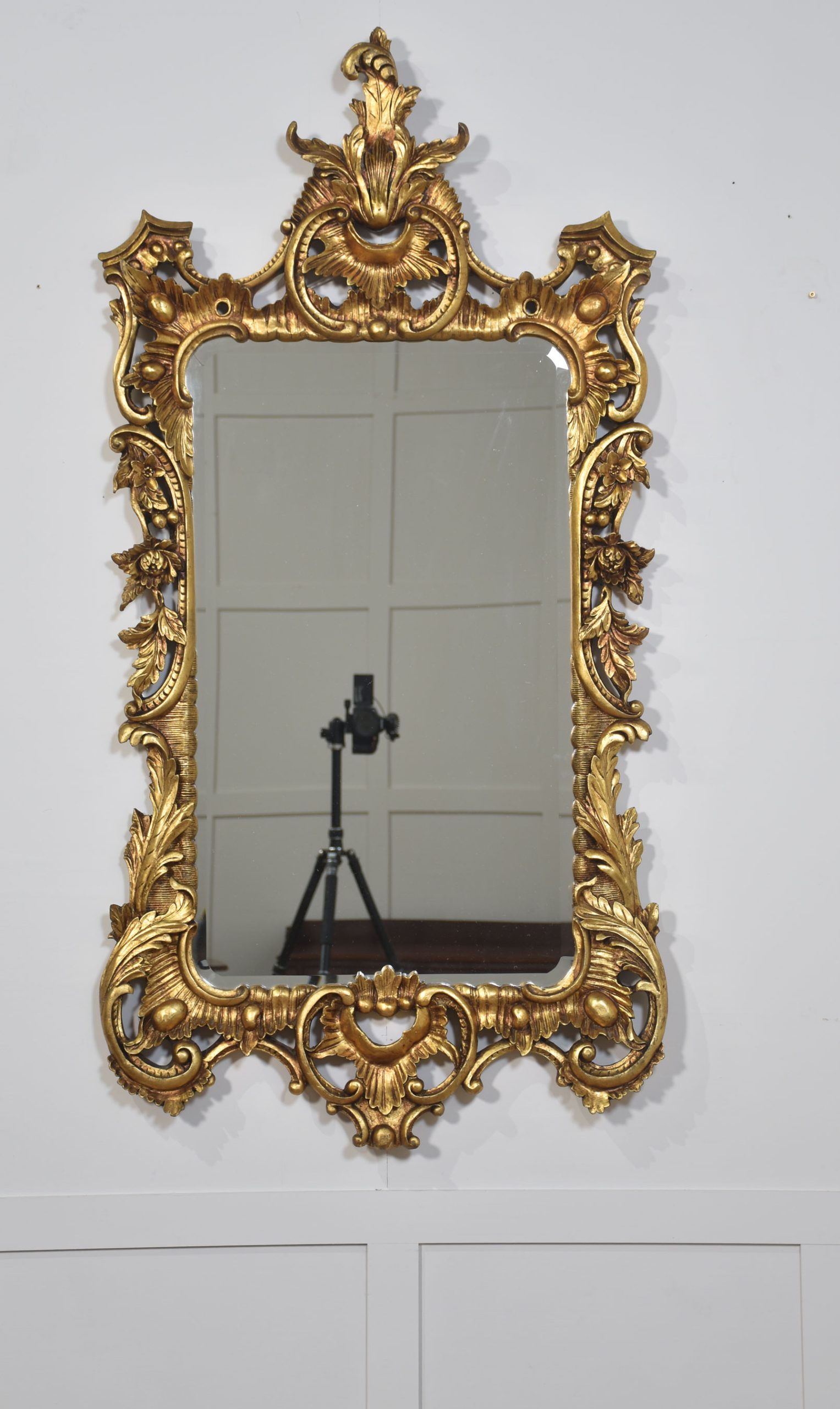 Pair of baroque-style carved and gilded mirrors. The original rectangular mirror plate is surrounded by a carved and pierced frame with rocaille work and scrolls, surmounted by scrolling acanthus leaves.