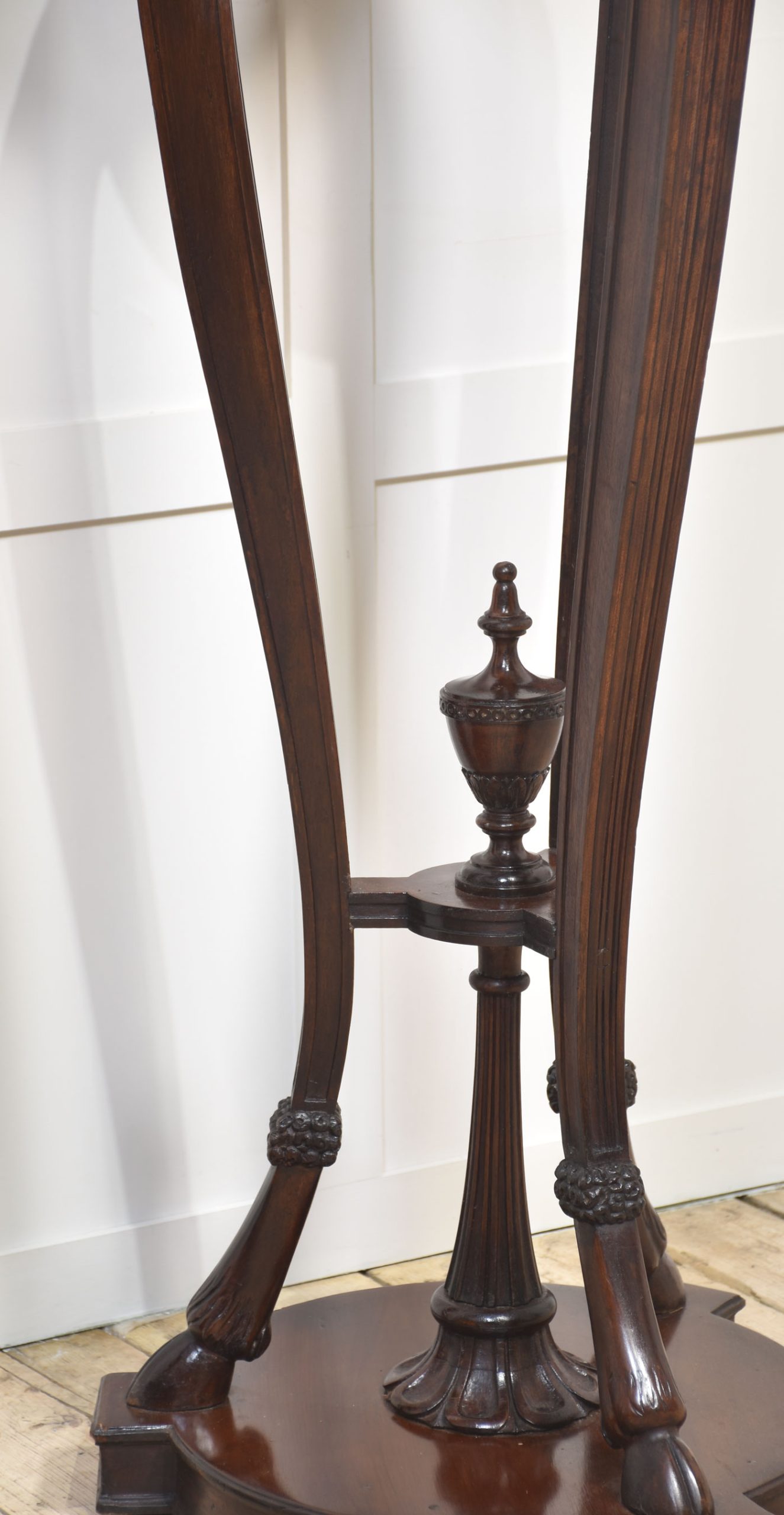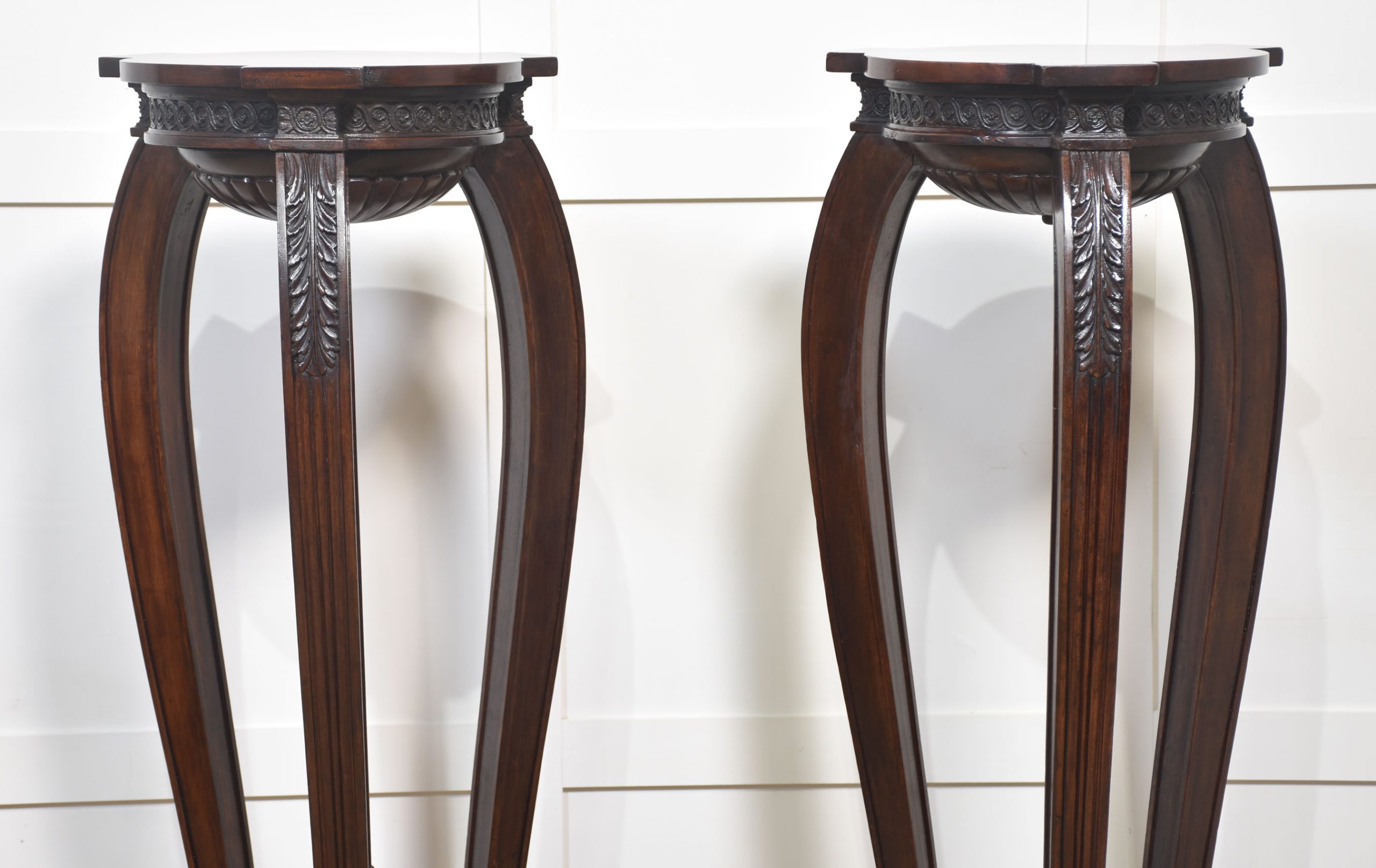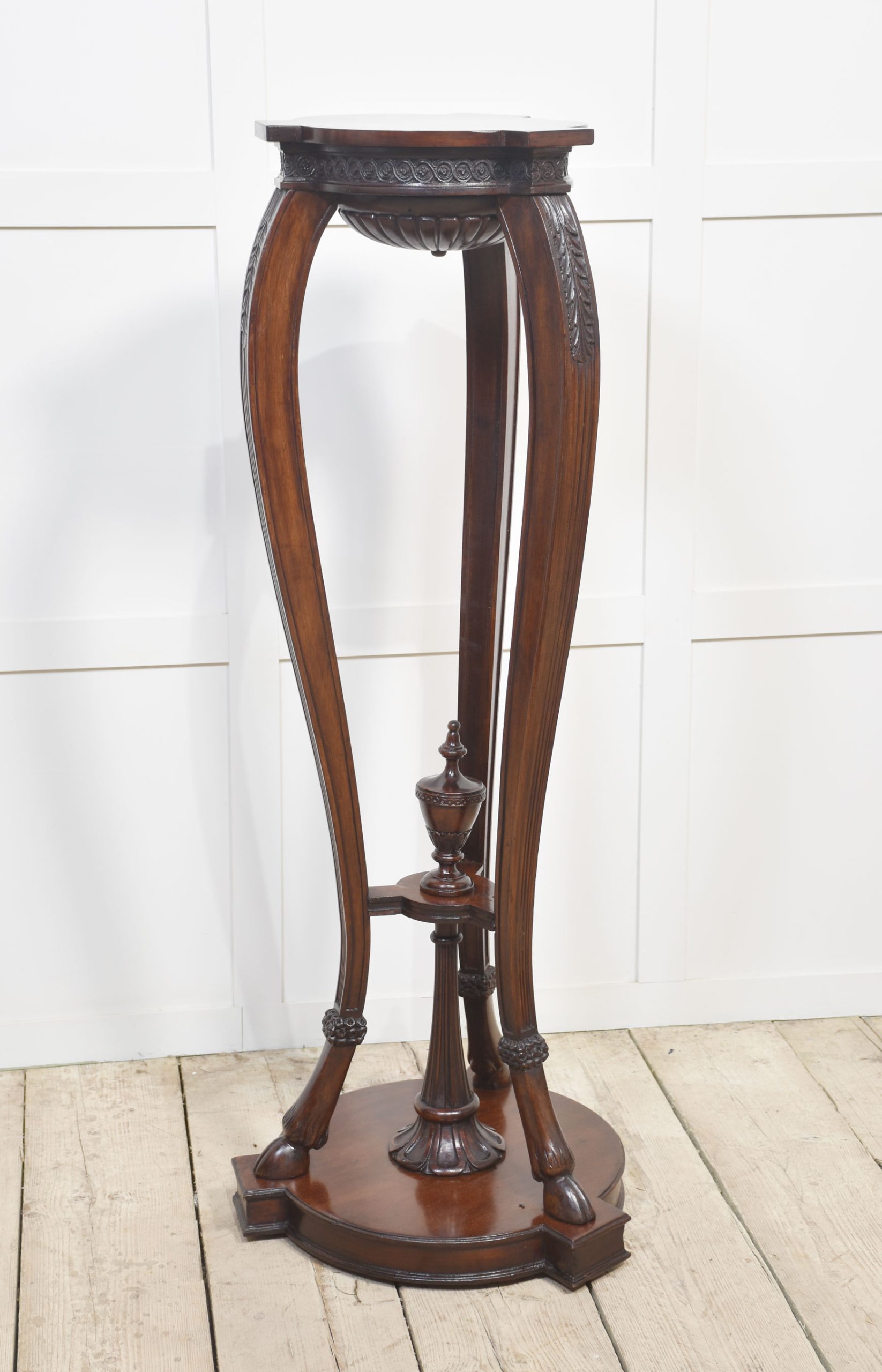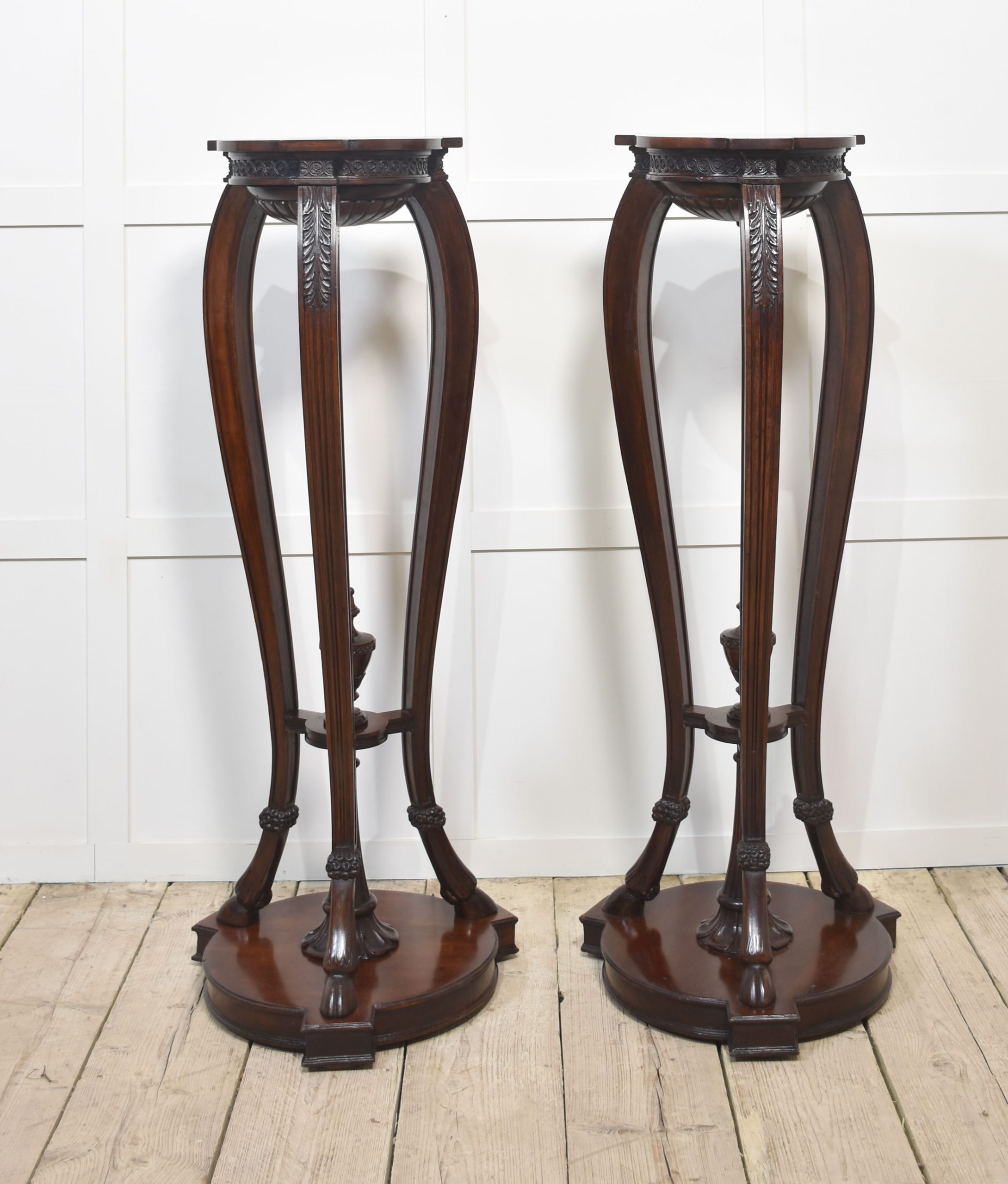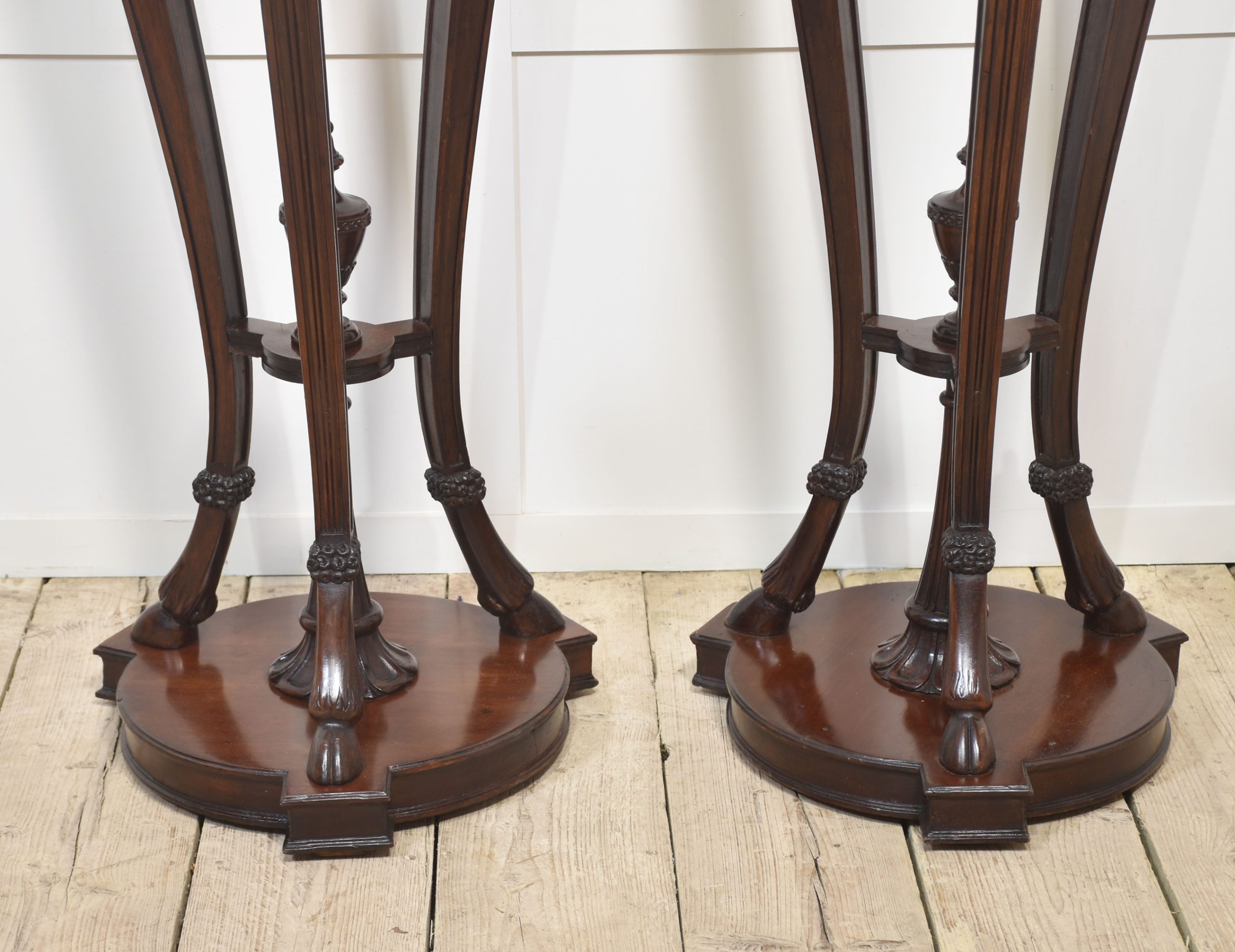 Pair of Neo classical style carved mahogany torcheres the shaped tops and carved frieze with guilloche and acanthus leaves detail. To the shaped legs united by under-tier with central urn. All raised up on Hoof feet and moulded plinth.