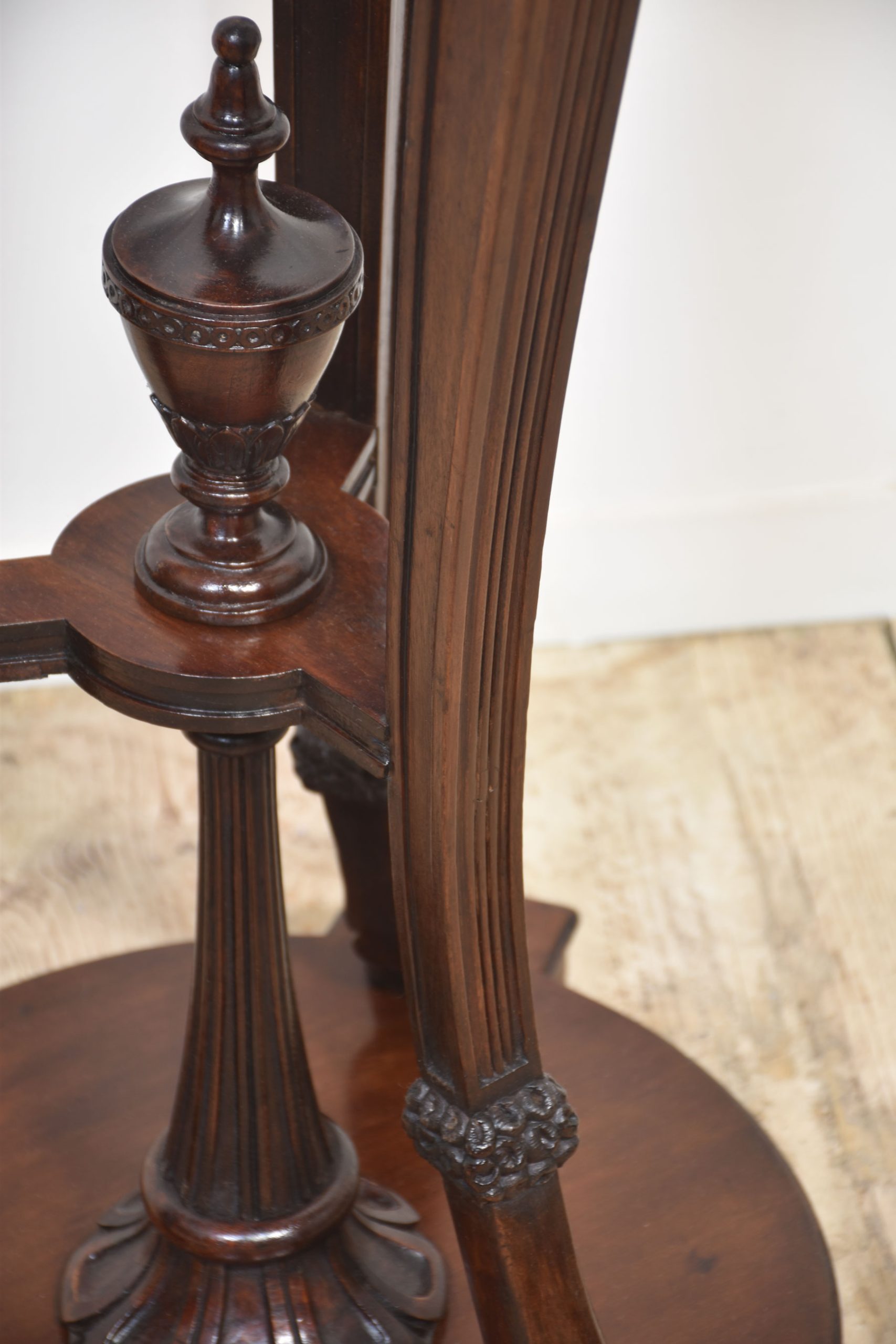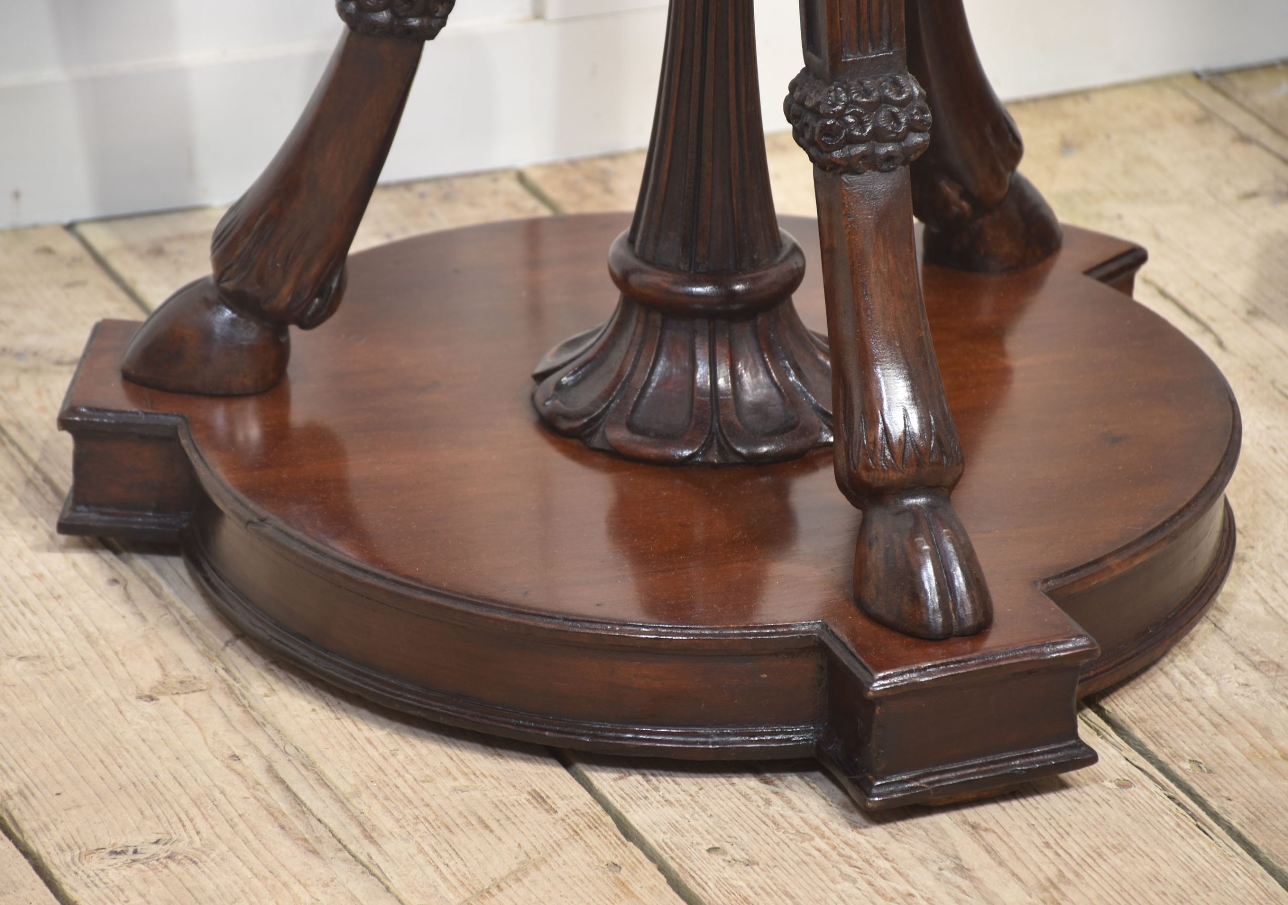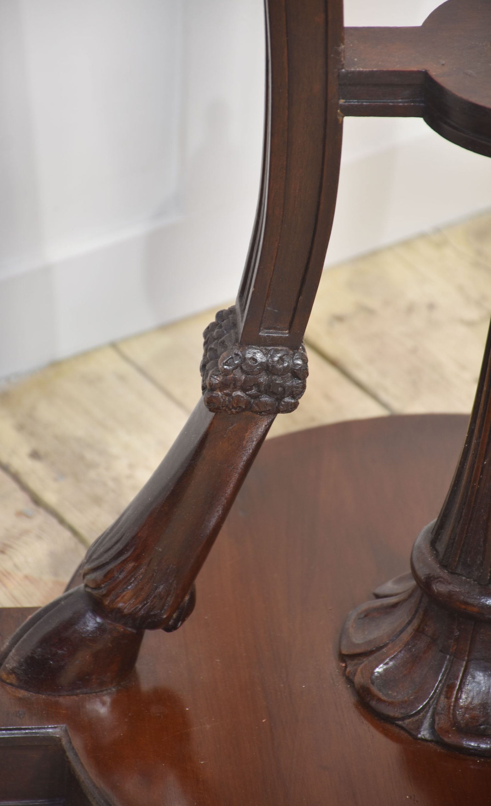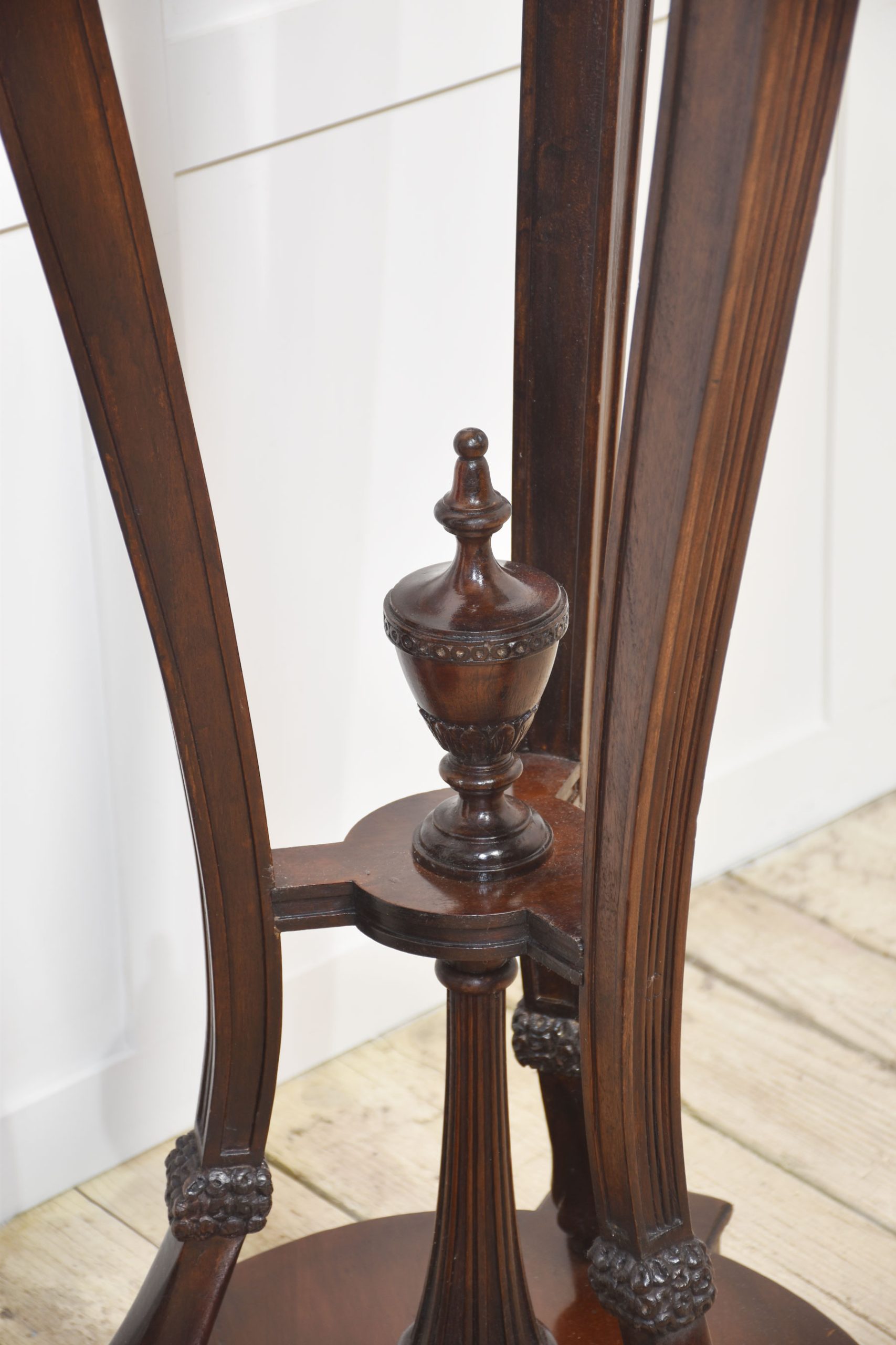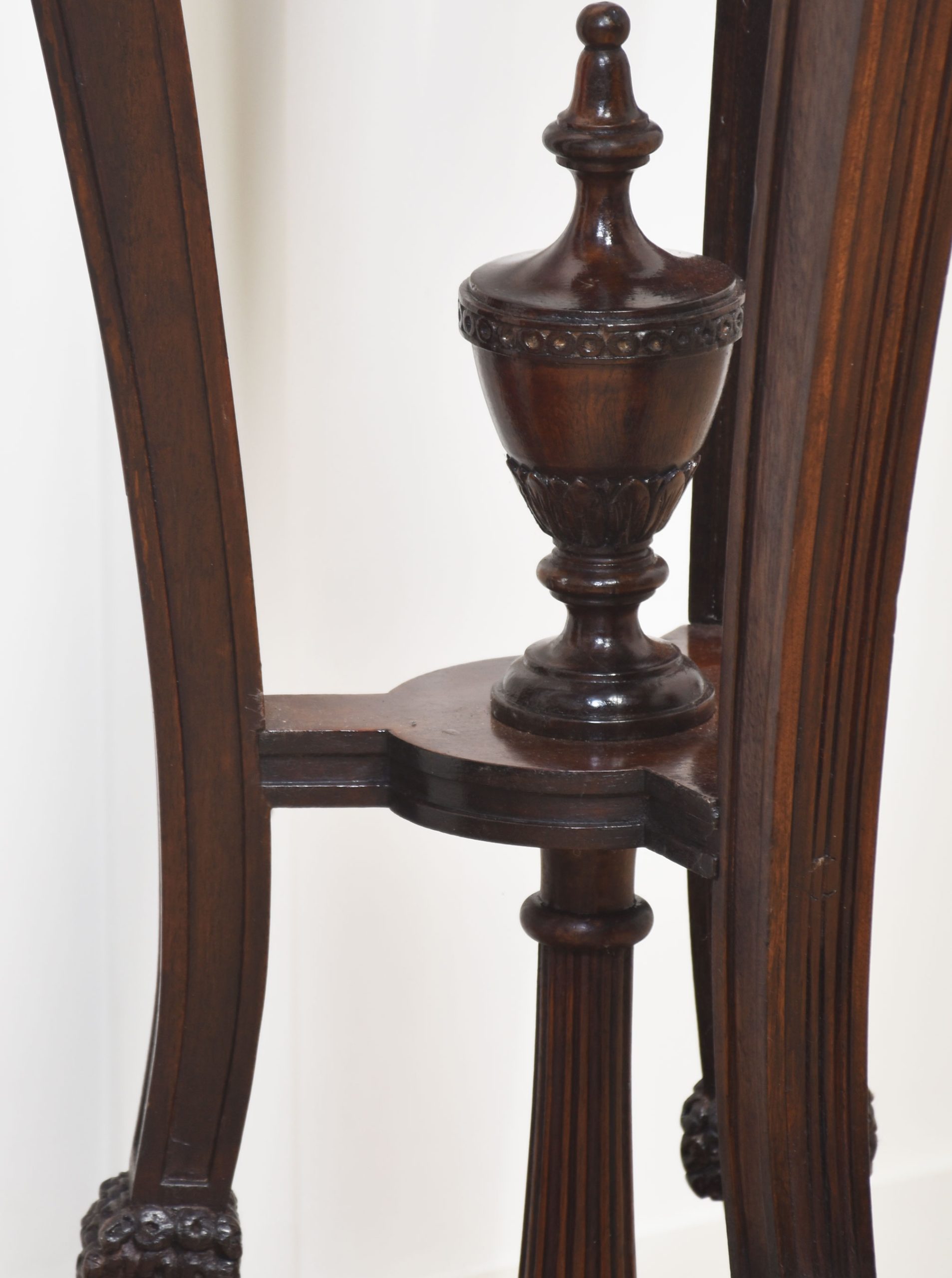 Pair of Neo classical style carved mahogany torcheres the shaped tops and carved frieze with guilloche and acanthus leaves detail. To the shaped legs united by under-tier with central urn. All raised up on Hoof feet and moulded plinth.