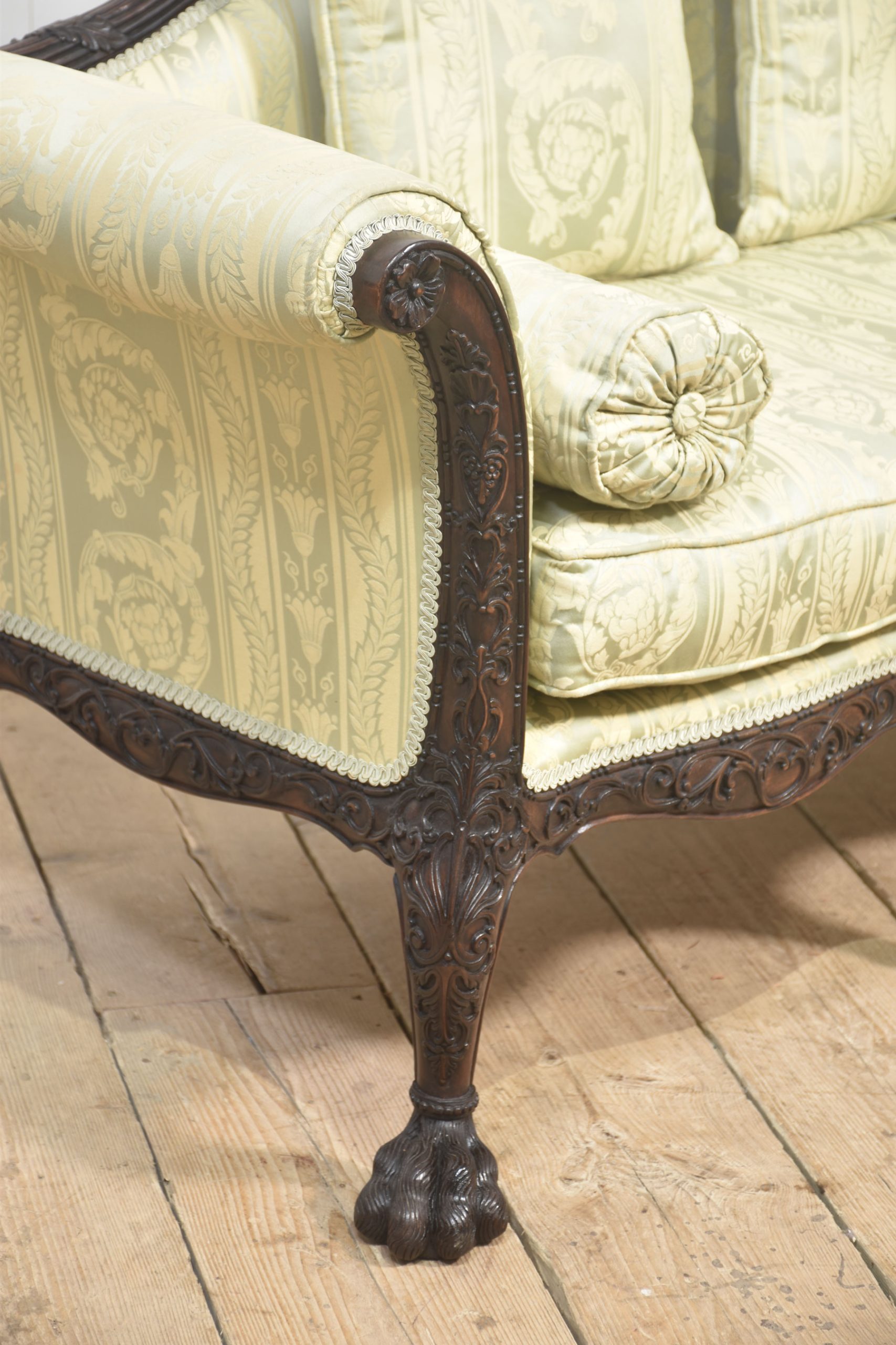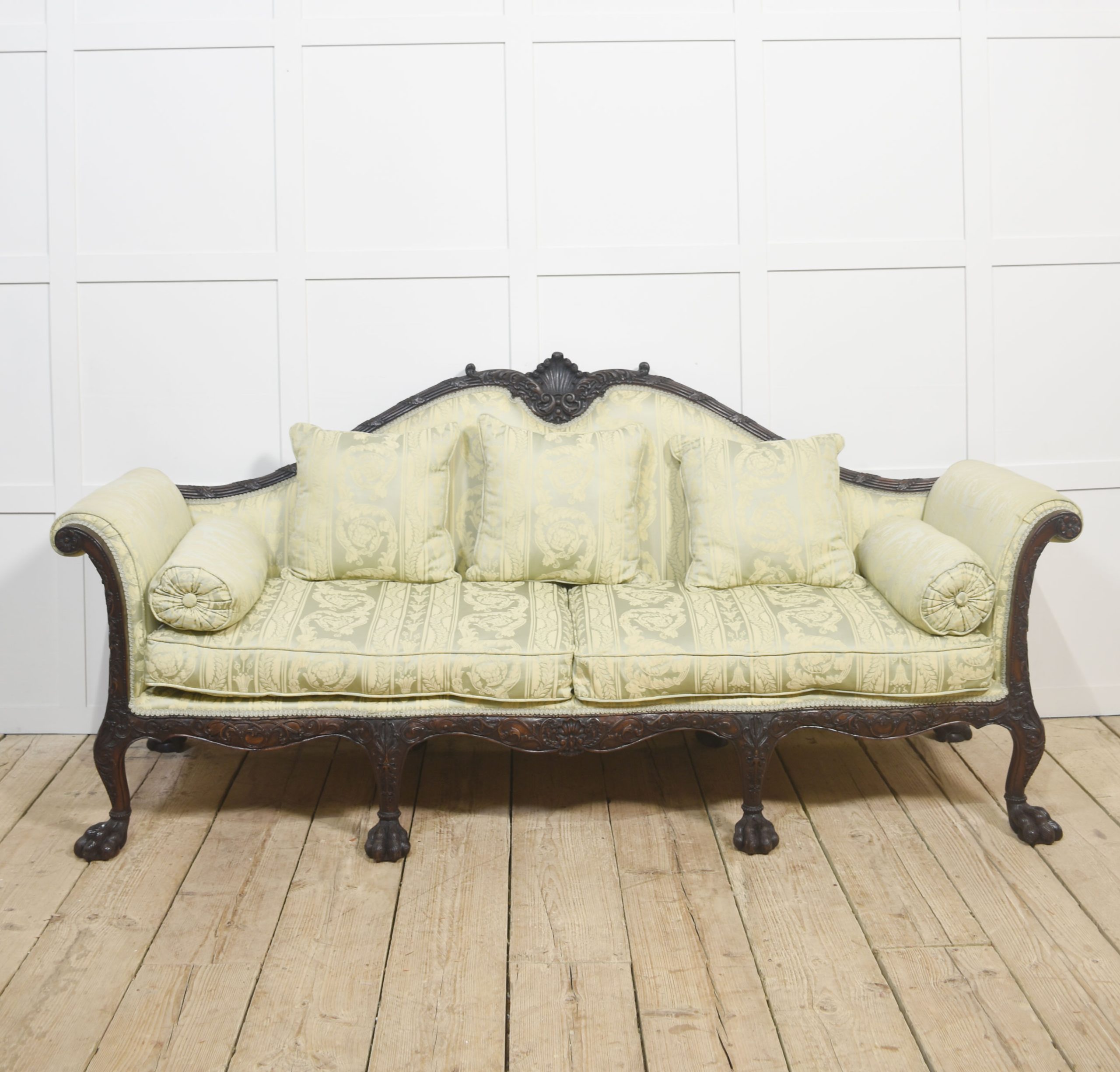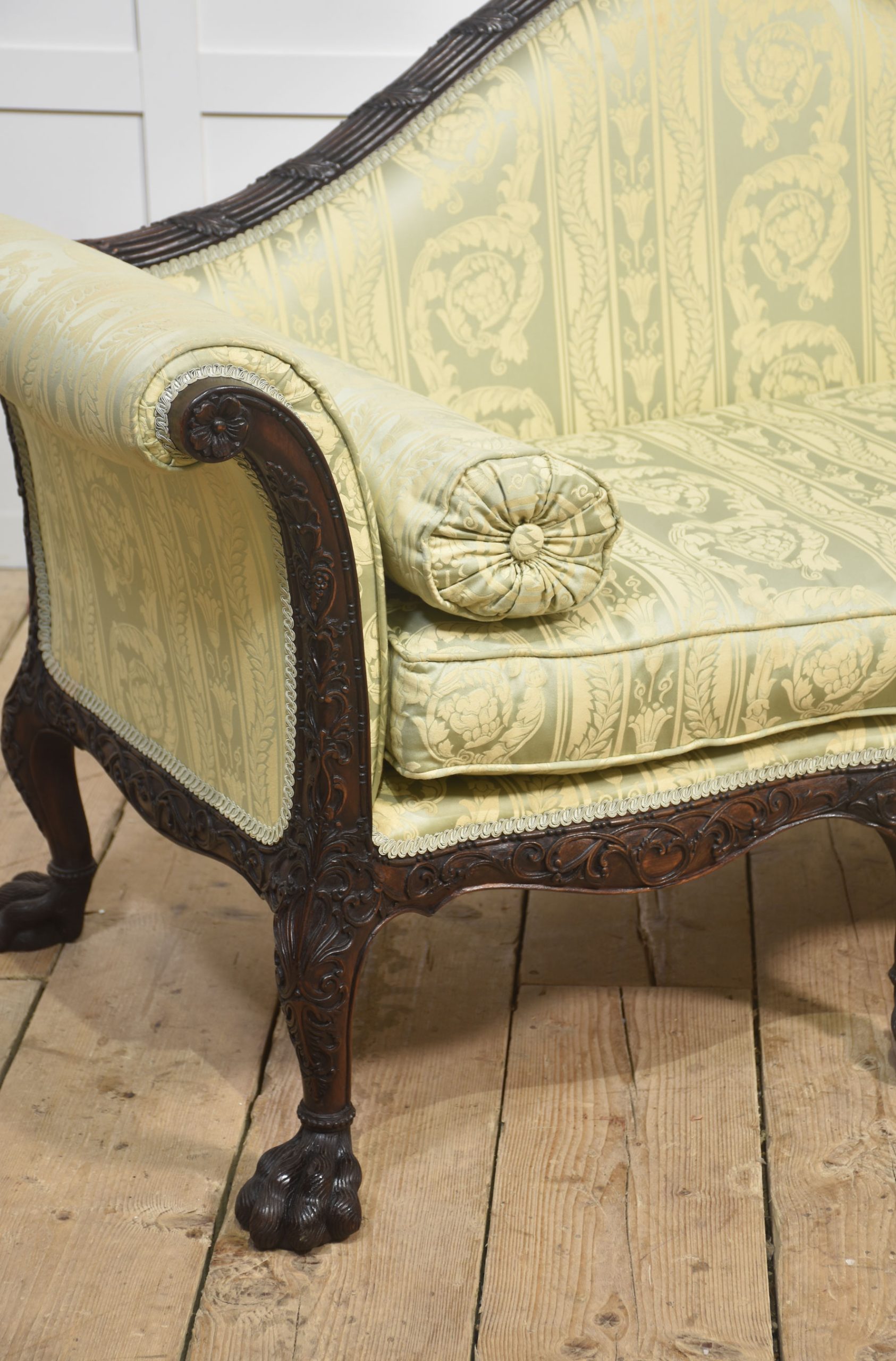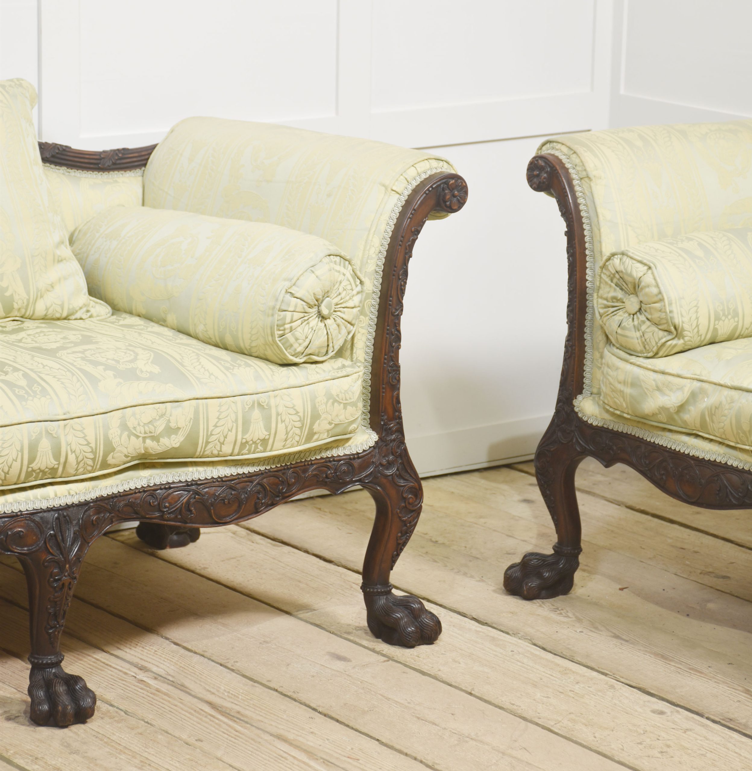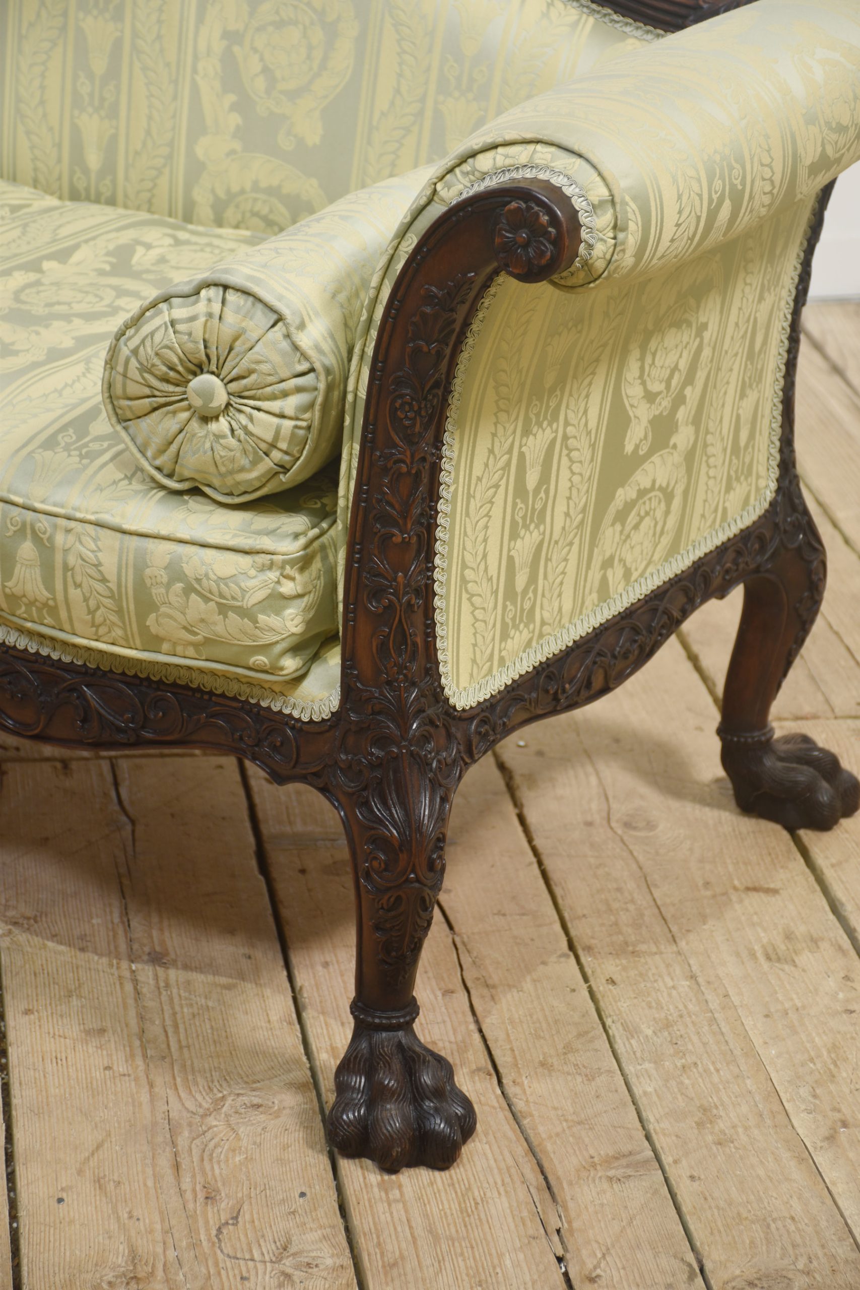 A striking pair of settees featuring a finely carved mahogany frame with intricate detailing along the crest rail and apron. The high, arched back is complemented by elegant, scrolled arms and rests on bold, claw-and-ball feet, showcasing masterful craftsmanship. Upholstered in damask fabric with a delicate floral pattern, the settees offer both comfort and refinement. Two matching bolster cushions complete the look, making this piece a beautiful blend of style and sophistication—perfect for a living room.