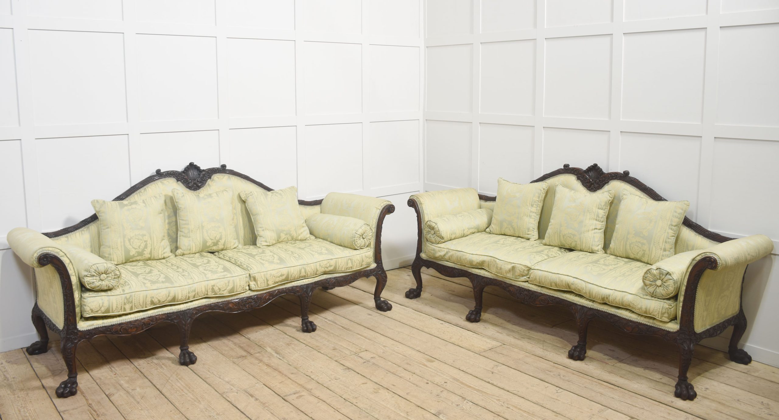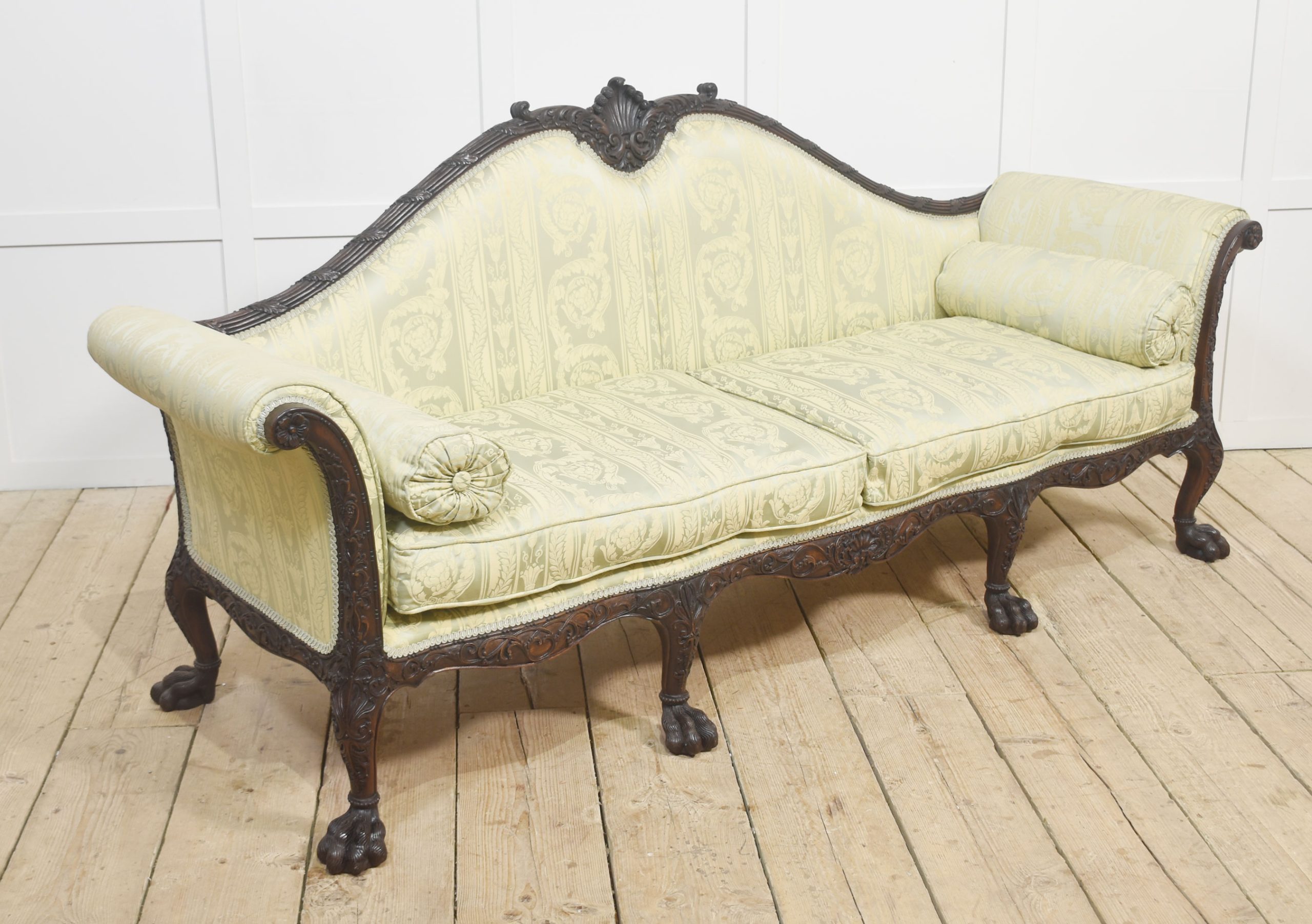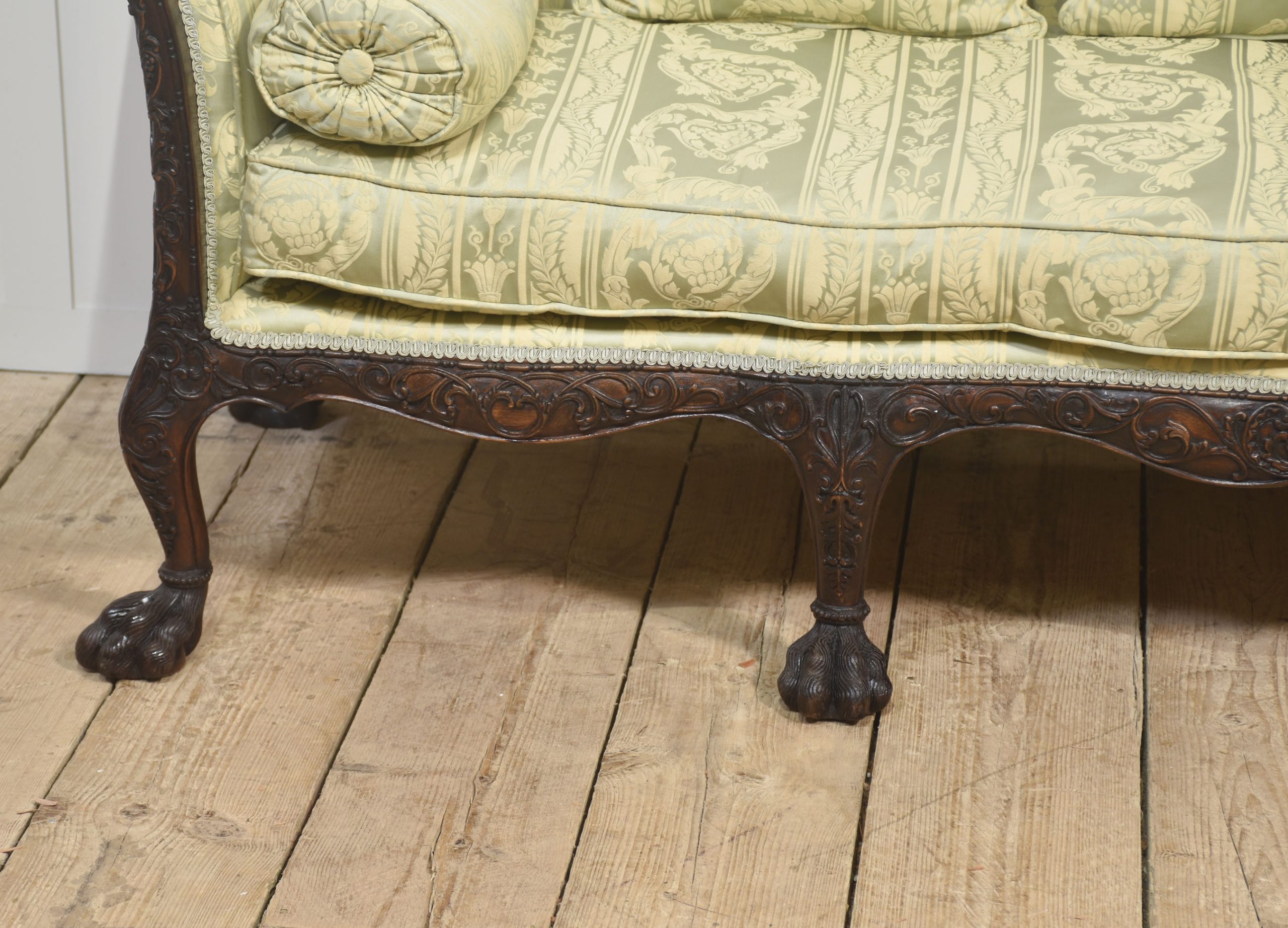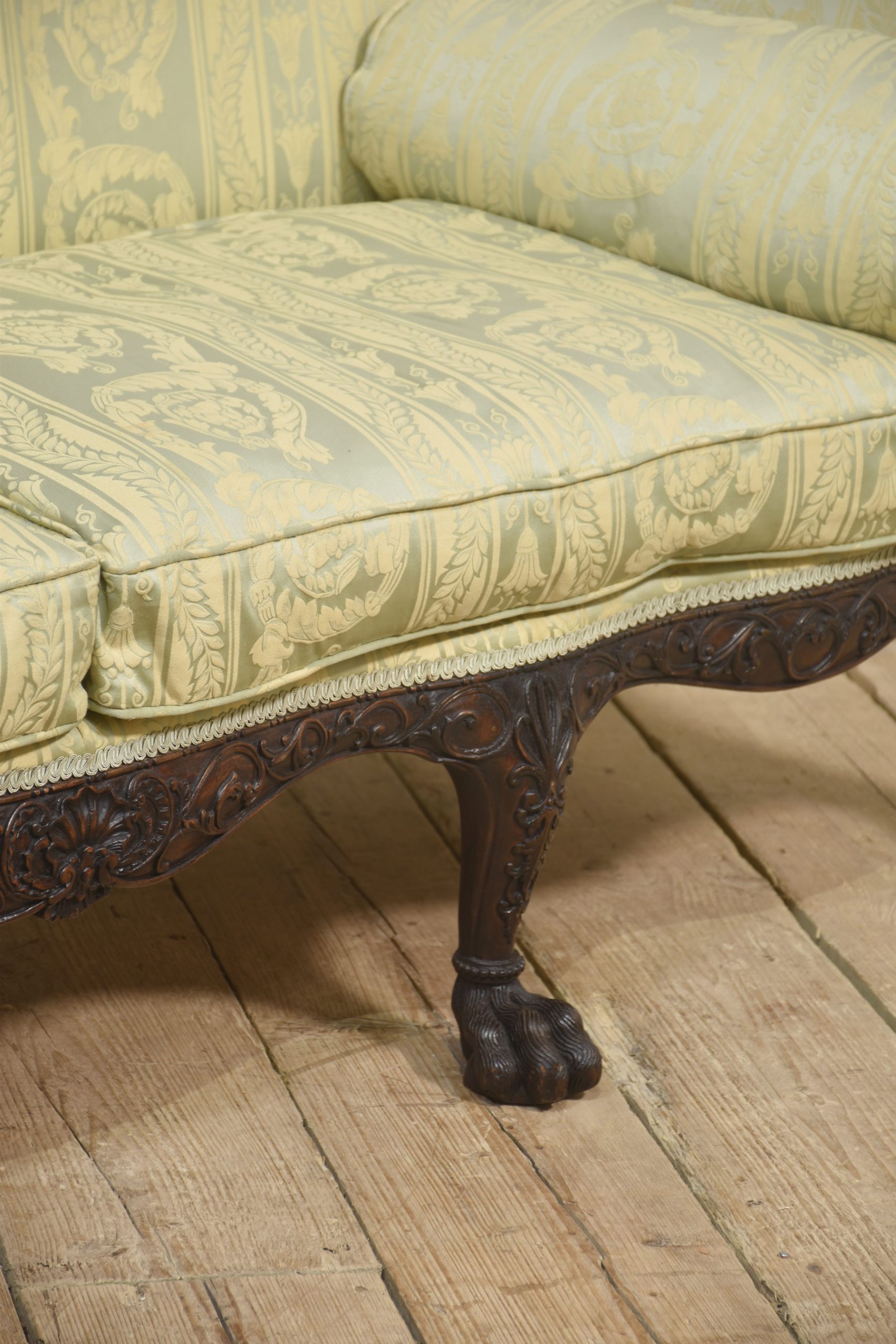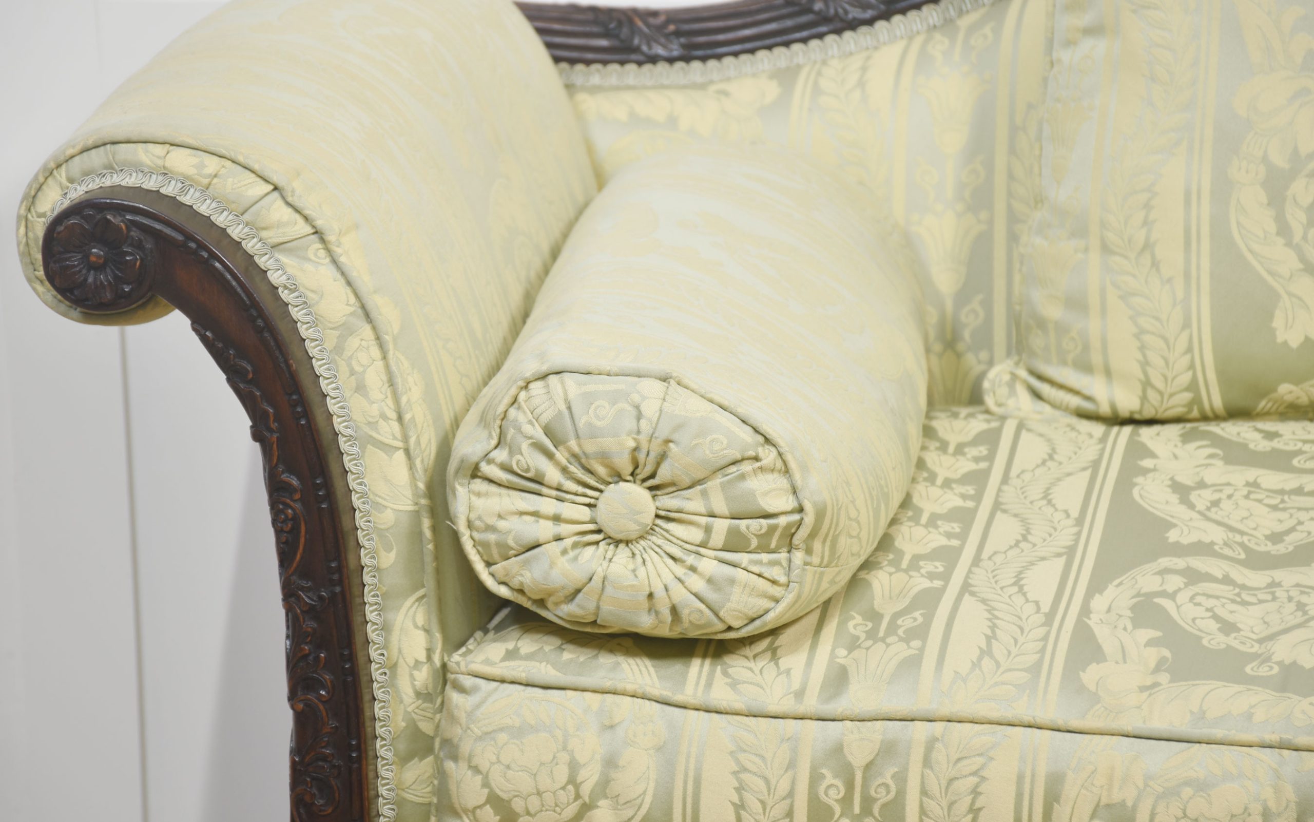 A striking pair of settees featuring a finely carved mahogany frame with intricate detailing along the crest rail and apron. The high, arched back is complemented by elegant, scrolled arms and rests on bold, claw-and-ball feet, showcasing masterful craftsmanship. Upholstered in damask fabric with a delicate floral pattern, the settees offer both comfort and refinement. Two matching bolster cushions complete the look, making this piece a beautiful blend of style and sophistication—perfect for a living room.