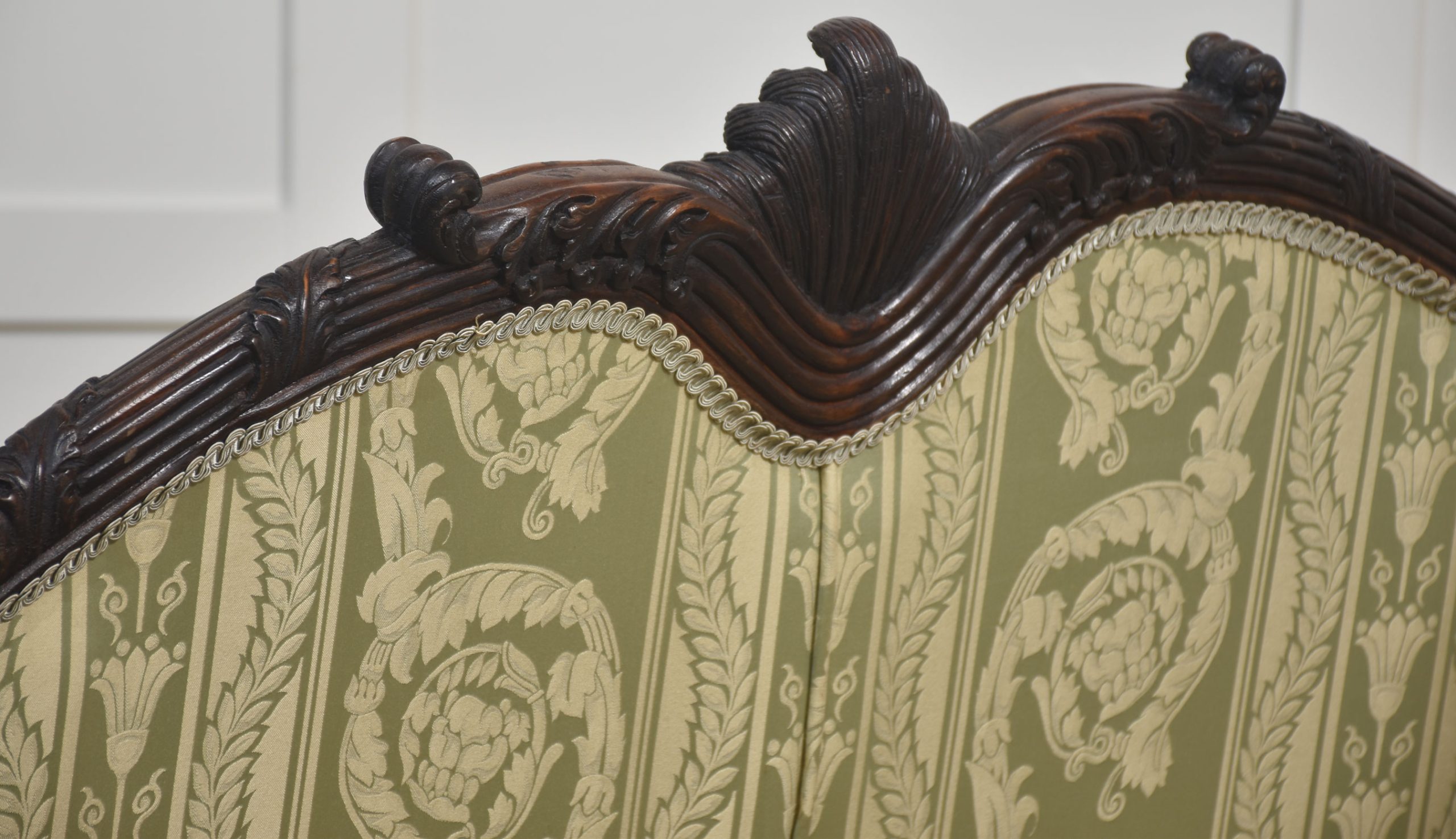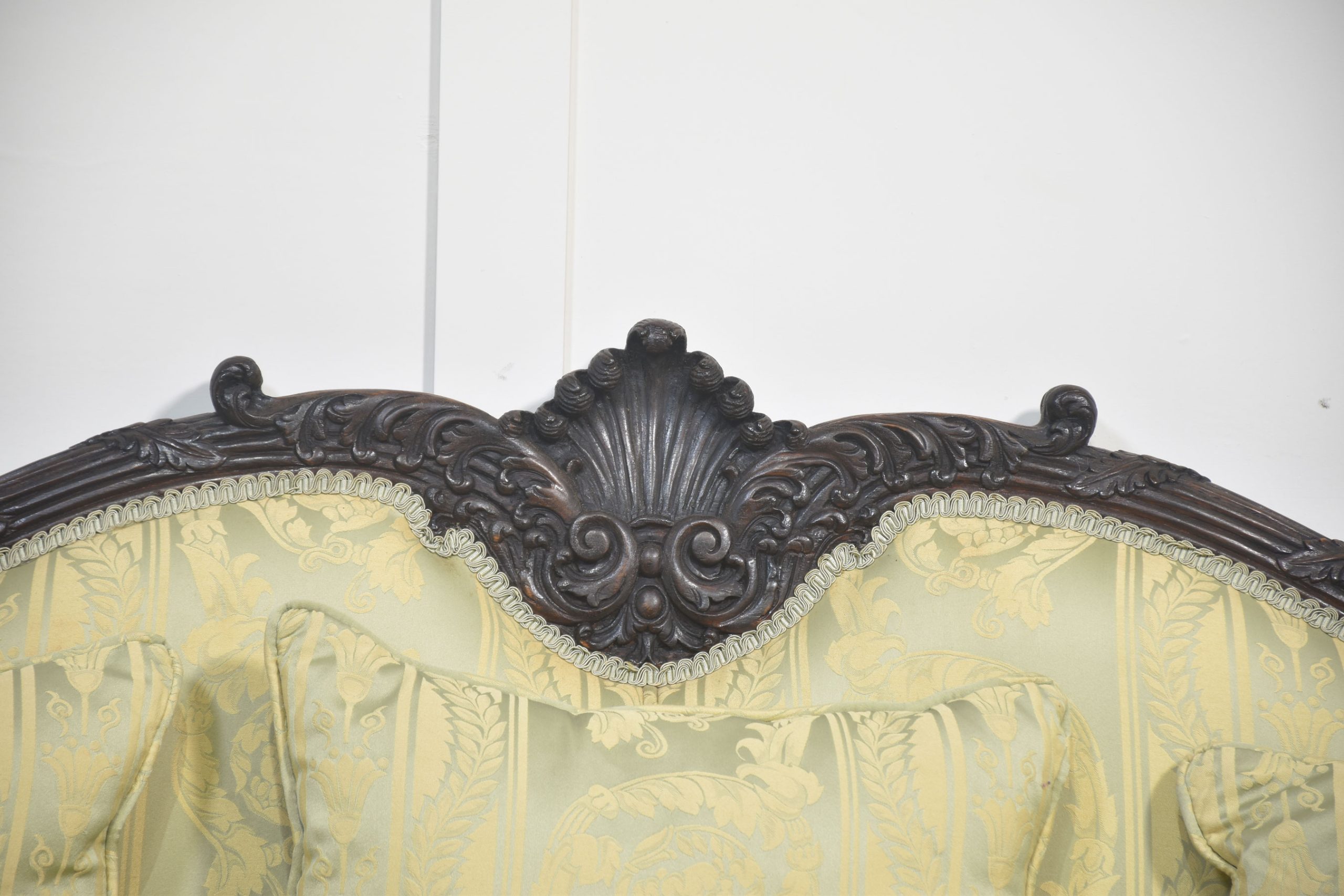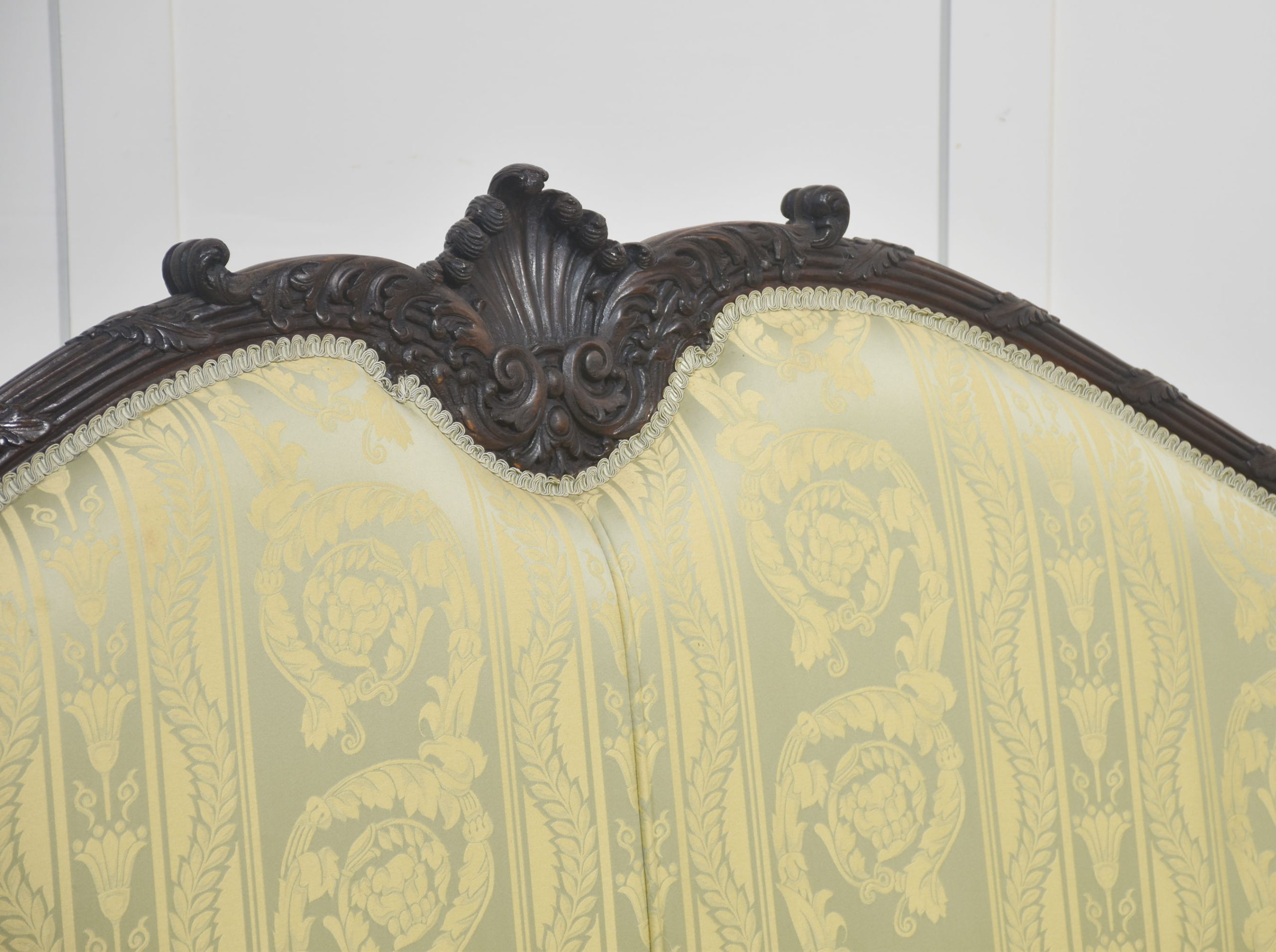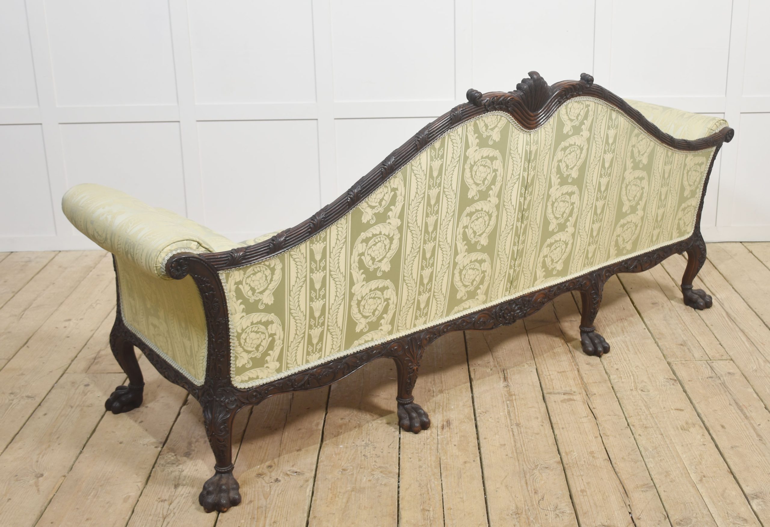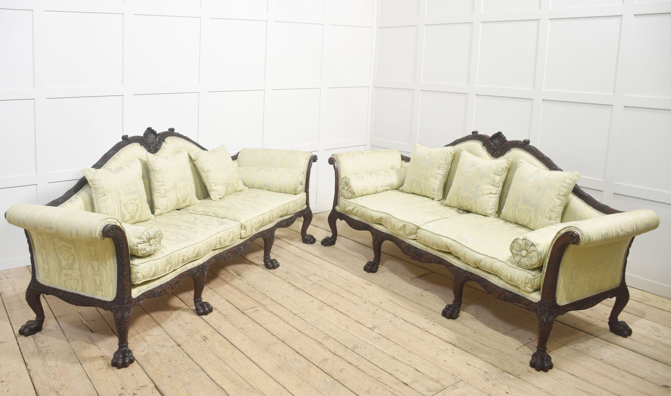 A striking pair of settees featuring a finely carved mahogany frame with intricate detailing along the crest rail and apron. The high, arched back is complemented by elegant, scrolled arms and rests on bold, claw-and-ball feet, showcasing masterful craftsmanship. Upholstered in damask fabric with a delicate floral pattern, the settees offer both comfort and refinement. Two matching bolster cushions complete the look, making this piece a beautiful blend of style and sophistication—perfect for a living room.