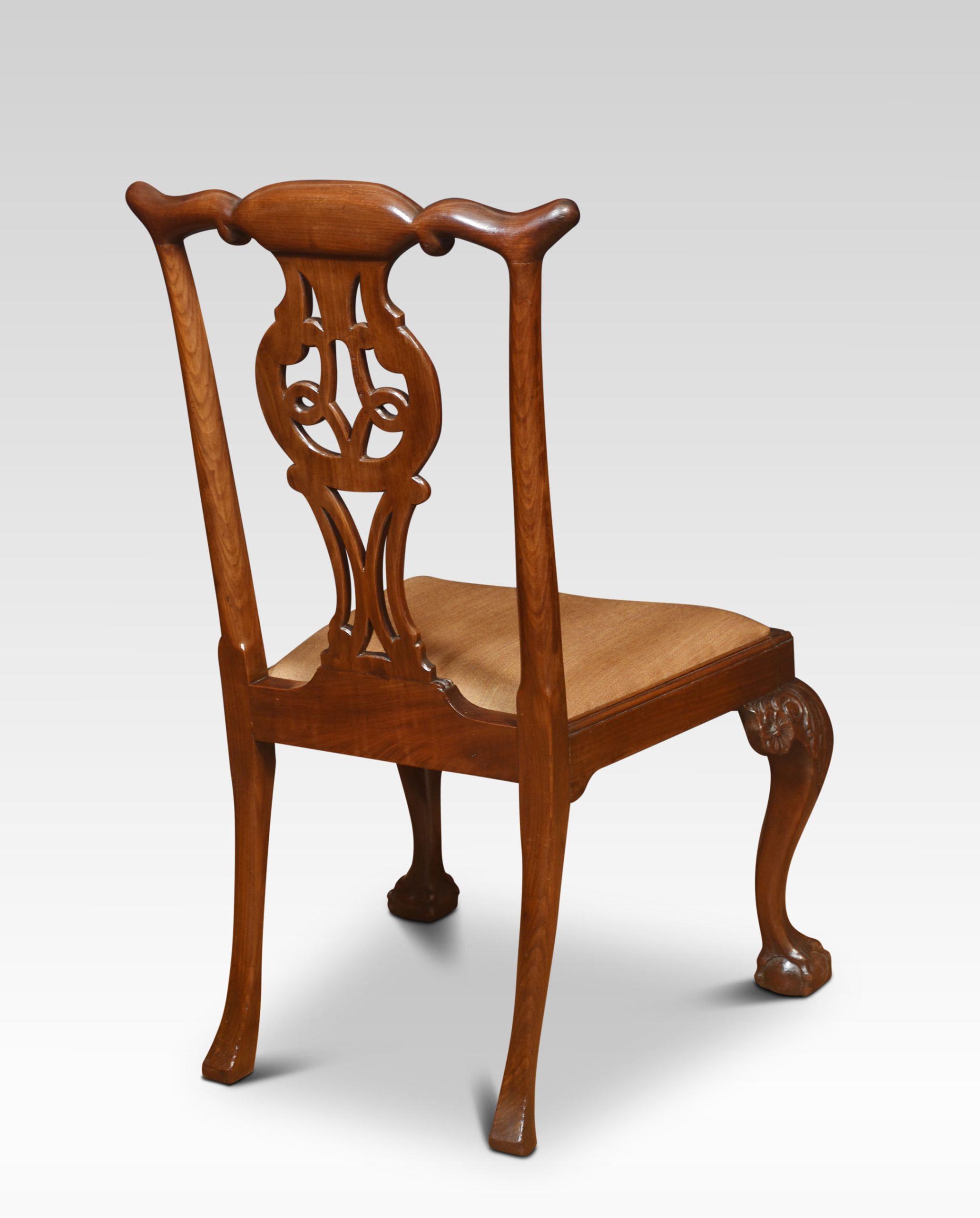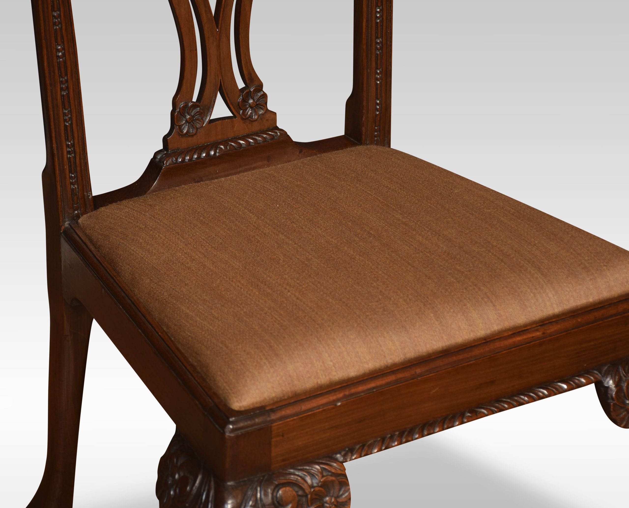Pair of mahogany side chairs, each with a yoked crest rail above a pierced splat with quatrefoil cut-outs over a drop-in seat. All raised up on cabriole supports terminating in claw and ball feet.