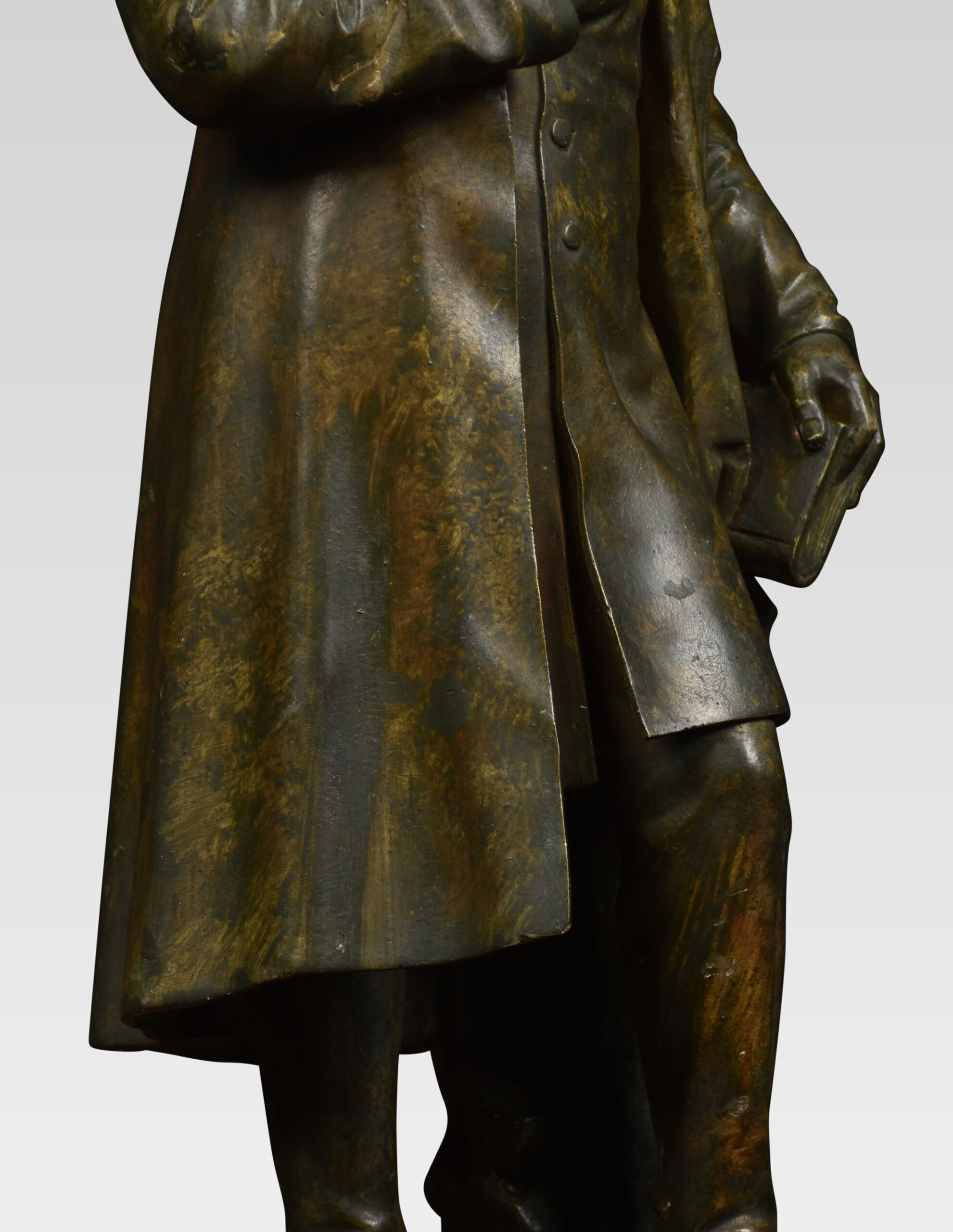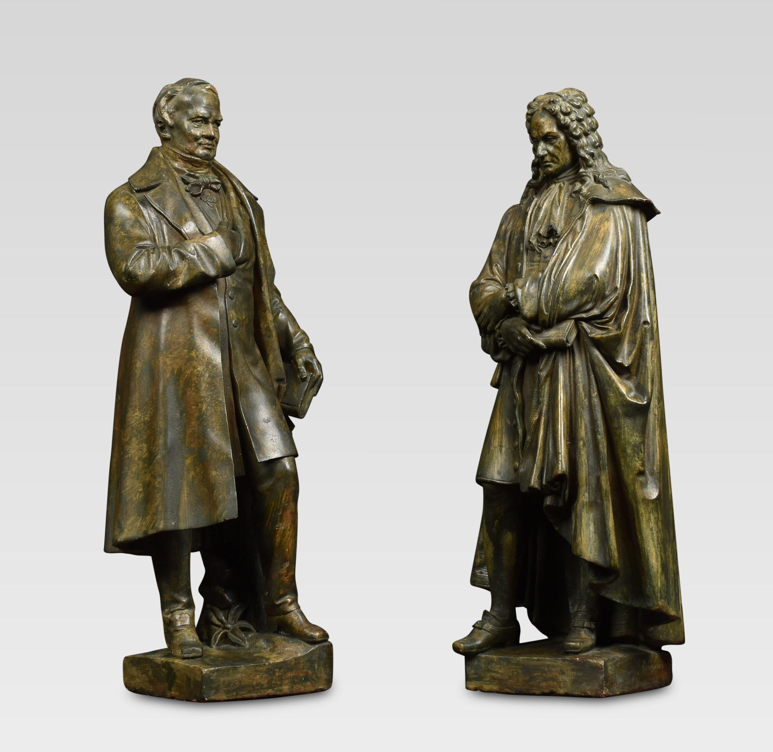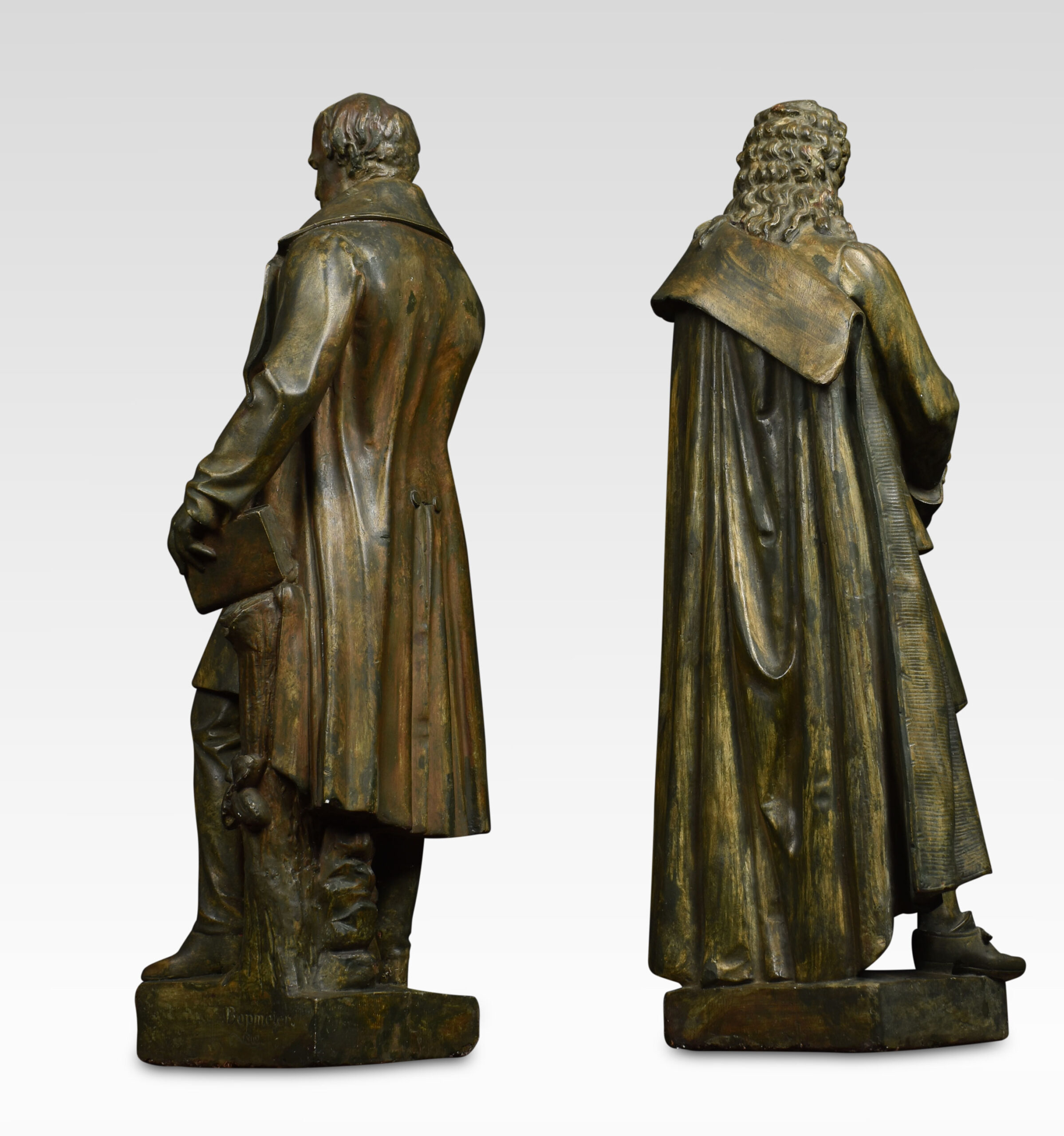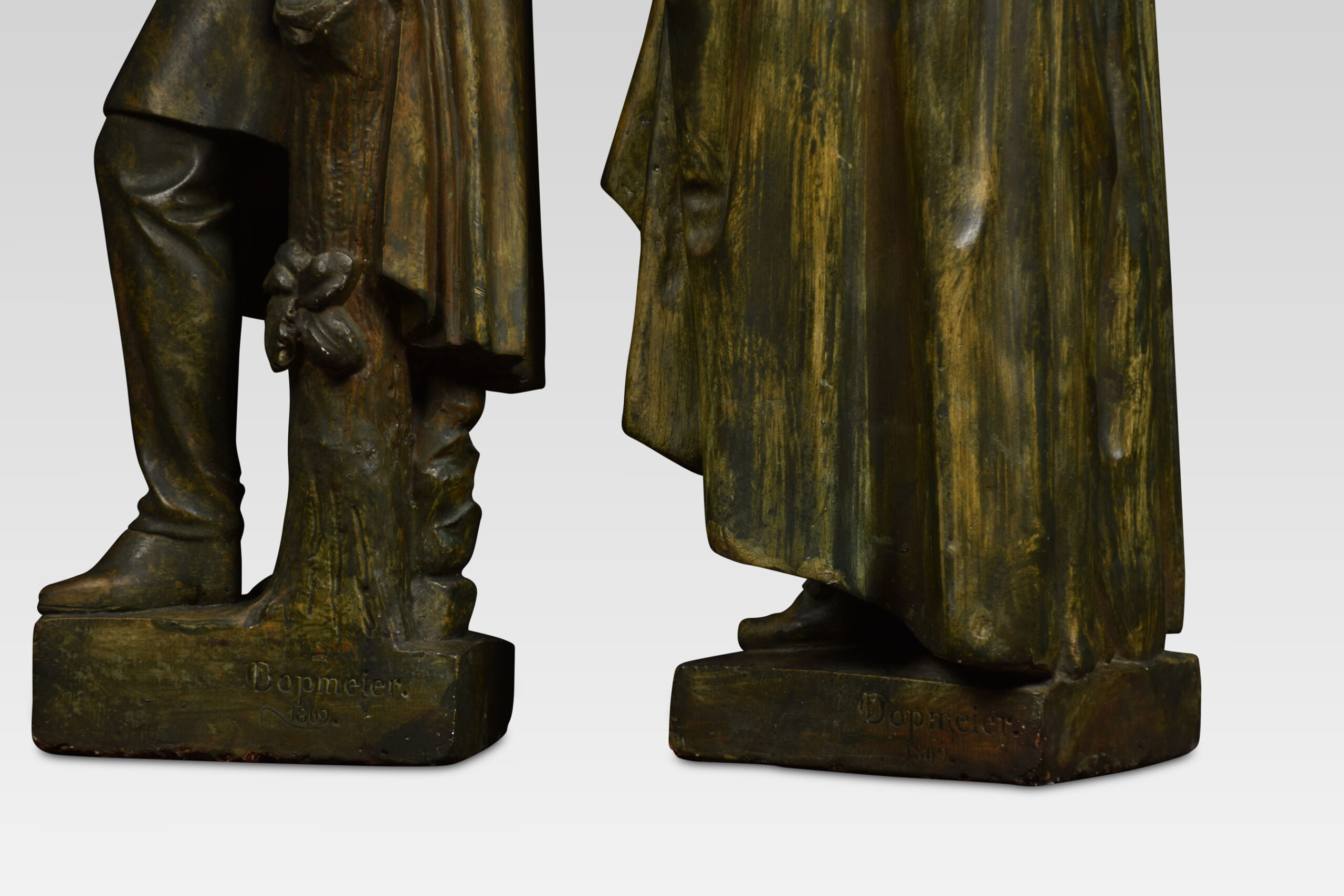 A pair of 19th century chalked bronzed figures in typical dress raised up on square bases