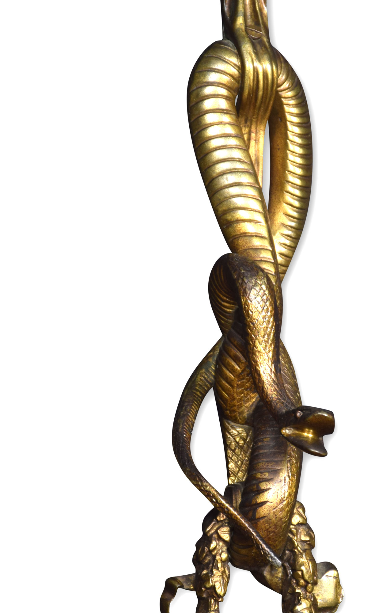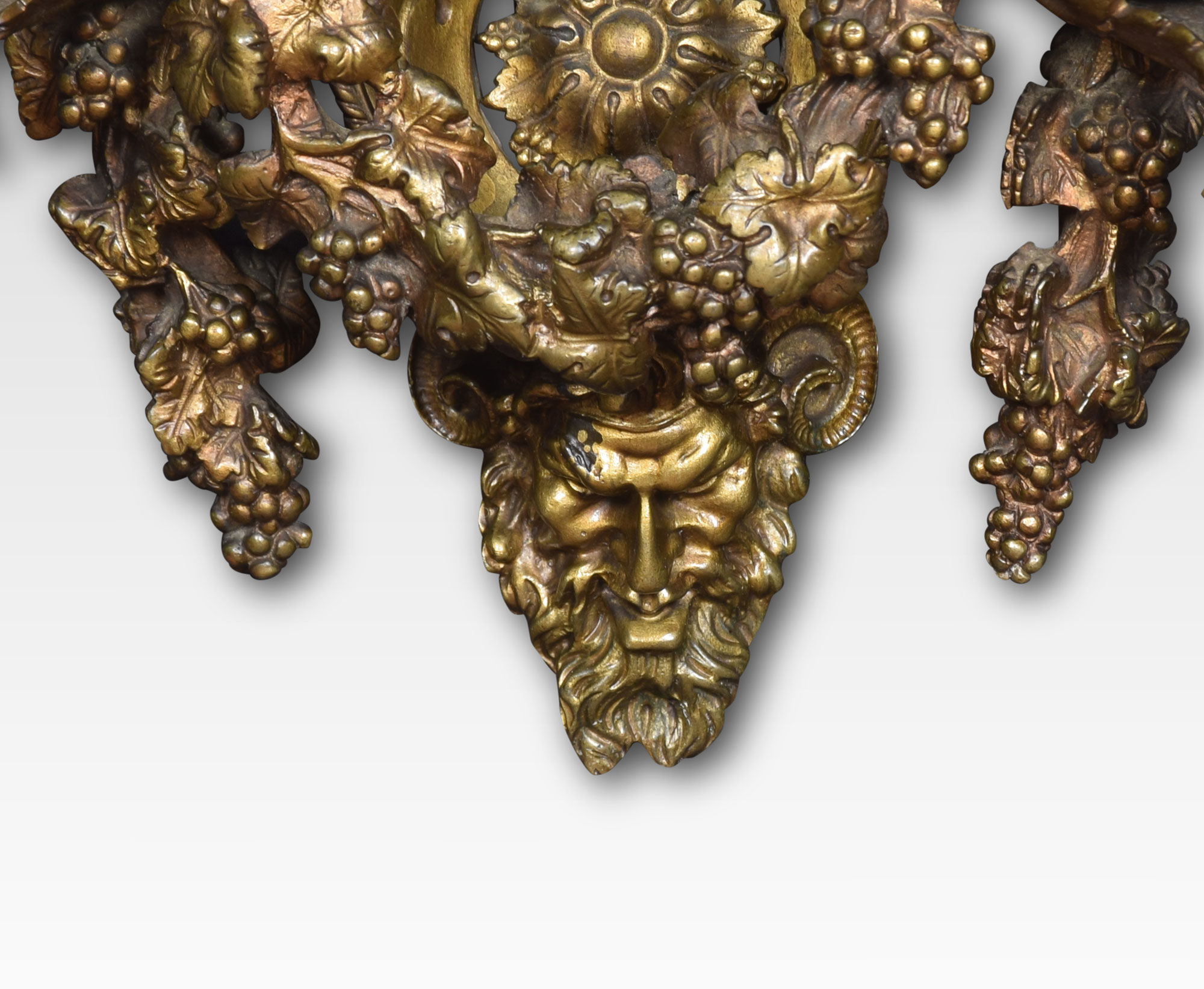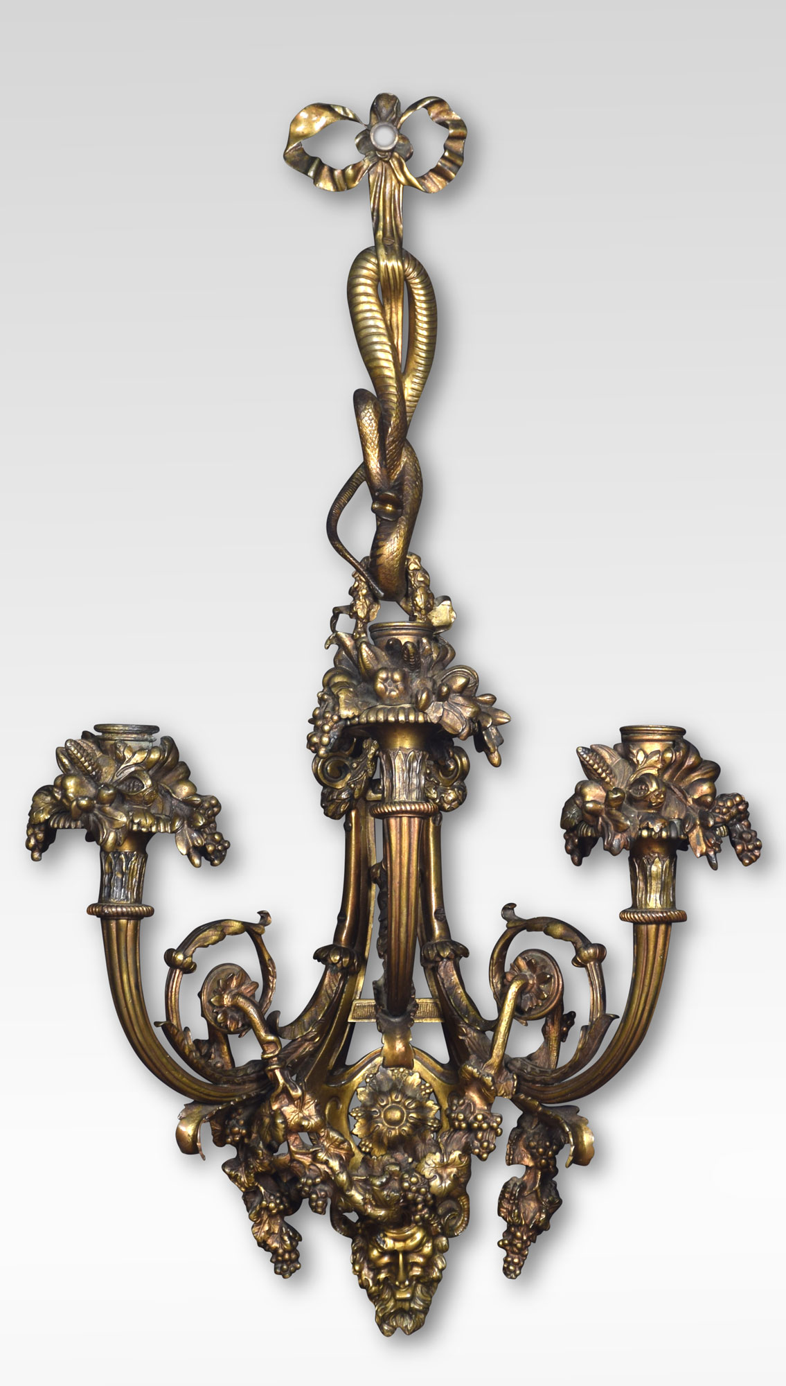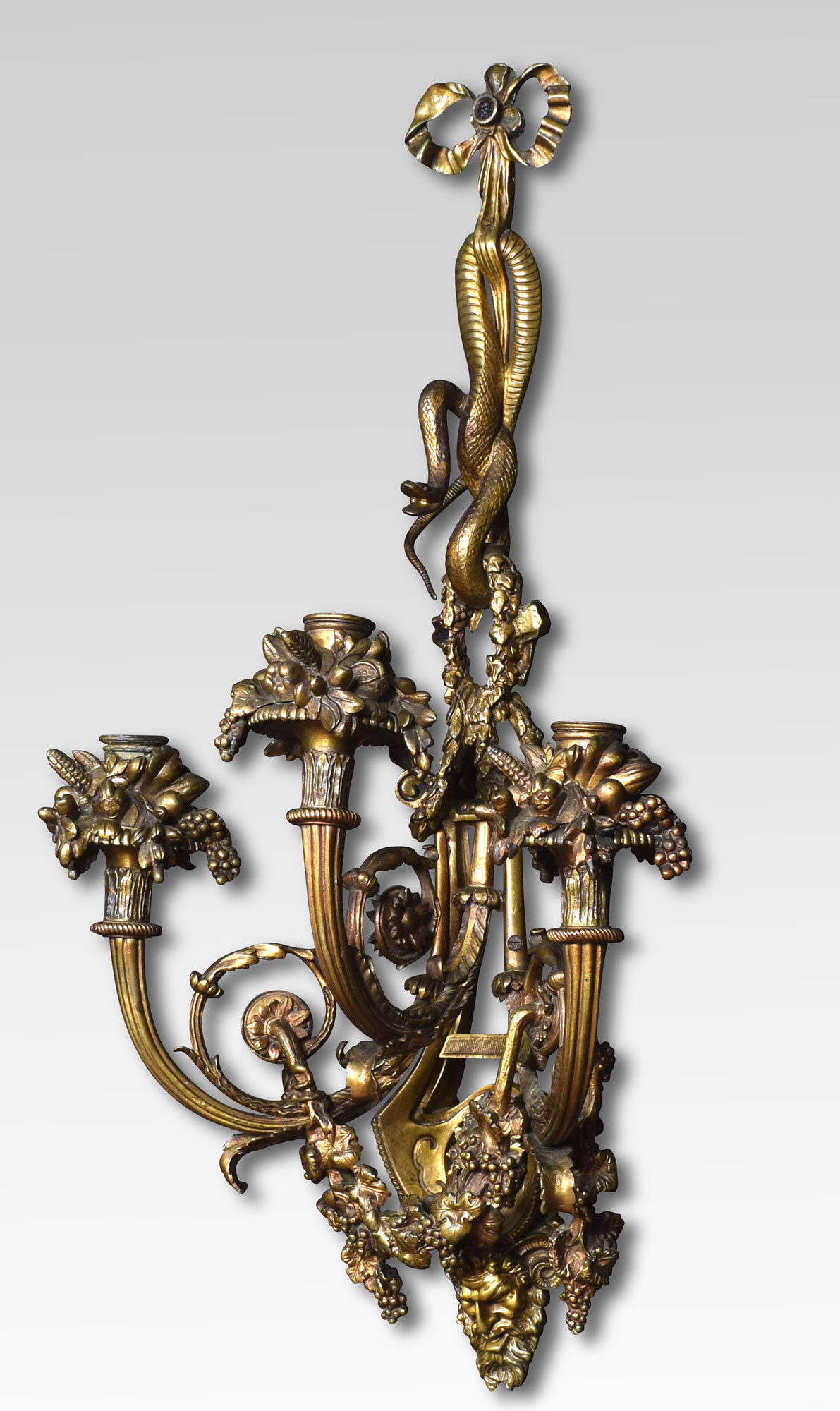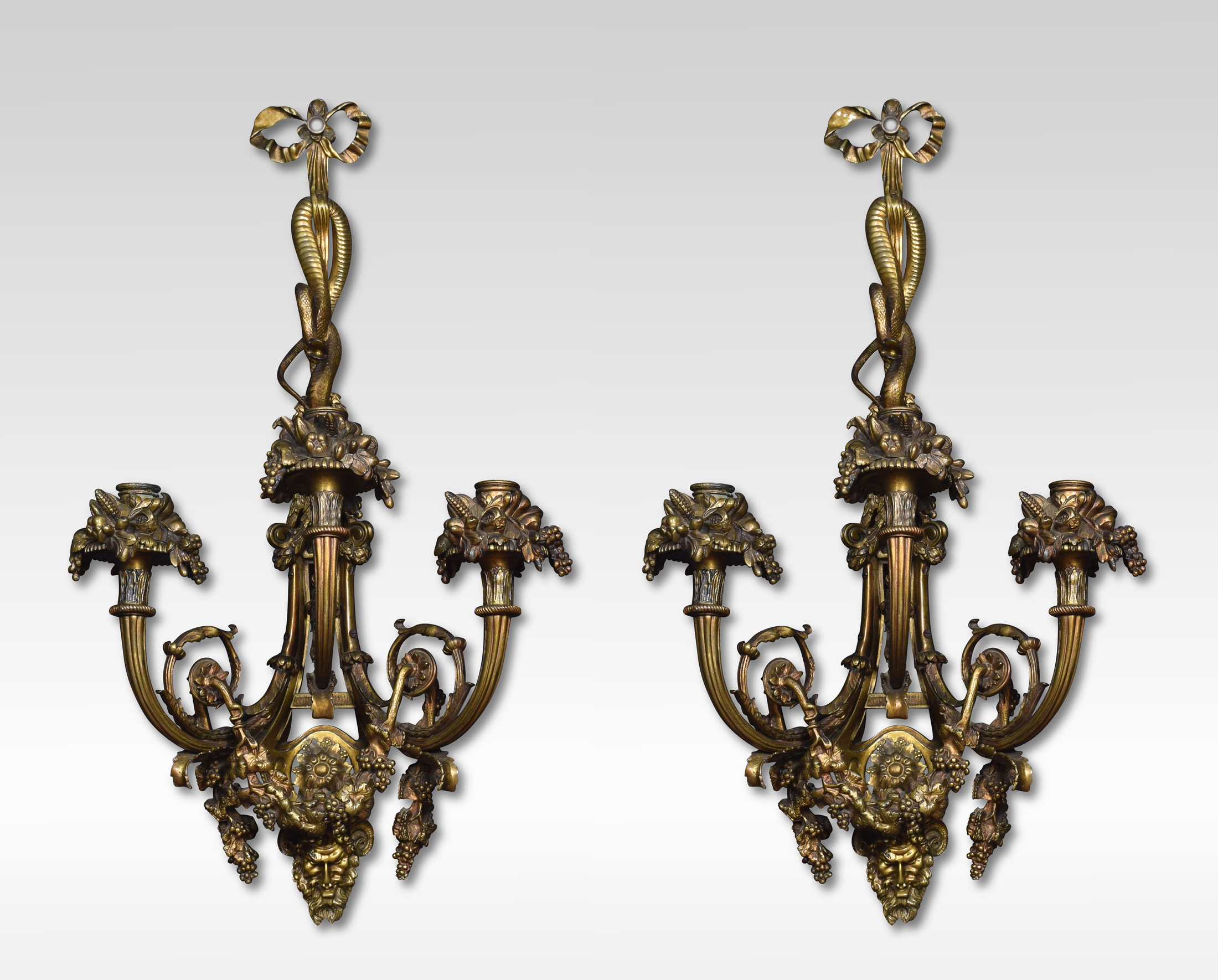 Pair of important impressive large scale mid-19th century French Louis XIV style gilt bronze three arm sconces. The richly designed pair with all original gilt having unusual serpent decoration above three scrolling arms with floral relief terminating in Zeus Masks