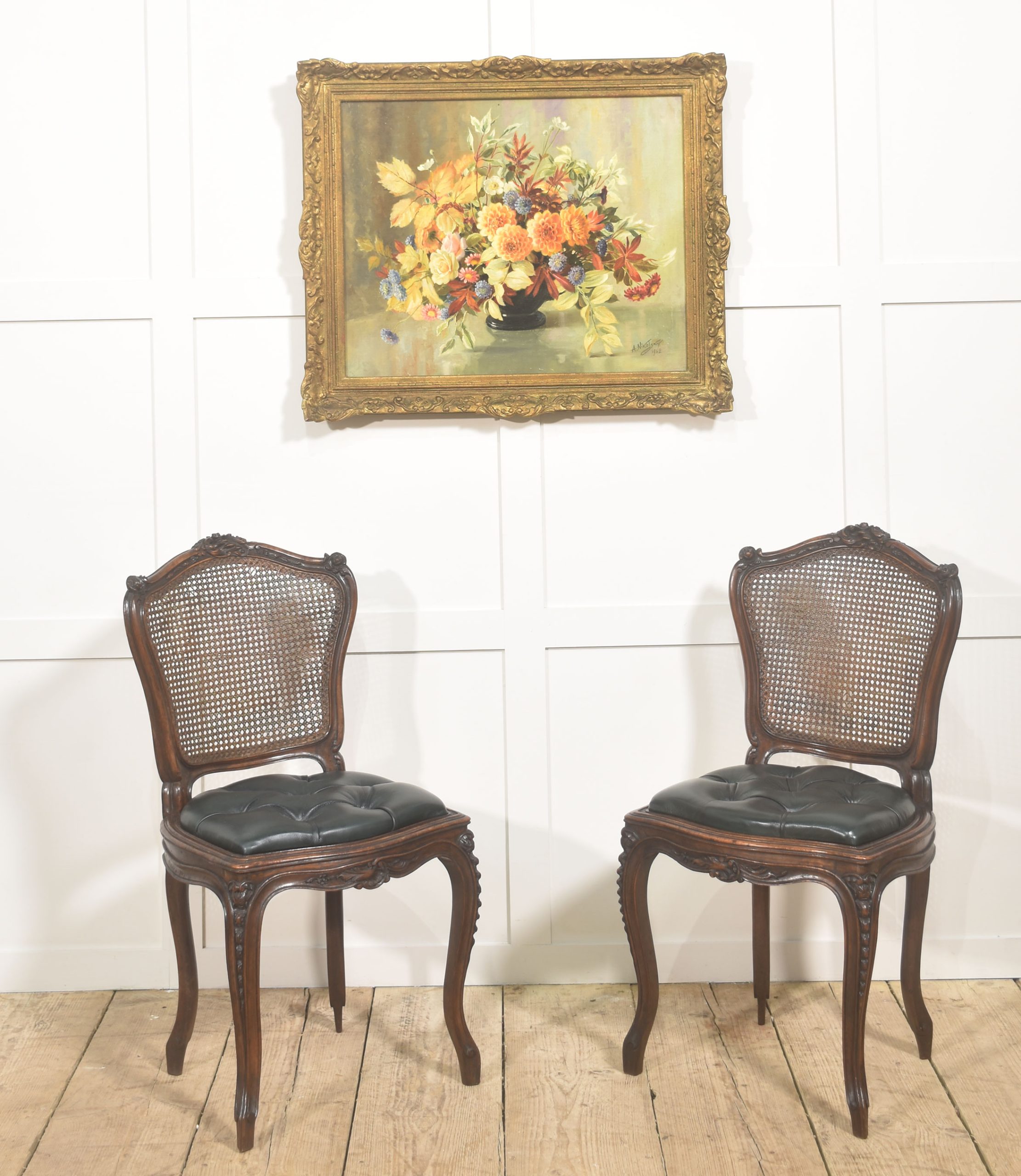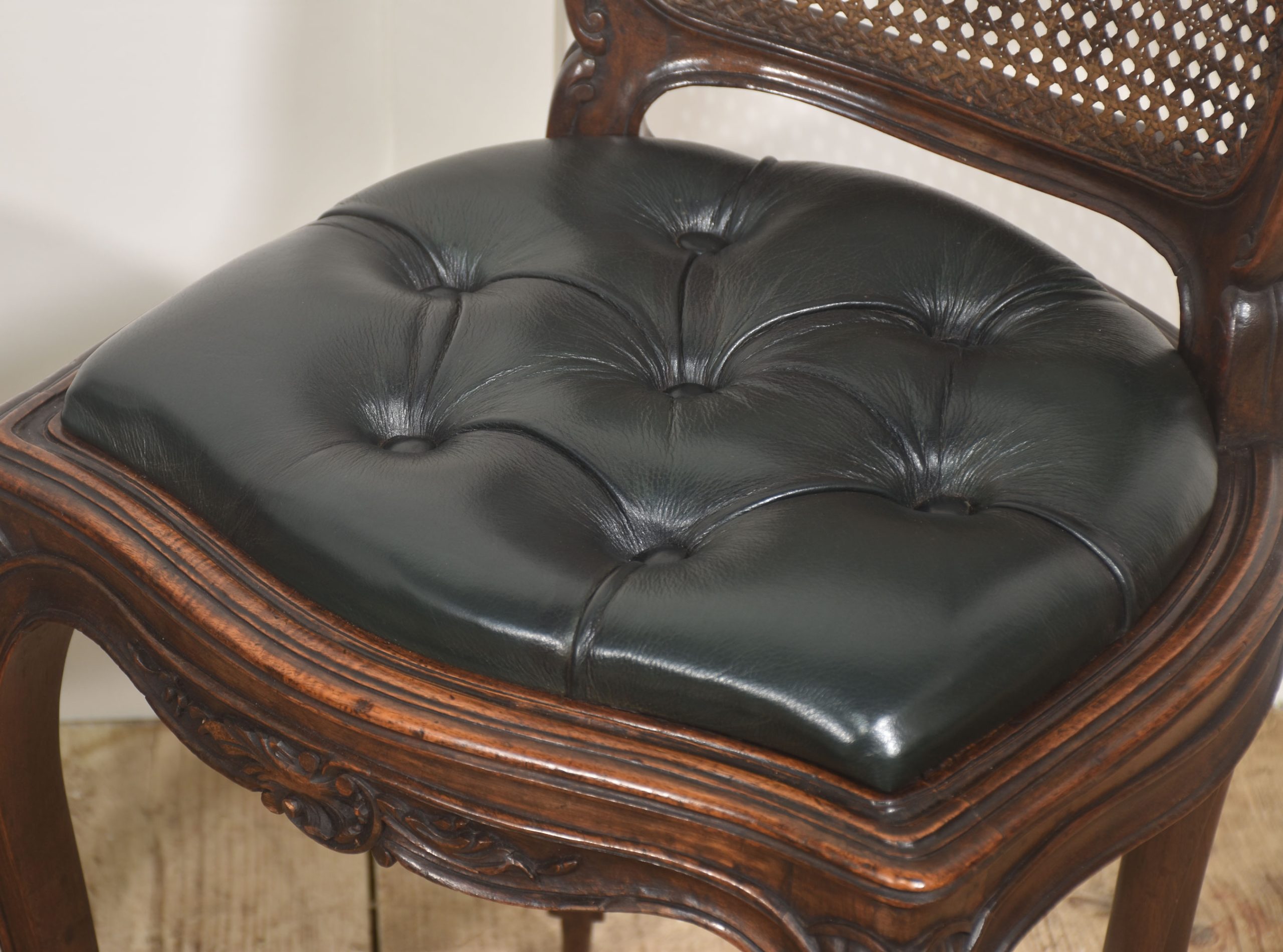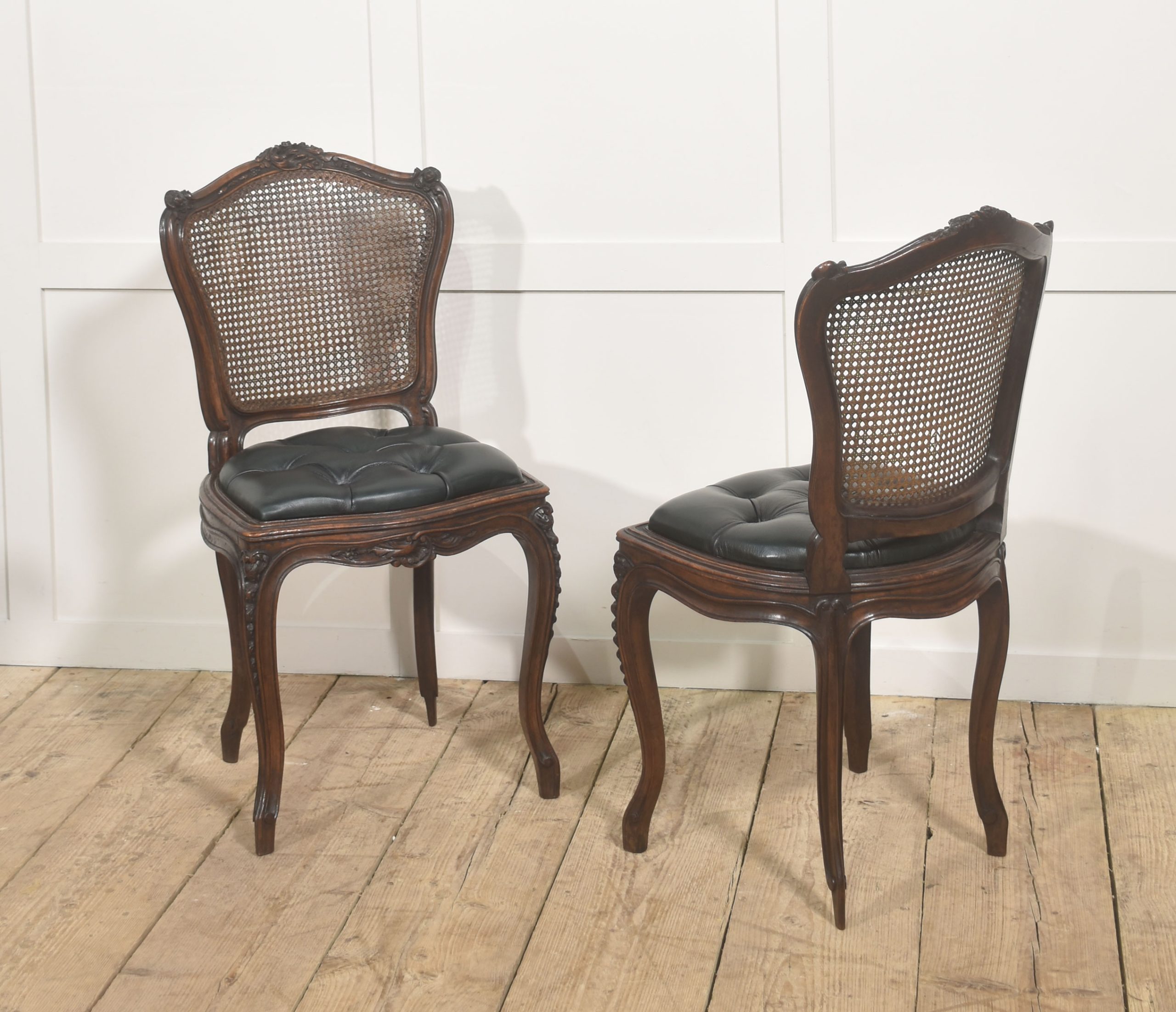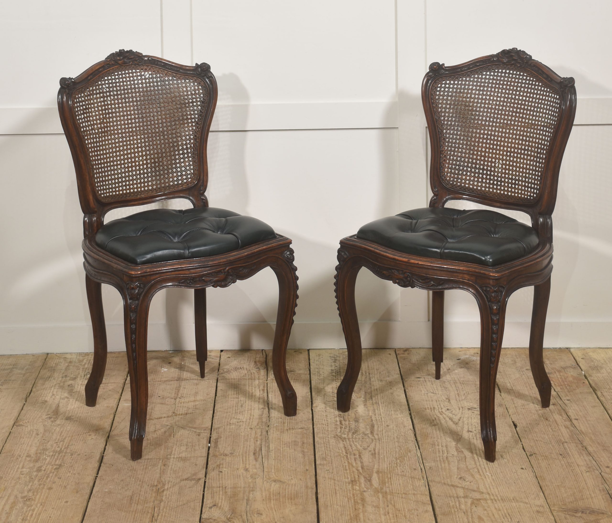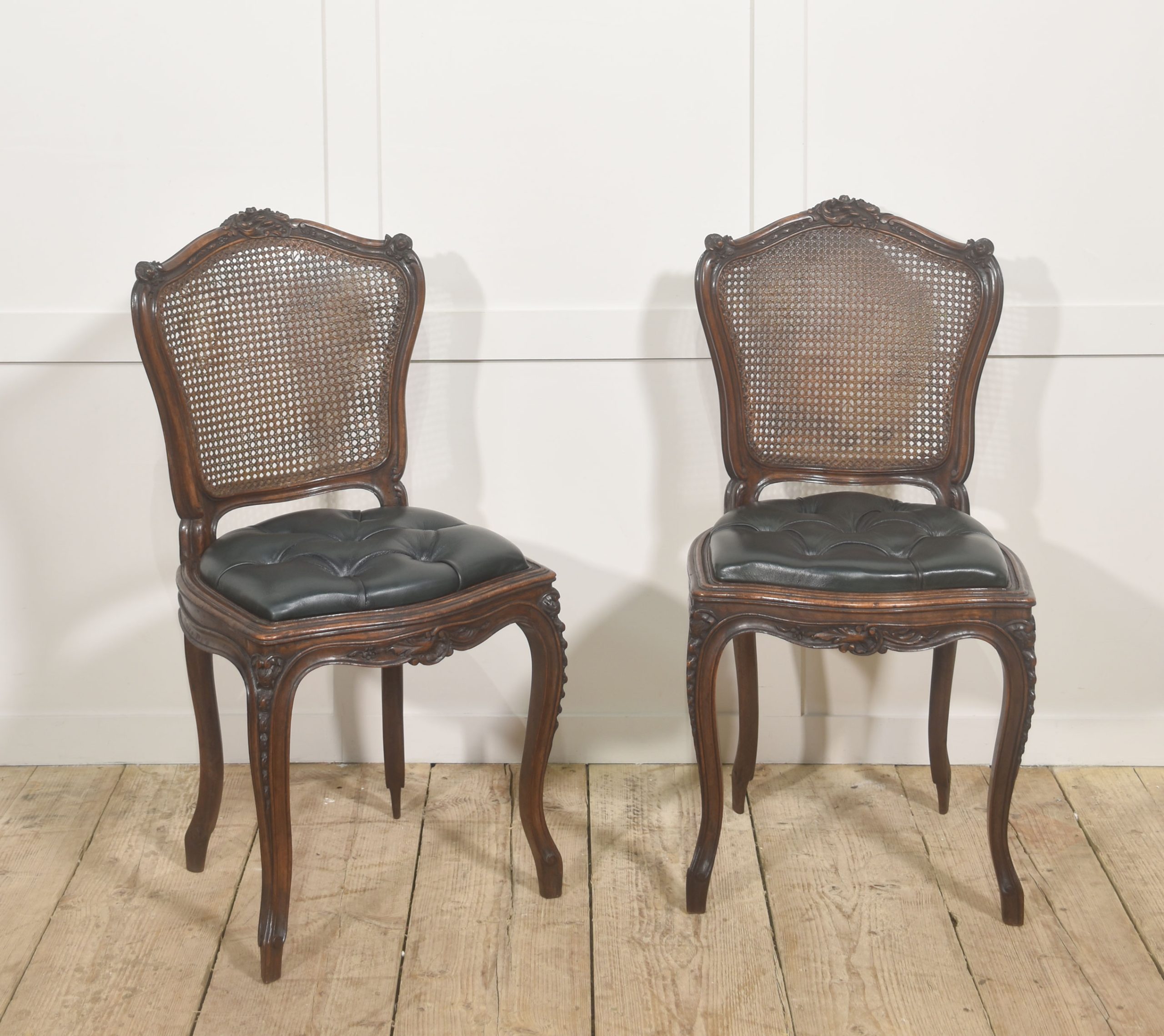 A distinguished pair of late 19th-century Louis XV style side chairs, expertly crafted in solid walnut and finished in a deep, lustrous polish that enhances the wood’s rich figuring and tonal warmth. The shaped crest rails are intricately carved with rocaille and foliate motifs, centred by scrolling cartouches and framed by delicate floral flourishes, embodying the graceful asymmetry and fluid movement characteristic of the Louis XV aesthetic.