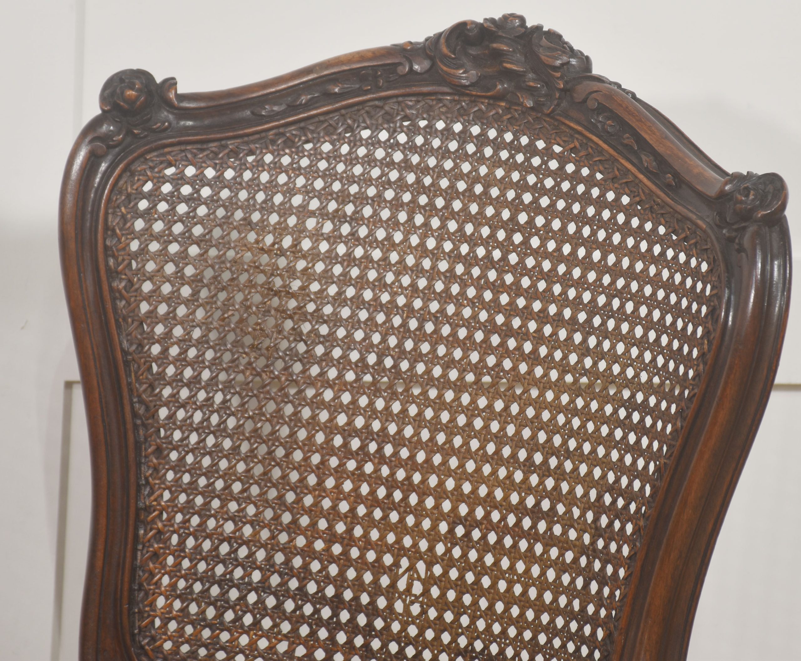 The walnut frames display a mellow patina consistent with age, lending depth and authenticity to their presentation. The gently contoured backs are inset with finely hand-woven cane panels in a traditional open lattice pattern, providing visual lightness and textural contrast against the substantial carved frames. The caning is neatly tensioned and complements the elegant curvature of the moulded back supports.